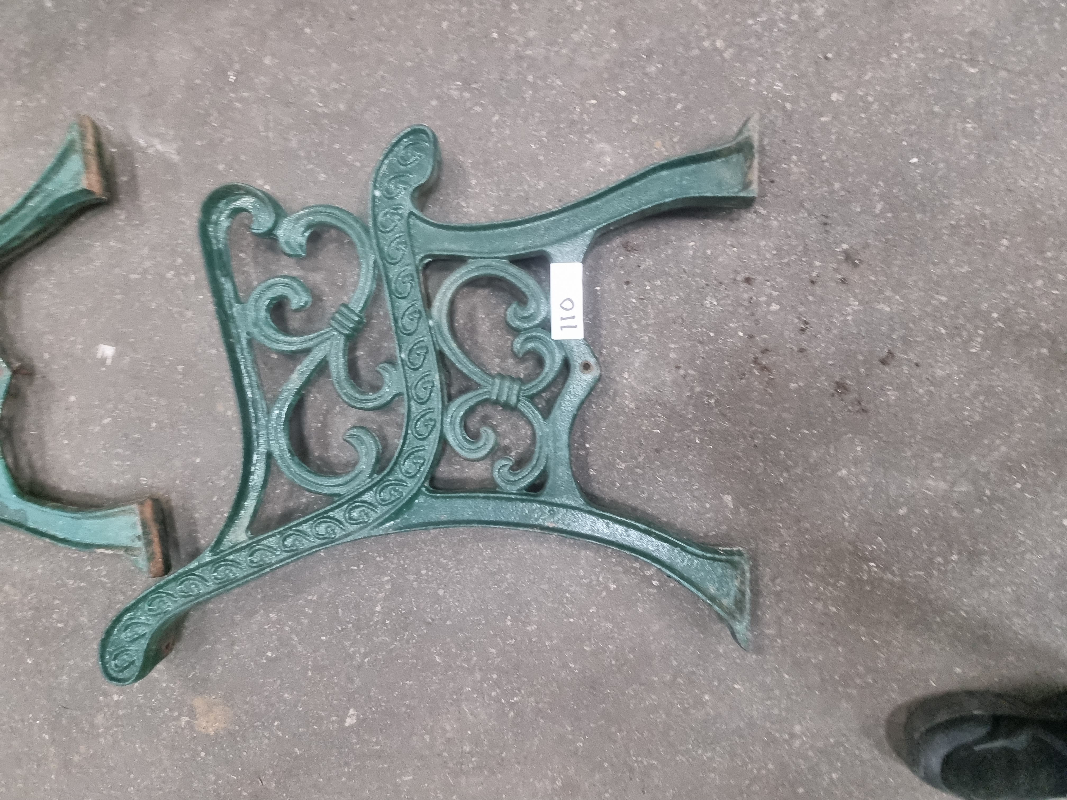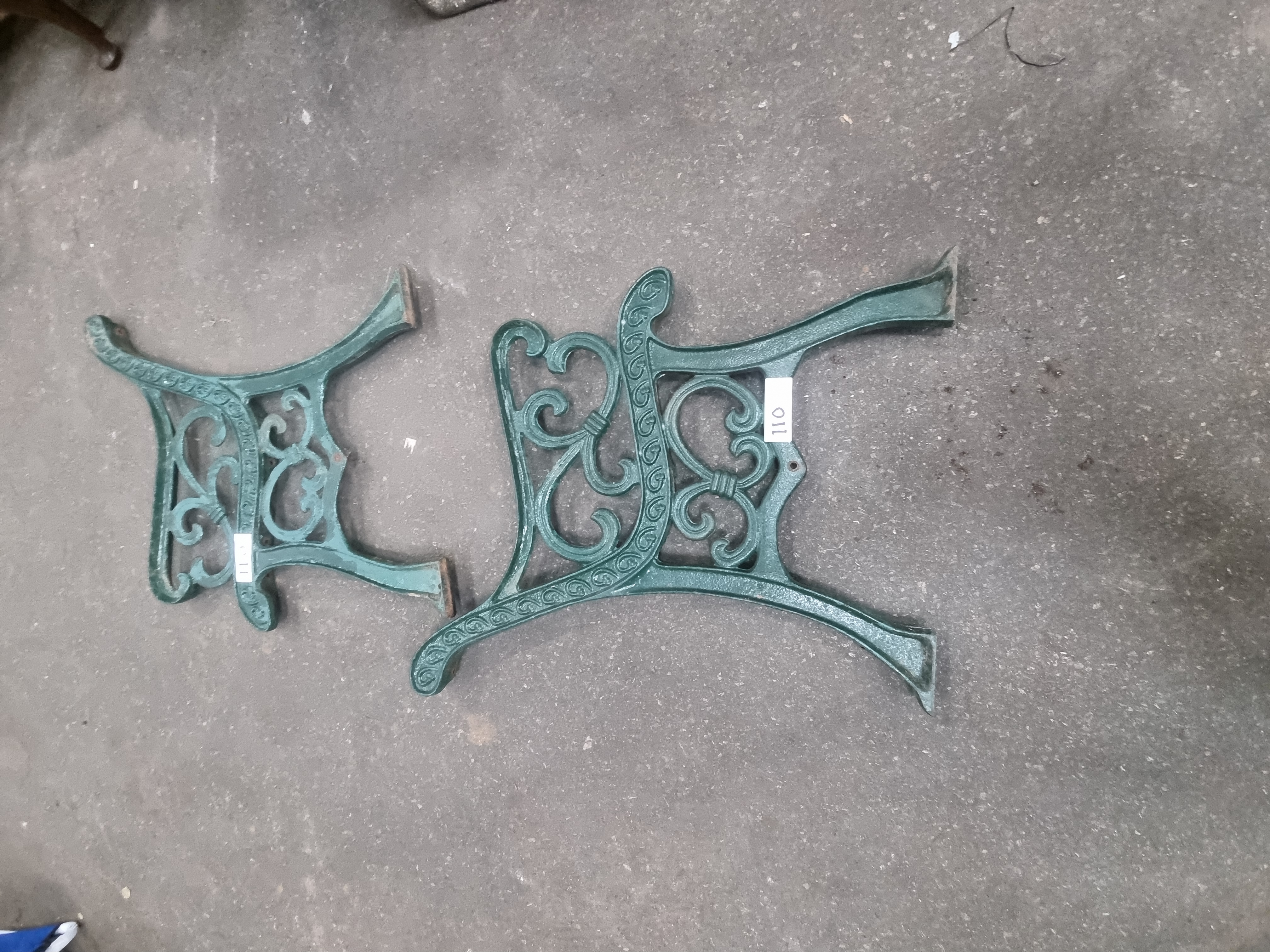 A pair of cast iron garden bench ends featuring ornate Victorian-style scrollwork and foliate openwork decoration. Each end is of solid cast metal construction, incorporating an integrated curved armrest and four pre-drilled mounting holes designed for the attachment of wooden slats. The items are finished in a dark green paint. No embossed foundry marks, maker’s names, or signatures are visible on the castings. The white rectangular labels present are auction lot identifiers.