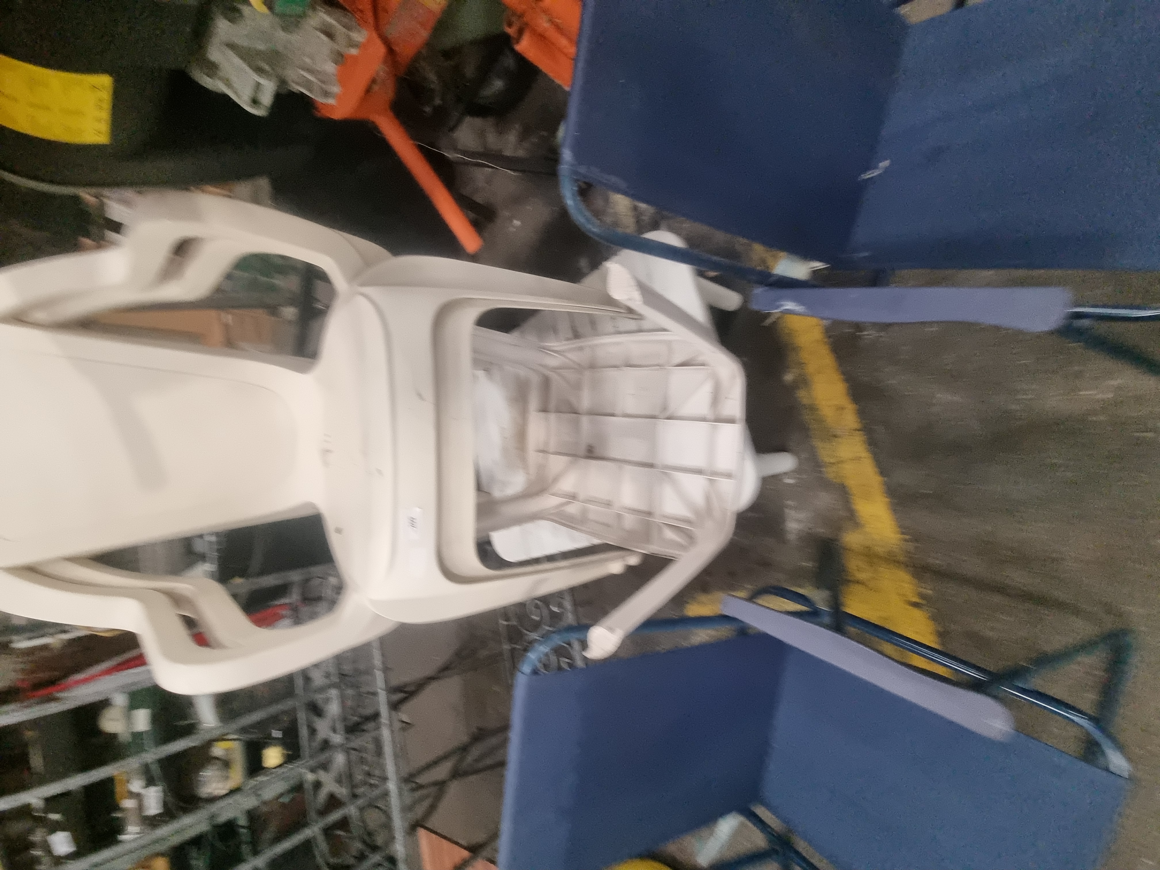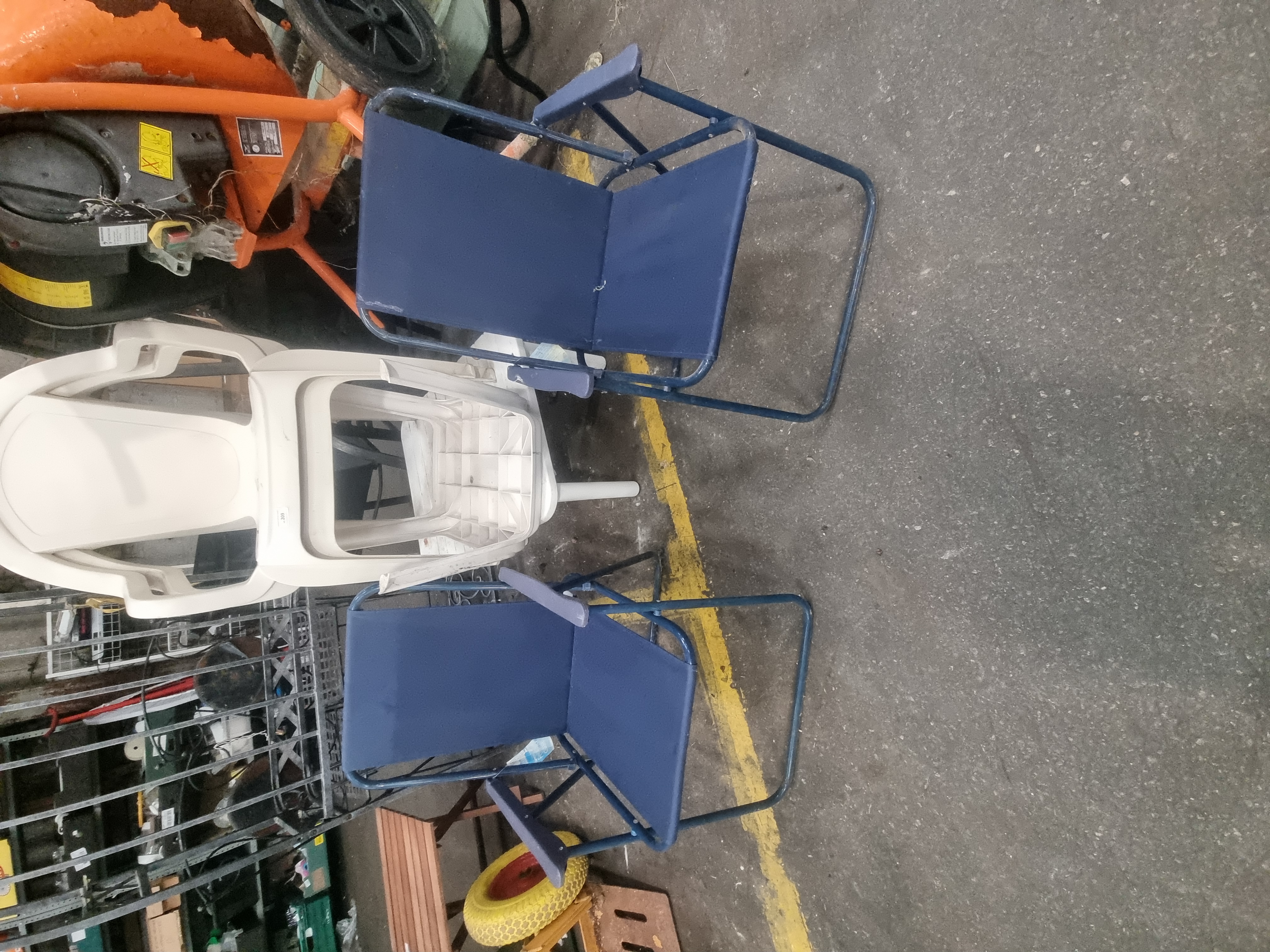 All items are in used condition with visible signs of wear consistent with outdoor use. There is surface dirt, scuffing, and marking to the metal frames and plastic surfaces. The fabric on the folding chairs remains intact but shows light staining and accumulated dust from storage.