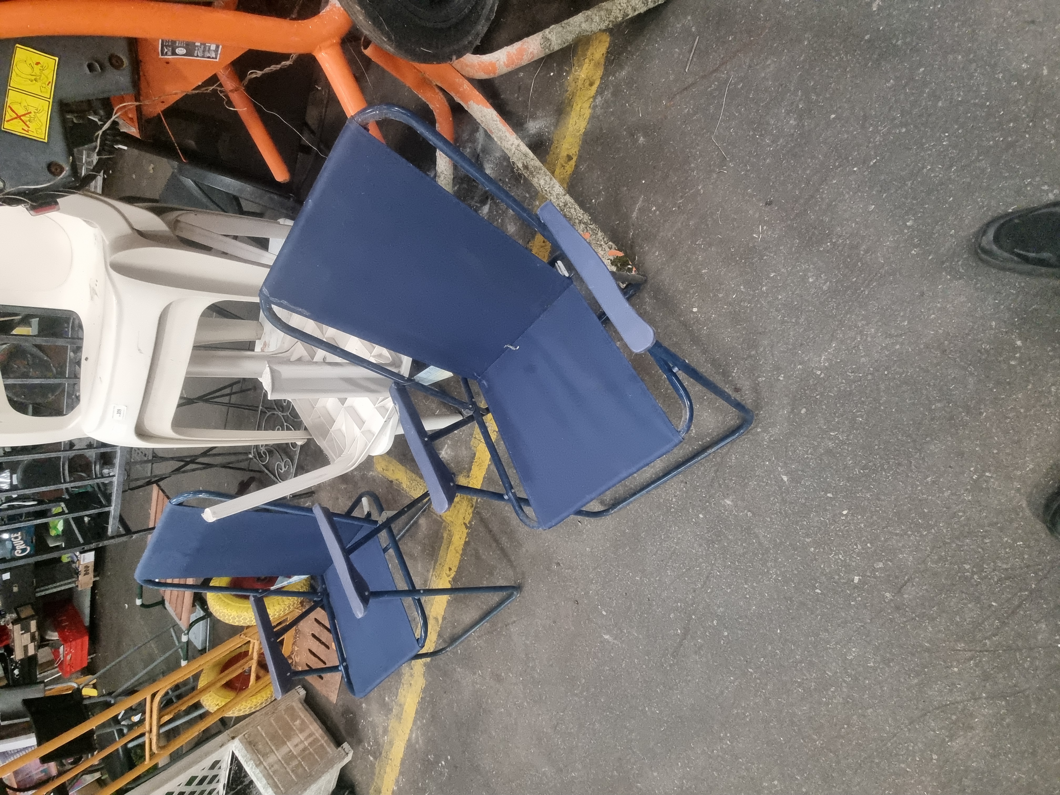 A trio of modern garden chairs comprising two folding armchairs and one stacking armchair. The folding chairs are constructed with blue powder-coated tubular metal frames and blue synthetic fabric seats and backrests, featuring grey plastic armrests and a cross-brace folding mechanism. The stacking armchair is of a standard monobloc design, manufactured from white moulded polypropylene plastic. These items are mass-produced contemporary designs. No legible maker’s marks are present, although a small unidentifiable sticker is located on the backrest of the plastic chair.