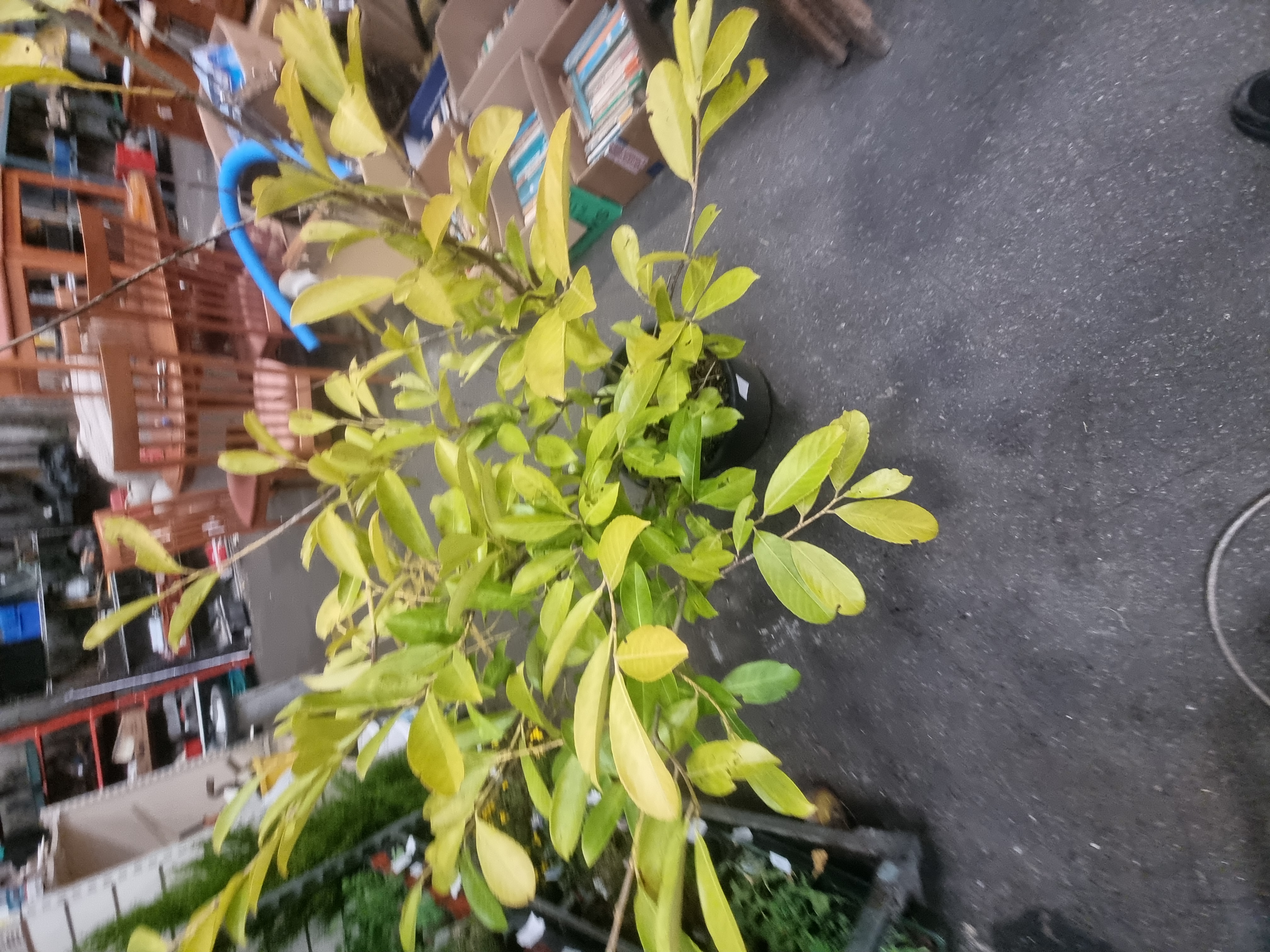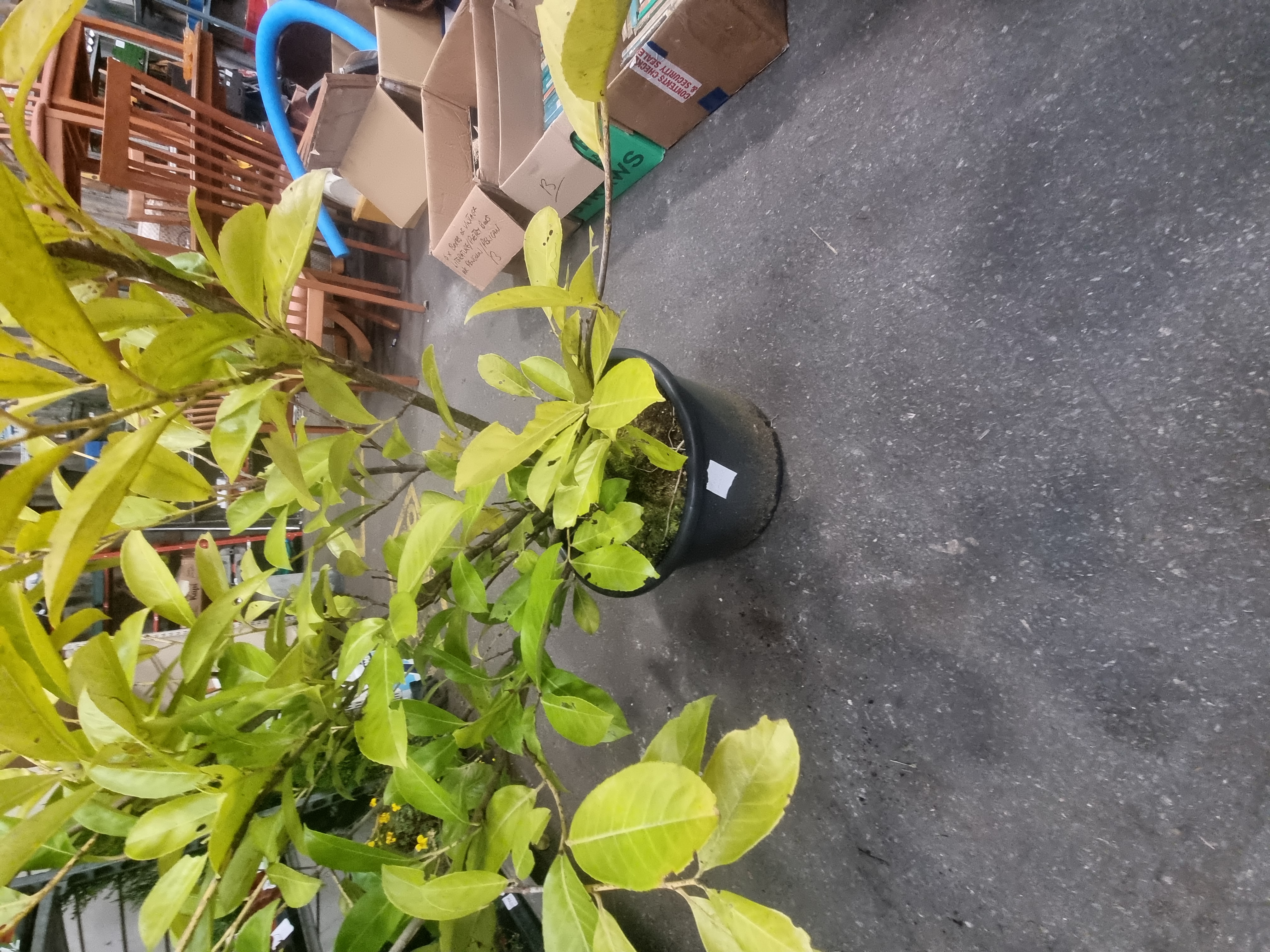 The specimen appears in good physiological condition. The foliage displays a consistent lime-green to gold colouration. The black plastic nursery pot shows minor surface scuffing and soil residue consistent with handling in a warehouse or nursery environment.