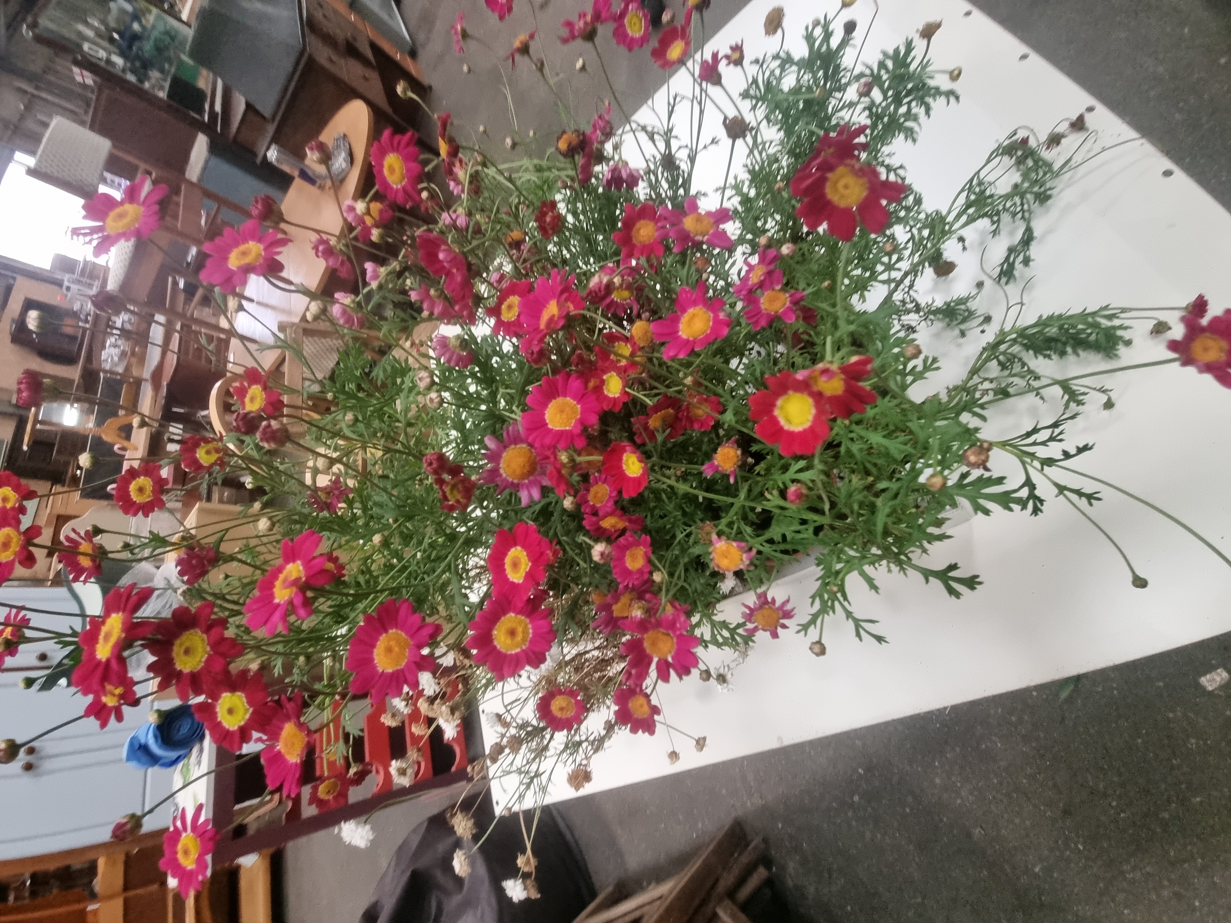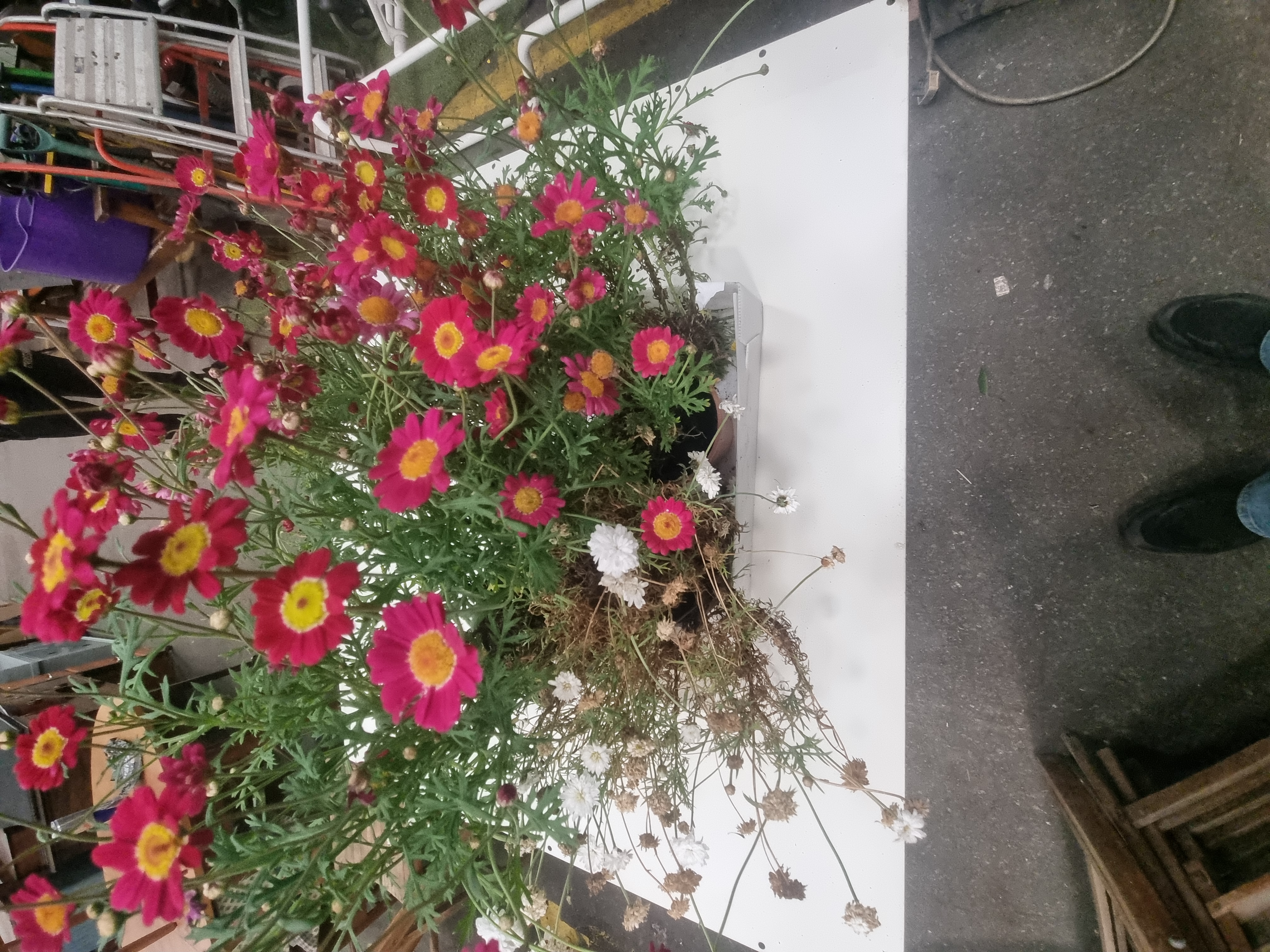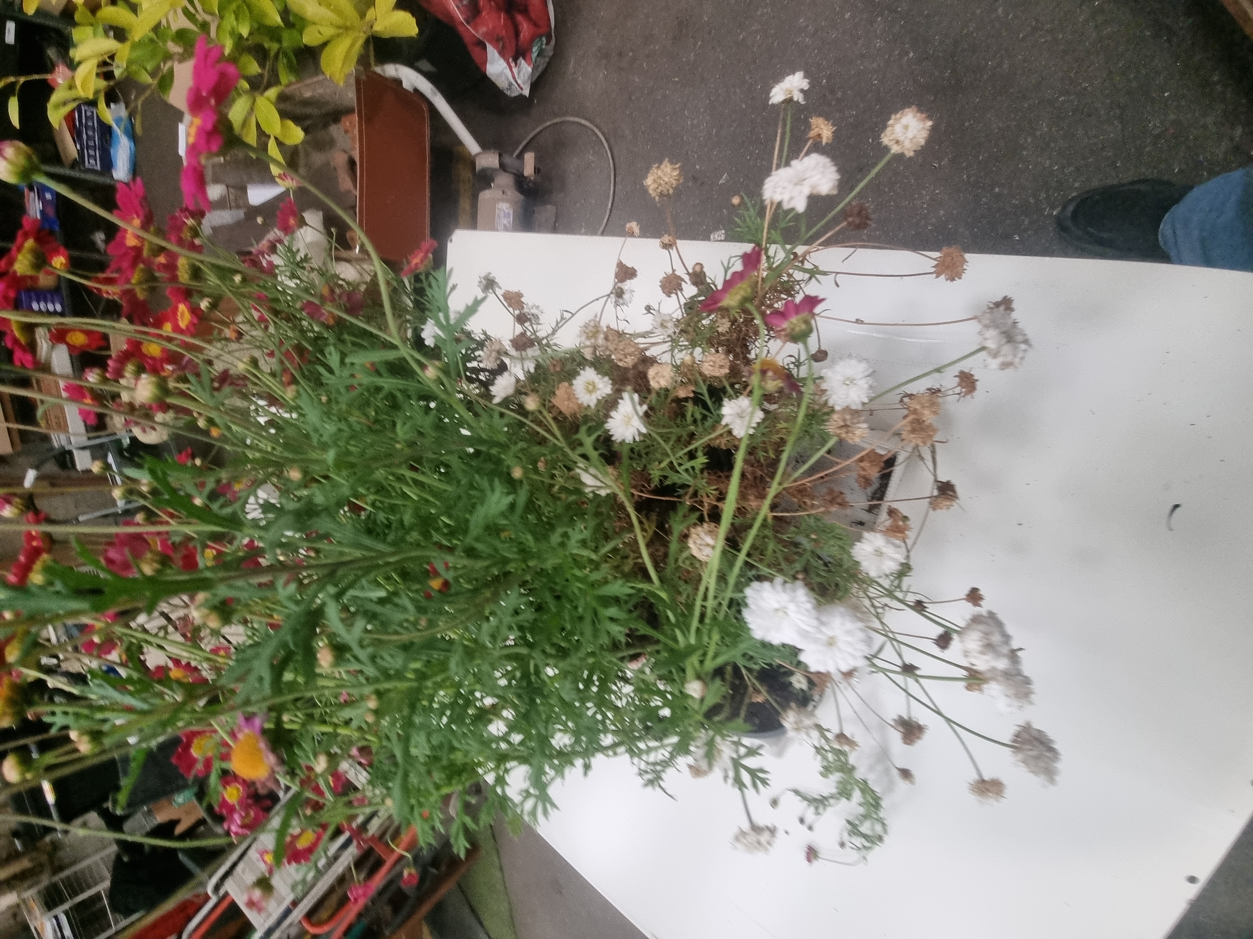 The plants are in mixed condition. The collection displays healthy green foliage and numerous active blossoms alongside several spent, browned flower heads and some dry, woody stems.