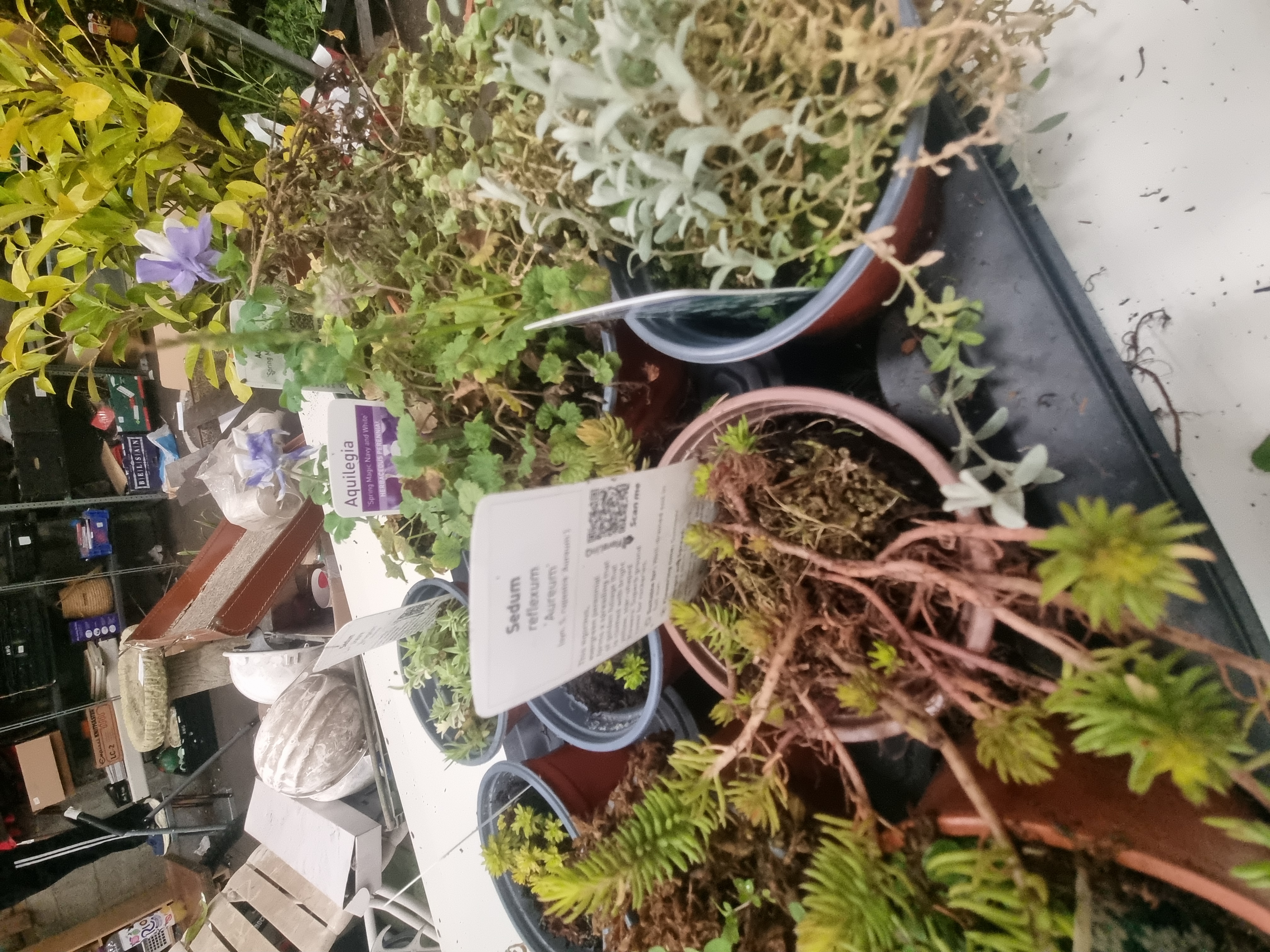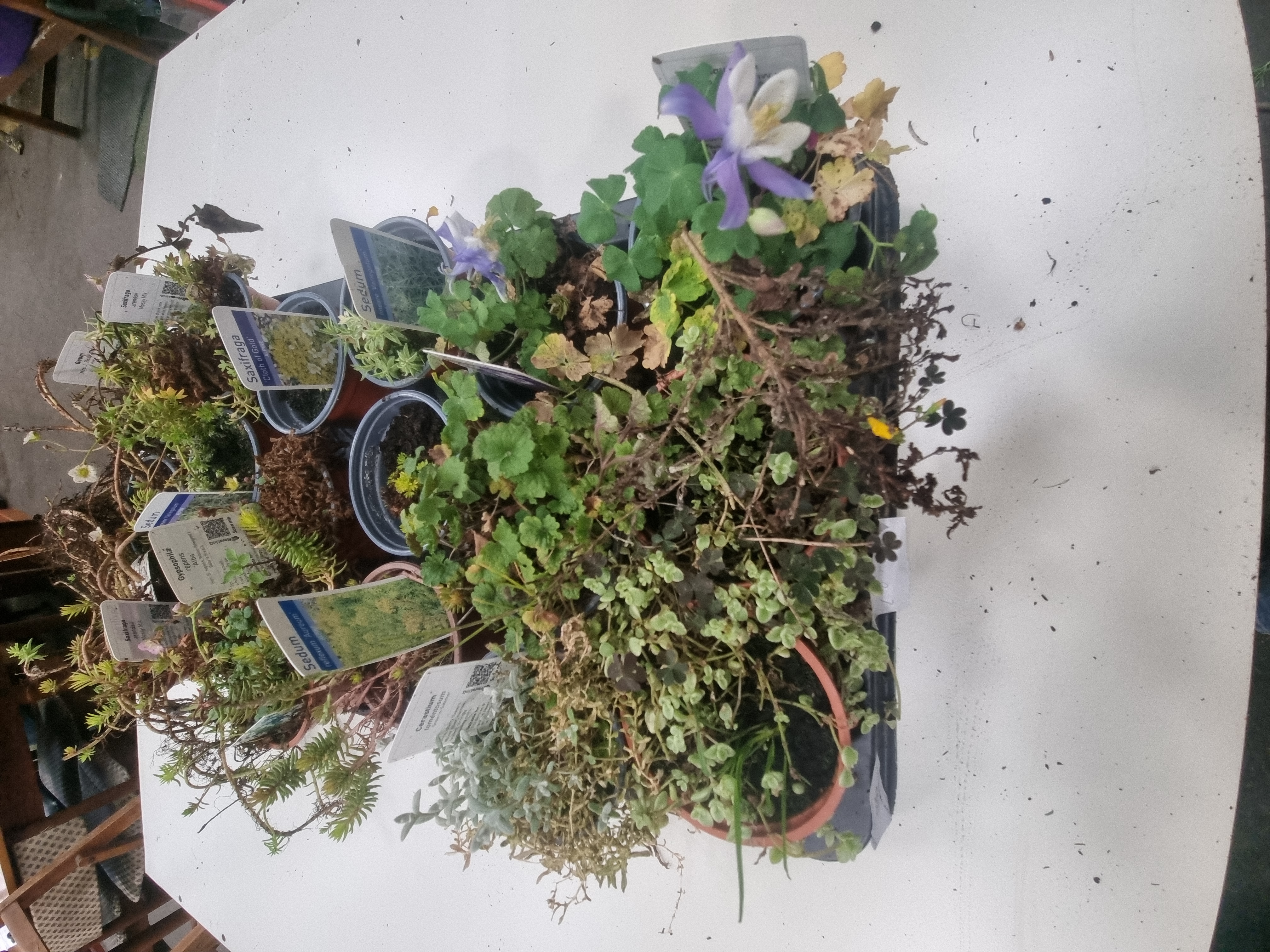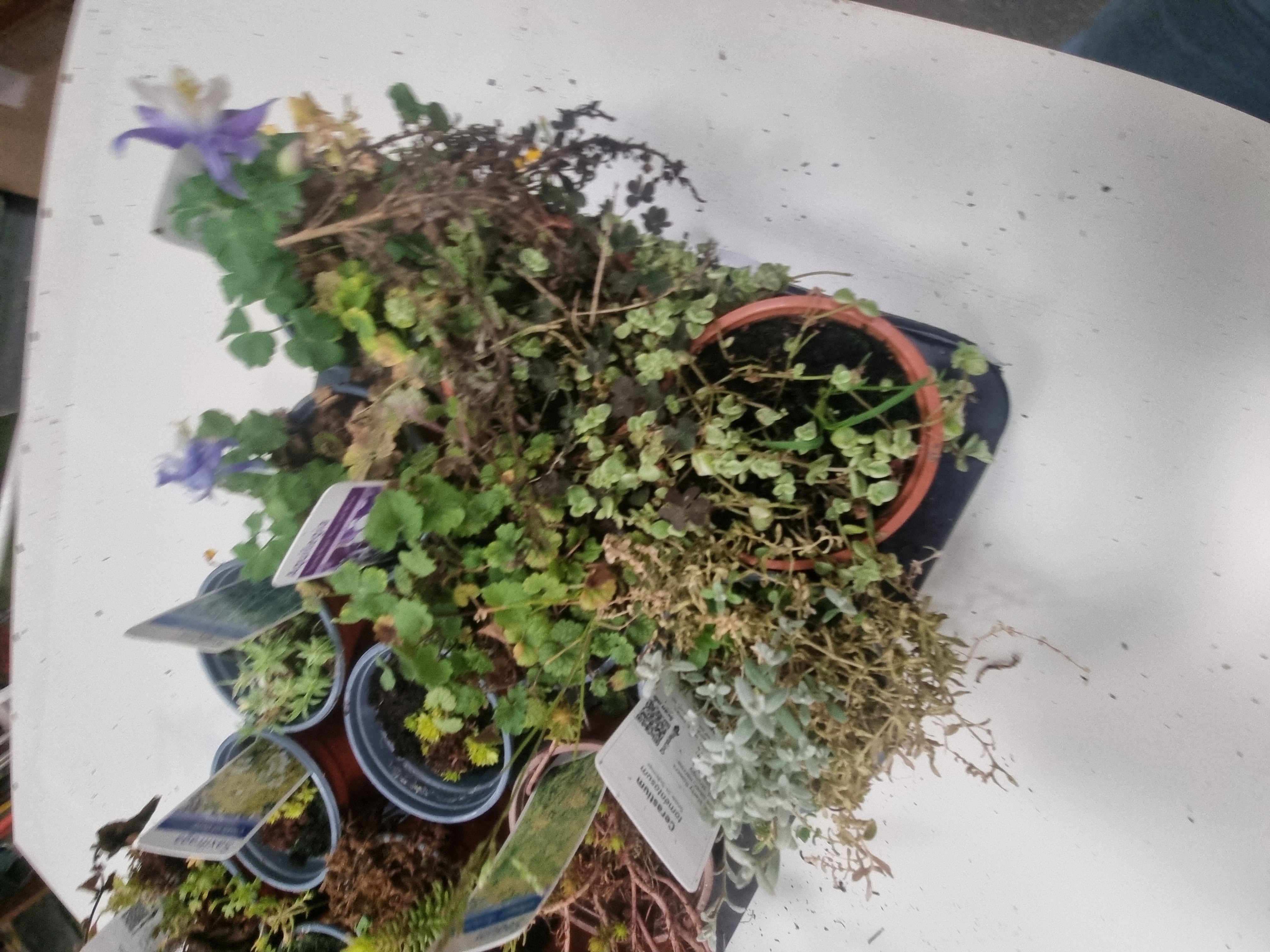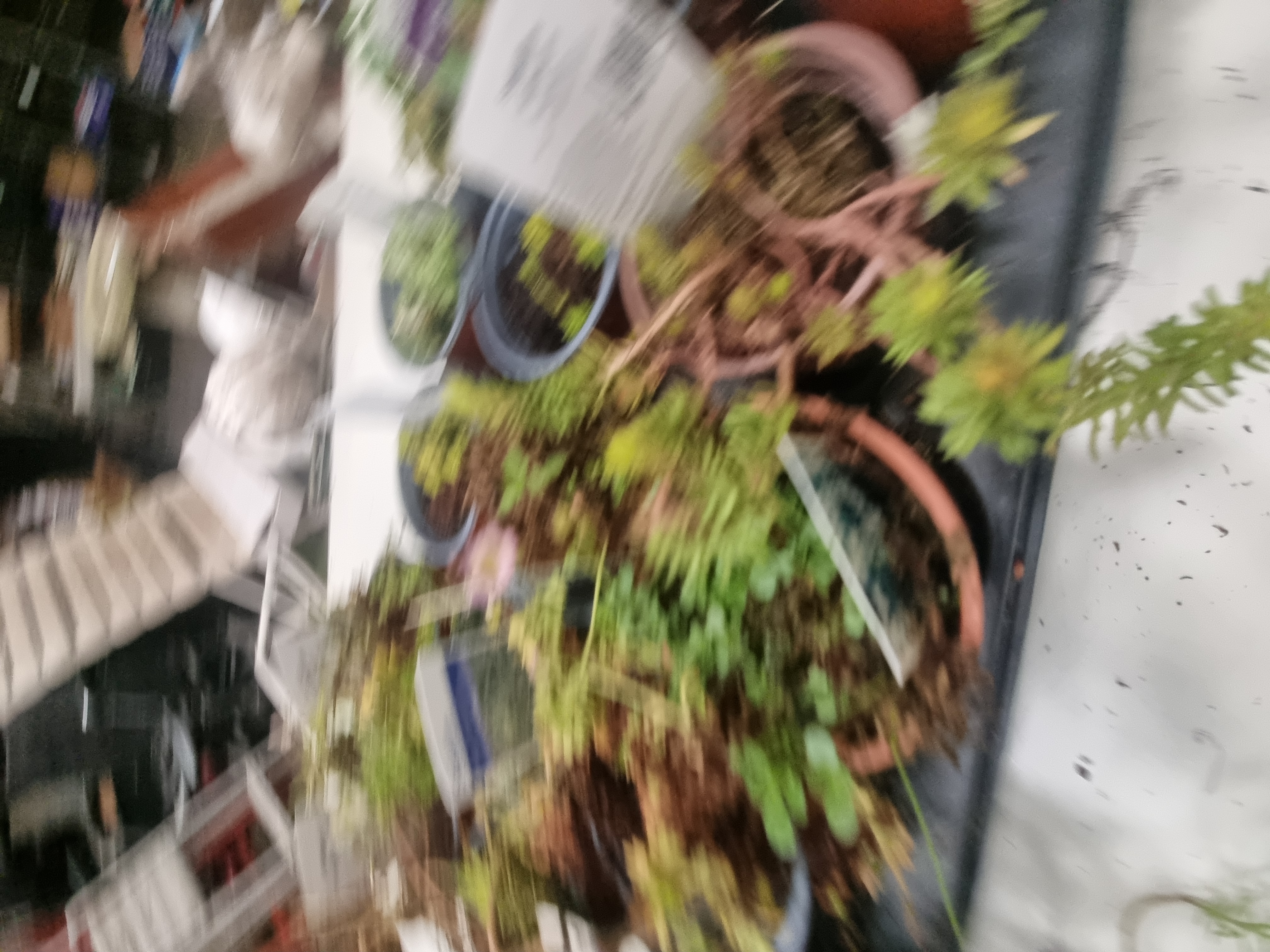 The plants are in variable condition. Some specimens exhibit active growth and flowering, while others show signs of distress, including leggy stems and significant areas of dried, brown foliage. The collection requires immediate maintenance and hydration.