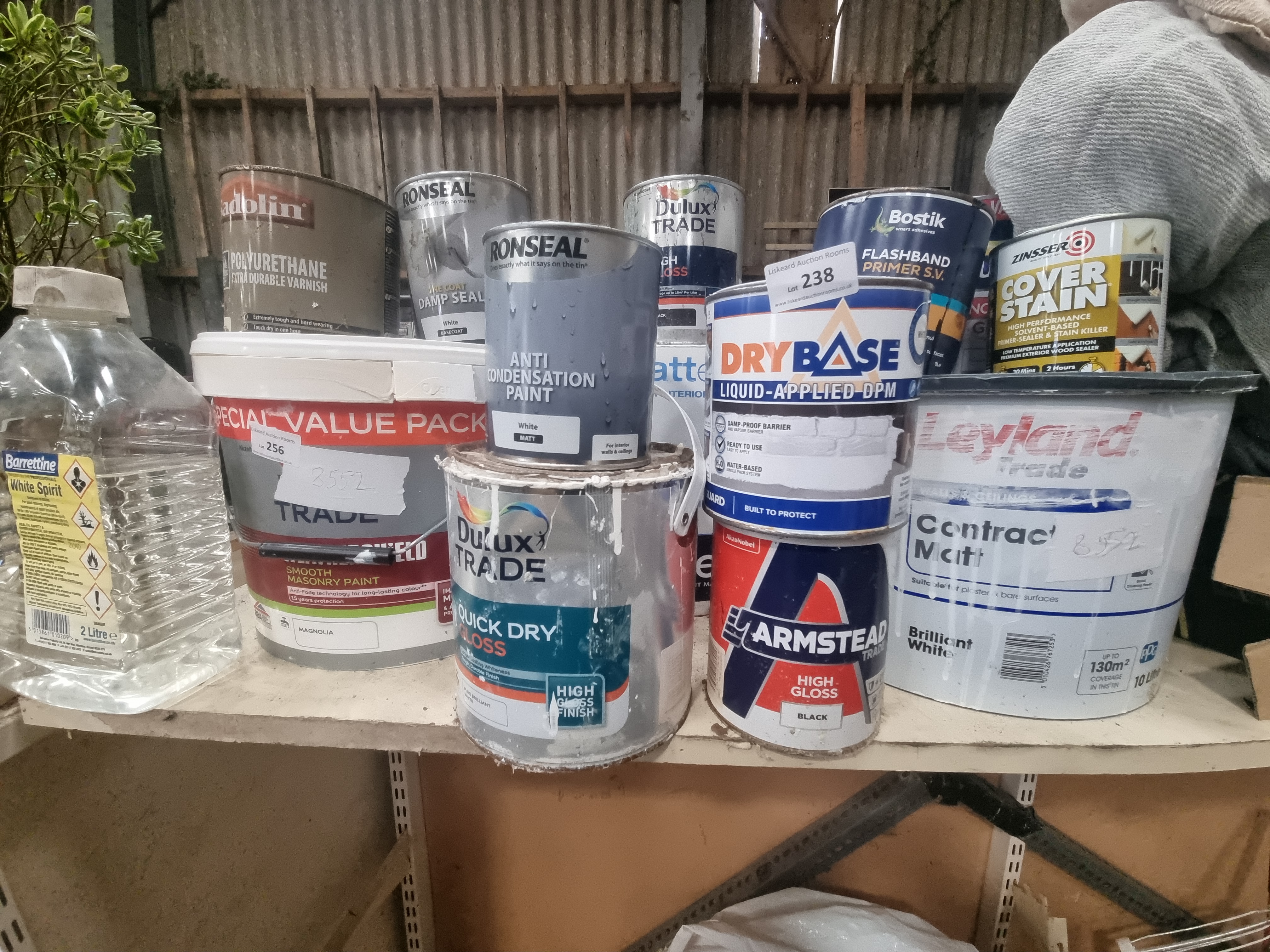 A collection of trade and DIY decorating supplies comprising approximately 11 tins and tubs of various paints, primers, and varnishes, together with a 2L bottle of Barrettine White Spirit. The lot includes products from major brands such as Dulux Trade (Smooth Masonry Paint in Magnolia and Quick Dry Gloss), Leyland Trade (10L Contract Matt in Brilliant White), Ronseal (Anti-Condensation Paint and Damp Seal), Armstead Trade (High Gloss in Black), Drybase (Liquid-Applied DPM), Bostik (Flashband Primer S.V.), Zinsser (Cover Stain), and Sadolin (Polyurethane Extra Durable Varnish). The items are a mixture of overstock and liquidation goods. Several containers are marked with handwritten inventory numbers and auction lot stickers for Lot 238 and Lot 256.