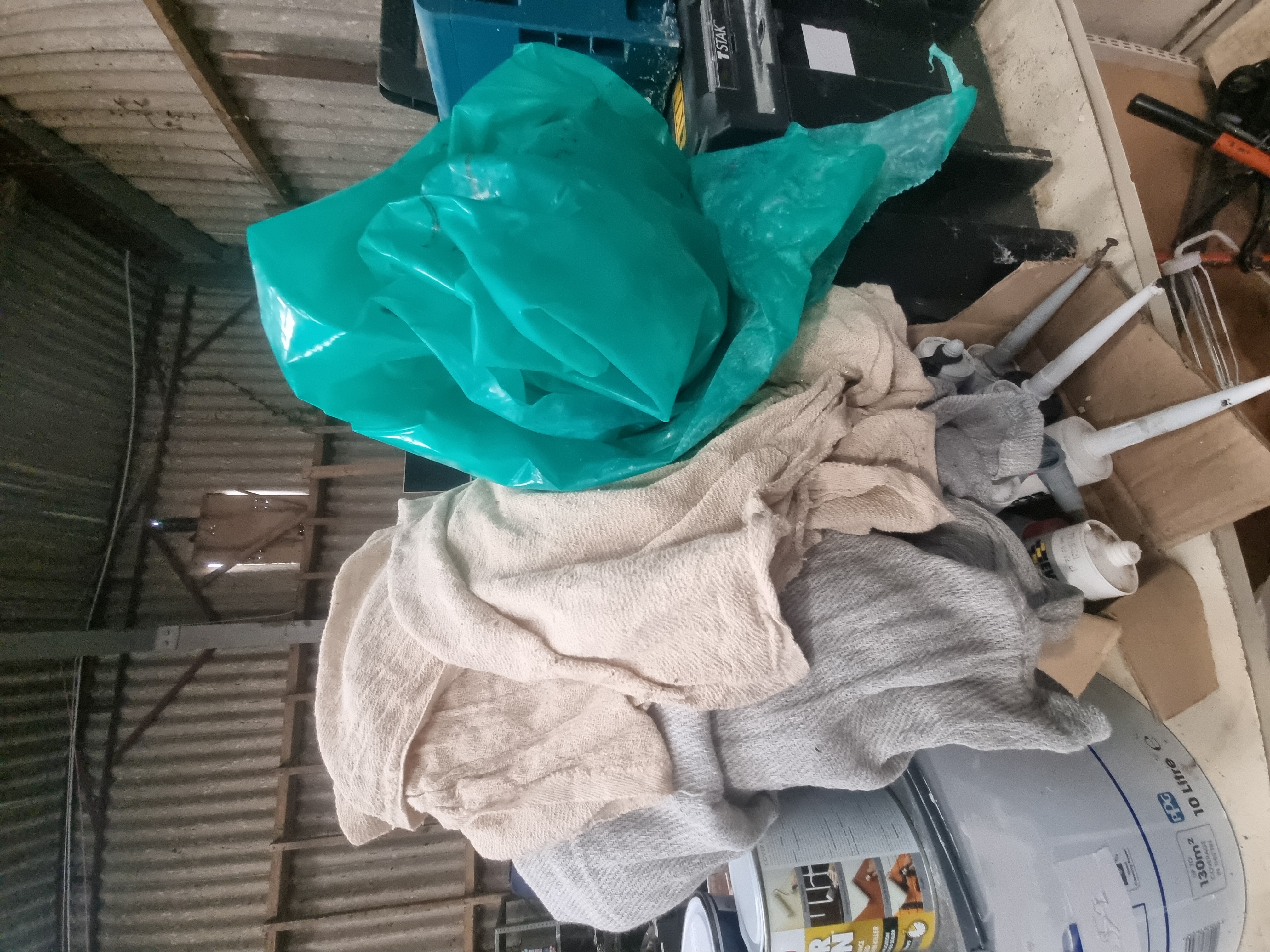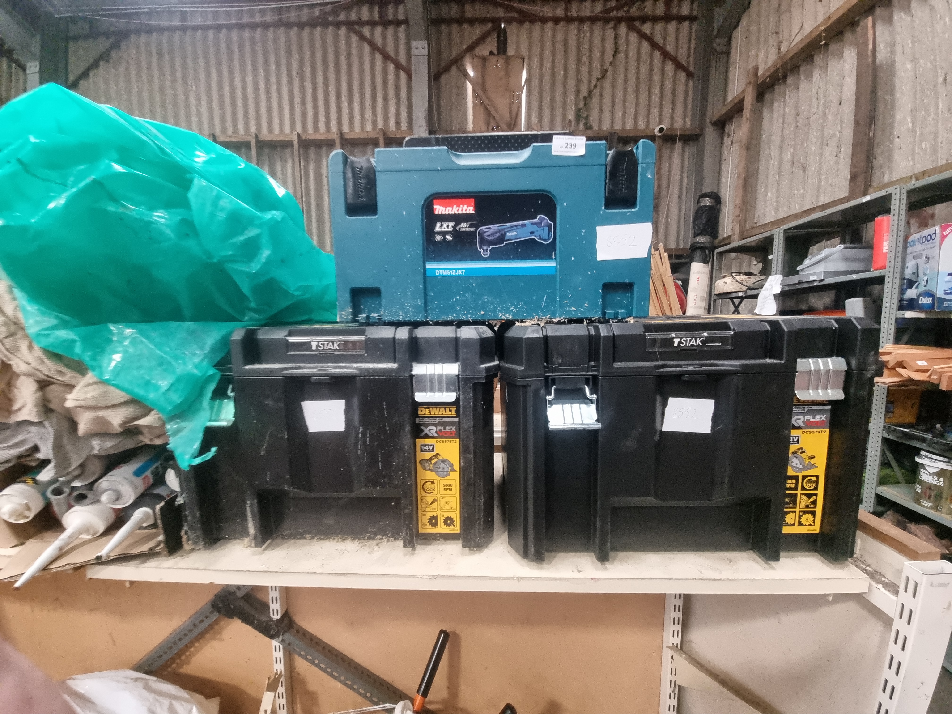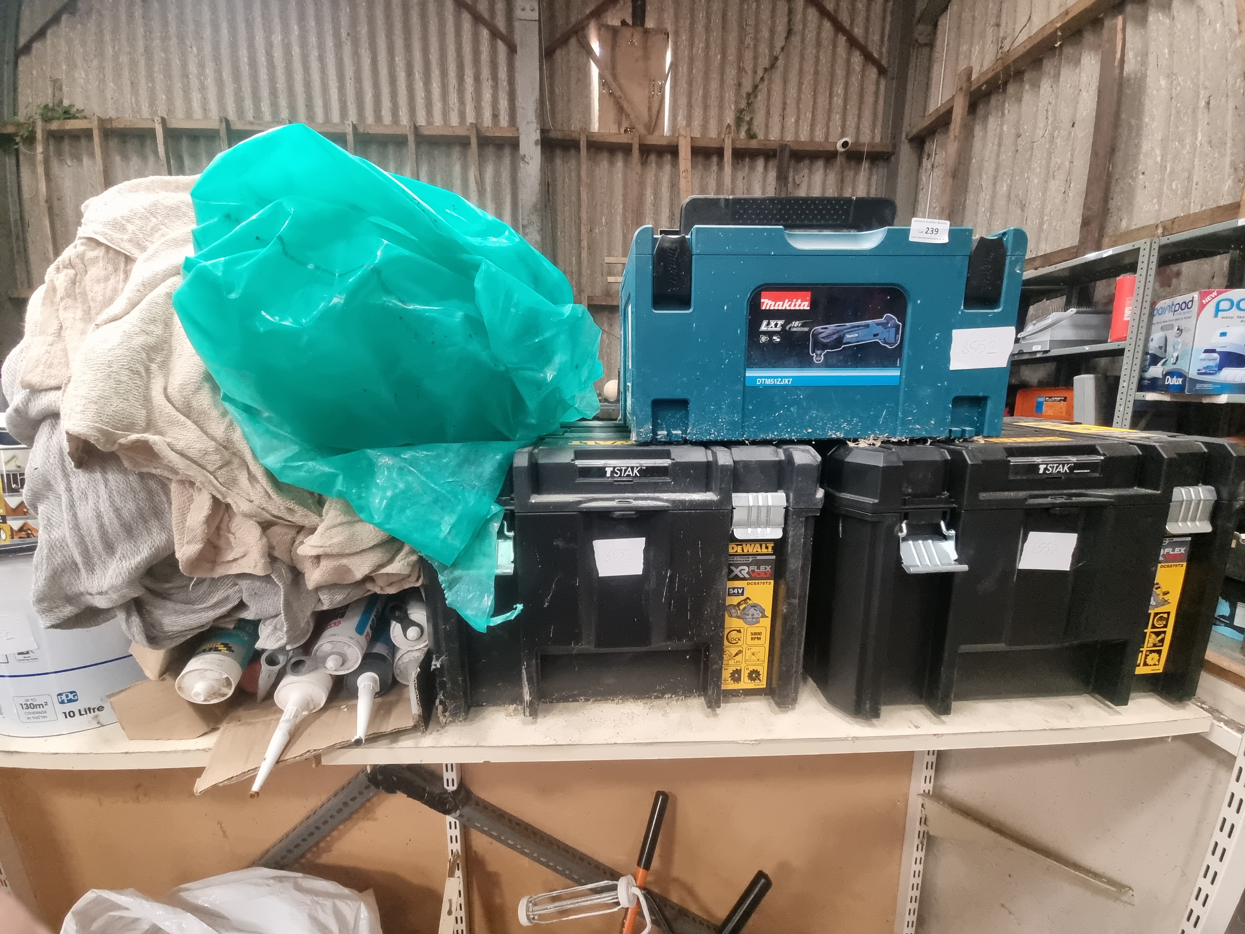 A collection of professional power tool storage cases and miscellaneous workshop supplies. The lot includes one blue plastic Makita Makpac stacking case, featuring a manufacturer label for a Makita LXT 18V DTM51ZJX7 cordless multi-tool. Also included are two black heavy-duty plastic DeWalt TSTAK storage cases, both bearing labels for the DeWalt XR Flexvolt 54V DCS575T2 cordless circular saw. The cases are constructed from moulded plastic with integrated handles and metal or plastic latches. Accompanying the cases is a cardboard box containing approximately seven tubes of assorted building sealants and adhesives, a quantity of loose fabric workshop cloths, and a large green plastic sheet.
