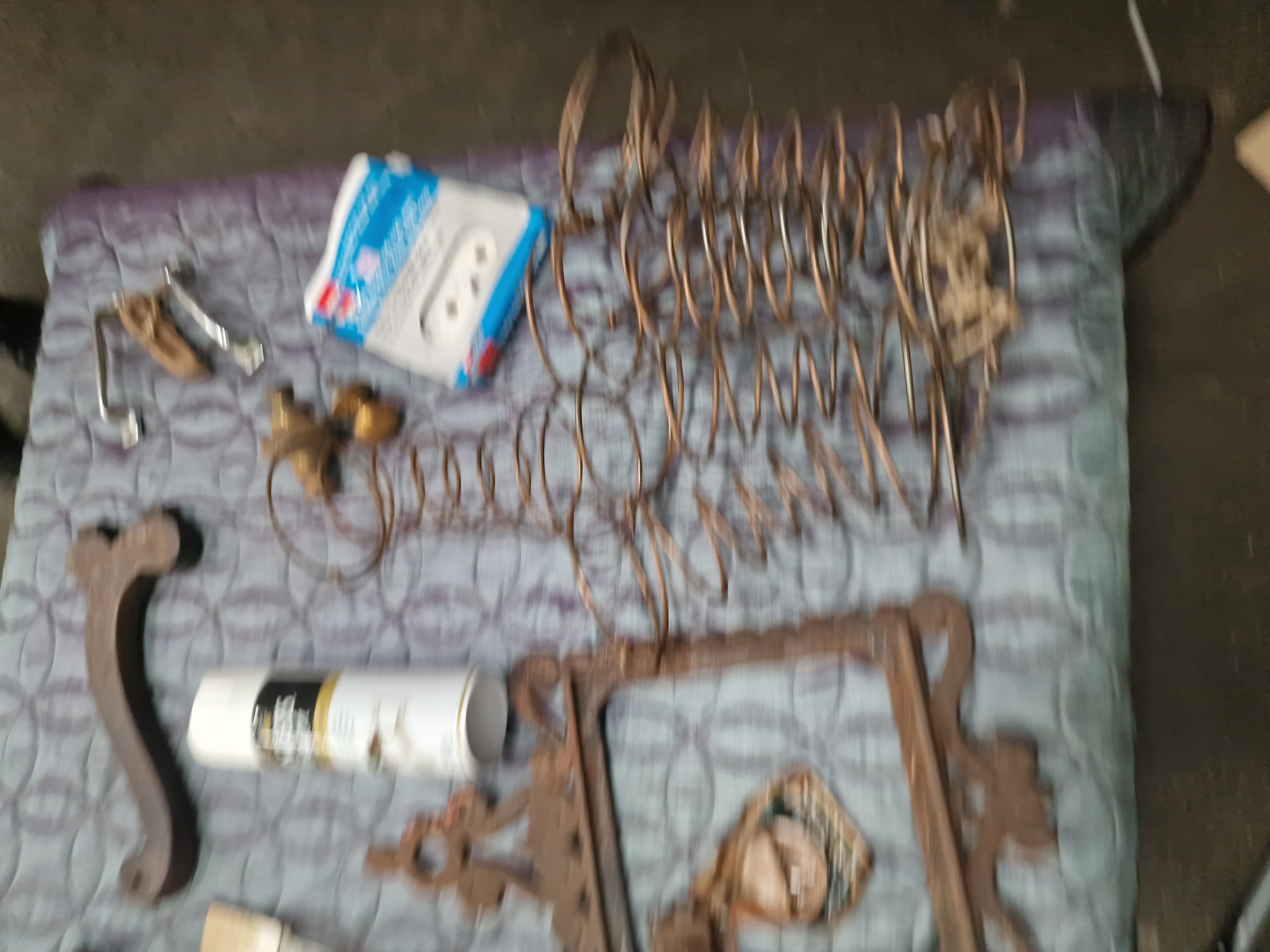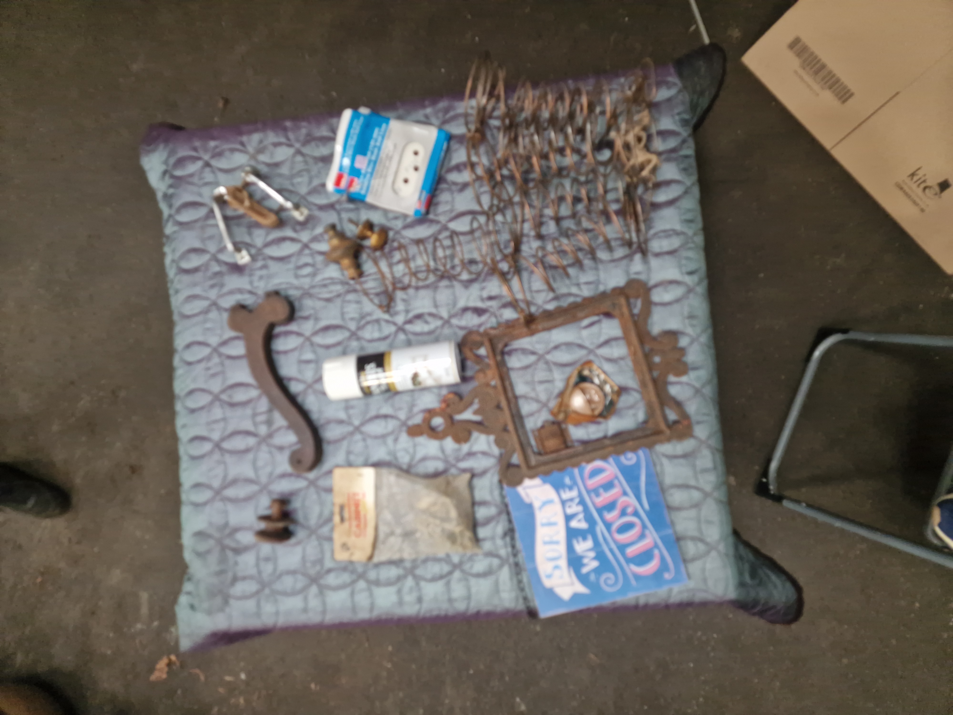 This lot comprises an assortment of architectural and furniture hardware alongside contemporary workshop items. The collection includes a substantial cast iron S-scroll door pull or gate handle featuring a dark oxidised finish. Also present is an ornate cast metal frame, possibly an architectural escutcheon or miniature picture frame, decorated with scrolled foliate motifs in a Victorian style. Furniture components include a section of interconnected steel upholstery coil springs. The lot further contains various small brass-toned knobs and finials, a pair of modern chrome or nickel-plated handles, and a dark-toned turned knob. Miscellaneous contemporary items include retail-packaged fasteners, a blister-packed hardware item, an aerosol canister, and a printed card sign reading SORRY WE ARE CLOSED. The materials include cast iron, steel, and various plated metals.