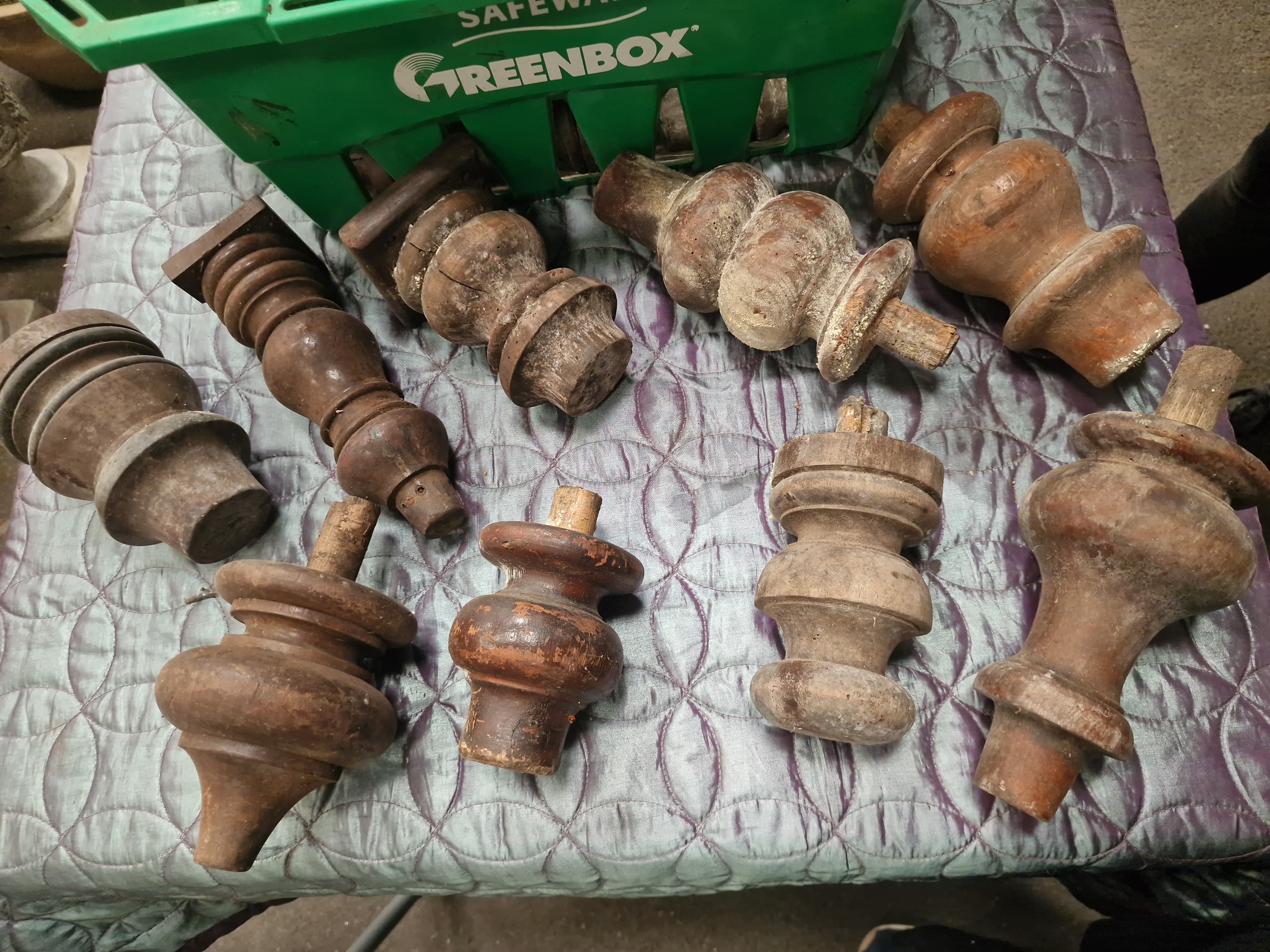 An assortment of turned wooden components, primarily comprising 19th-century architectural salvage and furniture elements. The collection includes various finials and bun feet featuring traditional profiles such as bulbous, tapered, urn-shaped, and ring-turned designs. The pieces are constructed from various hardwoods, with examples appearing to be oak, mahogany, and fruitwoods. Several components retain integral tenons for mounting, while others feature square or circular bases. These items were likely originally part of larger architectural structures or substantial furniture pieces.