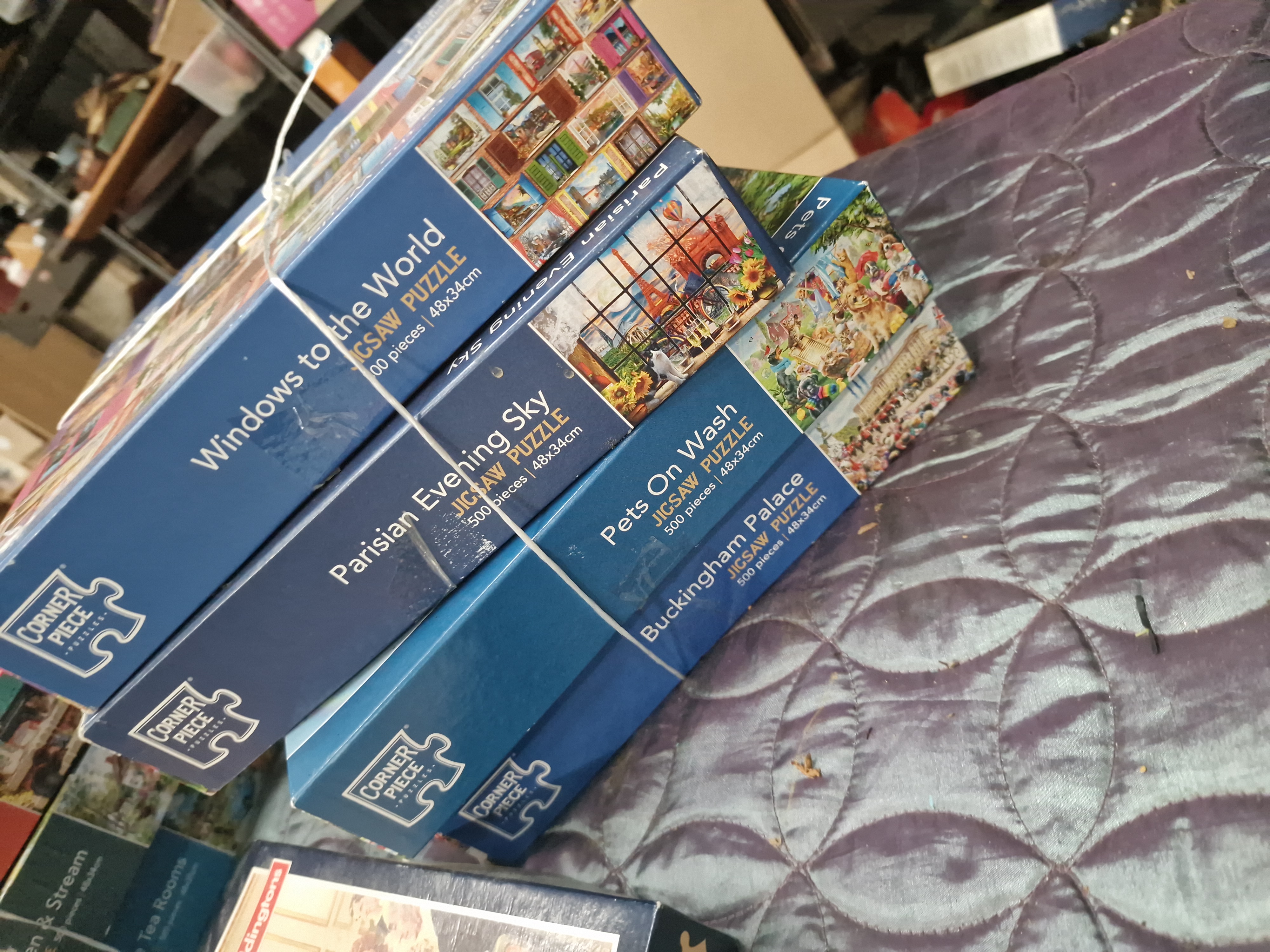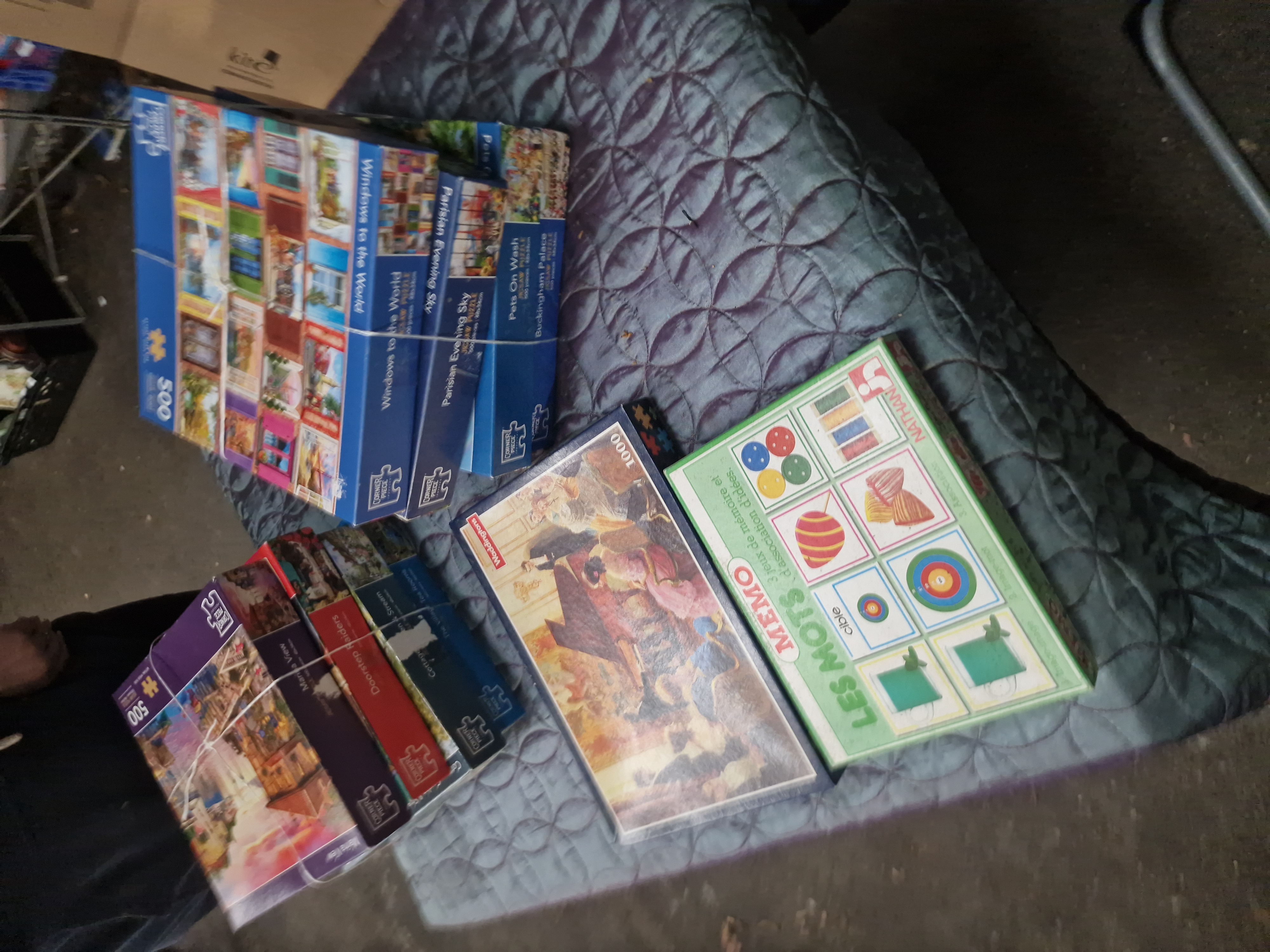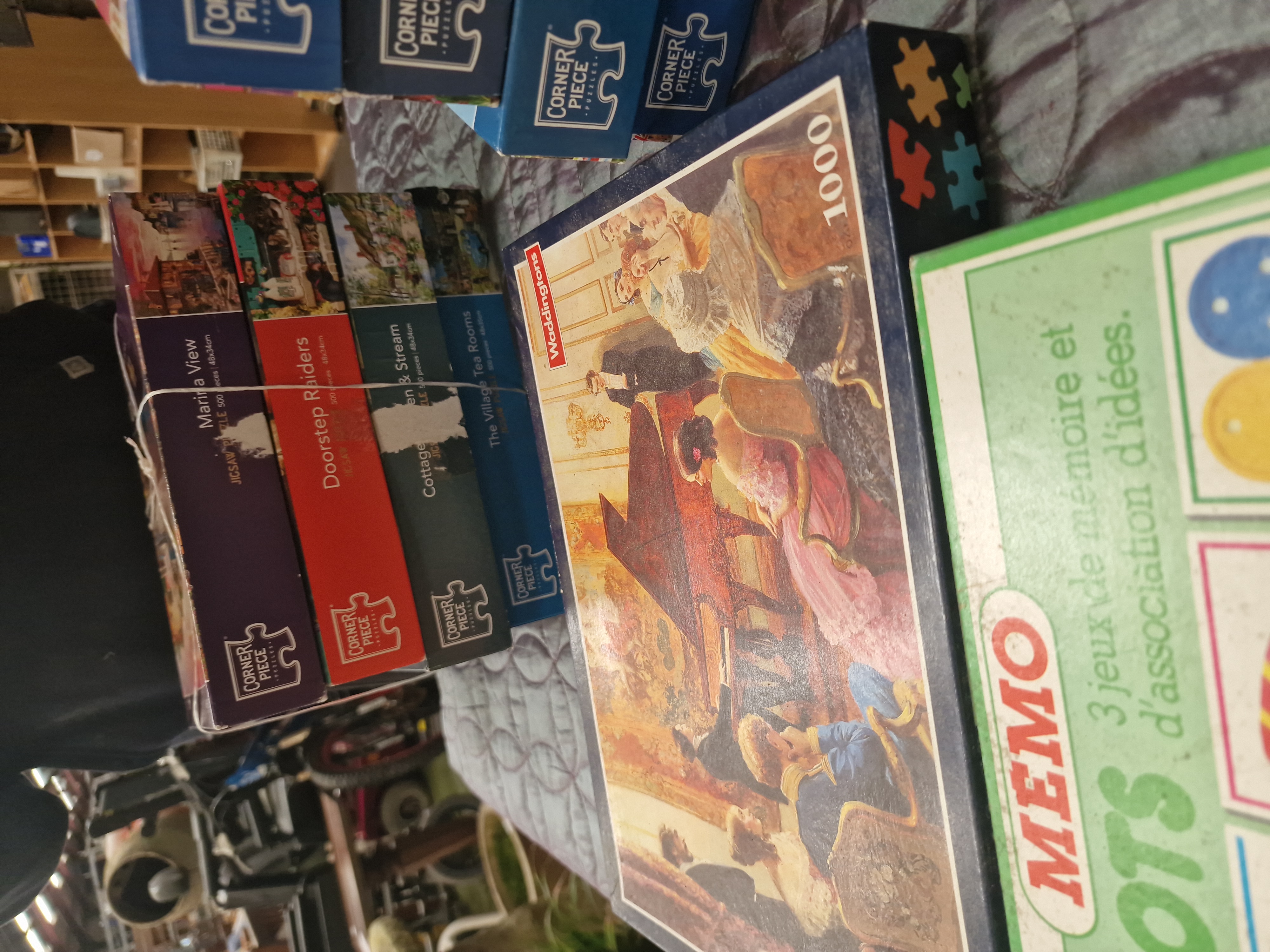 A collection of boxed jigsaw puzzles and a vintage educational game. The group includes several 500-piece jigsaw puzzles by Corner Piece Puzzles featuring various themes such as Windows to the World, Parisian Evening Sky, Pets On Wash, Buckingham Palace, Marina View, Doorstep Raiders, Cottage Garden and Stream, and The Village Tea Rooms. Also included is a 1000-piece jigsaw puzzle by Waddingtons depicting a period interior scene with figures gathered around a piano, bearing the manufacturer mark in white lettering on a red rectangular ground. The collection is completed by a vintage French educational memory and association game titled Memo Les Mots by Nathan, which includes three games of memory and idea association. All items are constructed from printed cardboard and are housed in their original packaging.