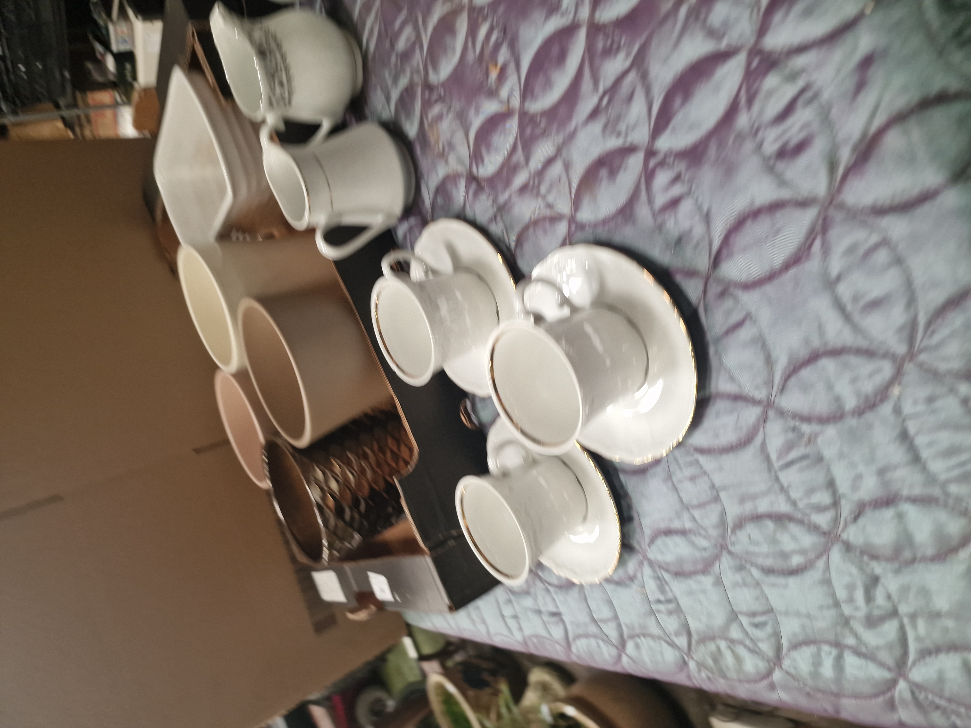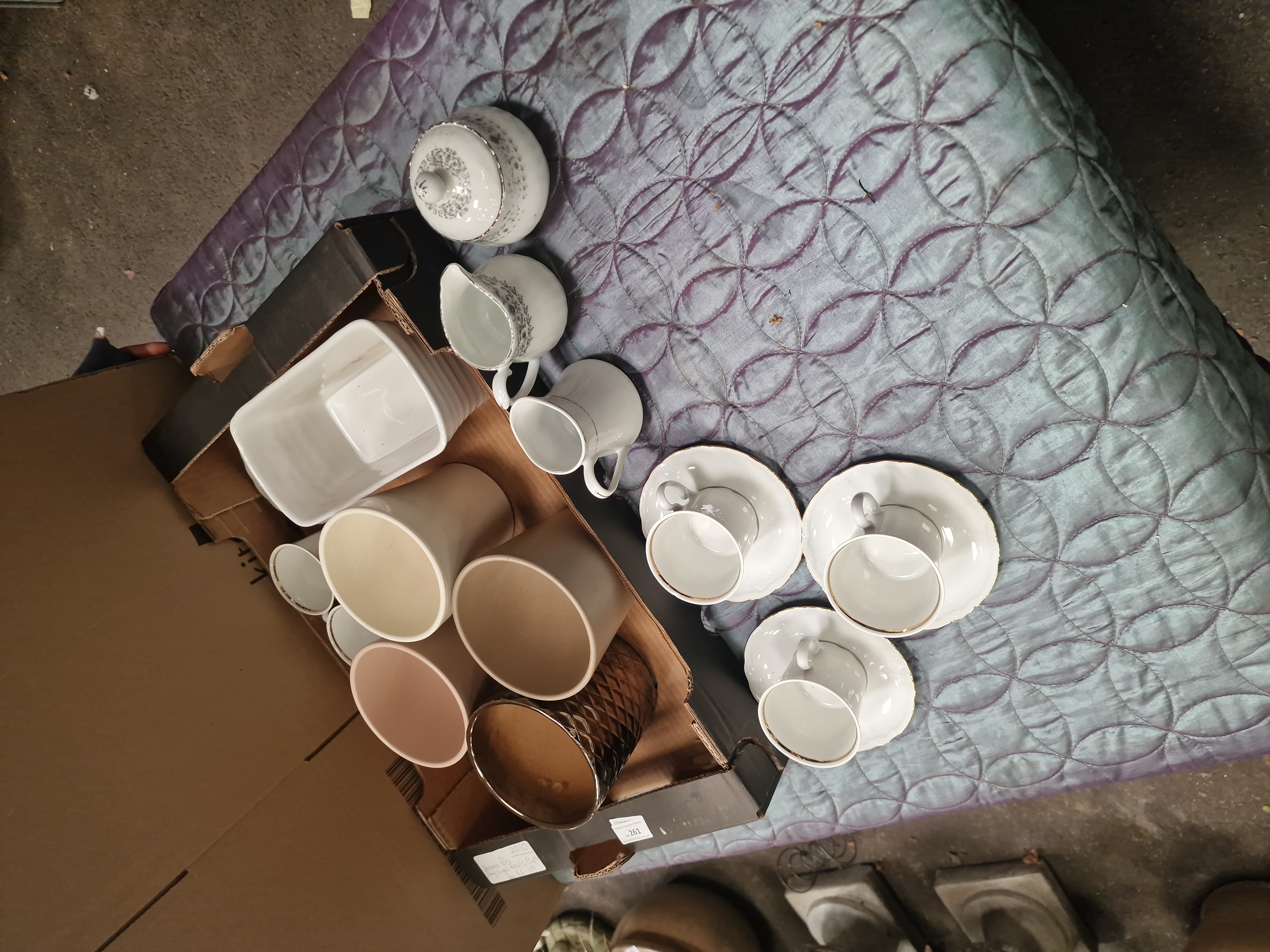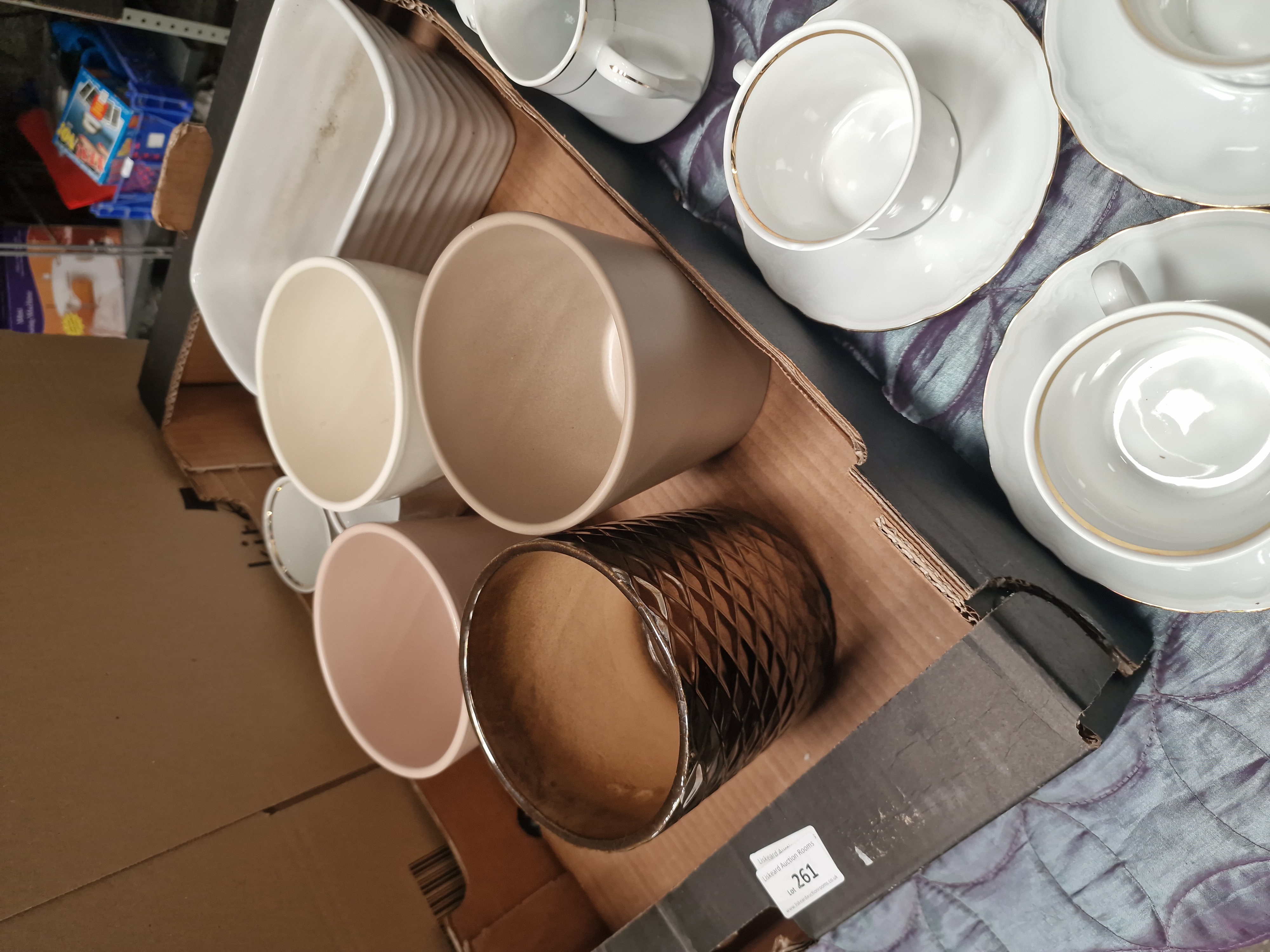This lot comprises a collection of ceramic items for domestic use and decoration, predominantly finished in white and neutral tones. The tea ware includes white porcelain or fine earthenware pieces featuring gilt rims. Serving items consist of a lidded sugar bowl and a cream jug decorated with a silver-toned floral transfer pattern, alongside a separate white jug with a gold-line rim. The ovenware is represented by a large white rectangular baking dish with fluted exterior walls. Also included is a group of large, handleless ceramic vessels or planters finished in various matte and gloss neutral glazes, including shades of cream, tan, and light pink. A single decorative vessel features a dark bronze-toned finish with a prominent moulded diamond geometric texture to the exterior. No manufacturer marks or factory stamps are visible on the bases or bodies of the items. A lot sticker from Liskeard Auction Rooms is present on the storage box.