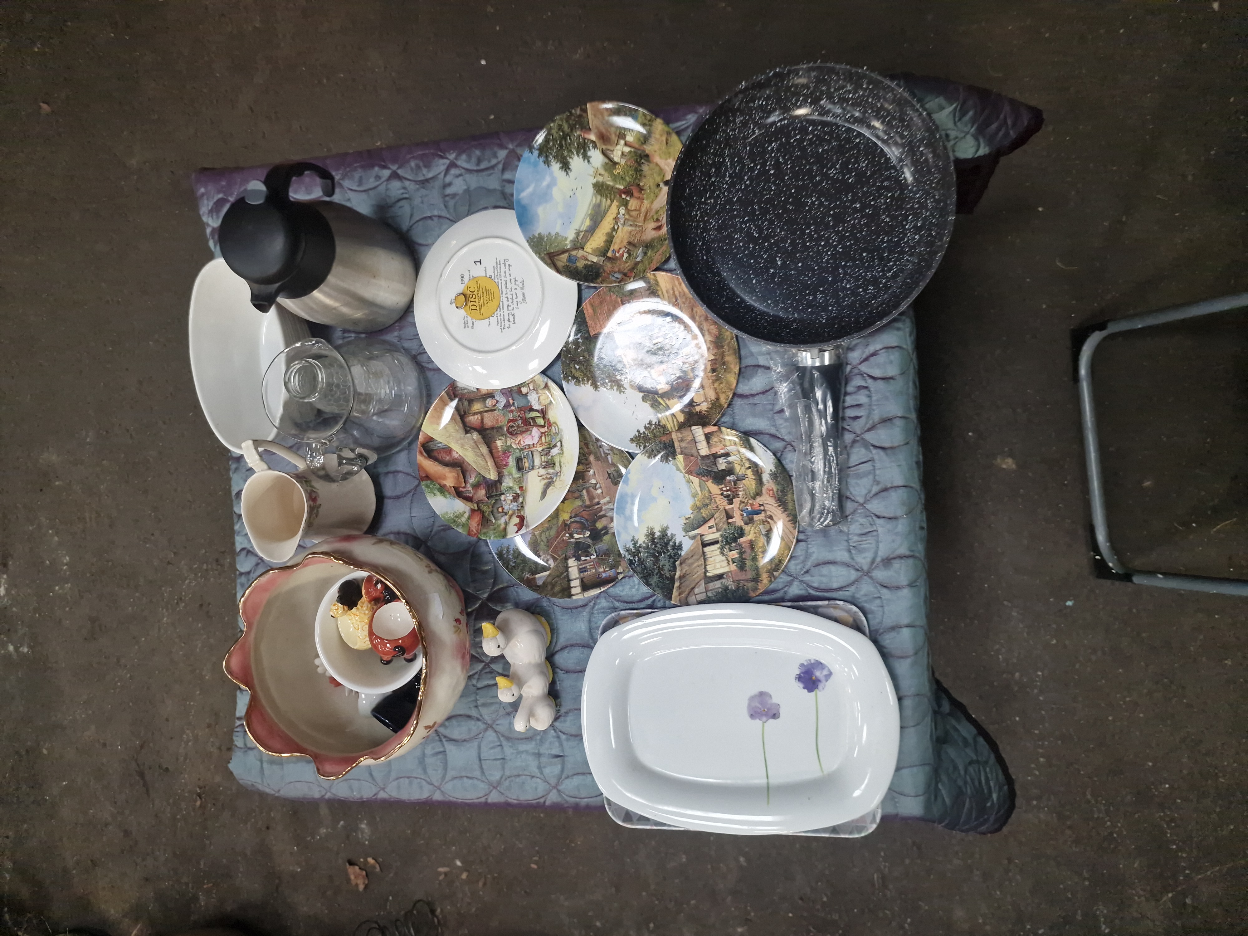 The items are generally in good, used condition. The frying pan appears to be unused with the handle still in original plastic wrapping. Minor surface wear and light abrasions consistent with age and domestic use may be present on ceramic and glass surfaces. No significant chips or cracks were observed during initial inspection.
