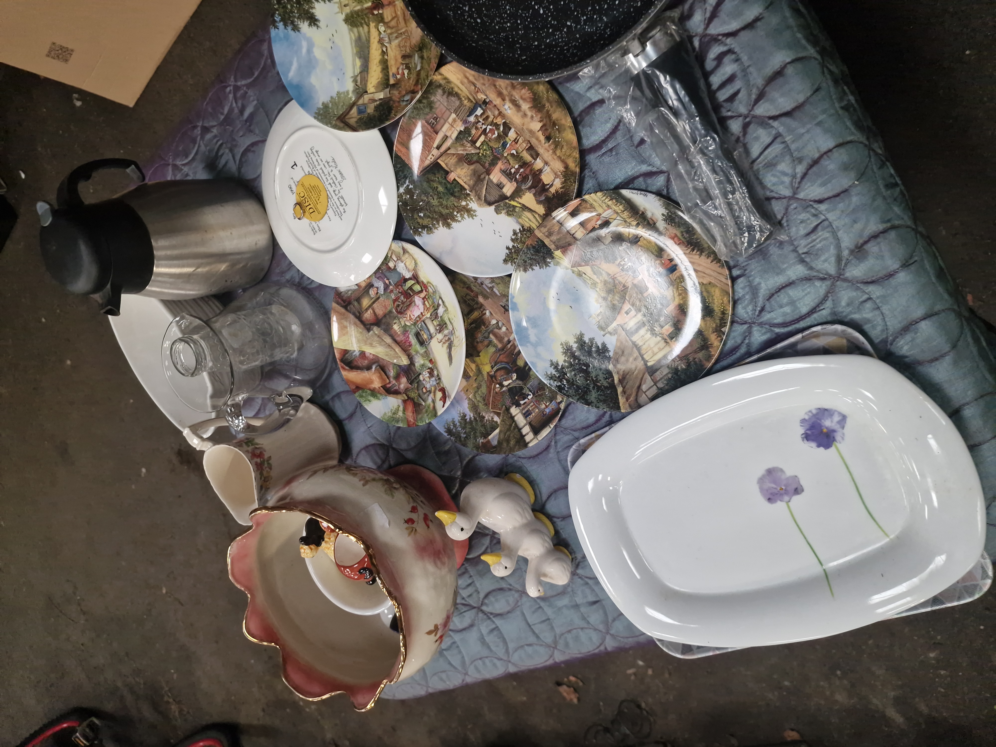 A mixed collection of late 20th-century decorative ceramics and functional kitchen items. The group includes several ceramic collector plates from The Village series, featuring transfer-printed English pastoral scenes, with reverse markings for DISC and dated 1990. Also present is a small ceramic plate bearing the printed signature of Jill Barklem. Decorative ceramic items comprise a large planter with a pink ruffled rim and floral motifs, an oval platter decorated with purple pansies, and various small bird figurines. The kitchenware includes a large black-and-white speckled non-stick frying pan with a wrapped handle, a stainless steel thermal carafe with a black plastic lid, and a clear glass dressing shaker printed with a balsamic vinaigrette recipe. Further items include a blue and white patterned bowl and a white scalloped-edge bowl with floral transfers.