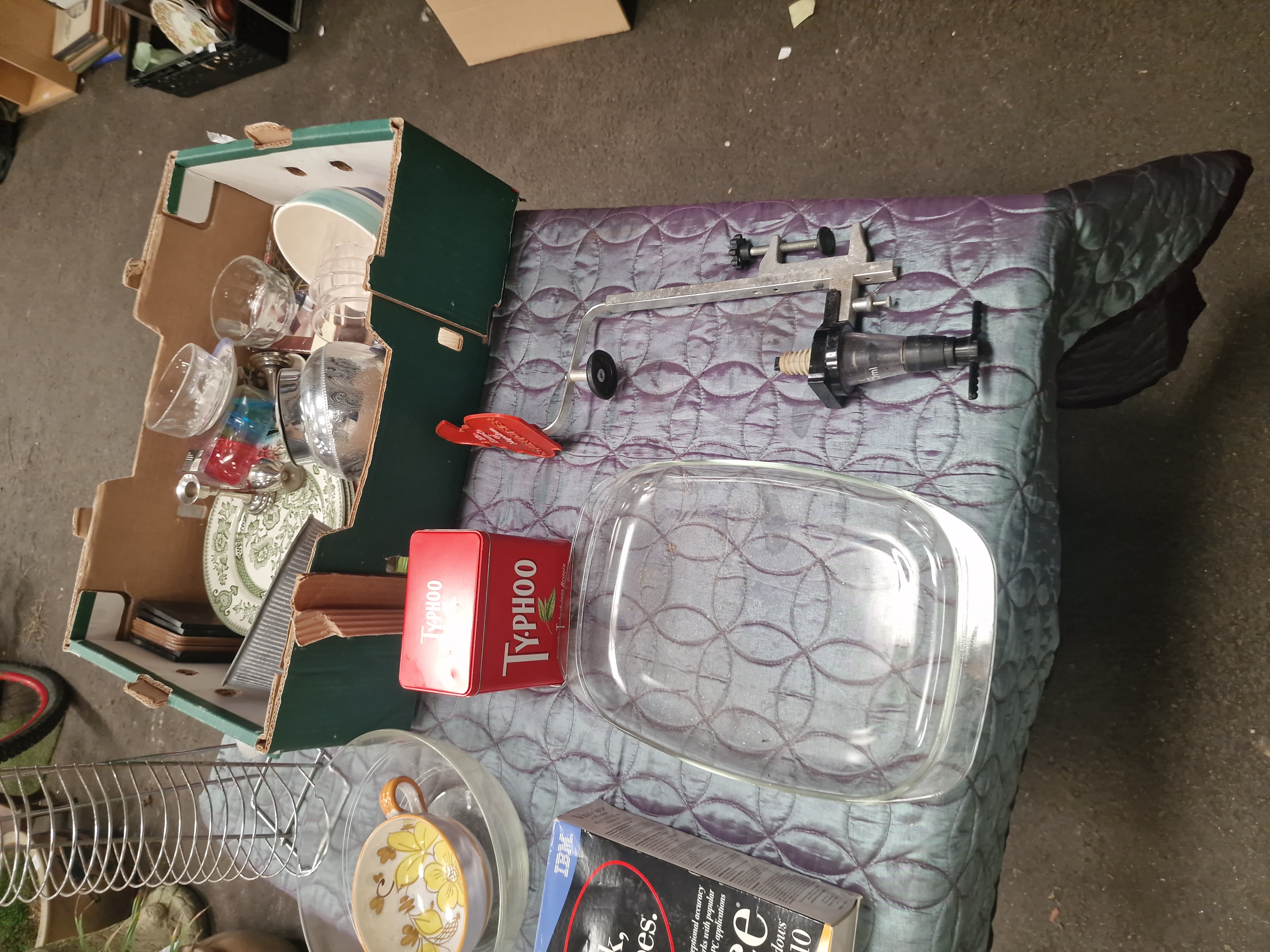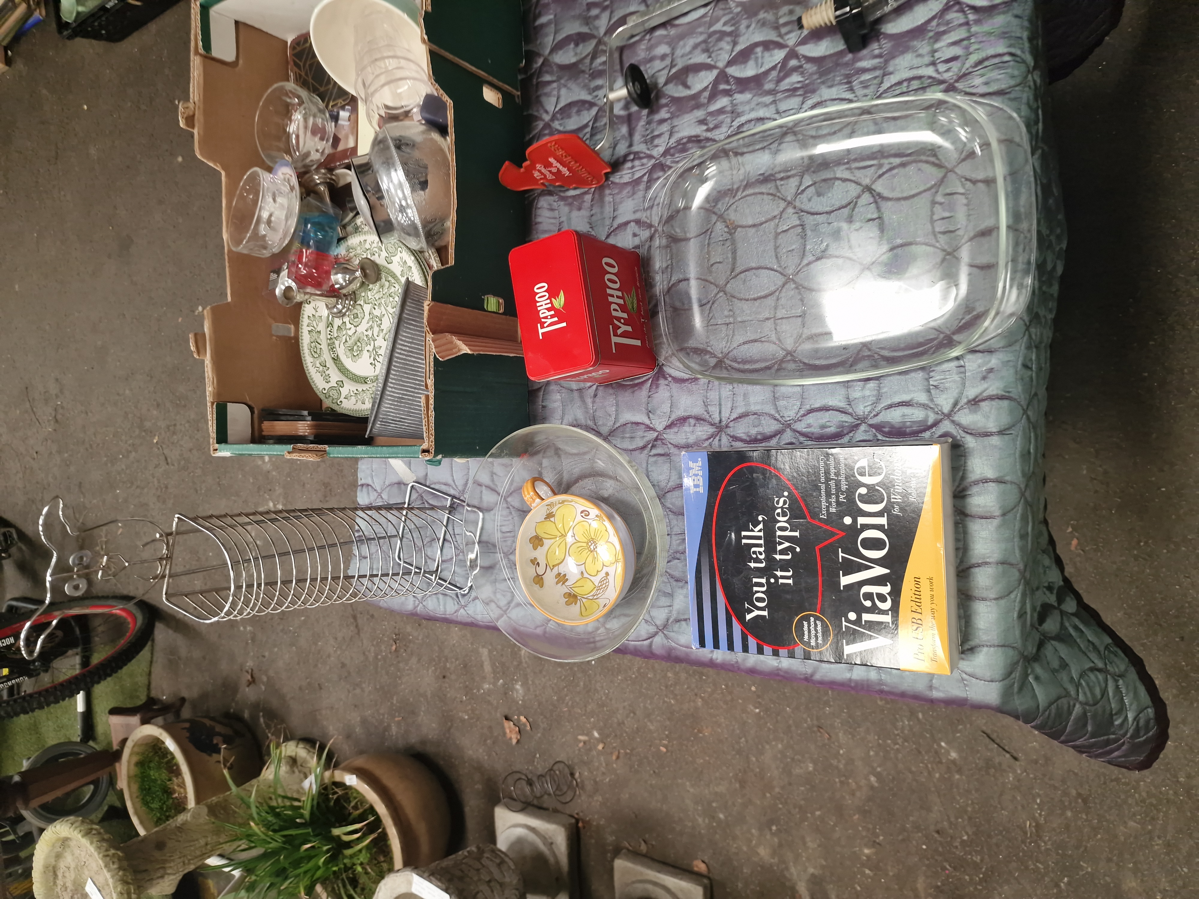 A collection of various household and kitchen items. The lot includes a large rectangular clear glass oven dish and a boxed assortment of miscellaneous glassware and ceramic plates featuring green transferware floral patterns. Also present is a silver-toned metal bowl, a chrome-finished wire storage rack, and a clear glass bowl containing a smaller ceramic bowl with a yellow floral motif. Notable items include a red Typhoo tea tin, a boxed IBM ViaVoice Release 10 software package, and a bar-mounted spirit measure with a metal clamp and a red accessory bearing the Courvoisier mark.