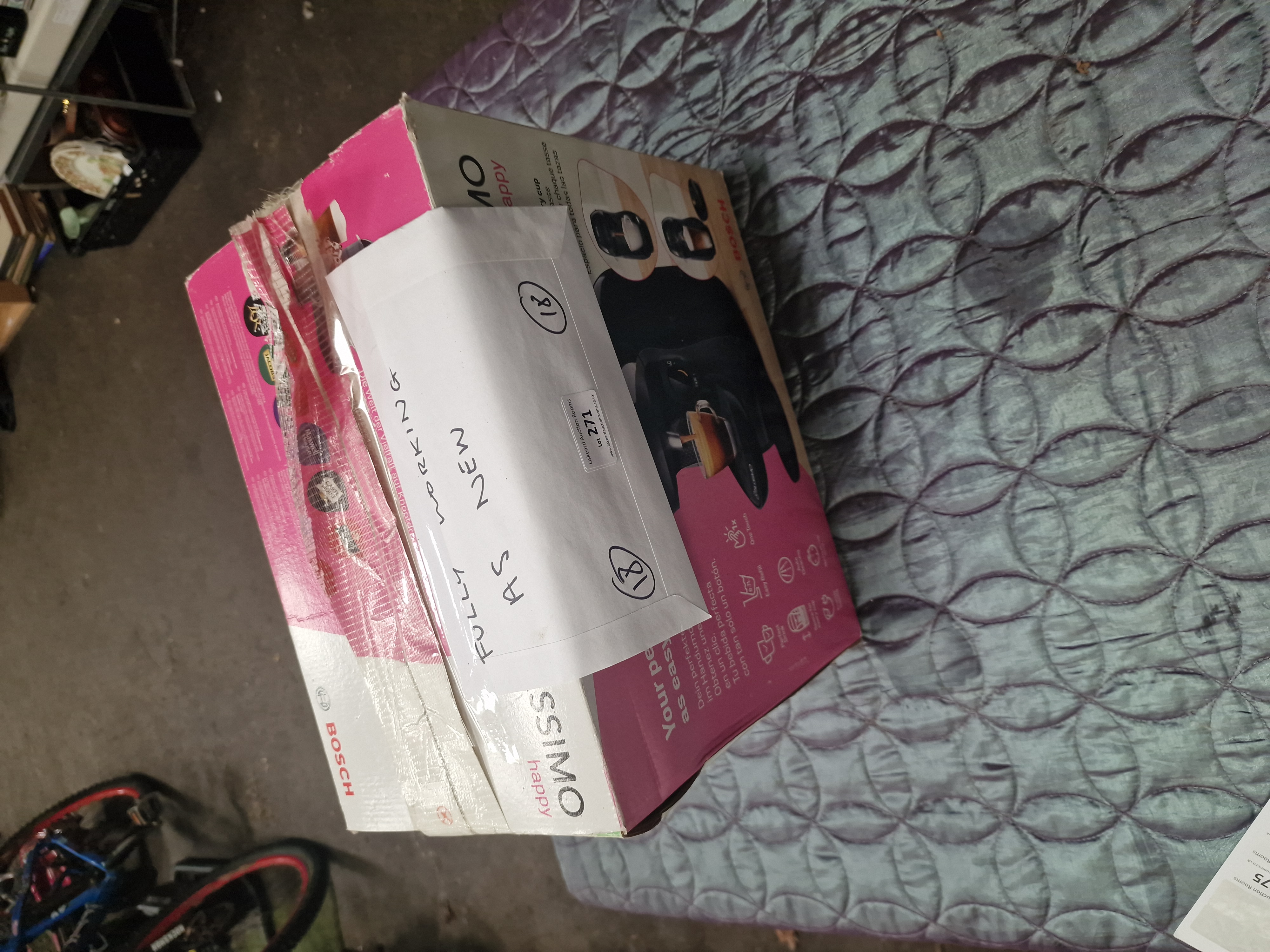 The original retail box shows visible wear, including minor tearing and clear adhesive tape. A handwritten vendor note attached to the box states the item is fully working as new. The machine has not been independently power-tested or internally inspected by the auction house. Lot sticker 271 is present on the packaging.