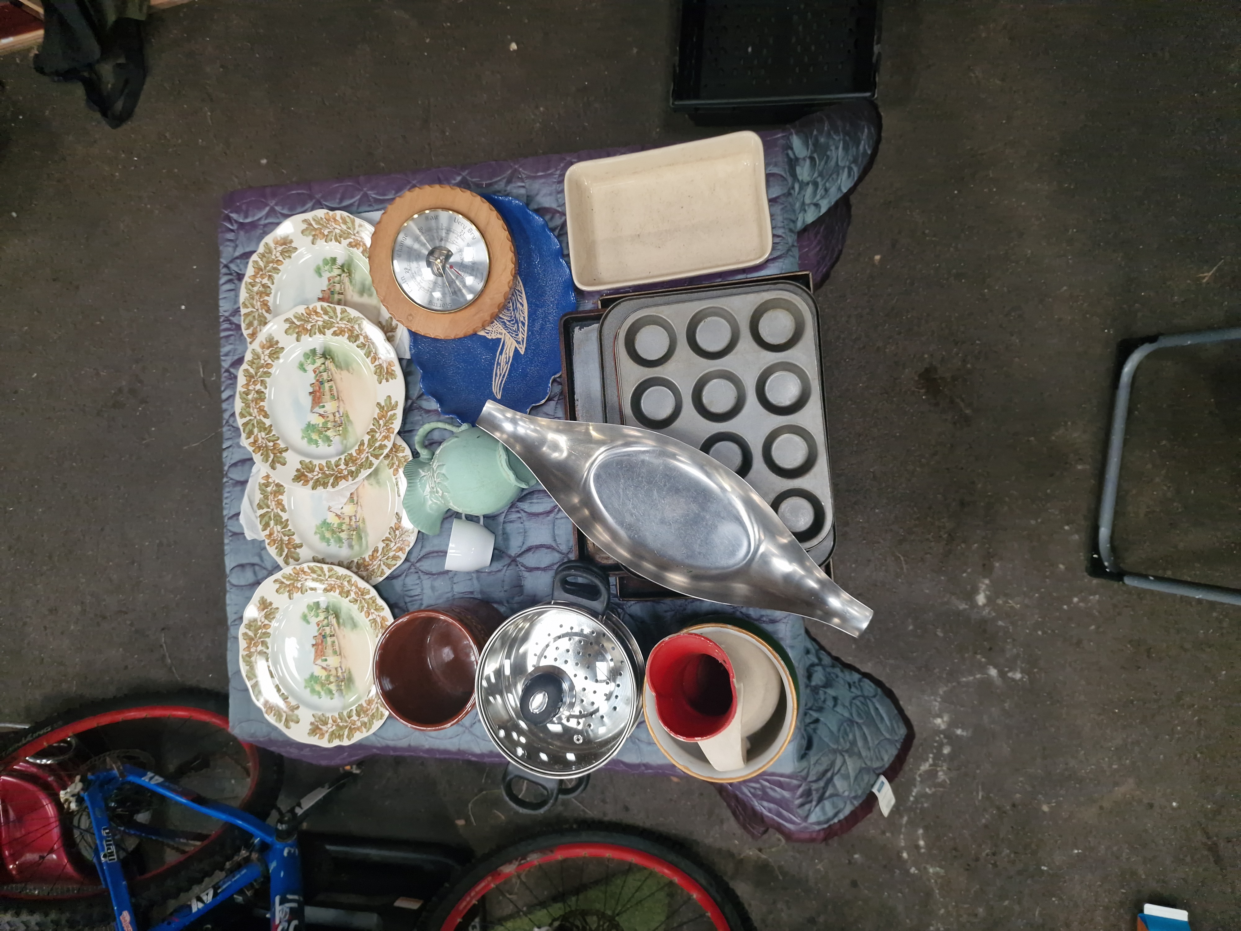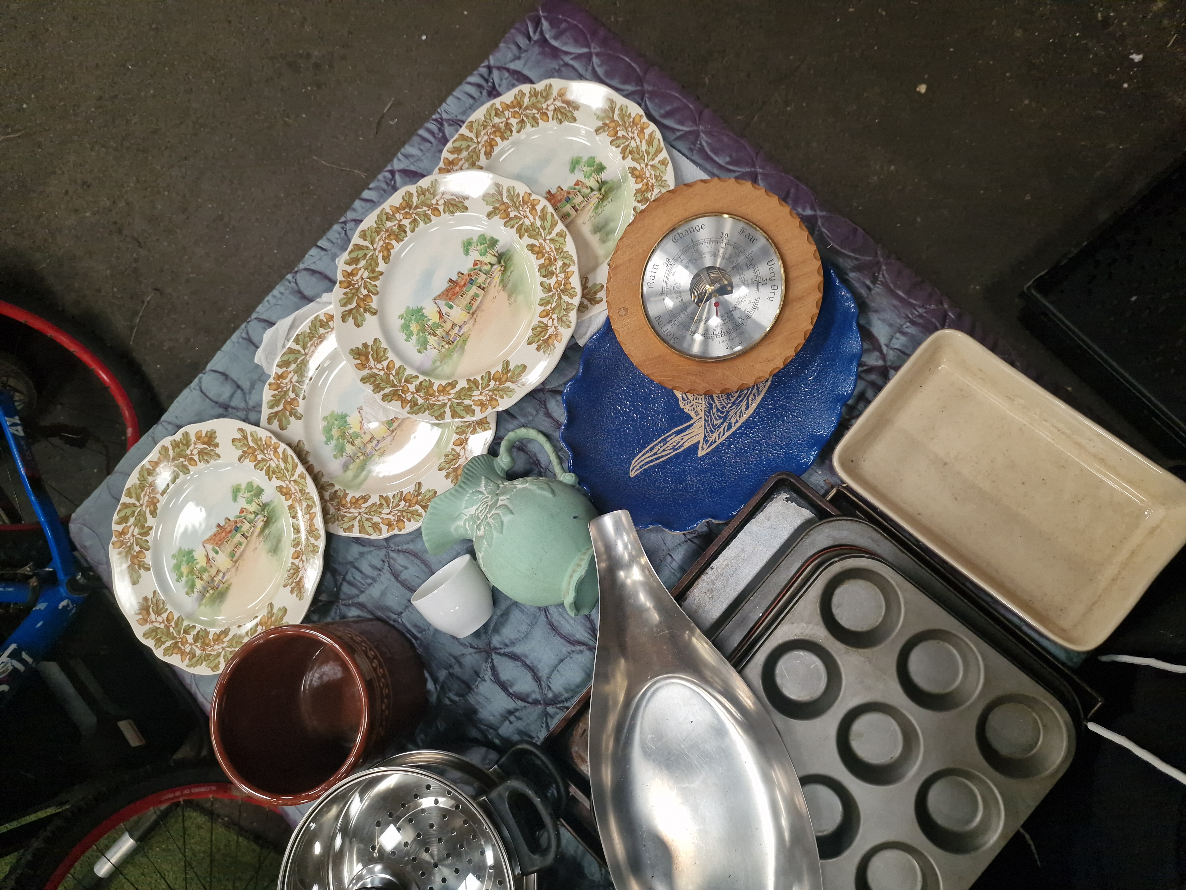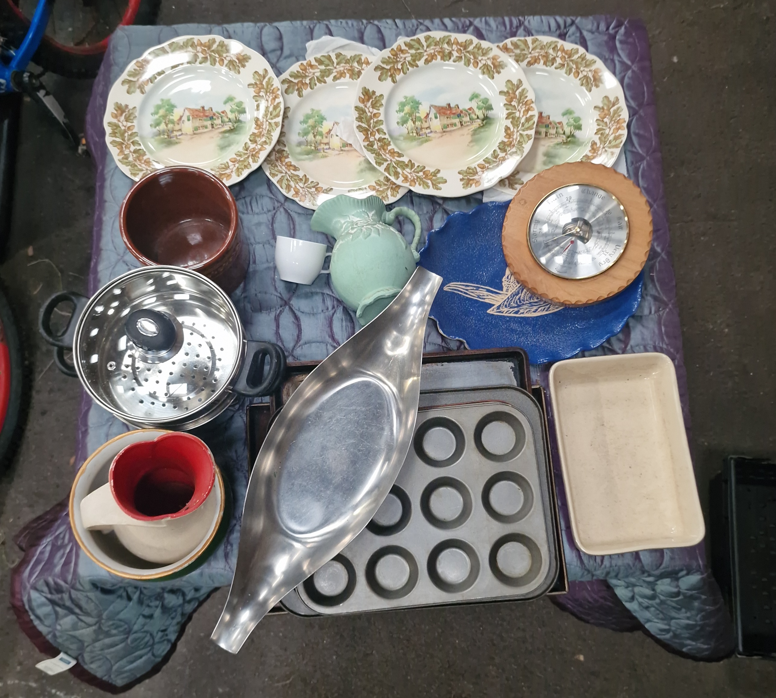 A collection of various decorative and household items. The ceramic component includes several plates featuring scalloped edges with an oak leaf and acorn border surrounding central polychrome pastoral cottage scenes. Also included is a mint green relief-moulded jug, a blue-glazed shallow bowl with a white-line bird motif, a brown glazed stoneware jar, a rectangular cream-coloured baking dish, and a large pitcher with a white exterior and red interior. Metalware comprises an elongated double-ended stainless steel sauce boat, a stainless steel steamer pot with a glass lid, and various baking tins including a muffin pan. The lot also features a circular wall barometer with a turned wooden surround, the face marked with traditional meteorological terms including Stormy, Rain, Change, Fair, and Very Dry. No maker’s marks or hallmarks are visible on the items.