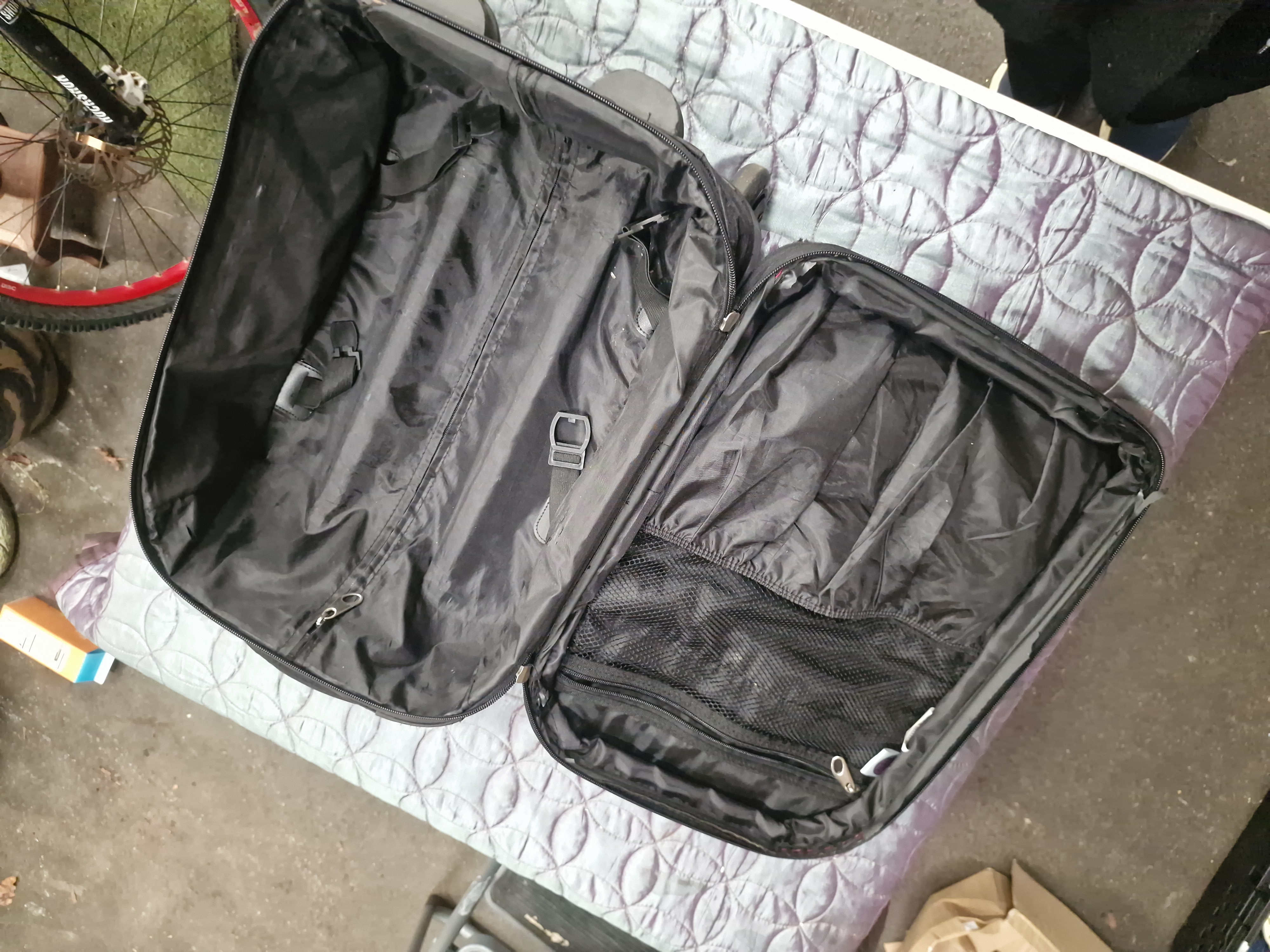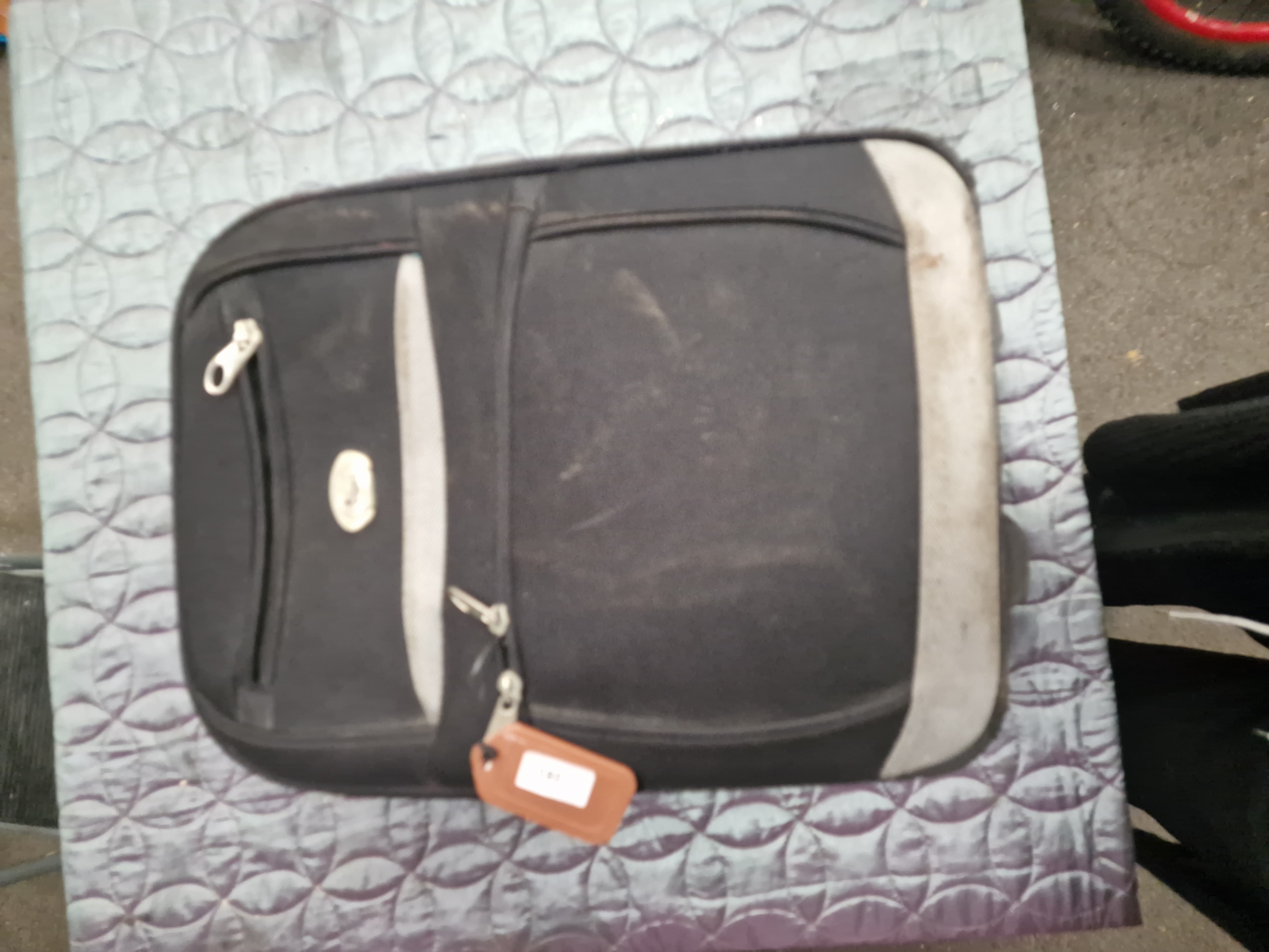 The item is in used condition, showing significant surface marks, dirt, and wear to the exterior fabric and silver-toned trim.