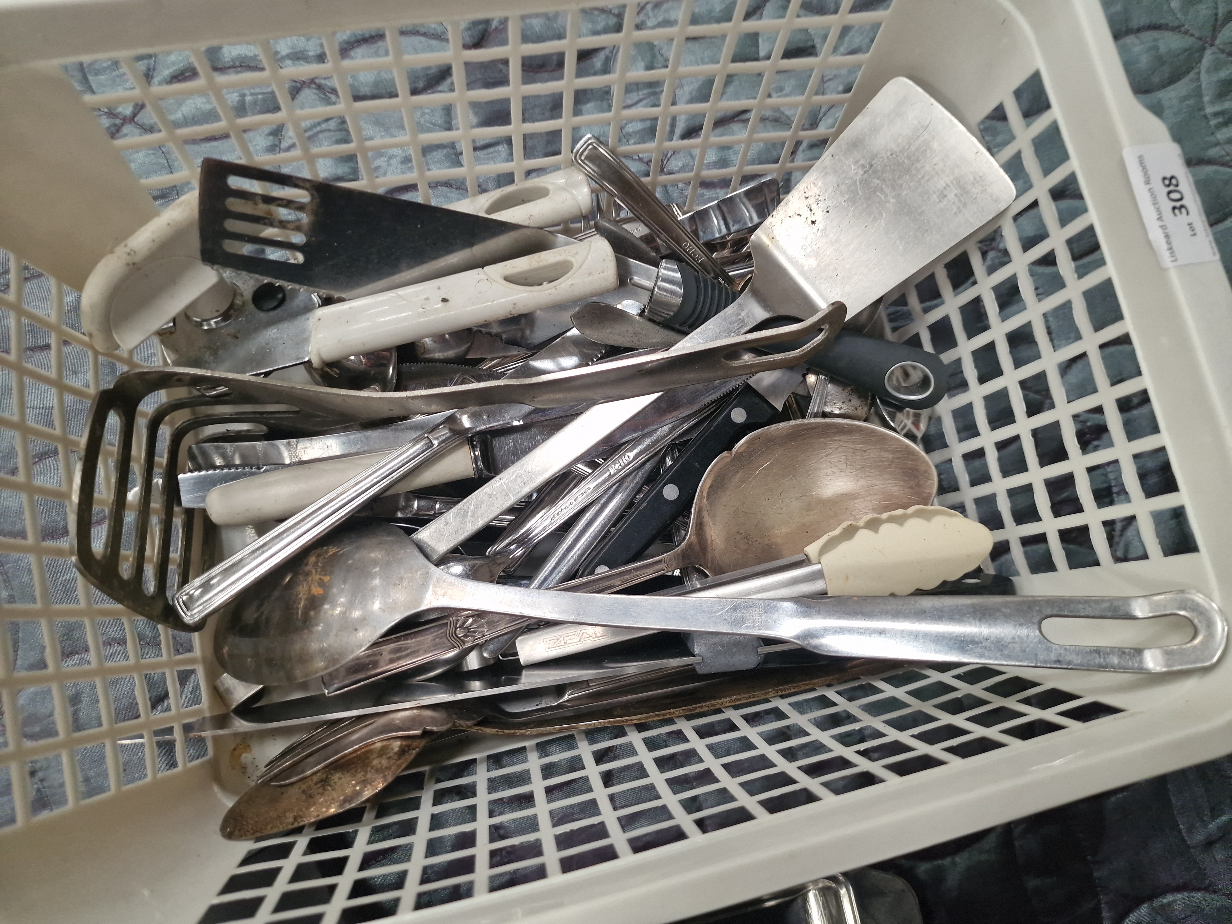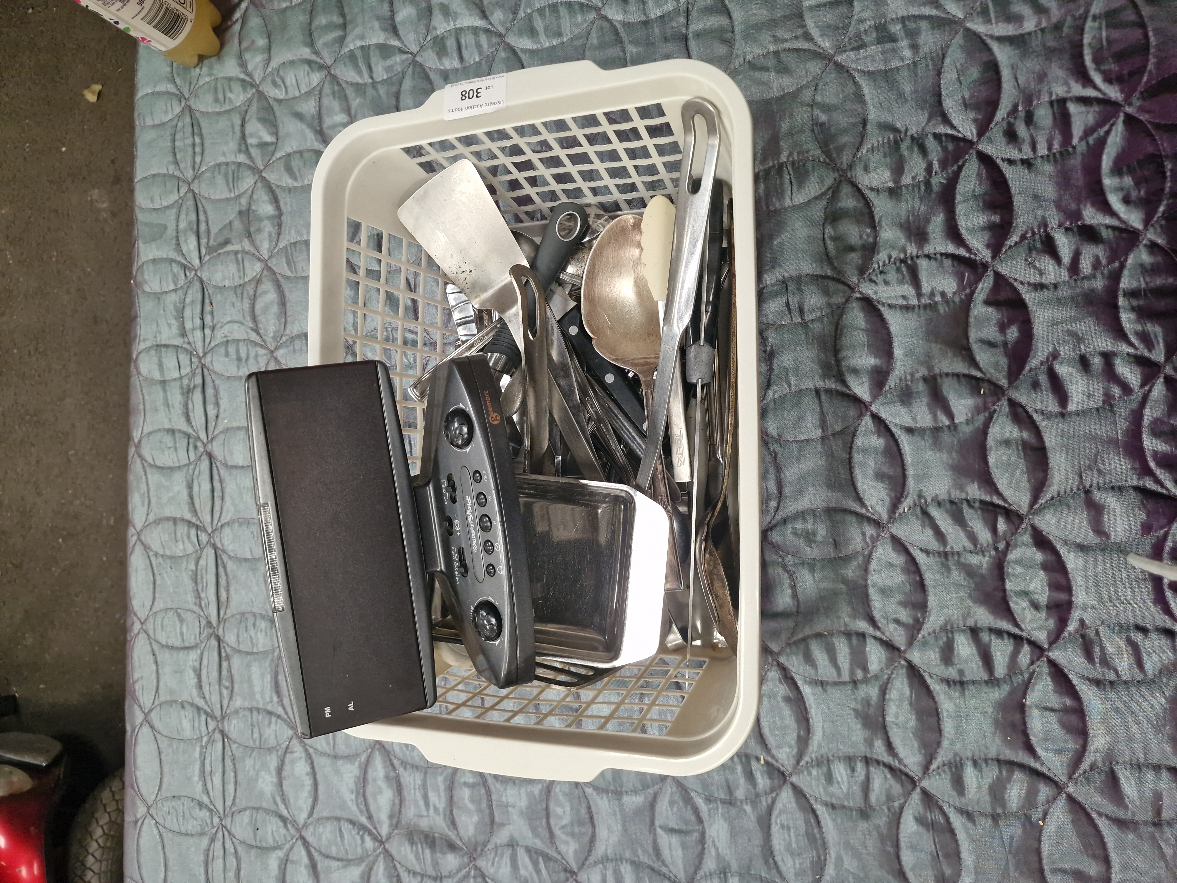 A household lot comprising a Geemarc Wake n Shake digital alarm clock and a collection of kitchen utensils and cutlery, presented in a white plastic basket. The black electronic alarm clock features a large display and a control console with various dials and buttons for tone and volume adjustments. The assortment of kitchenware includes stainless steel and composite tools such as spatulas, tongs, serving spoons, a potato masher, and various knives and forks. Visible maker marks on the utensils include Zeal and Echo, with several pieces in the style of OXO Good Grips. The collection includes items constructed from stainless steel, plastic, and silicone.