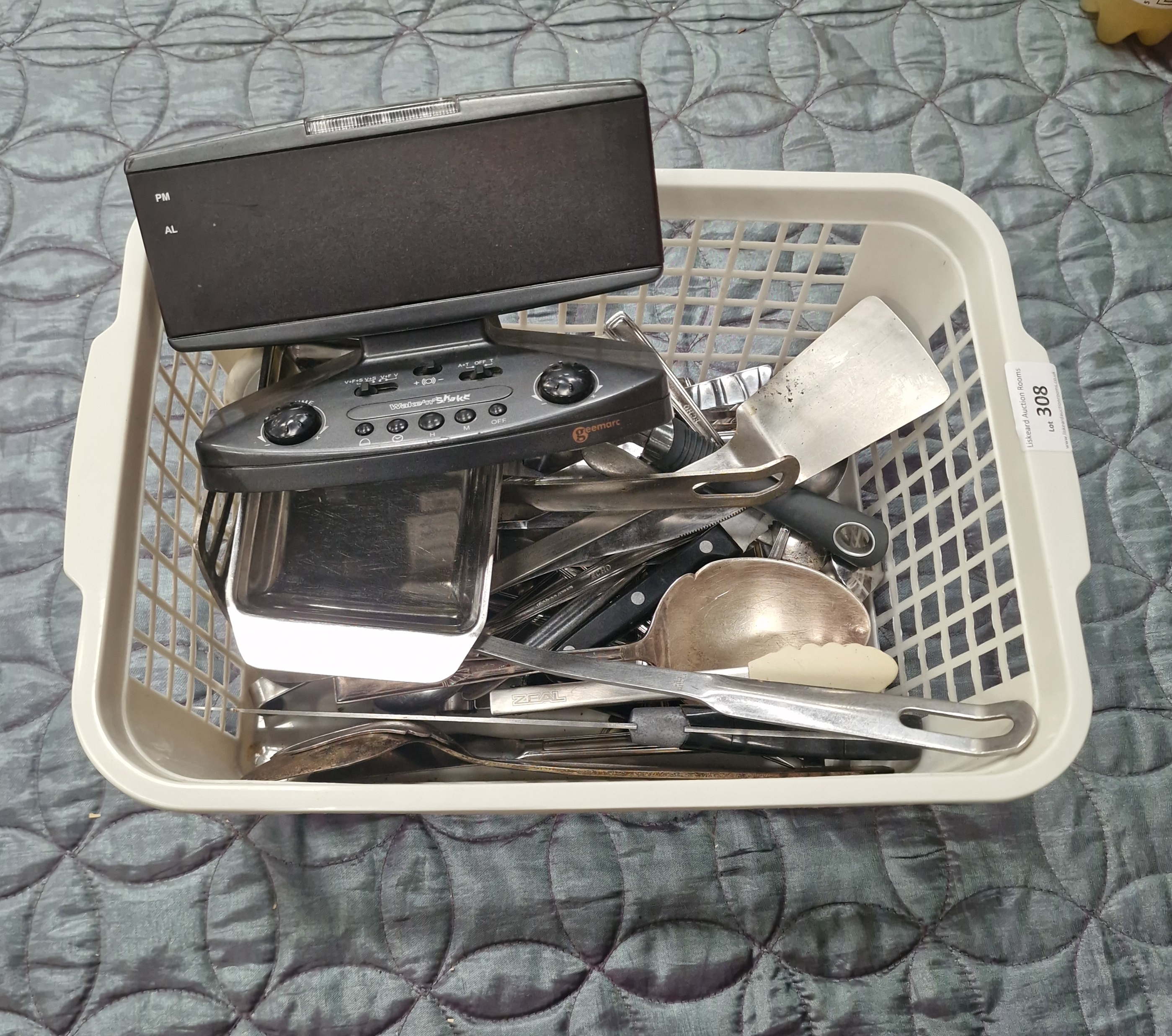 Lot 285: A Geemarc Wake n Shake Alarm Clock and a Collection of Kitchen Utensils