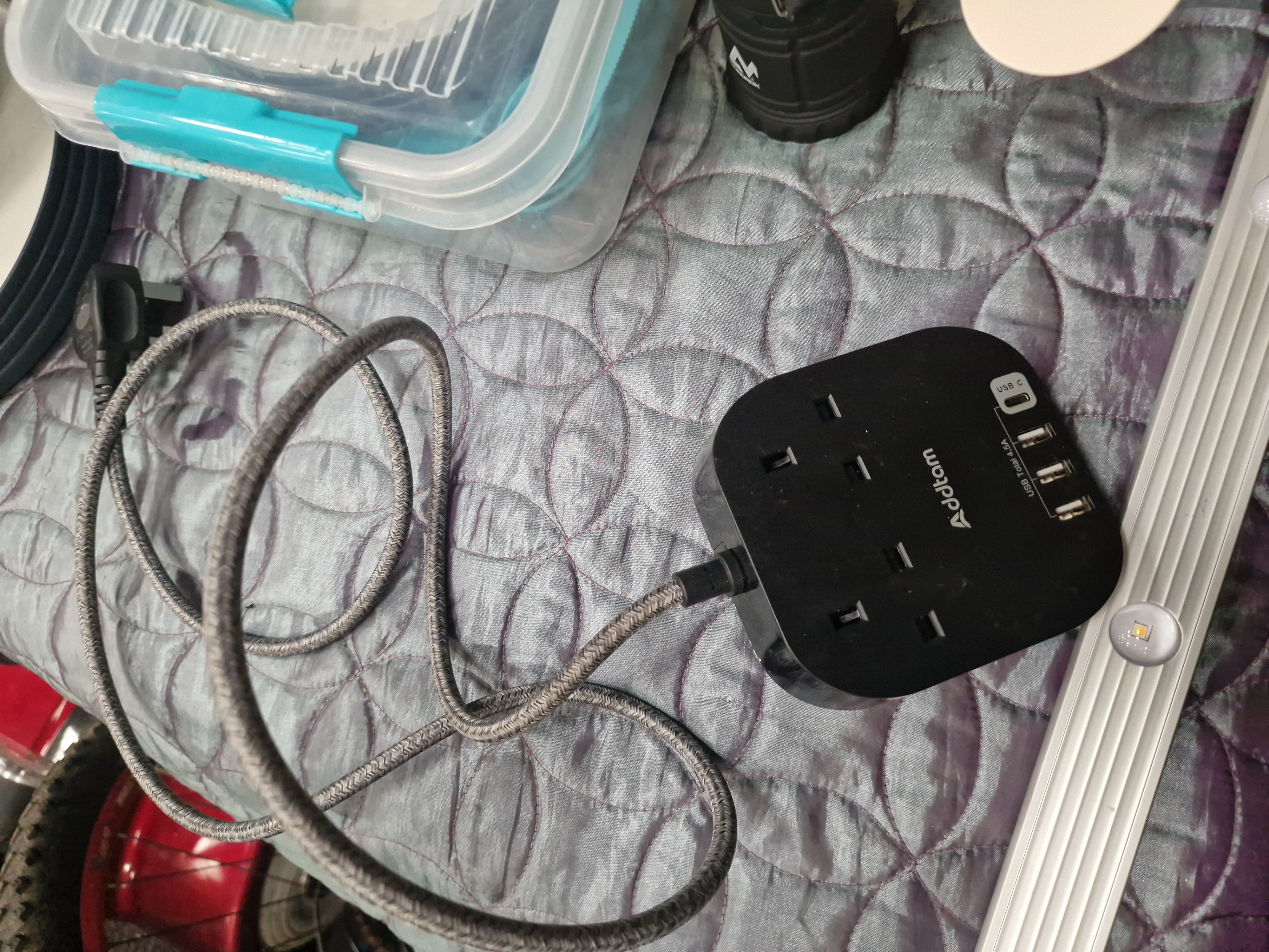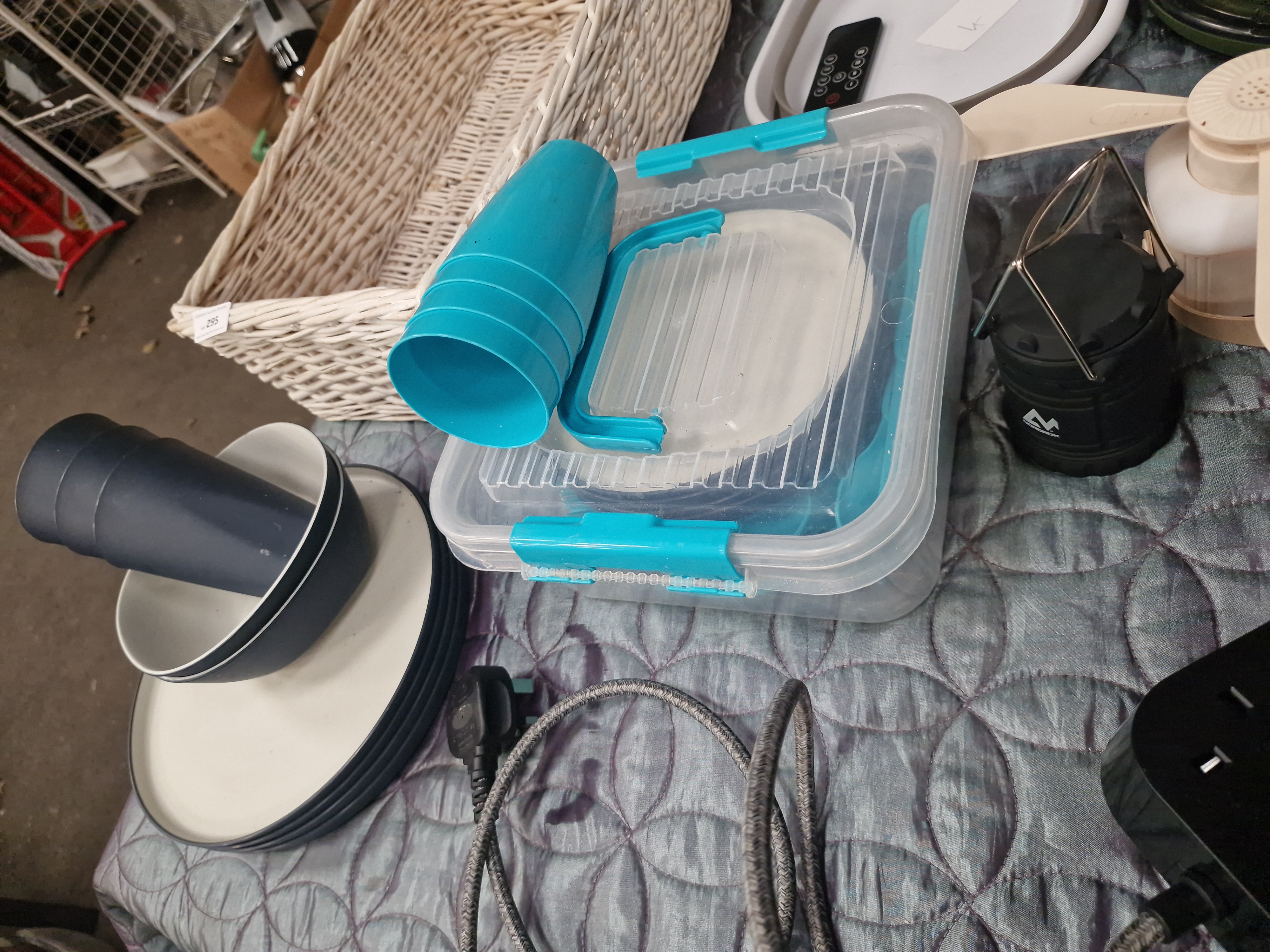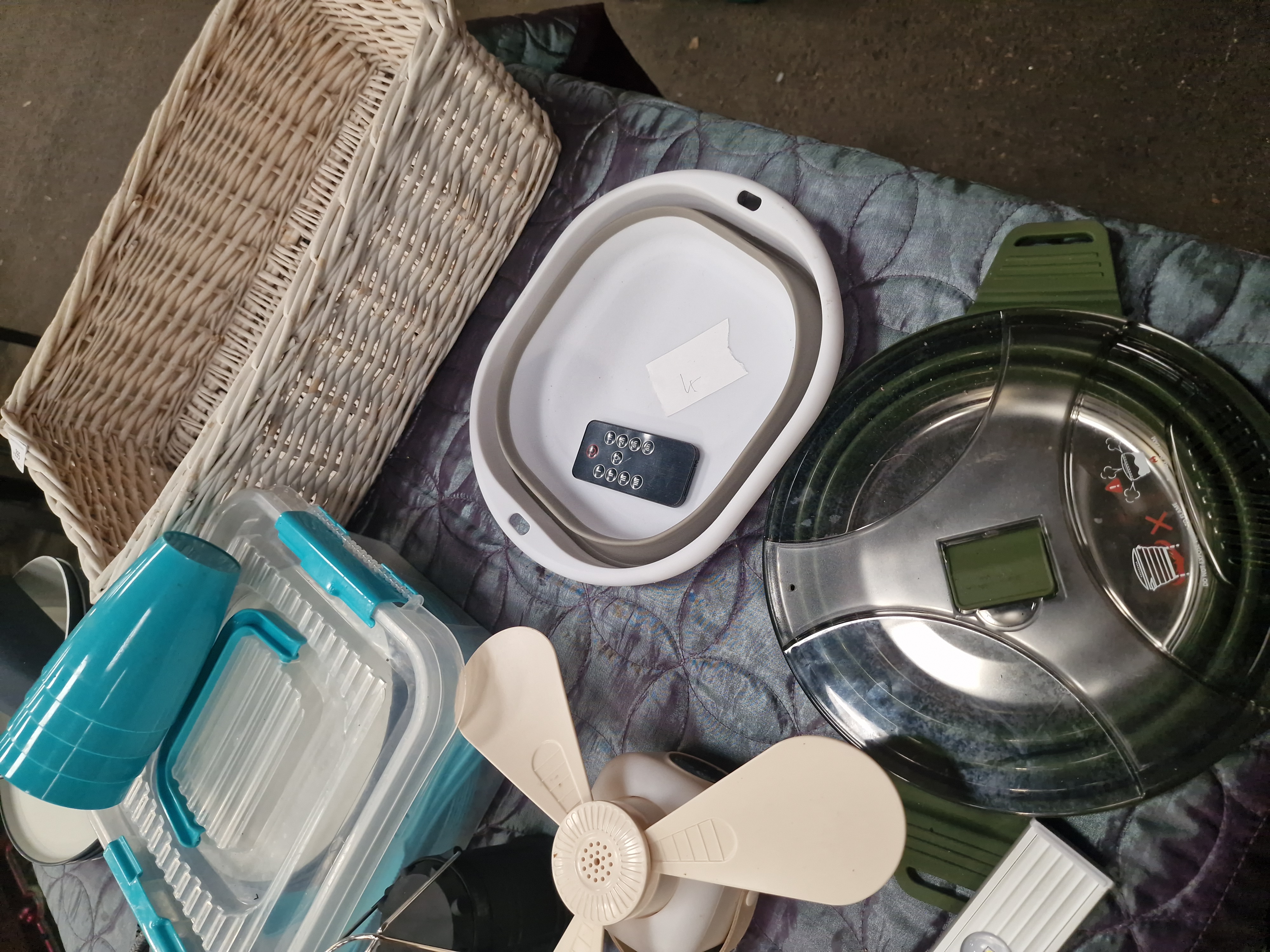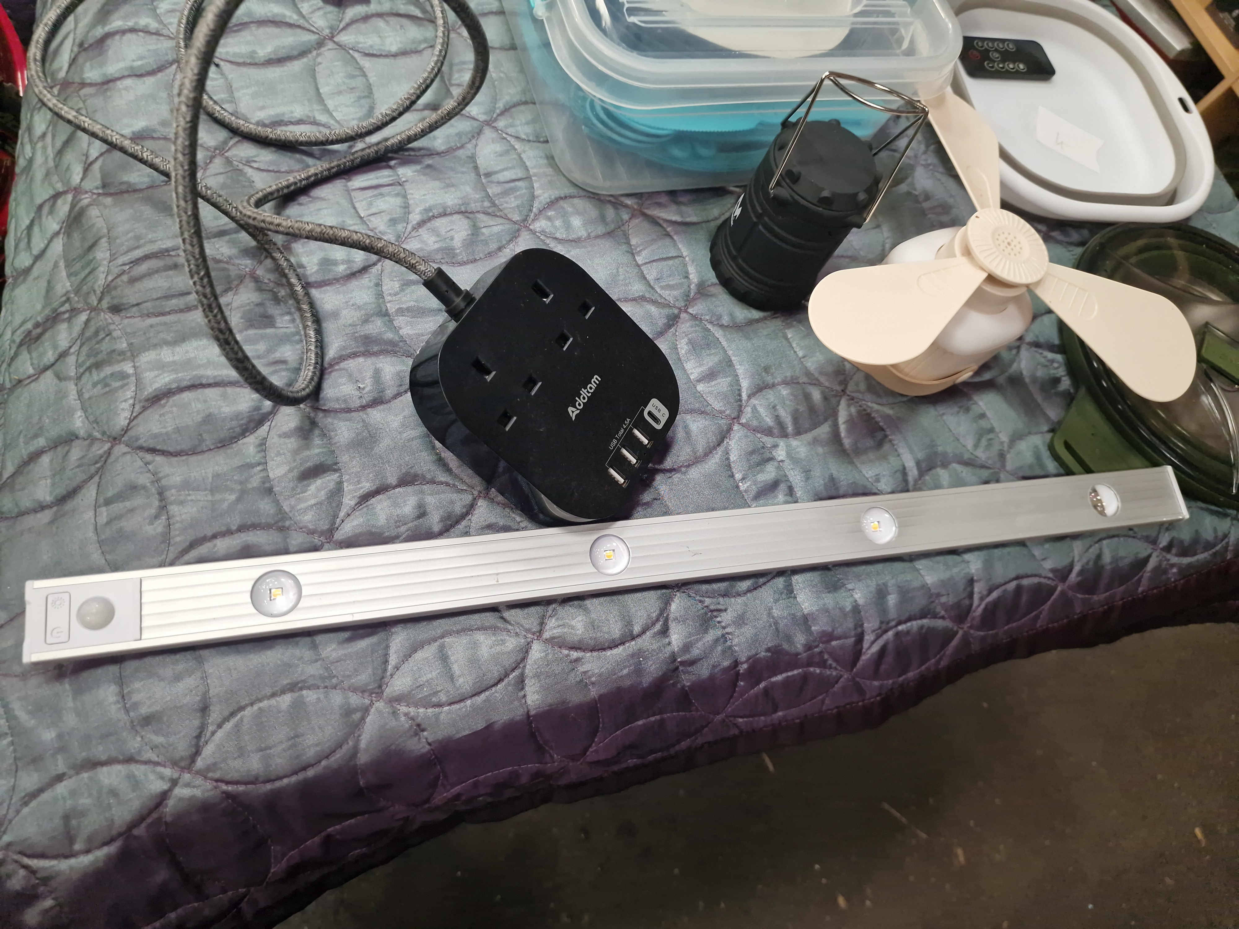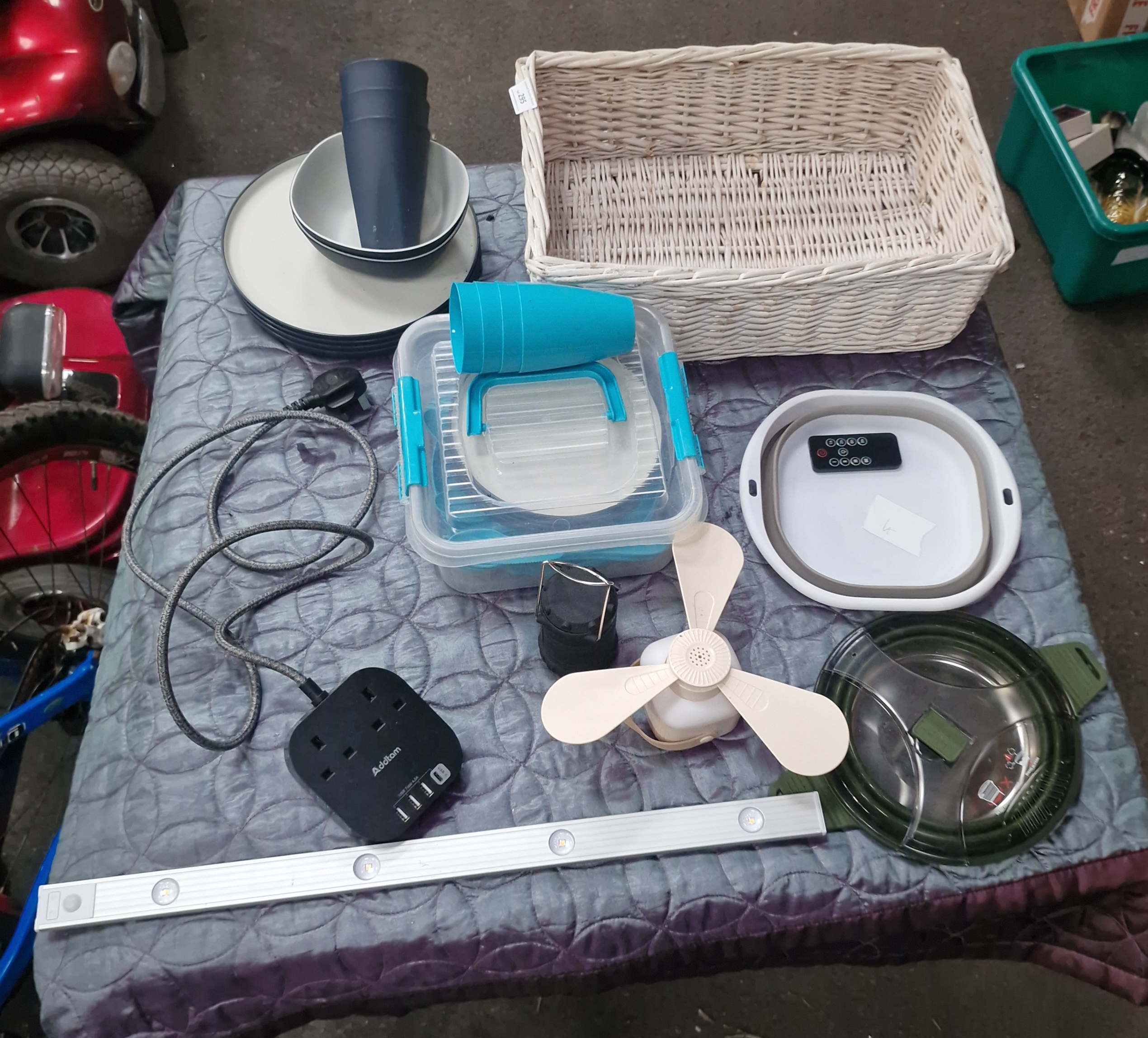 An assortment of household, kitchen, and electrical items. The collection features a Purrified Air pet odour filter, comprising a circular white and grey housing with an accompanying black remote control. Electrical components include an Addtam black power extension block with three UK sockets and three USB ports, including one USB-C port, fitted with a grey braided power cable. Also present is a silver-tone LED light bar with an integrated motion sensor, a white three-blade portable fan, and a compact black LED lantern featuring a mountain-motif logo. The kitchenware includes a set of ceramic dinnerware with plates and bowls in muted tones, a set of blue plastic cups, a clear plastic storage container with blue locking clips, and a green-rimmed clear plastic lid with a steam vent. Storage is provided by a white rectangular wicker basket.