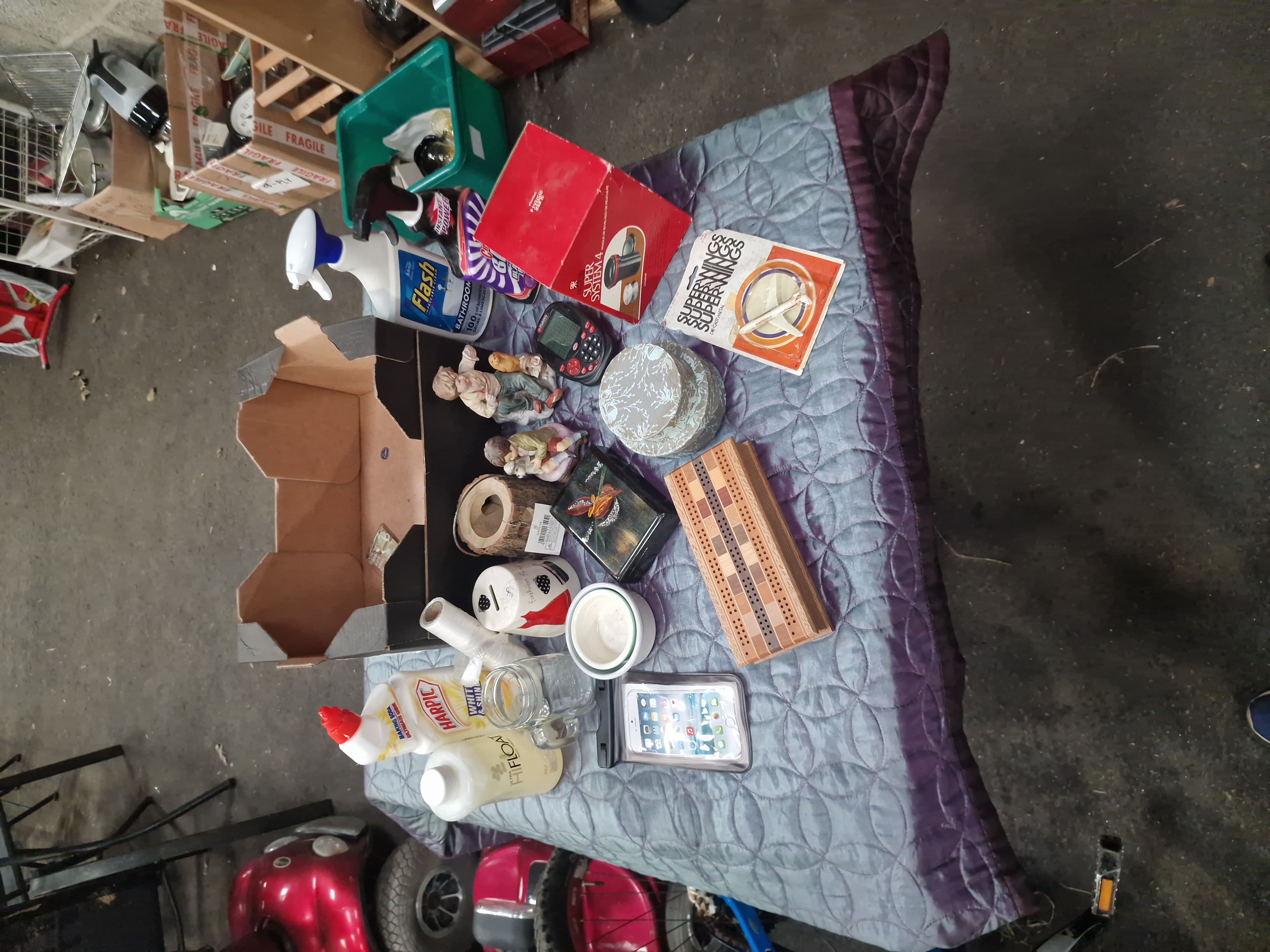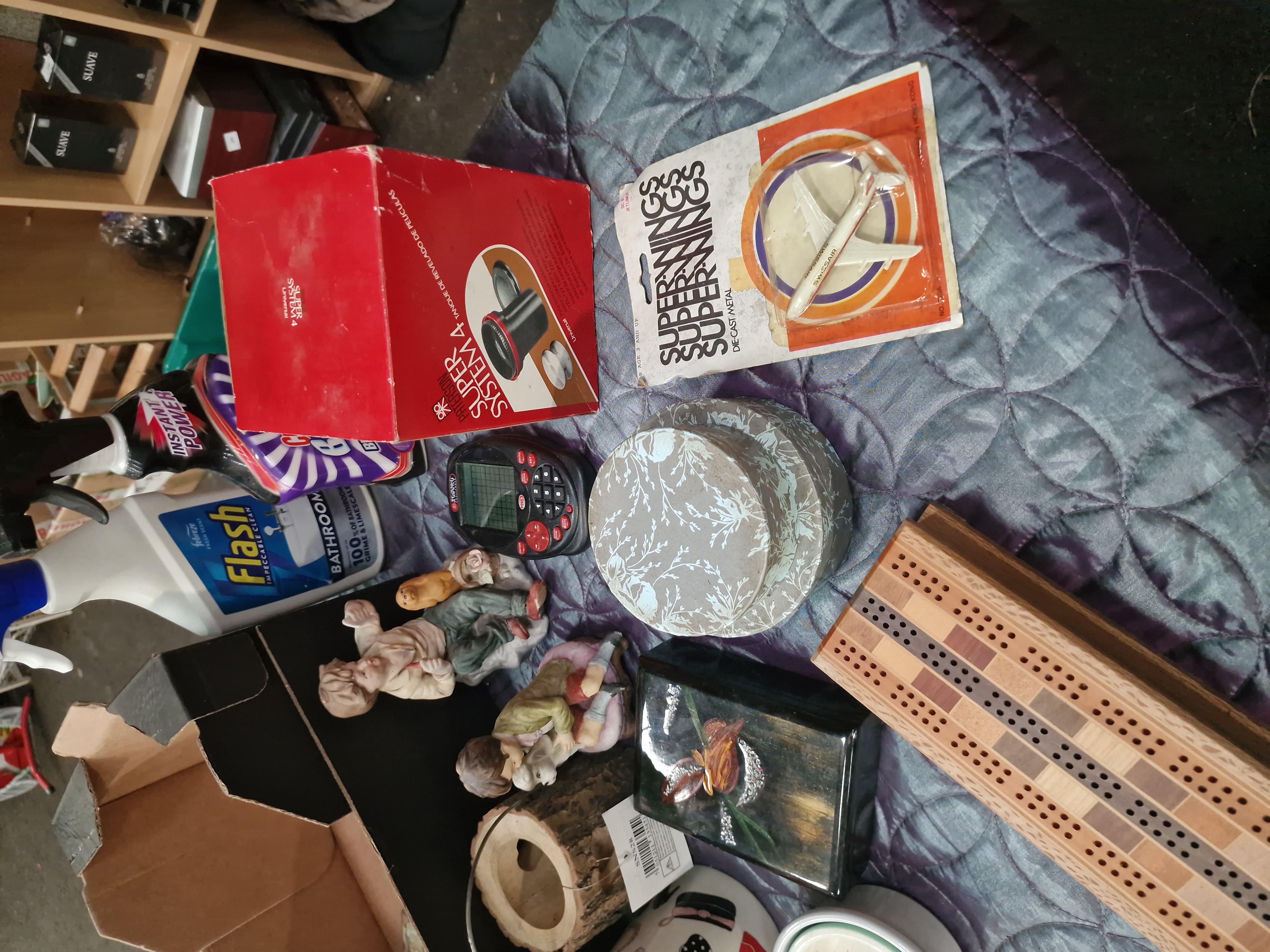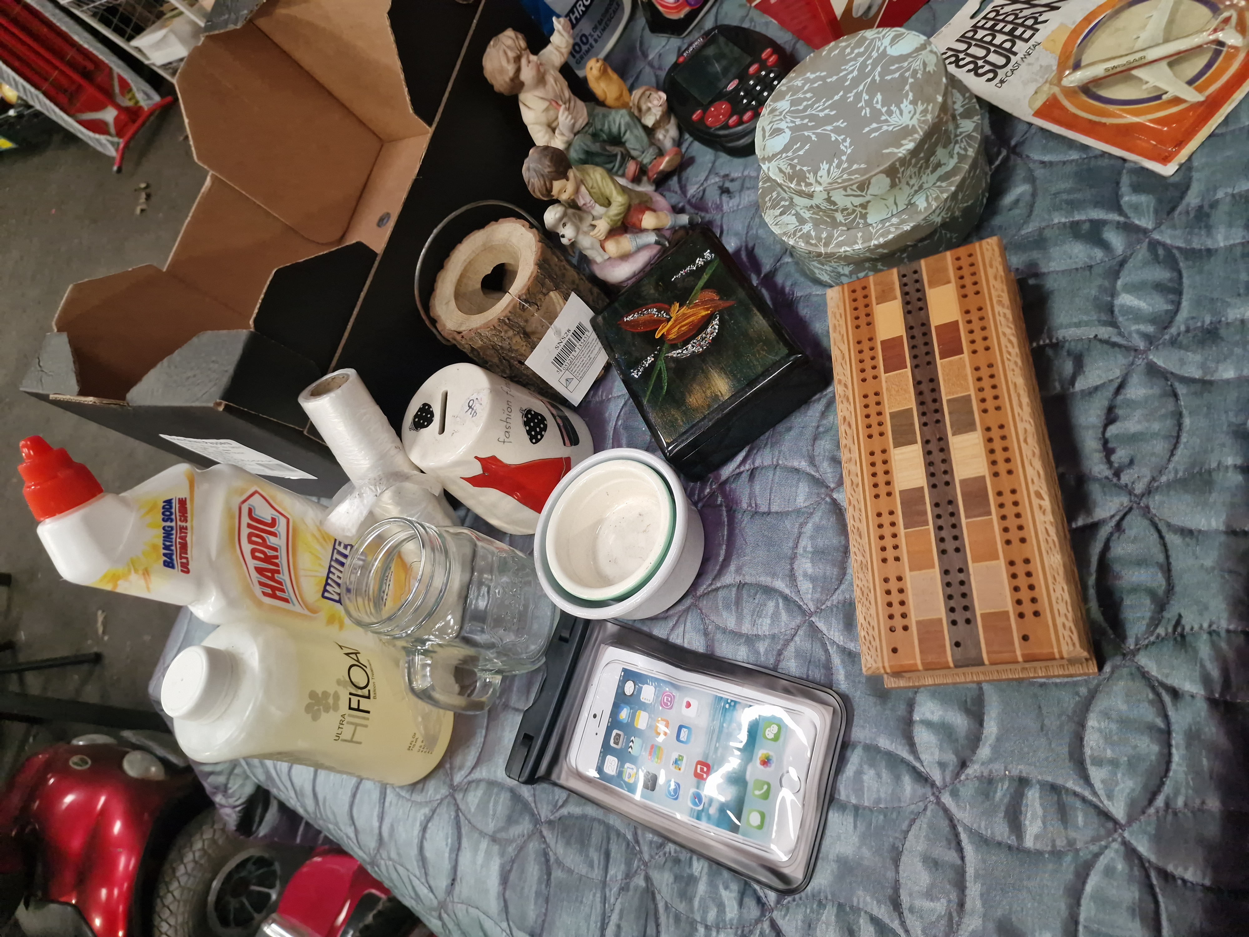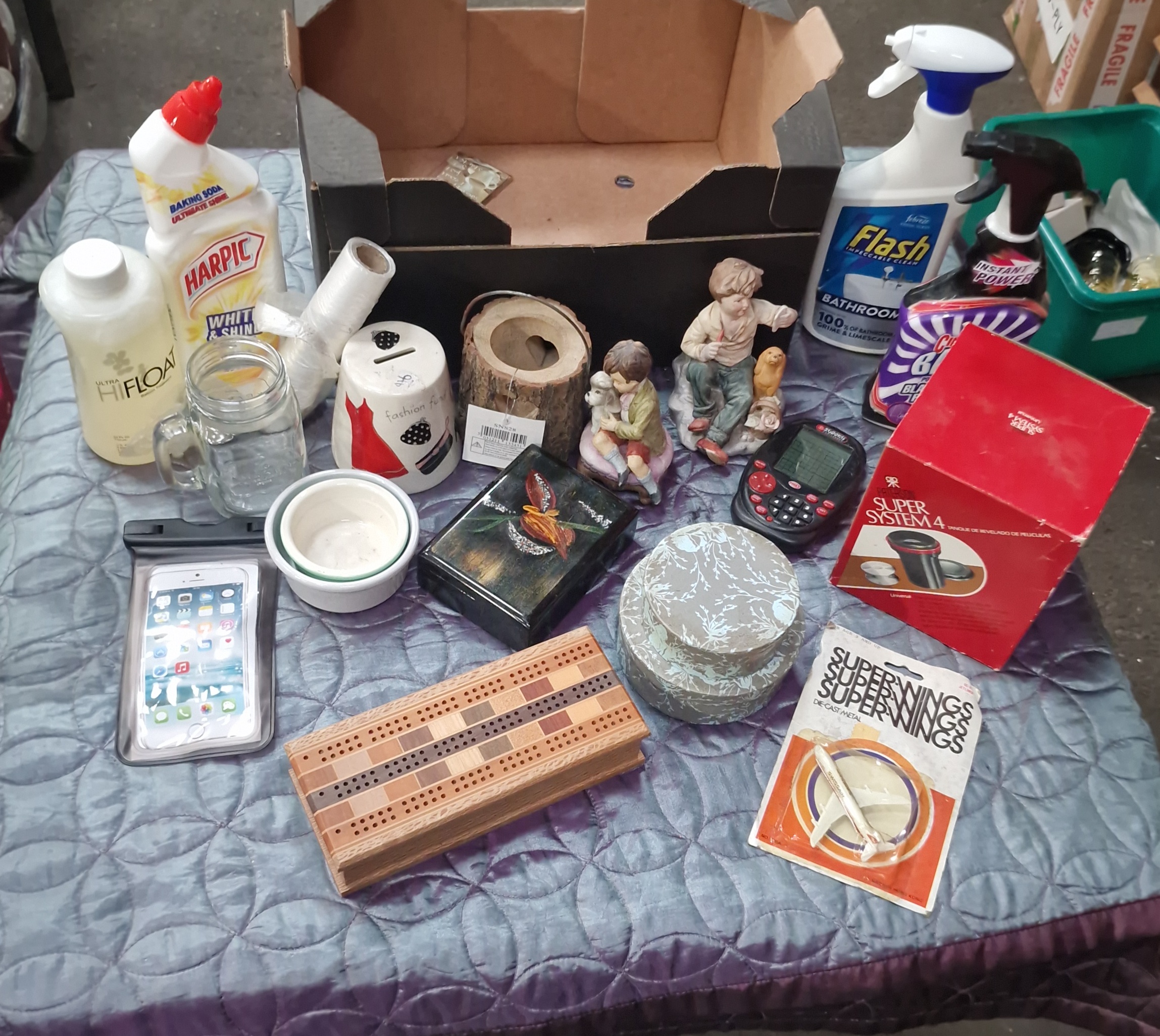 This lot comprises a diverse collection of household goods, decorative items, and electronics. Branded cleaning and household products include Harpic White and Shine, Flash Bathroom spray, and Cillit Bang Instant Power, alongside a bottle of Ultra Hi-Float balloon treatment and a roll of plastic wrap. Collectables and toys include a vintage Superwings die-cast metal toy aeroplane in Swissair livery within its original card-backed blister pack, two ceramic figurines depicting children, and a white ceramic money box with a fashion-themed design. Leisure items consist of a wooden cribbage board featuring a multi-tonal wood inlay and a small handheld electronic device. Decorative pieces include a set of nested round cardboard boxes with a light blue floral pattern, a black decorative box with a raised bird and floral motif, and a log-effect wooden birdhouse ornament with an attached retail tag. Kitchenware and ceramics include a glass mason-style jar with a handle and two small nested ceramic bowls. The lot also contains an Apple iPhone smartphone housed in a clear waterproof protective pouch and an original red box for a Paterson Super System 4 universal film developing tank.