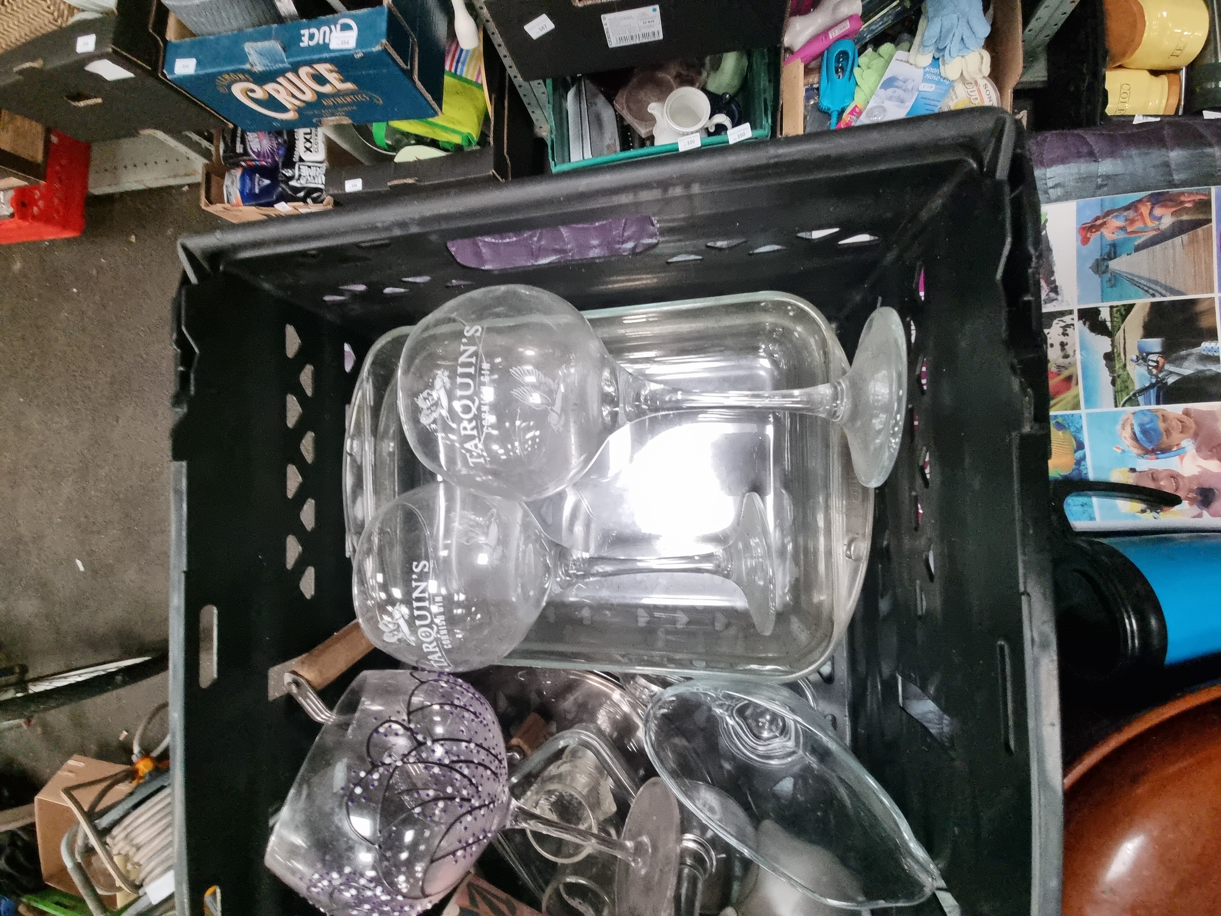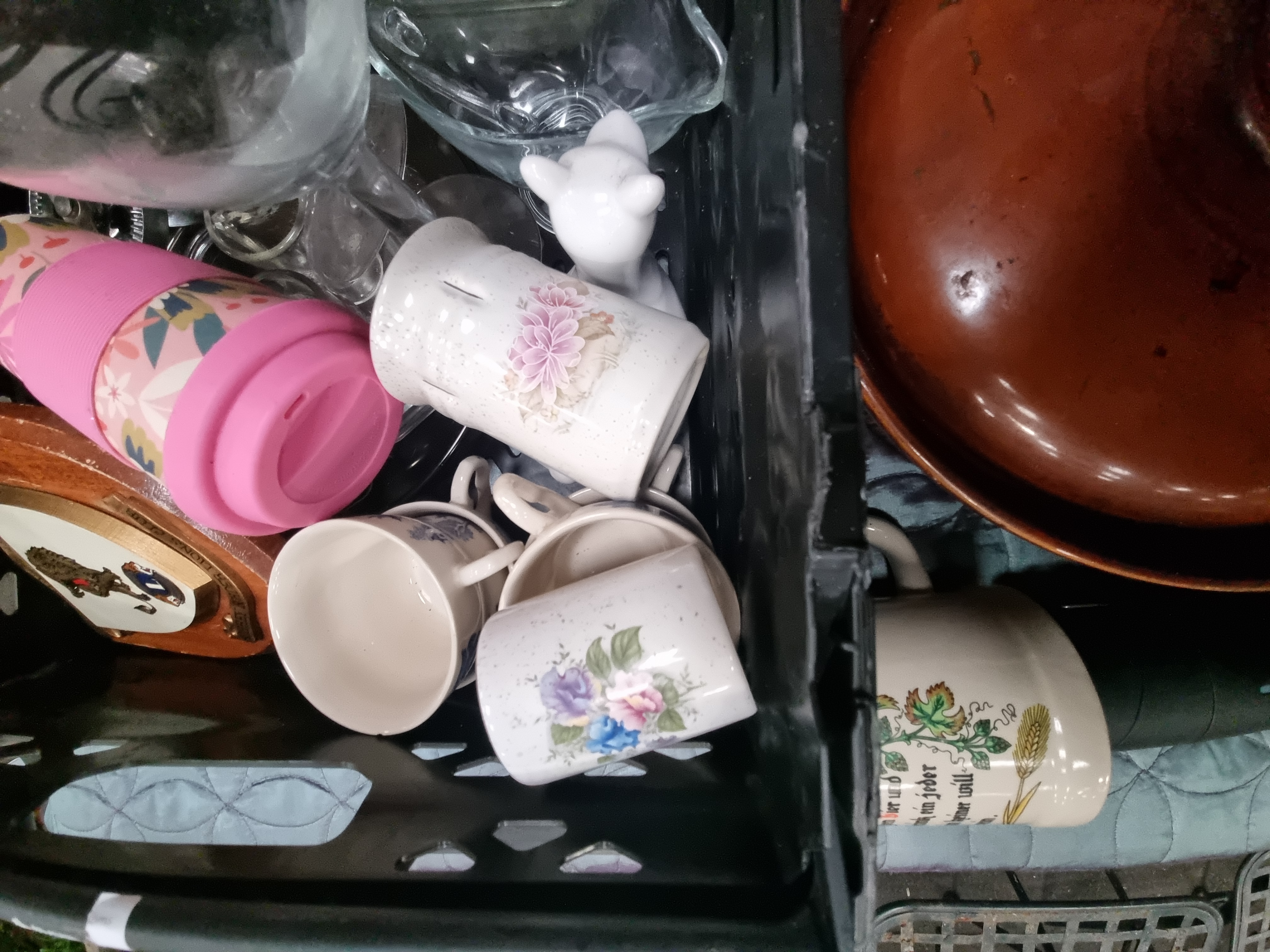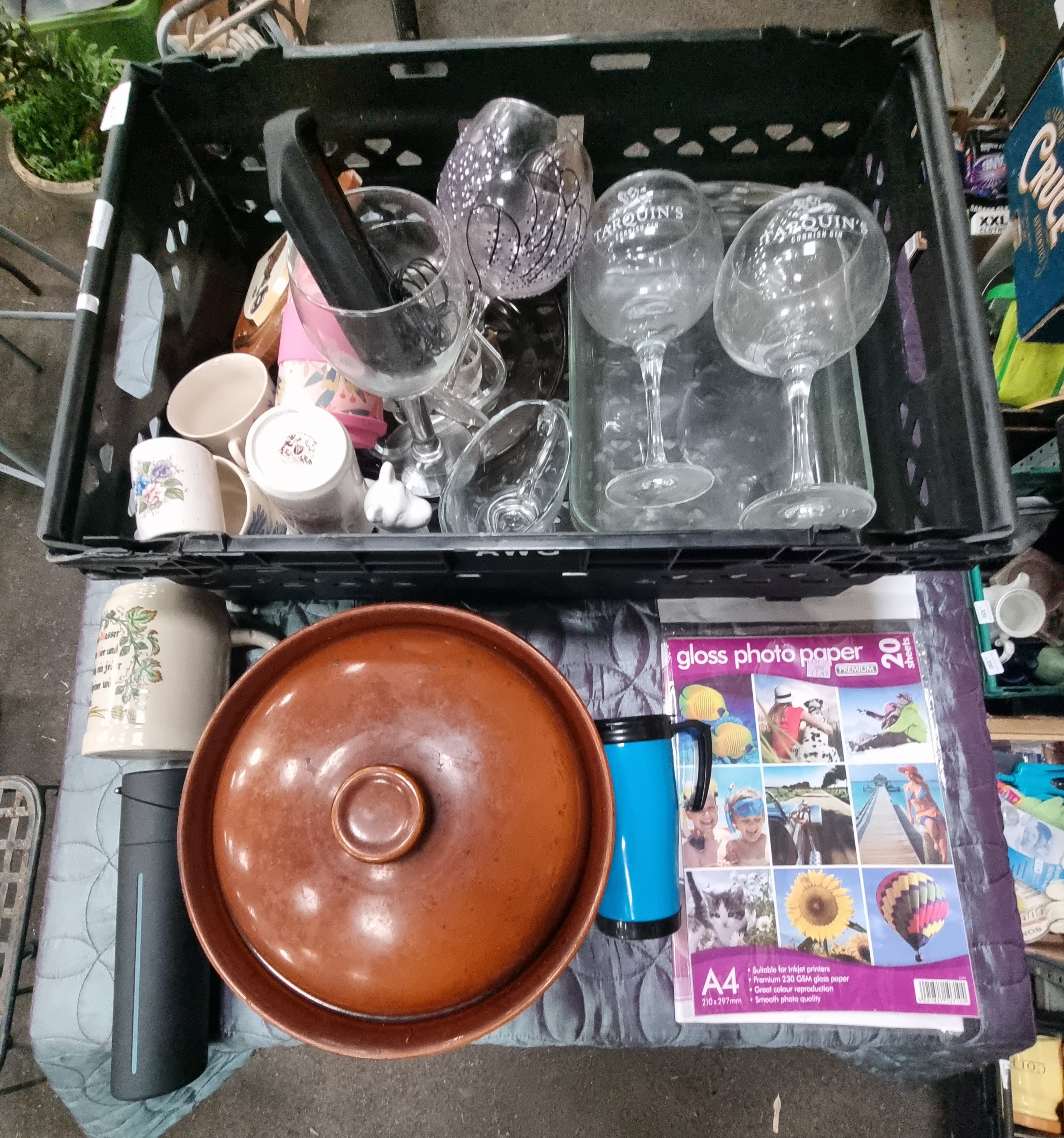 An assortment of household and kitchen items, primarily comprising glassware and ceramics. The glassware includes clear balloon-style glasses etched with Tarquin’s Cornish Gin branding and a clear glass rectangular oven dish. Additional glassware consists of various stemware, including one glass featuring hand-painted purple dotted decoration. Ceramic pieces include a large brown glazed stoneware lidded casserole dish with a ribbed exterior and a group of various mugs. One mug bears the brown printed mark of Hornsea England featuring a crest on the underside. Another ceramic mug is decorated with a German drinking rhyme and hop motifs. The collection also includes several travel mugs in pink and blue, a small white ceramic animal figurine, a black cylindrical object, and a pack of twenty sheets of A4 gloss photo paper.