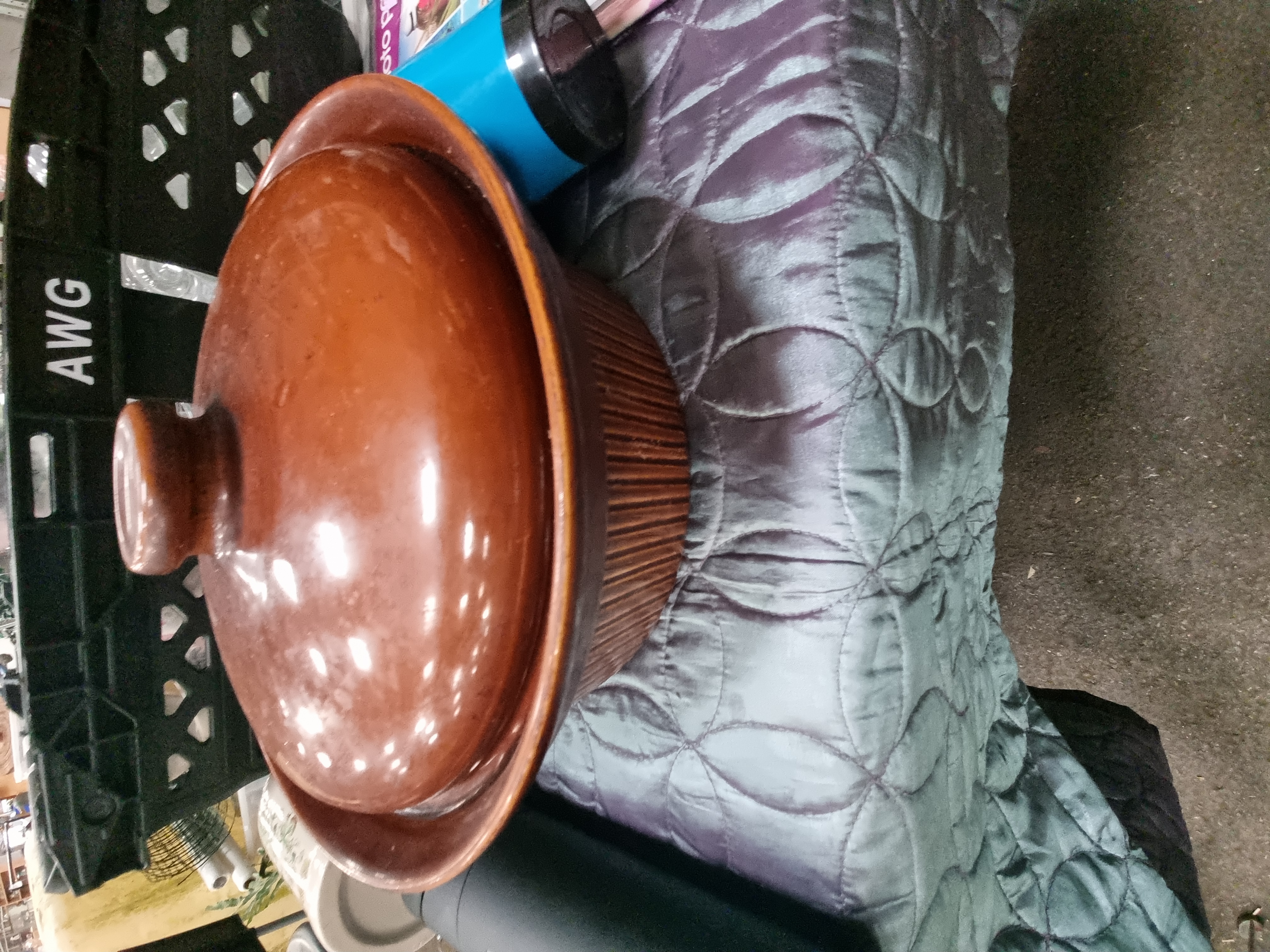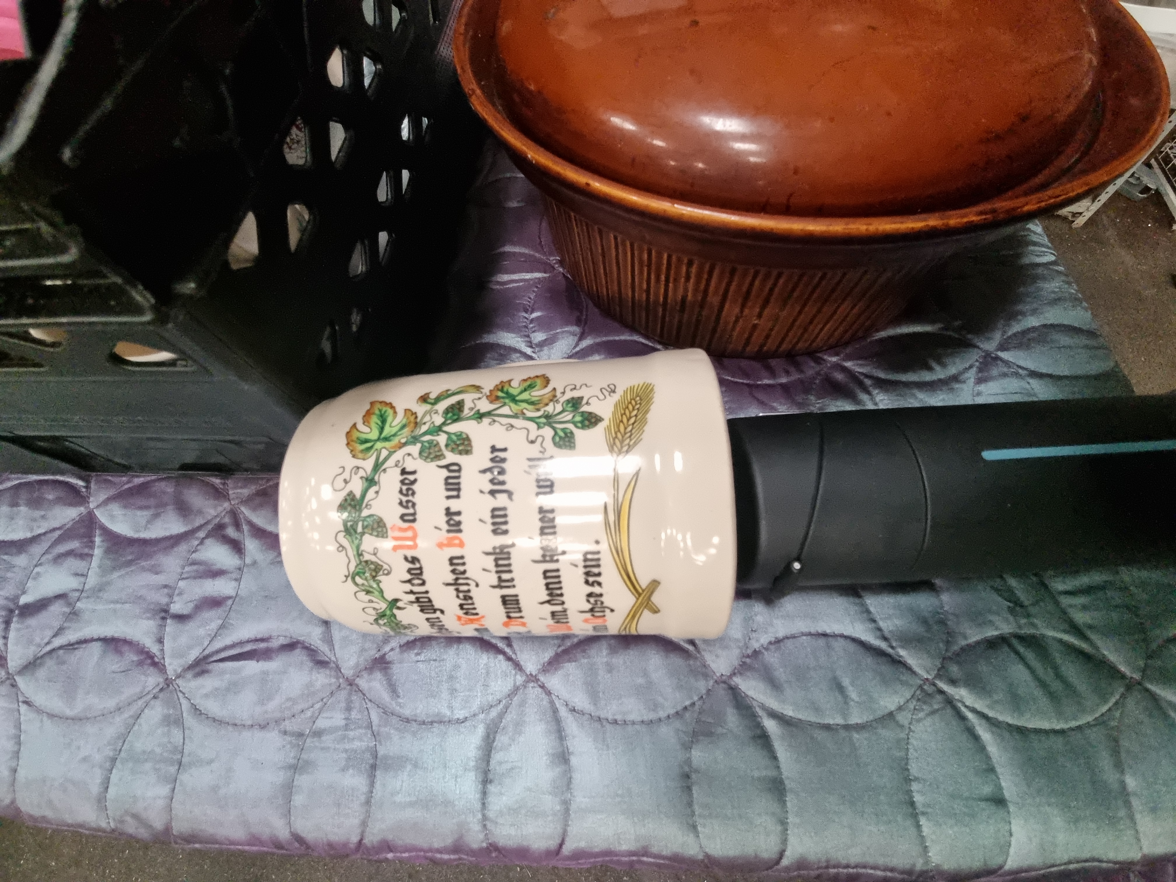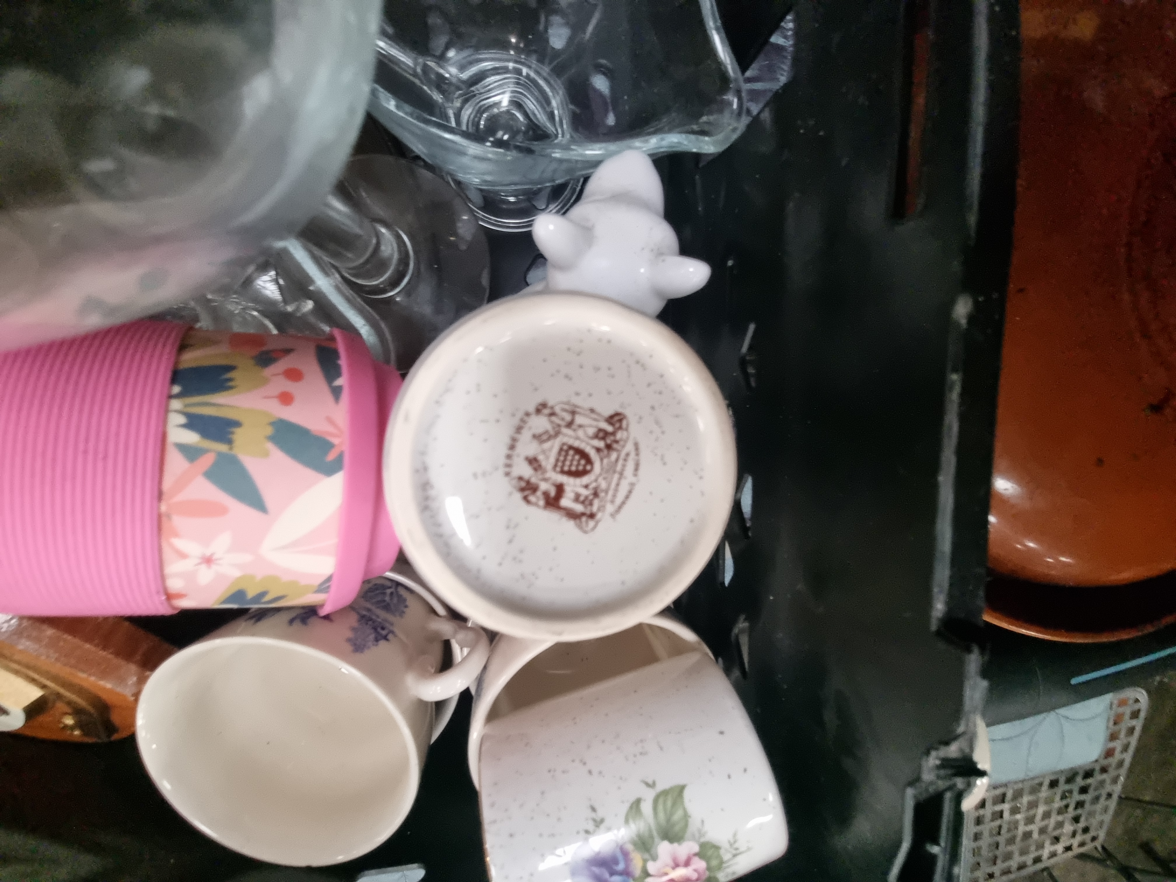 An assortment of household and kitchen items, primarily comprising glassware and ceramics. The glassware includes clear balloon-style glasses etched with Tarquin’s Cornish Gin branding and a clear glass rectangular oven dish. Additional glassware consists of various stemware, including one glass featuring hand-painted purple dotted decoration. Ceramic pieces include a large brown glazed stoneware lidded casserole dish with a ribbed exterior and a group of various mugs. One mug bears the brown printed mark of Hornsea England featuring a crest on the underside. Another ceramic mug is decorated with a German drinking rhyme and hop motifs. The collection also includes several travel mugs in pink and blue, a small white ceramic animal figurine, a black cylindrical object, and a pack of twenty sheets of A4 gloss photo paper.