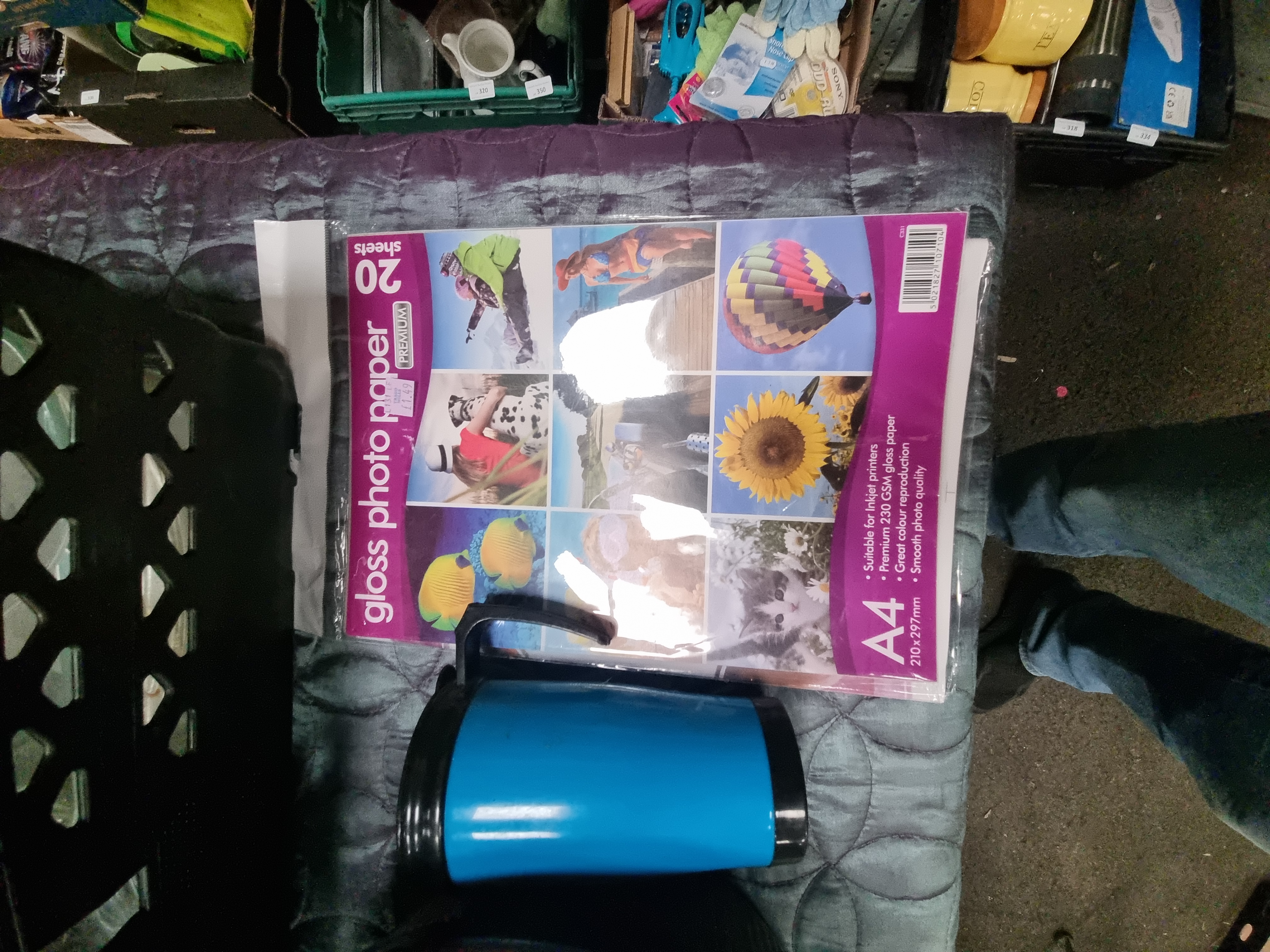 The items are in used condition, showing signs of wear consistent with age and domestic use. No significant chips or cracks are immediately apparent to the Hornsea stoneware or the branded glassware. The photo paper remains in its original packaging.