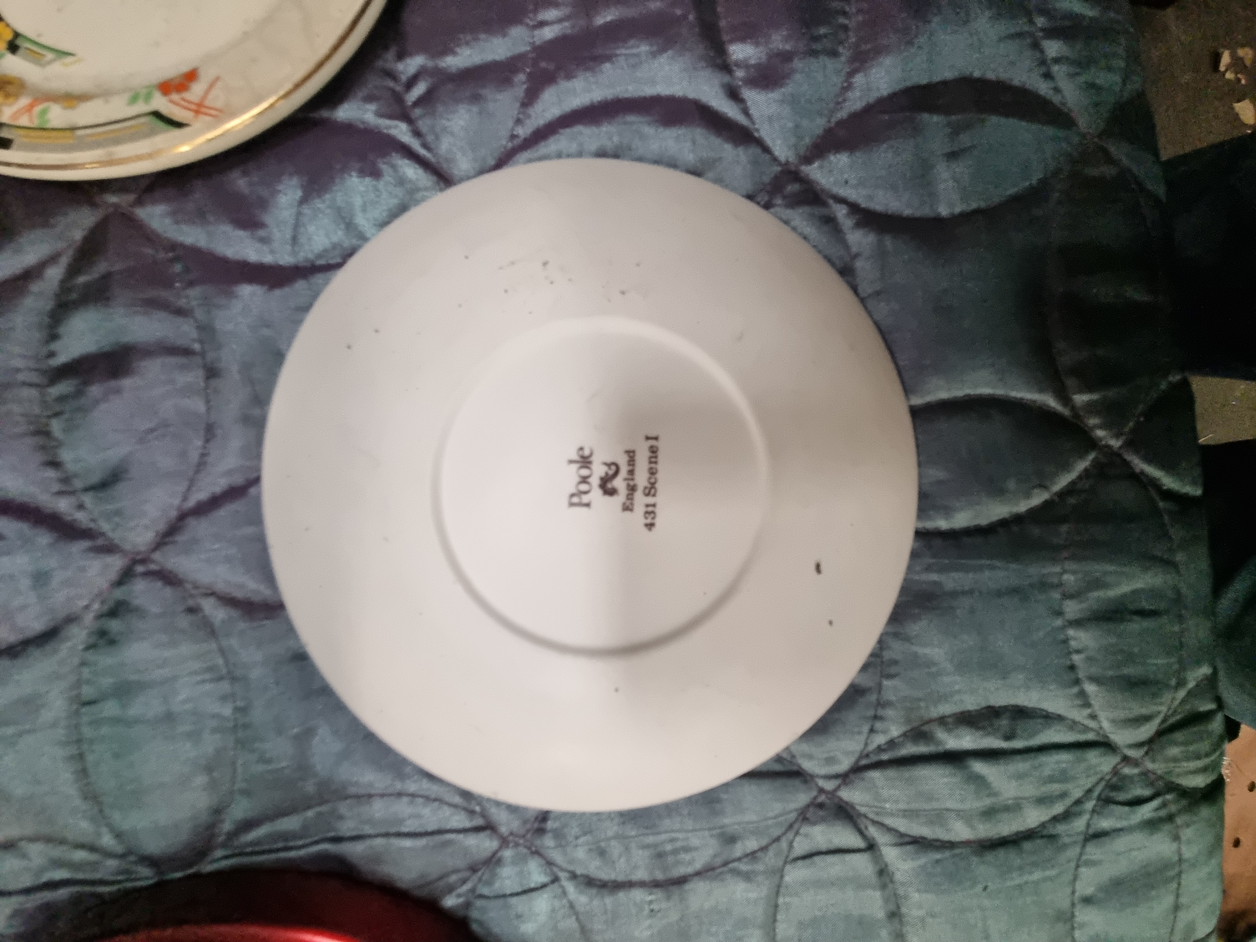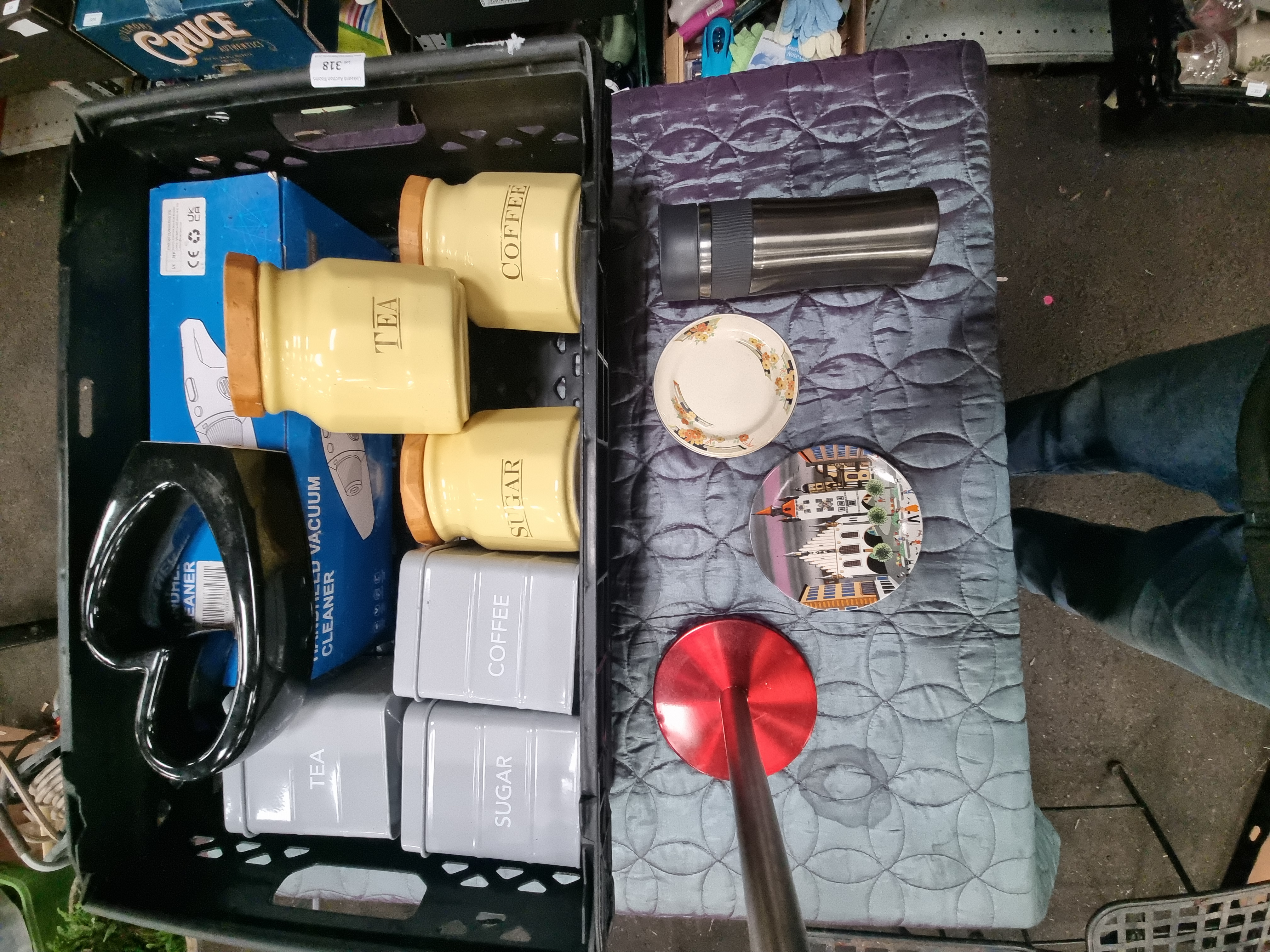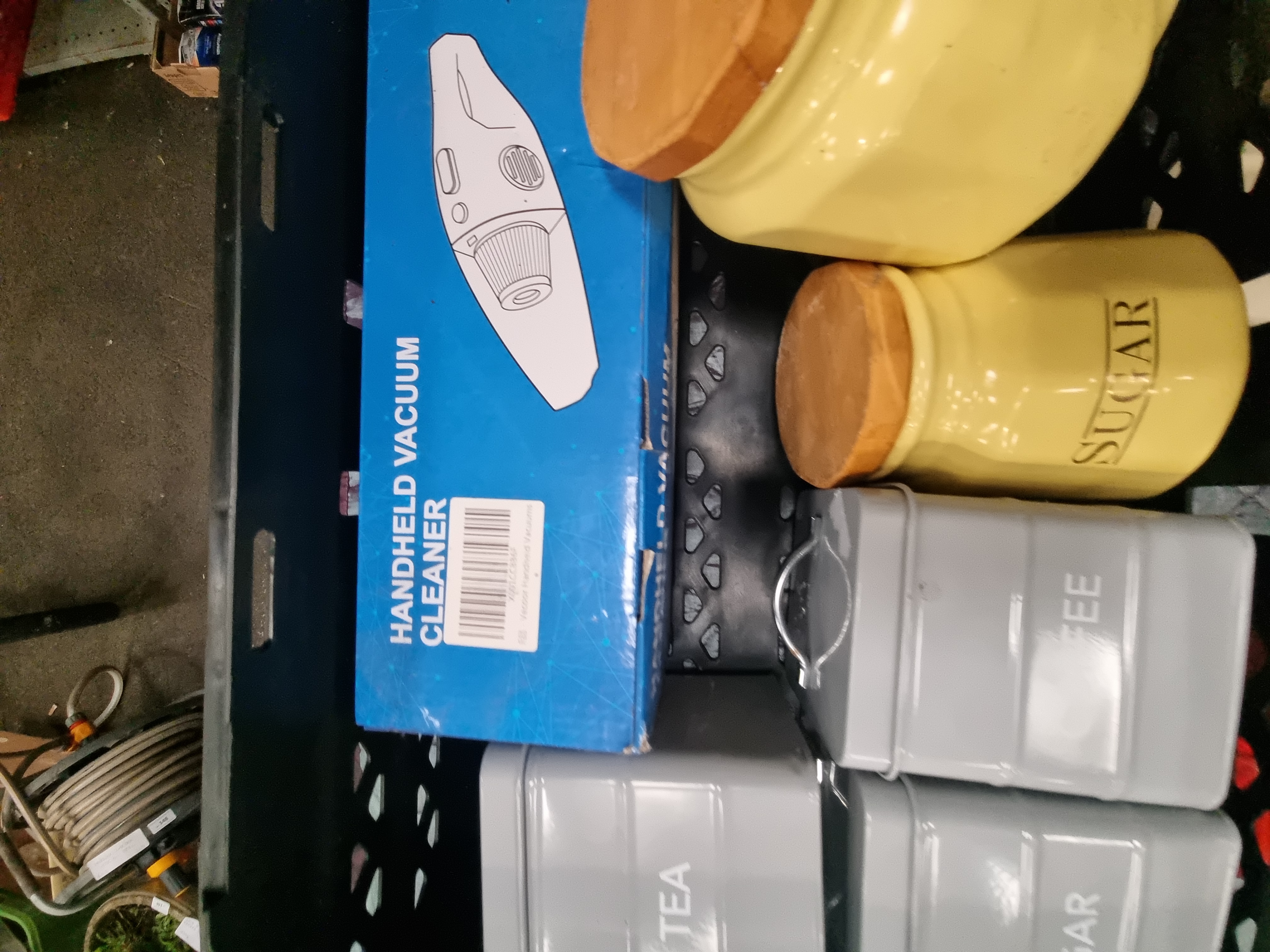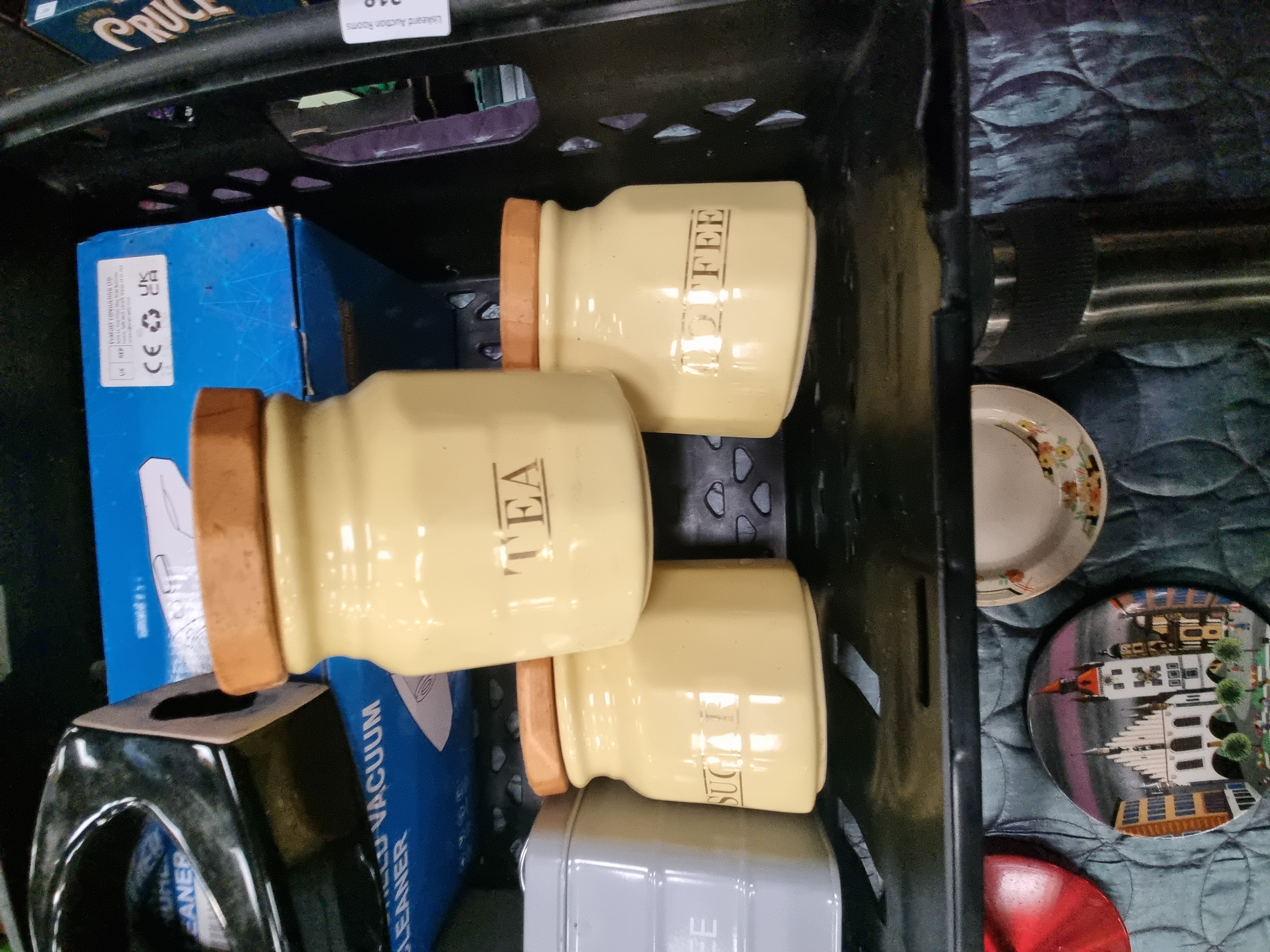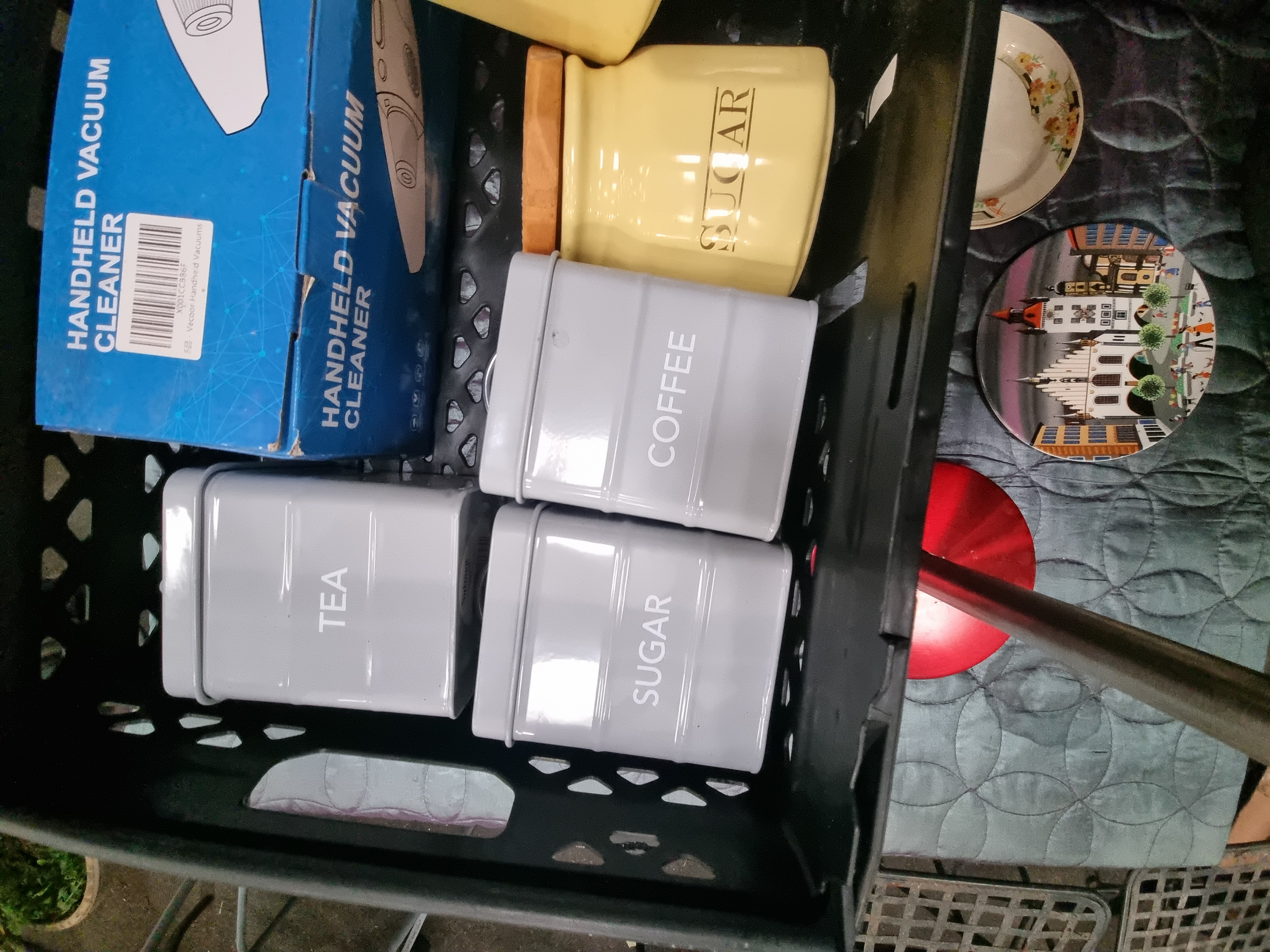 A group of various kitchen and decorative items comprising several ceramic and metal storage canisters, small appliances, and plates. Included are three yellow faceted ceramic canisters with wooden lids, labelled TEA, COFFEE, and SUGAR, alongside a set of three grey rectangular metal tins with similar labels. A handheld vacuum cleaner is present in its original commercial packaging, alongside a black heart-shaped ceramic vessel and a stainless steel thermal travel mug. Decorative ceramics include a small floral plate with a gilt rim and a colourful illustrated plate depicting a townscape. The underside of the townscape plate bears the printed mark Poole England 431 Scene I, while the floral plate bears the mark for the Victorian range by Johnson Bros. England. Also present is a circular red metal stand base.