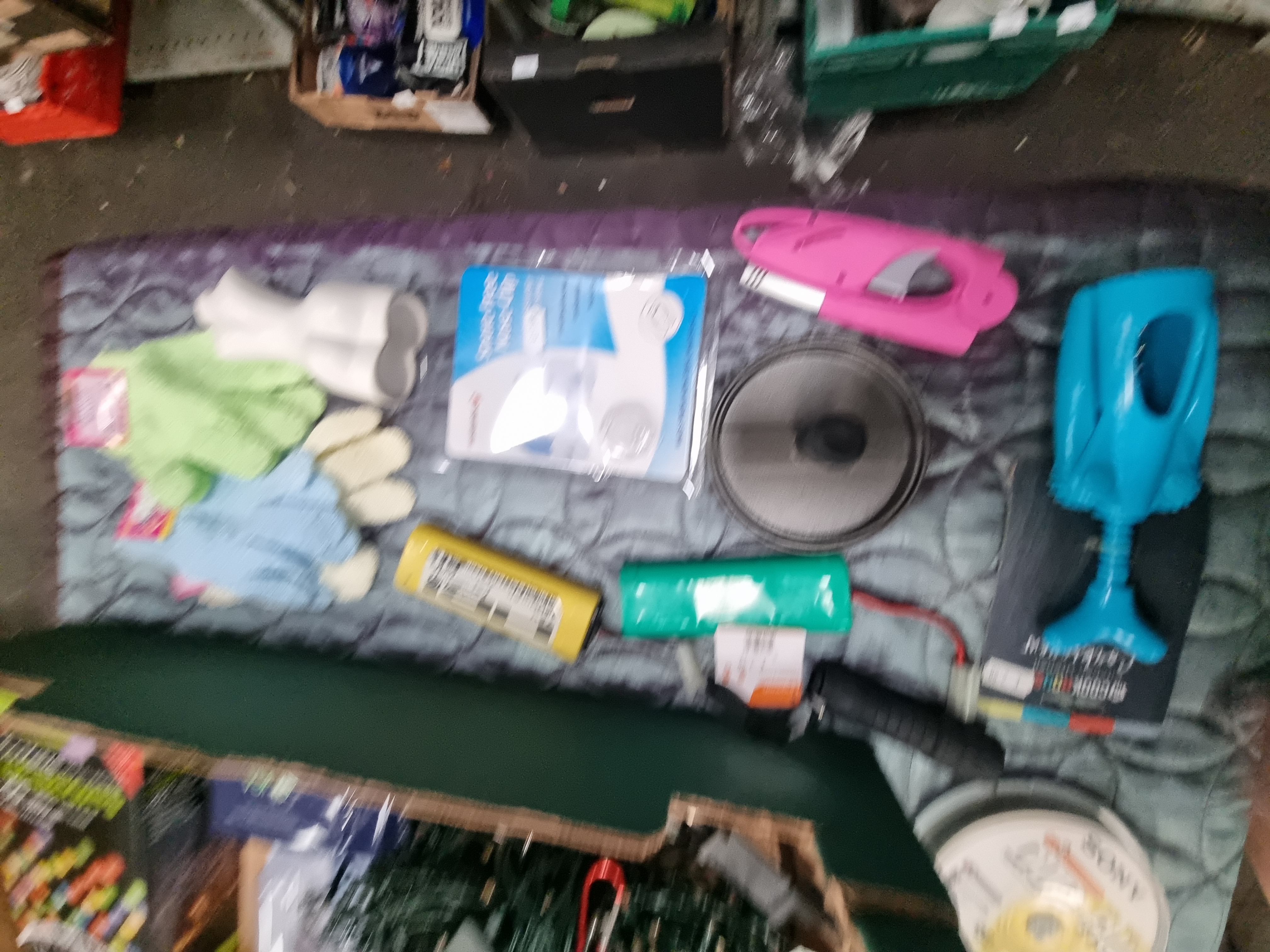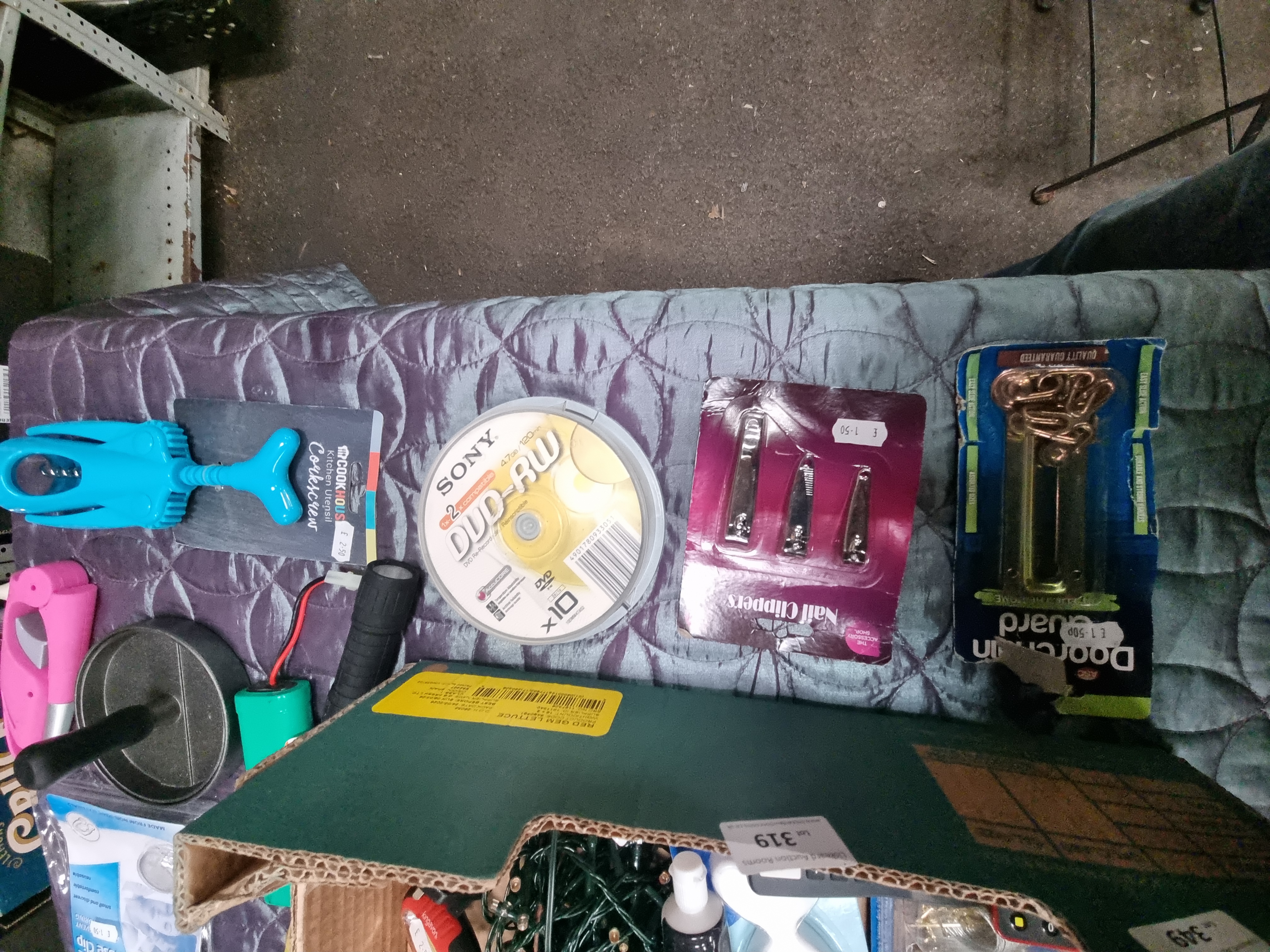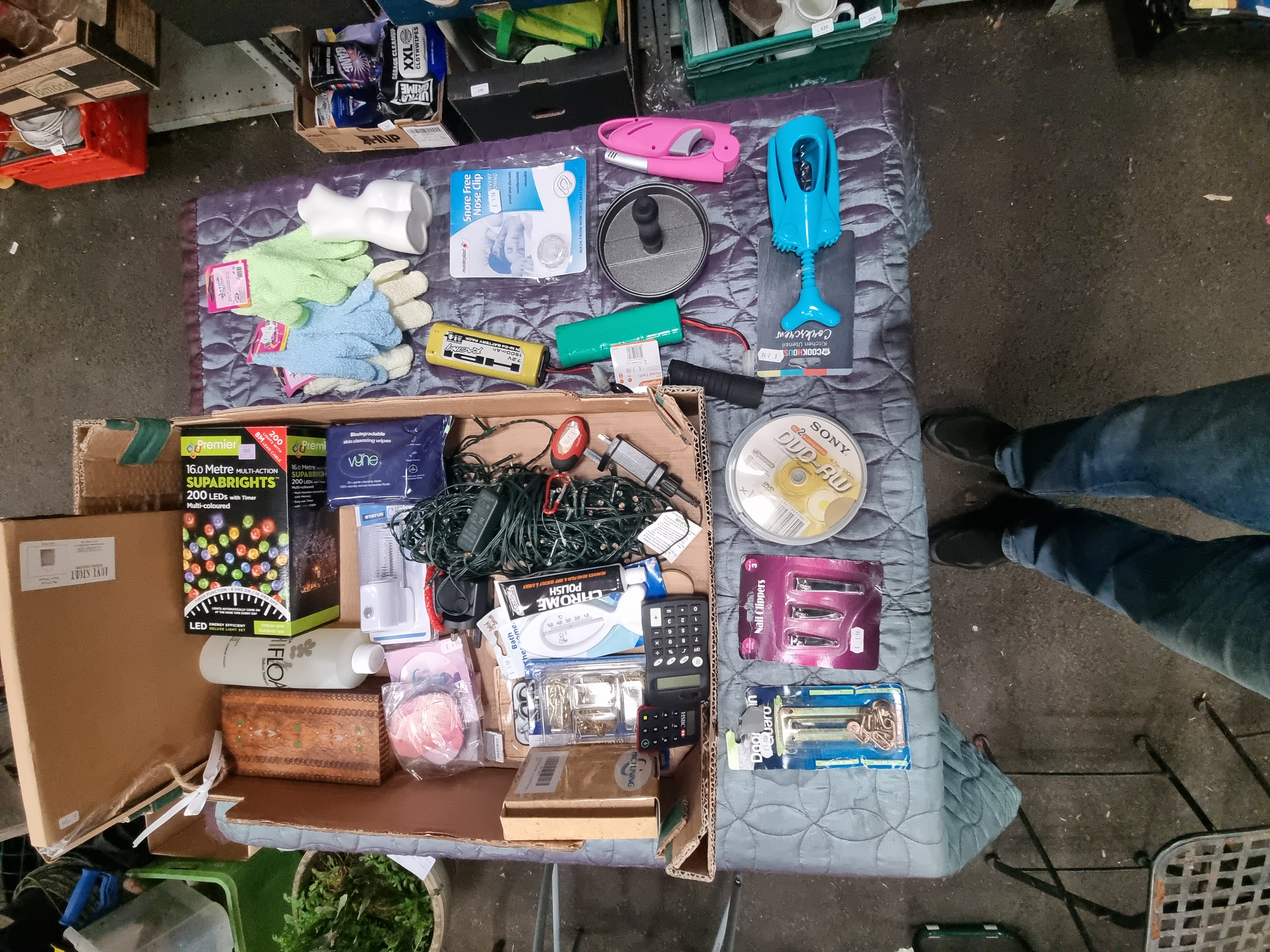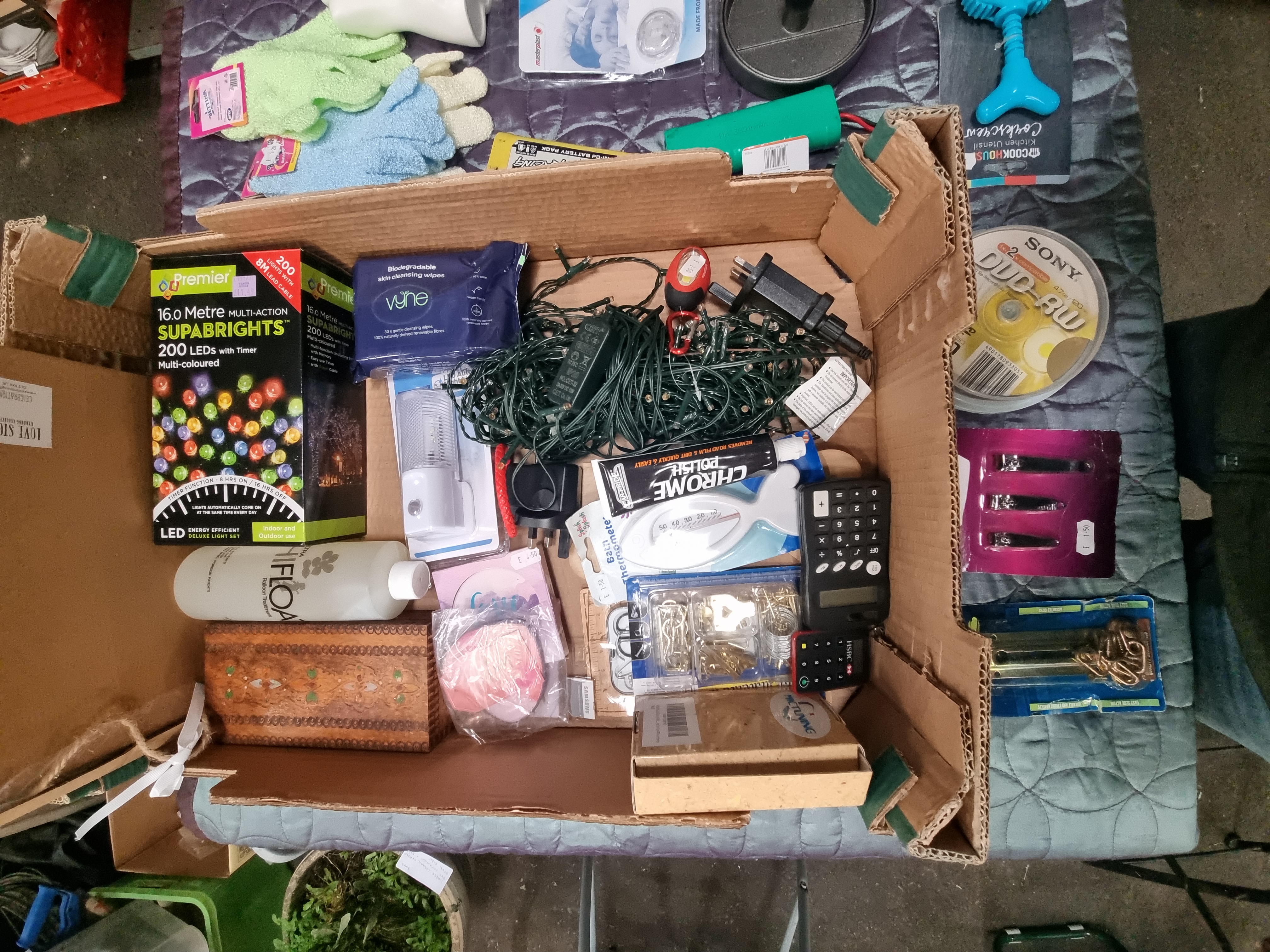 A diverse collection of domestic sundries, hardware, and small electronic items. The lot includes lighting equipment such as a boxed set of Premier Supabrights 200 multi-action LED multi-coloured lights (16.0m) and additional loose decorative light strings. Media and electronics comprise a 10-pack spindle of Sony DVD-RW discs, two rechargeable battery packs in yellow and green, an HSBC secure key device, and a small black handheld torch. Hardware and tools include a Door Guardian brass-finish door chain in original retail packaging, a pack of assorted brass hooks and screws, a tube of chrome polish, and a blue MyCookhouse wing corkscrew. Personal care and domestic products feature a pack of three nail clippers, a Masterplast snore-free nose clip, Vyne biodegradable skin cleansing wipes, Bettina cleaning gloves, a fish-shaped thermometer, and a bottle of Hi-Float balloon treatment. Also included is a small wooden box with inlaid floral patterns and various other small household items.