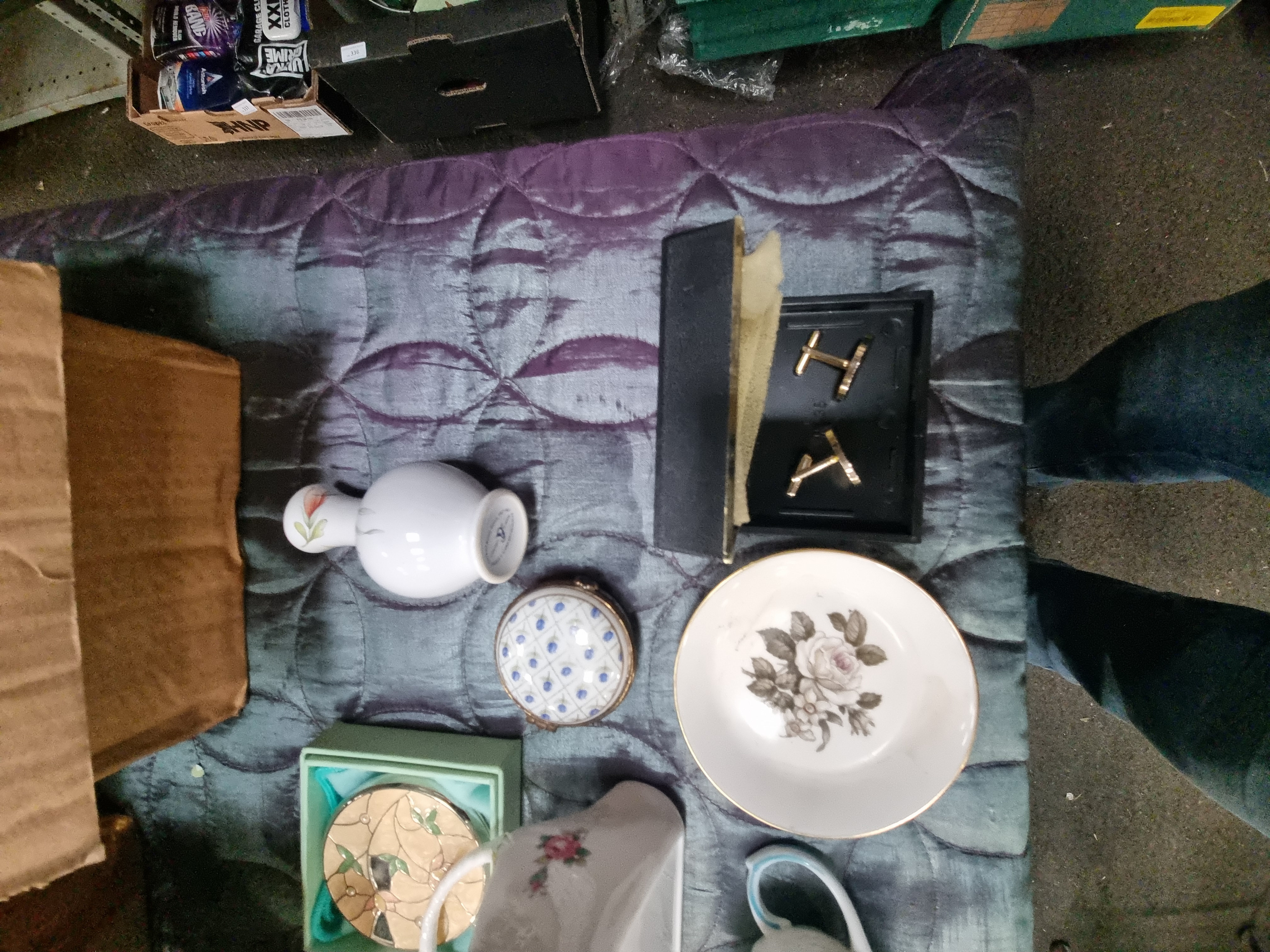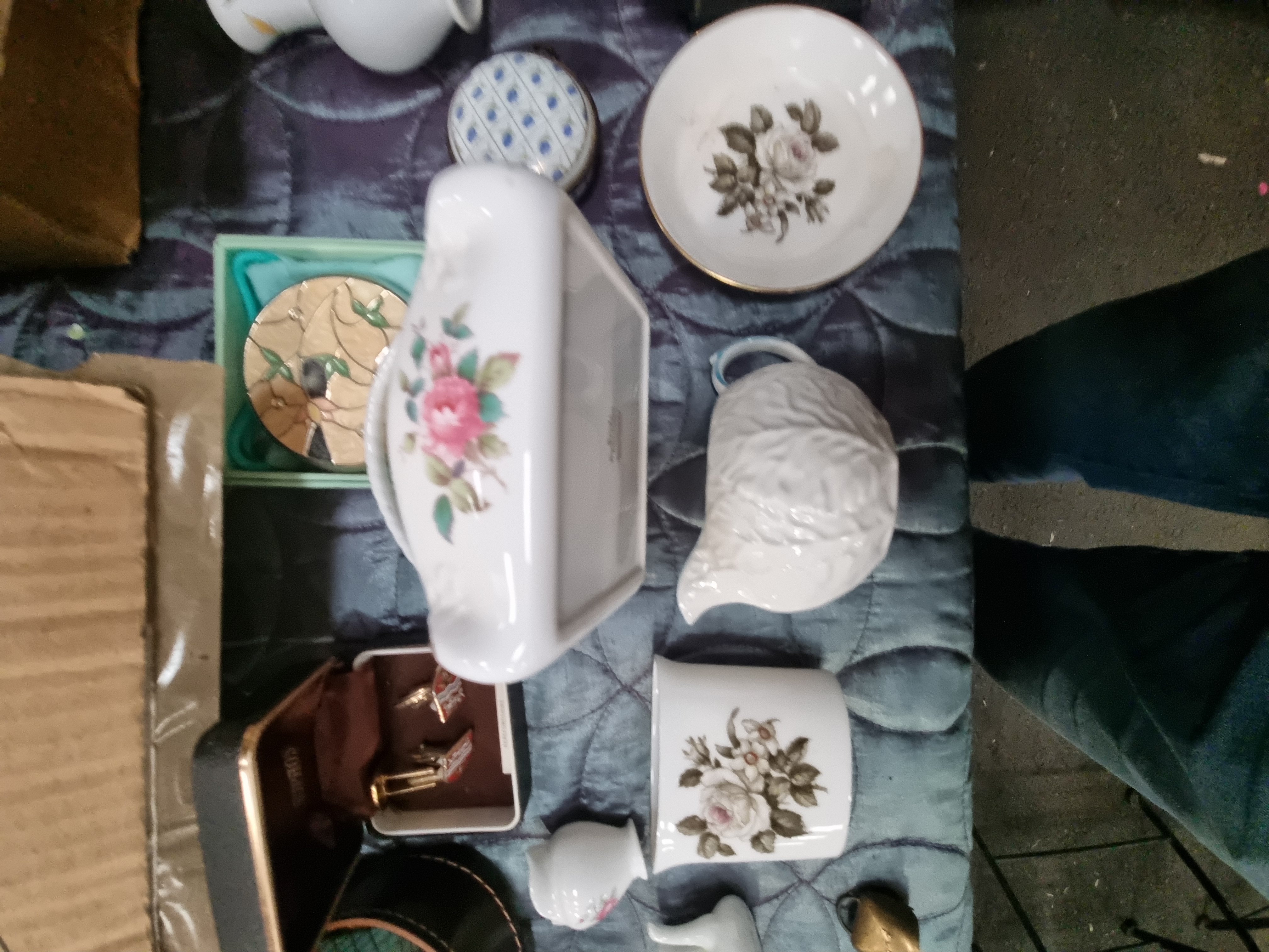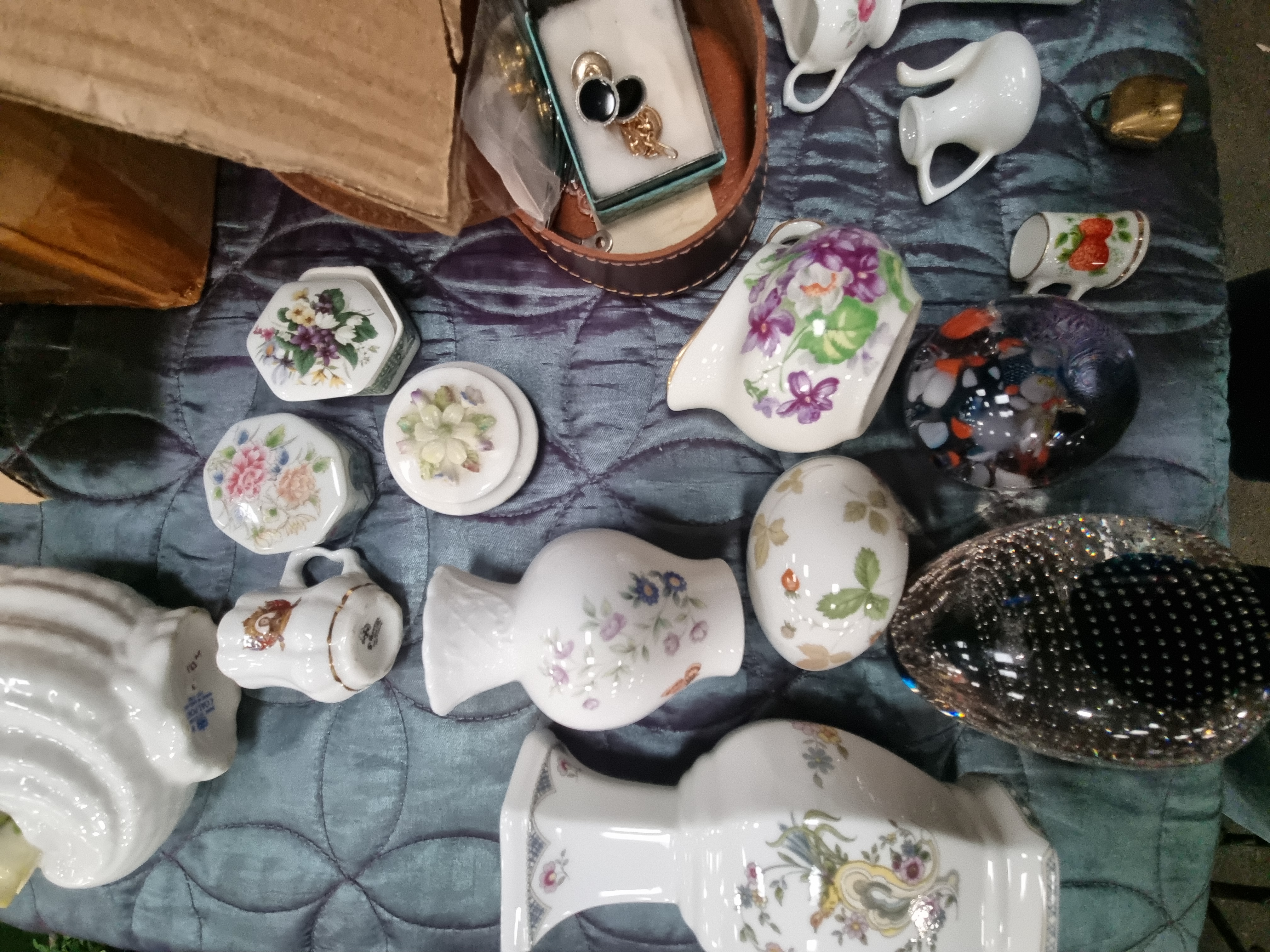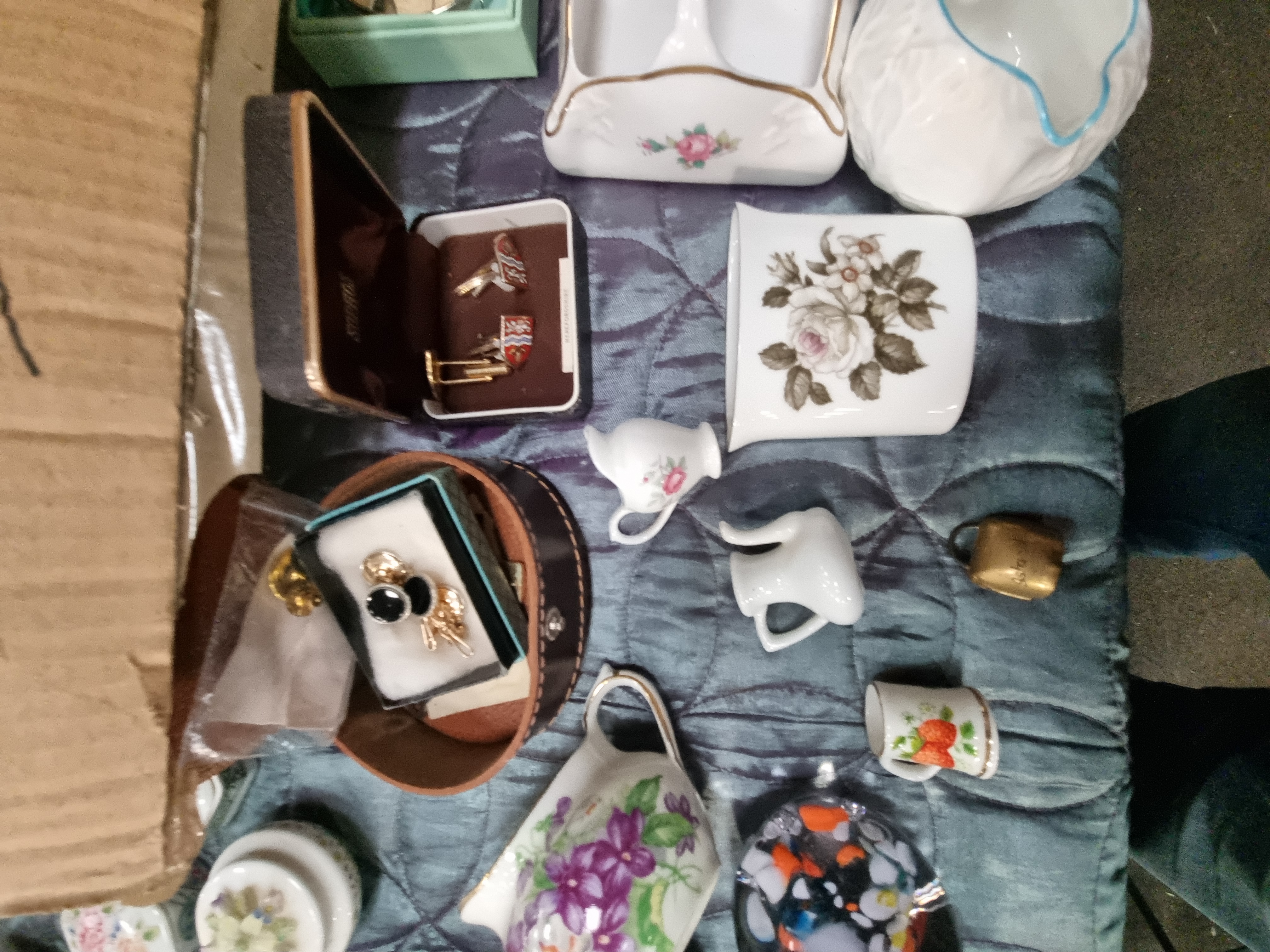 A collection of miscellaneous decorative ceramics, bone china, and glass ornaments. The group includes a Coalport white shell-shaped vase with applied ceramic roses, bearing a blue factory mark to the base. Glassware features a teardrop-shaped paperweight with a blue core and controlled bubbles, and a second paperweight with a multi-coloured flecked design. Ceramic items comprise various miniature tea wares, lidded trinket boxes including an egg-shaped example in a strawberry pattern, and pieces marked H & M Made in England. The collection features various hand-painted and transfer-printed floral motifs. Additional items include a pair of Stratton cufflinks in a fitted case, further pairs of cufflinks, a gold-tone compact in a green box, a white ceramic swan, and various small figurines and cottage-style ornaments.