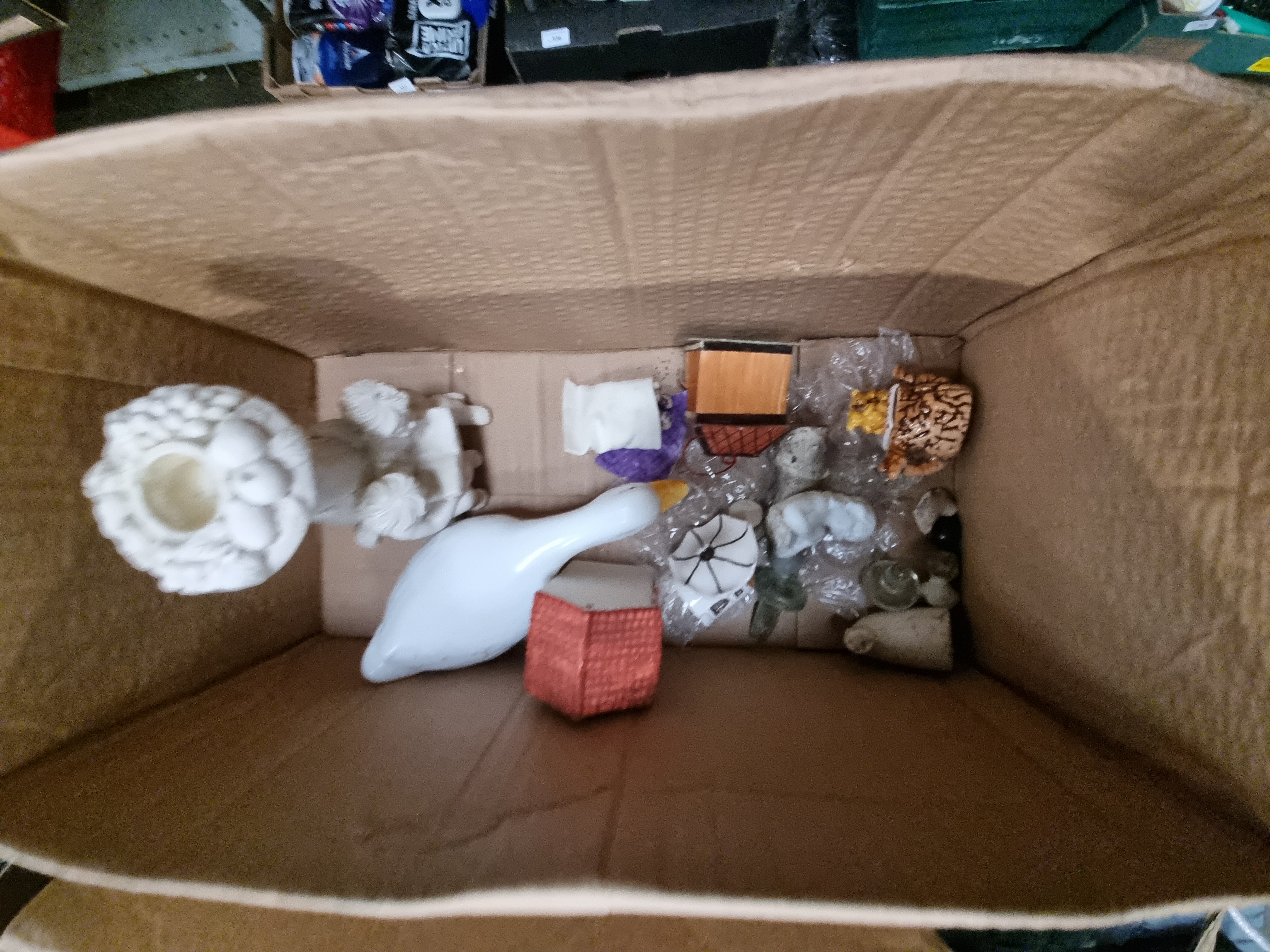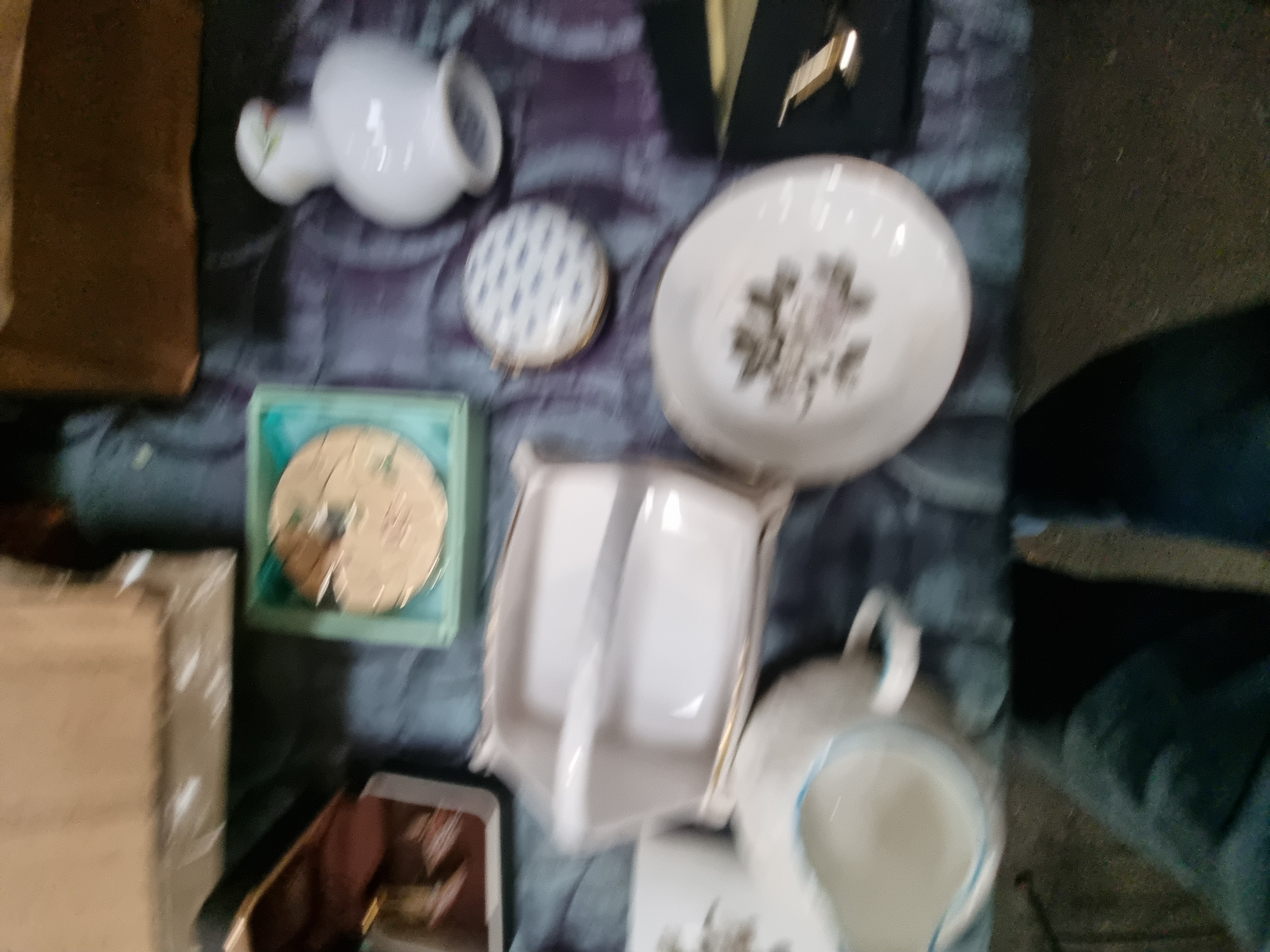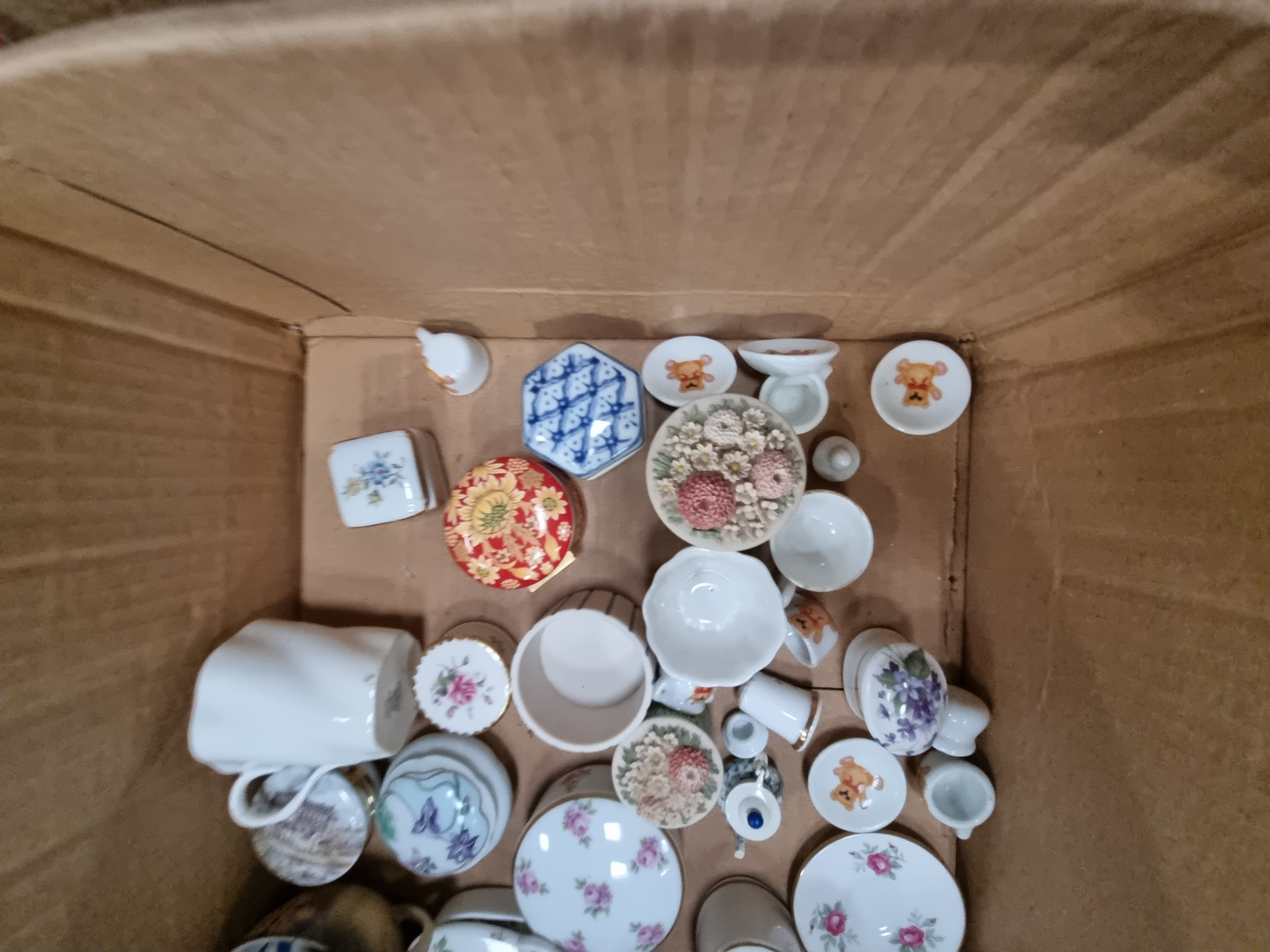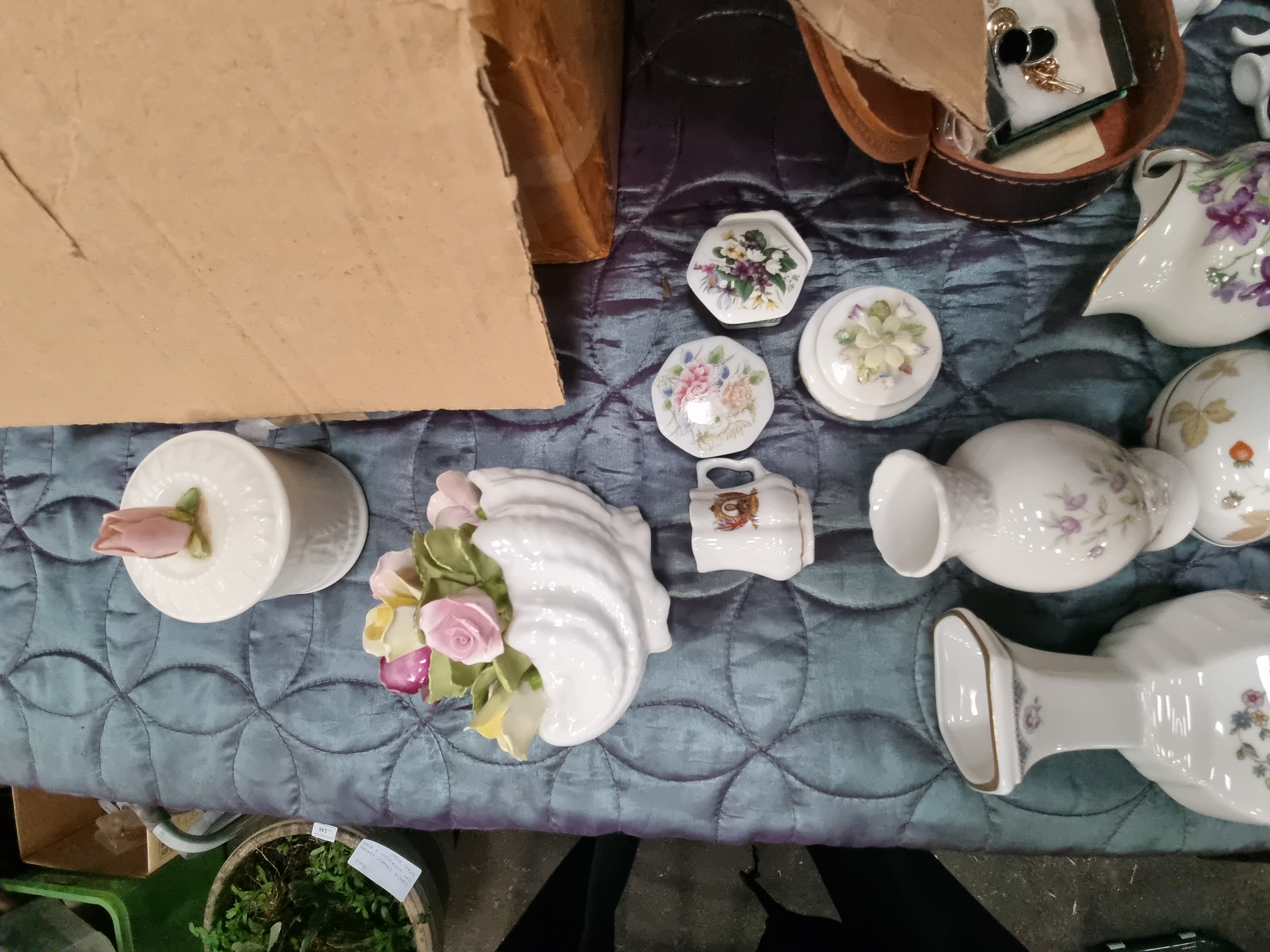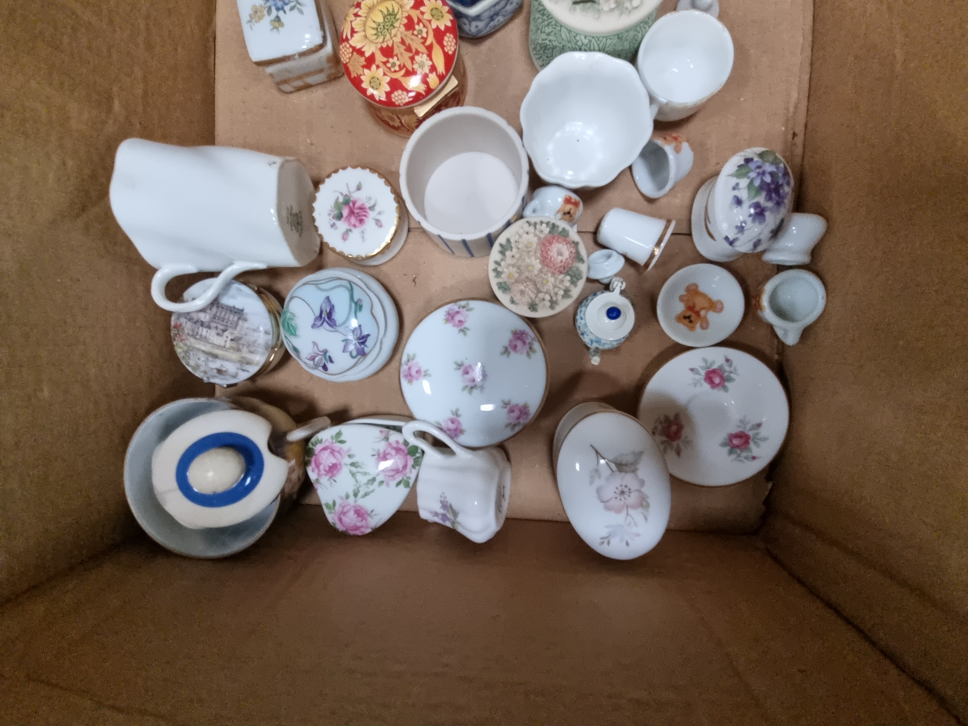 A collection of miscellaneous decorative ceramics, bone china, and glass ornaments. The group includes a Coalport white shell-shaped vase with applied ceramic roses, bearing a blue factory mark to the base. Glassware features a teardrop-shaped paperweight with a blue core and controlled bubbles, and a second paperweight with a multi-coloured flecked design. Ceramic items comprise various miniature tea wares, lidded trinket boxes including an egg-shaped example in a strawberry pattern, and pieces marked H & M Made in England. The collection features various hand-painted and transfer-printed floral motifs. Additional items include a pair of Stratton cufflinks in a fitted case, further pairs of cufflinks, a gold-tone compact in a green box, a white ceramic swan, and various small figurines and cottage-style ornaments.