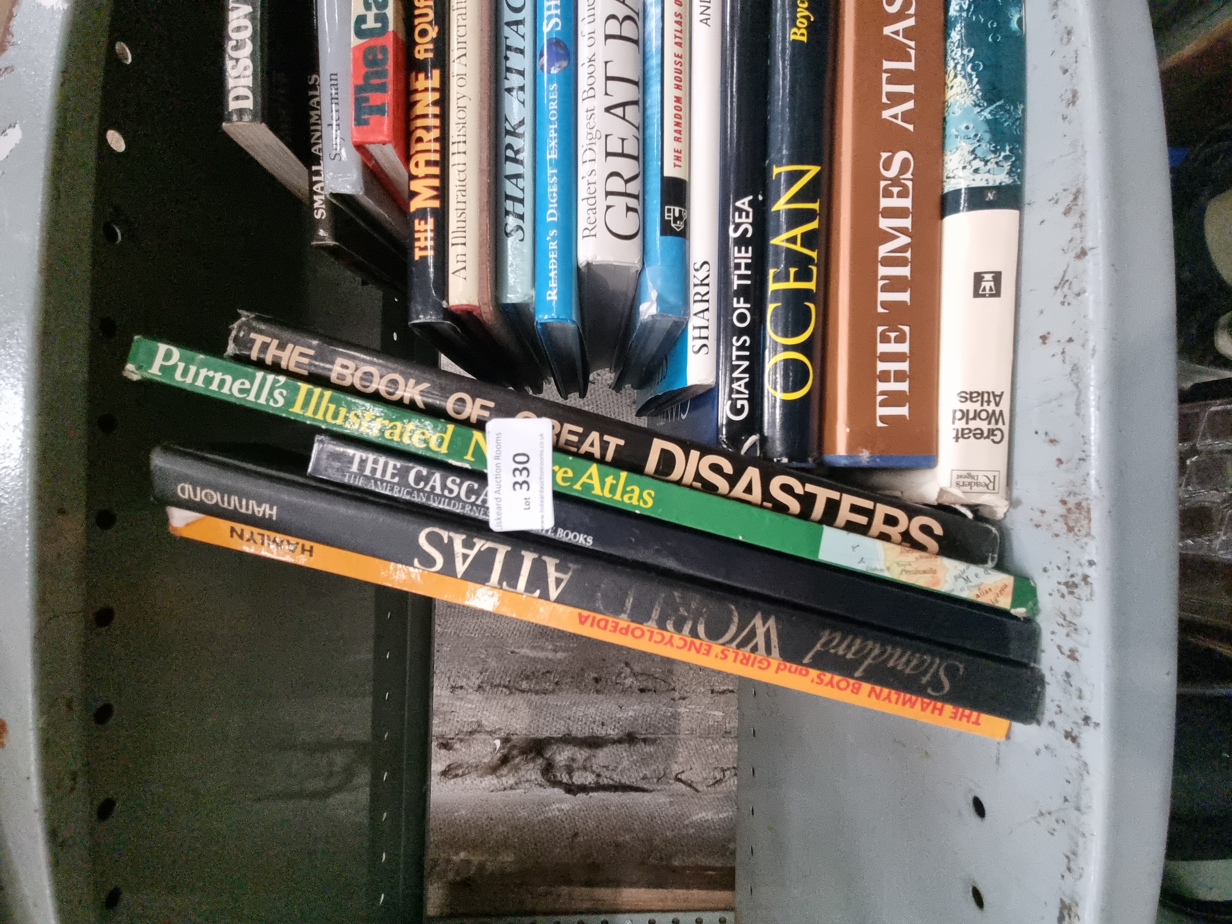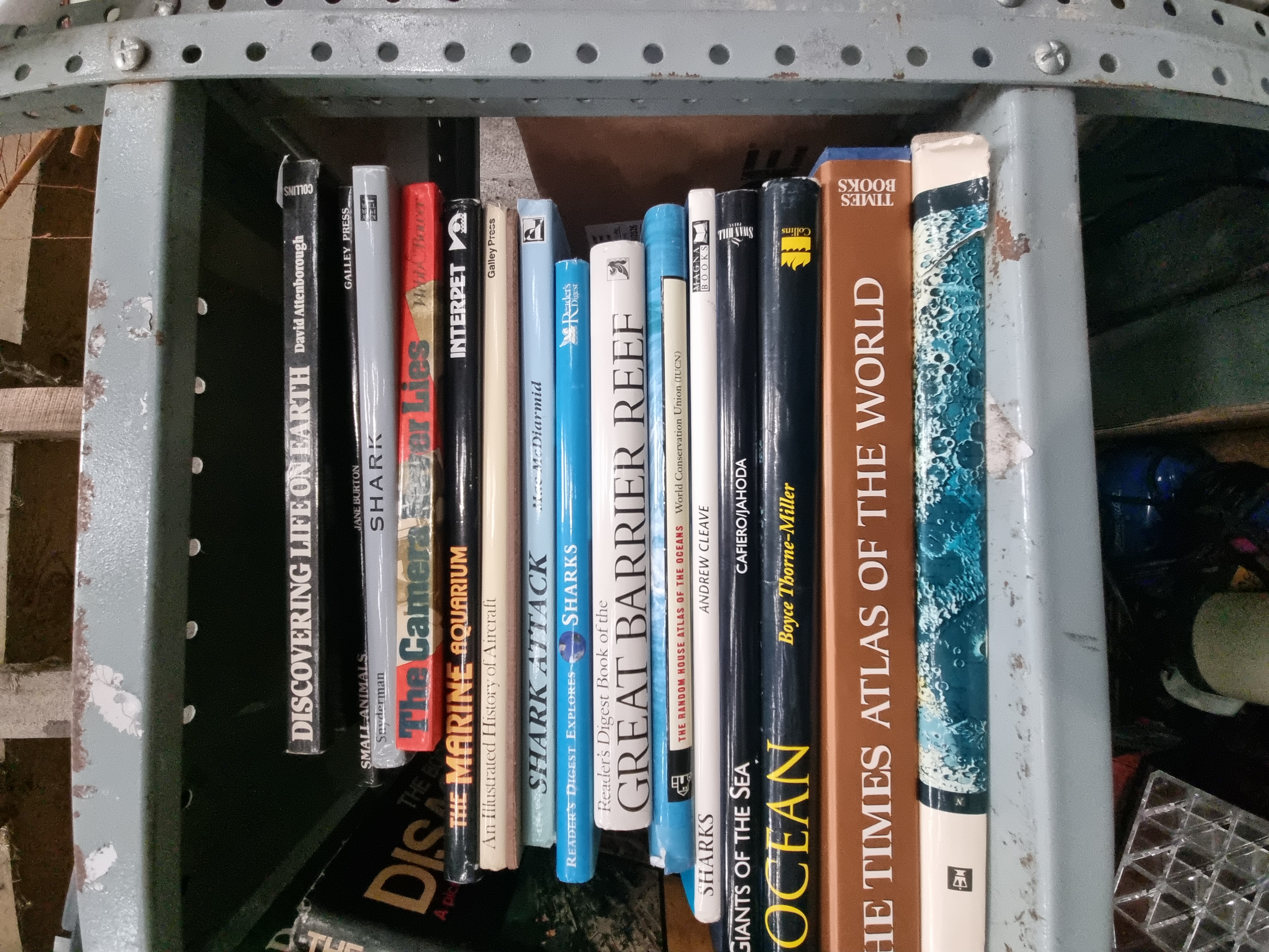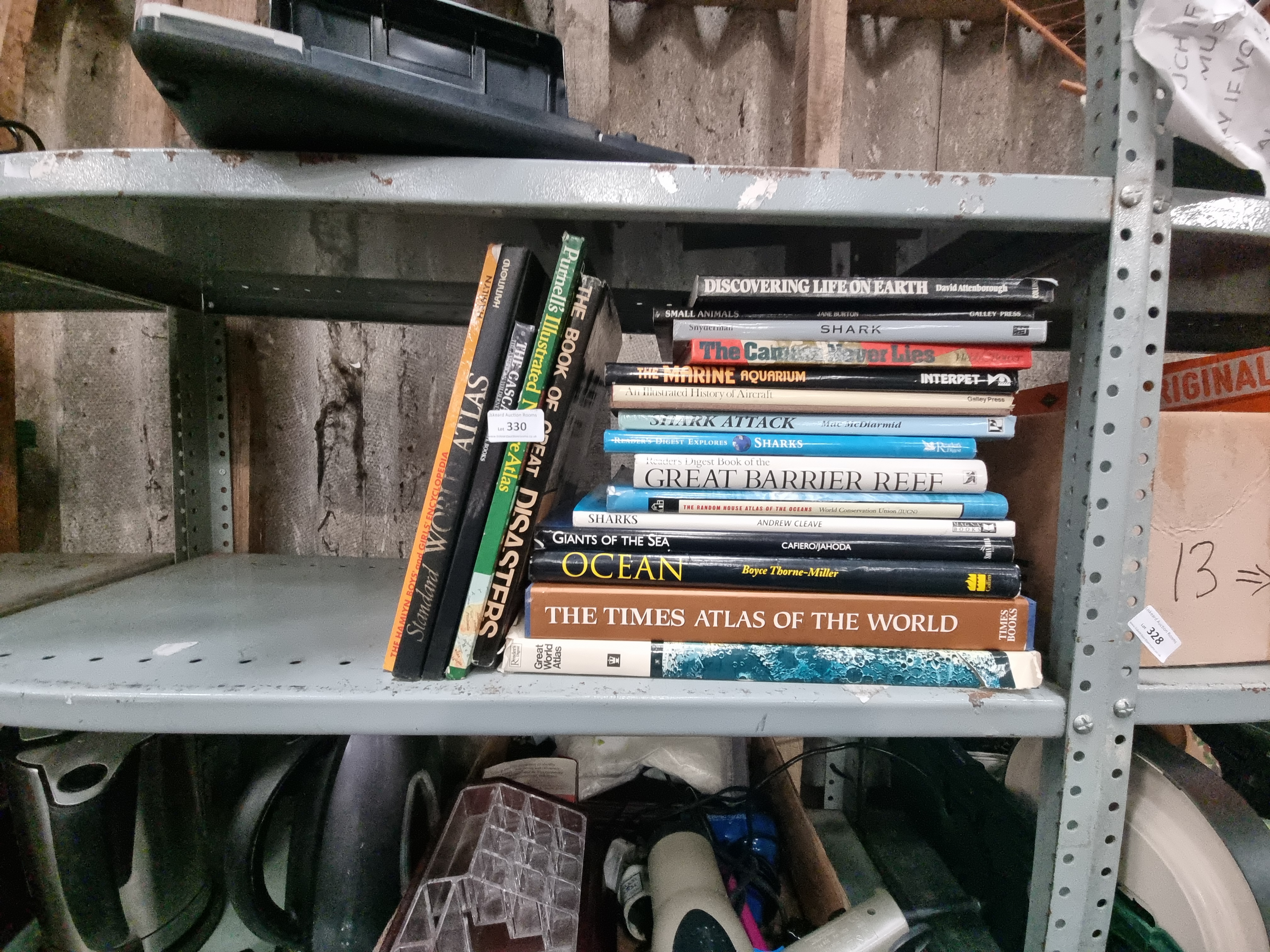 This lot consists of 21 non-fiction volumes primarily focused on the subjects of natural history, marine biology, and cartography. The collection is comprised of various hardcover editions, many of which retain their original dust jackets. Key titles include Discovering Life on Earth by David Attenborough (Collins), The Times Atlas of the World (Times Books), Ocean by Boyce Thorne-Miller (Collins), Reader’s Digest Book of the Great Barrier Reef, and The Book of Great Disasters (Purnell). Further titles include Giants of the Sea by Cafiero/Jahoda (Swan Hill Press), The Random House Atlas of the Oceans (published in association with the World Conservation Union/IUCN), and several specialist works on sharks by authors including Andrew Cleave, Mac McDiarmid, and Marty Snyderman. The assortment also features Small Animals by Jane Burton (Galley Press), An Illustrated History of Aircraft (Galley Press), The Marine Aquarium (Interpet), The Camera Never Lies, Purnell’s Illustrated Nature Atlas, Great World Atlas (Reader’s Digest), The Cascades (Time-Life Books, The American Wilderness series), and the Standard World Atlas (Hamlyn/Hammond).