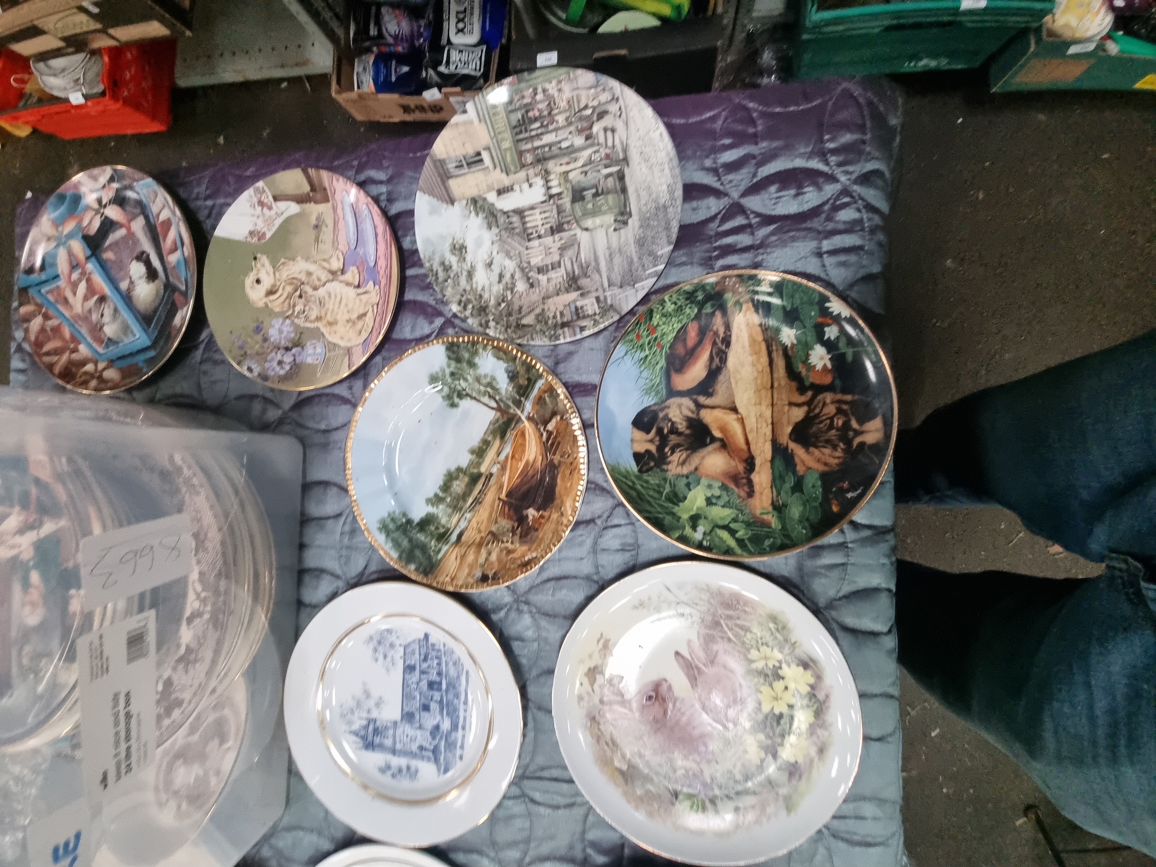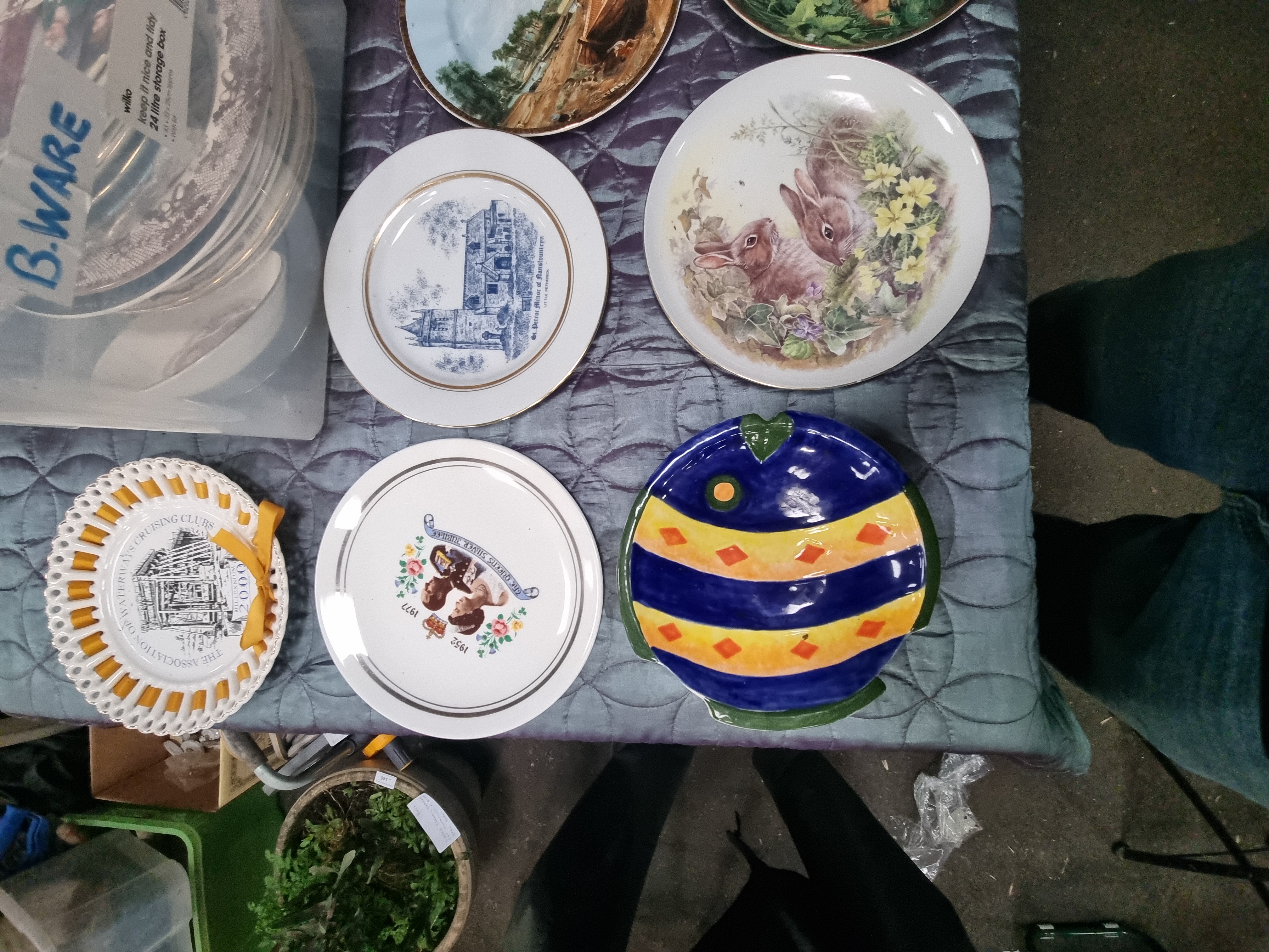 This collection comprises various porcelain, fine bone china, and earthenware display plates and dishes. The lot includes a 1977 Silver Jubilee commemorative plate featuring transfer-printed portraits of Queen Elizabeth II and the Duke of Edinburgh, inscribed 1952 THE QUEEN’S SILVER JUBILEE 1977. Also present is a millennium plate for THE ASSOCIATION OF WATERWAYS CRUISING CLUBS 2000, featuring a pierced border with an interwoven yellow ribbon. Decorative wildlife and scenic plates include transfer-printed depictions of rabbits, dogs, cats, a sepia-toned street scene, and a landscape with a boat. A small blue and white transferware plate is inscribed St Petrus Minor of Braunton. The collection further includes a brightly coloured earthenware dish shaped like a fish, decorated with blue and yellow stripes and orange diamond accents. A quantity of additional plates is included, featuring scenes such as a cottage interior with a figure at a spinning wheel. Decoration techniques include transfer-printing, gilding, and hand-painted or sponge-decorated elements.