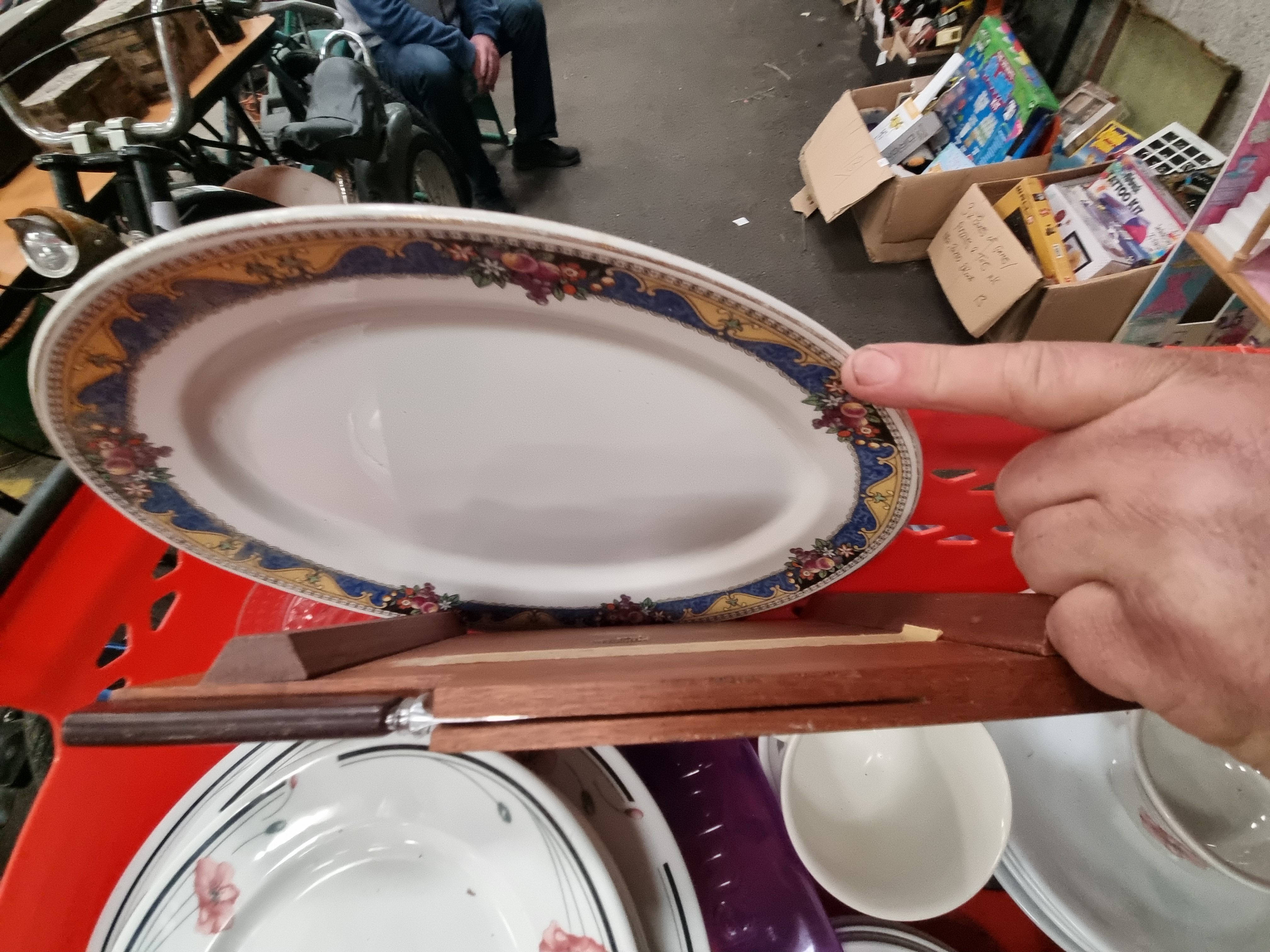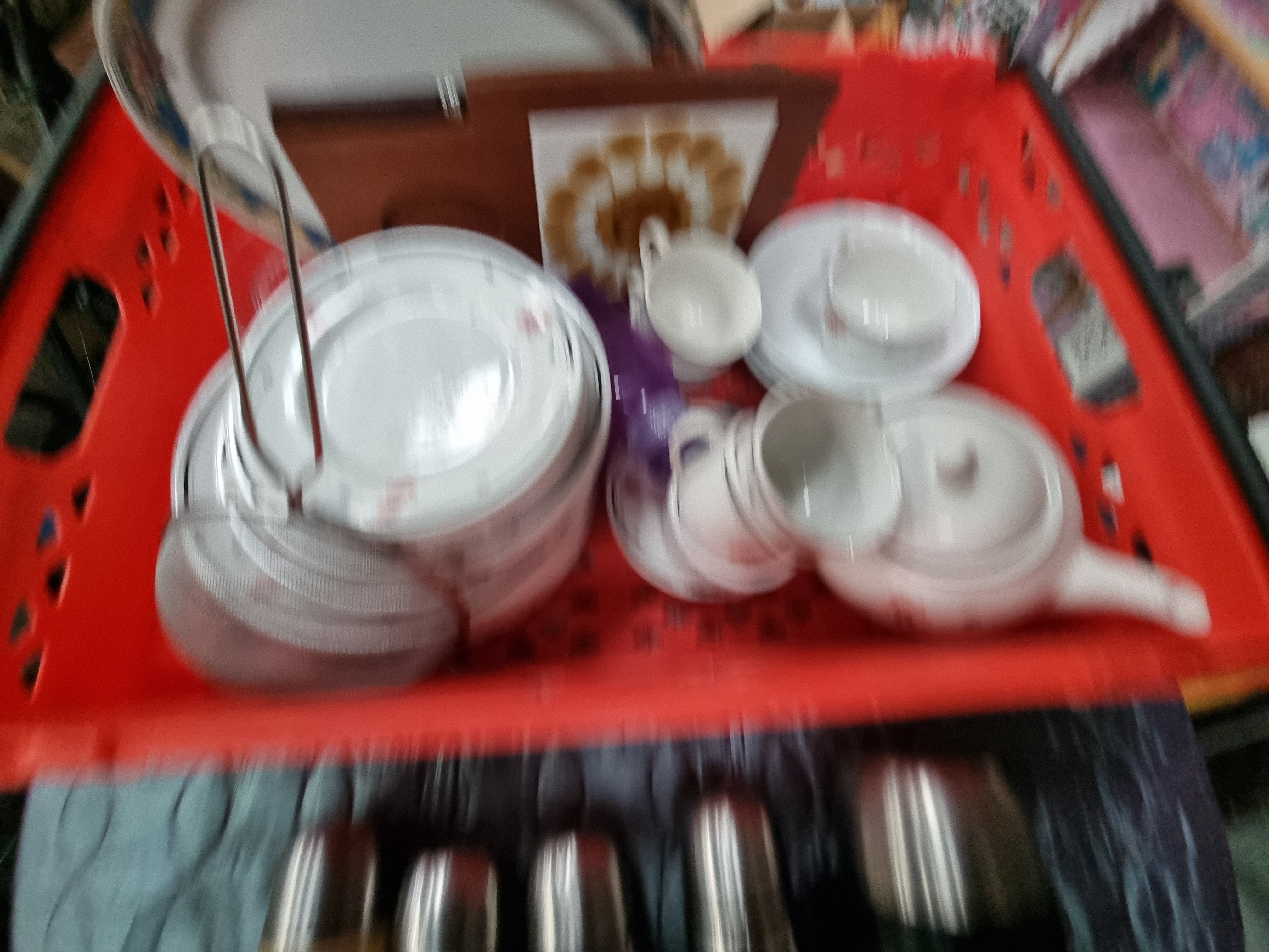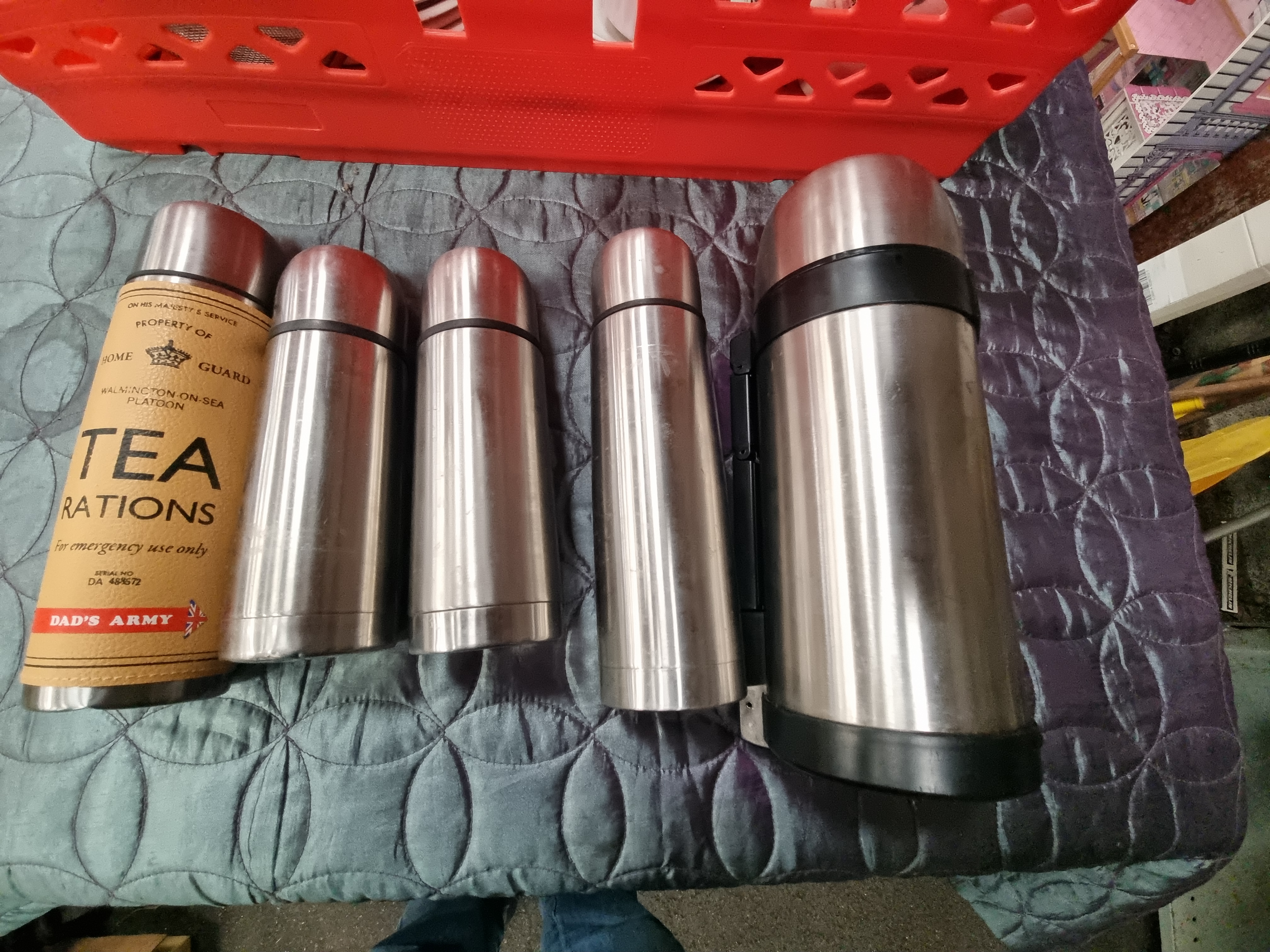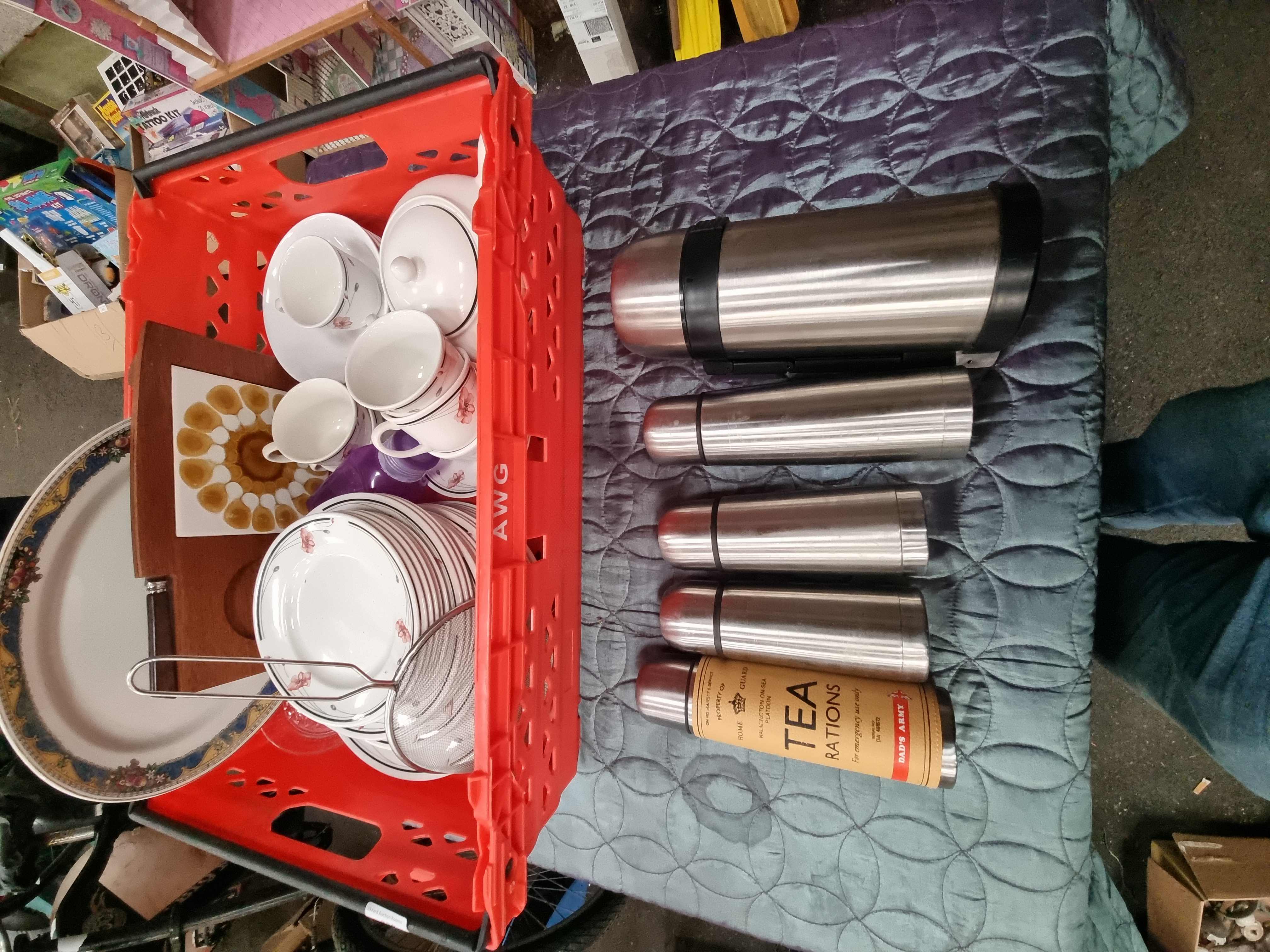 An assortment of kitchenware and domestic ceramics, including a group of stainless steel vacuum flasks of various sizes. One flask is fitted with a tan-coloured sleeve featuring printed text for the Walmington-on-Sea Platoon Home Guard, referencing the television series Dad’s Army. The collection includes a partial tea and coffee service in white ceramic with pink floral and linear decoration, comprising a lidded teapot, cups, saucers, and side plates. Also present is a large oval serving platter with a decorative border of fruit and floral motifs on blue and gold-toned bands. Additional items include a wooden breadboard with an integrated knife slot and accompanying knife, a circular metal mesh sieve, and a purple plastic tray. The items are housed in a red plastic transport crate.