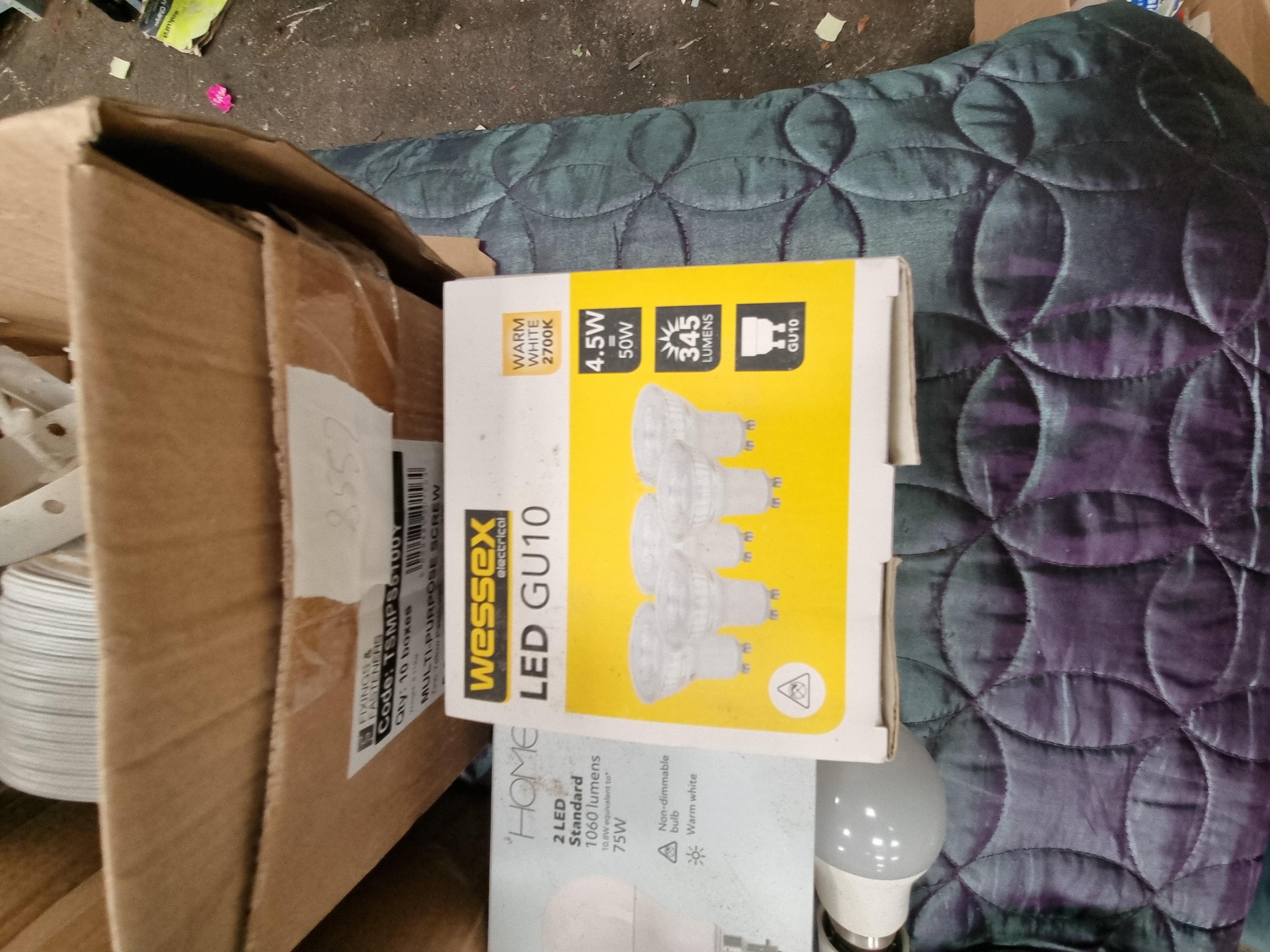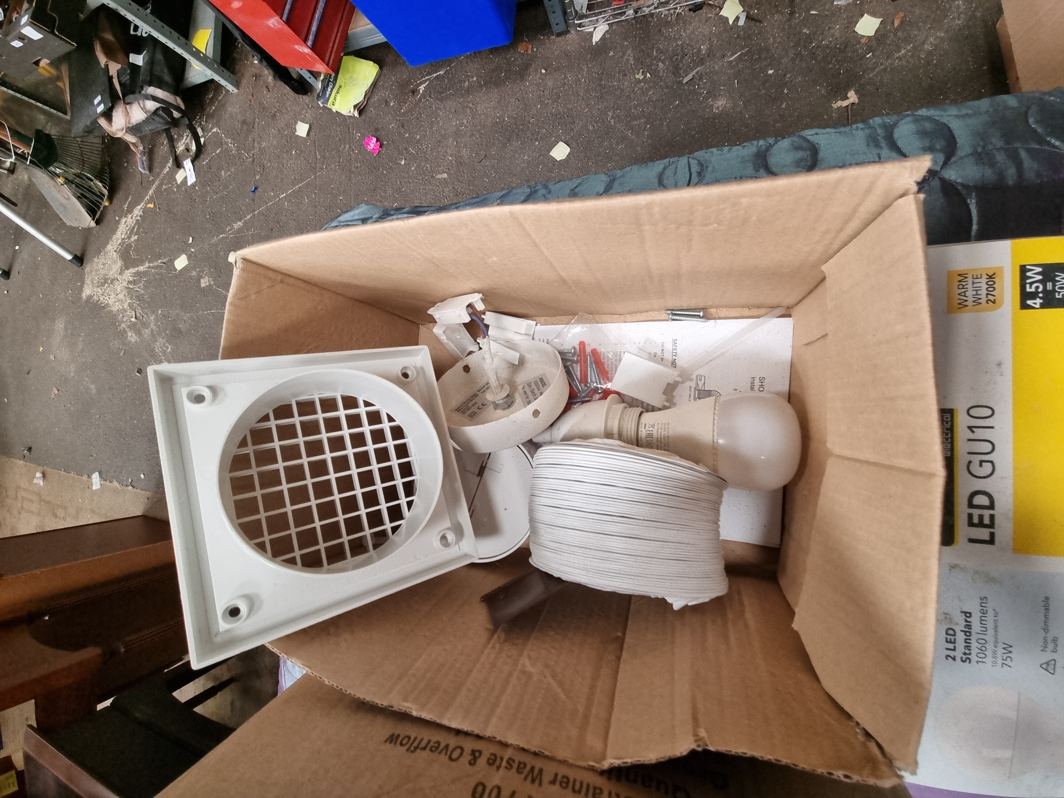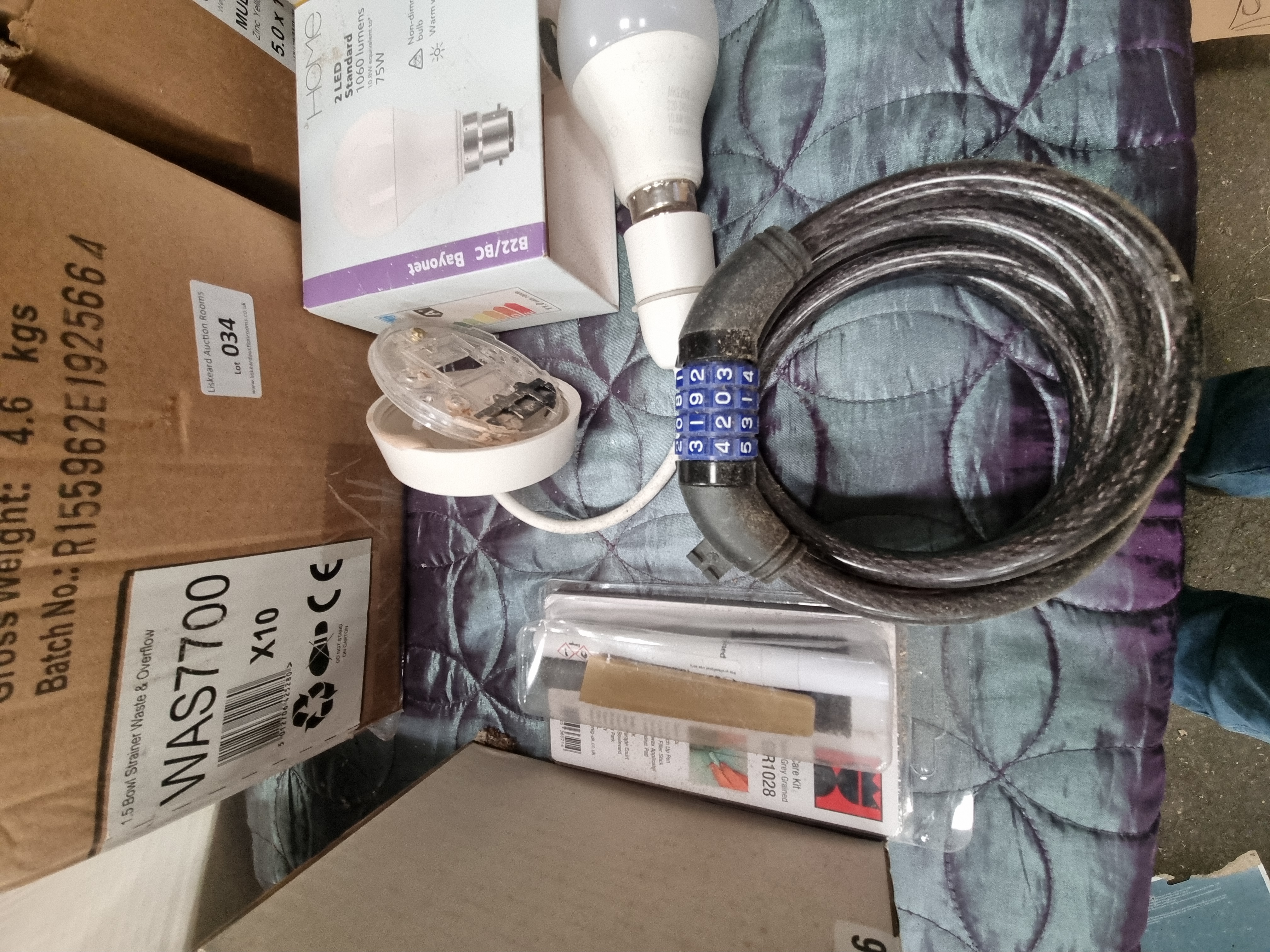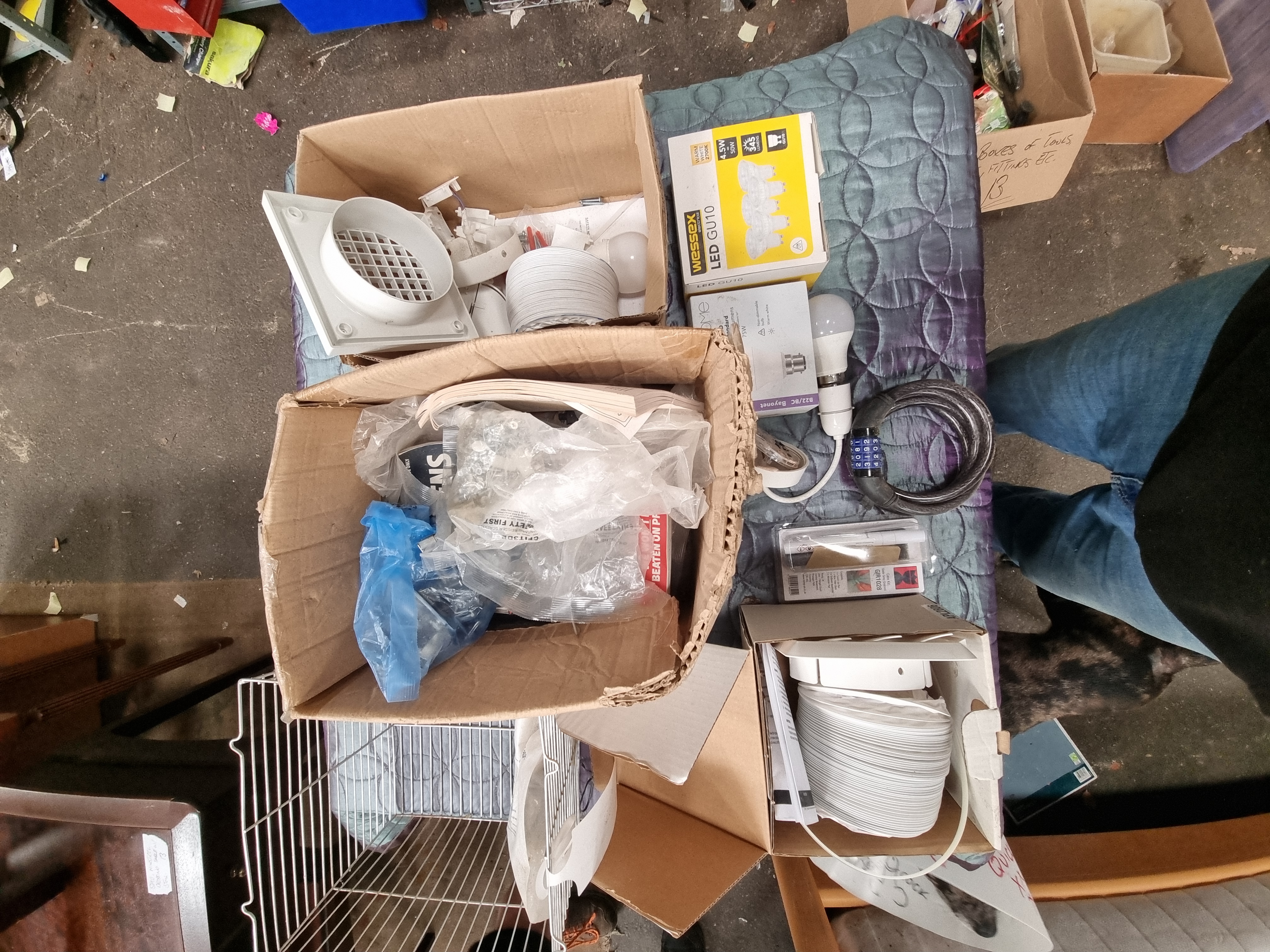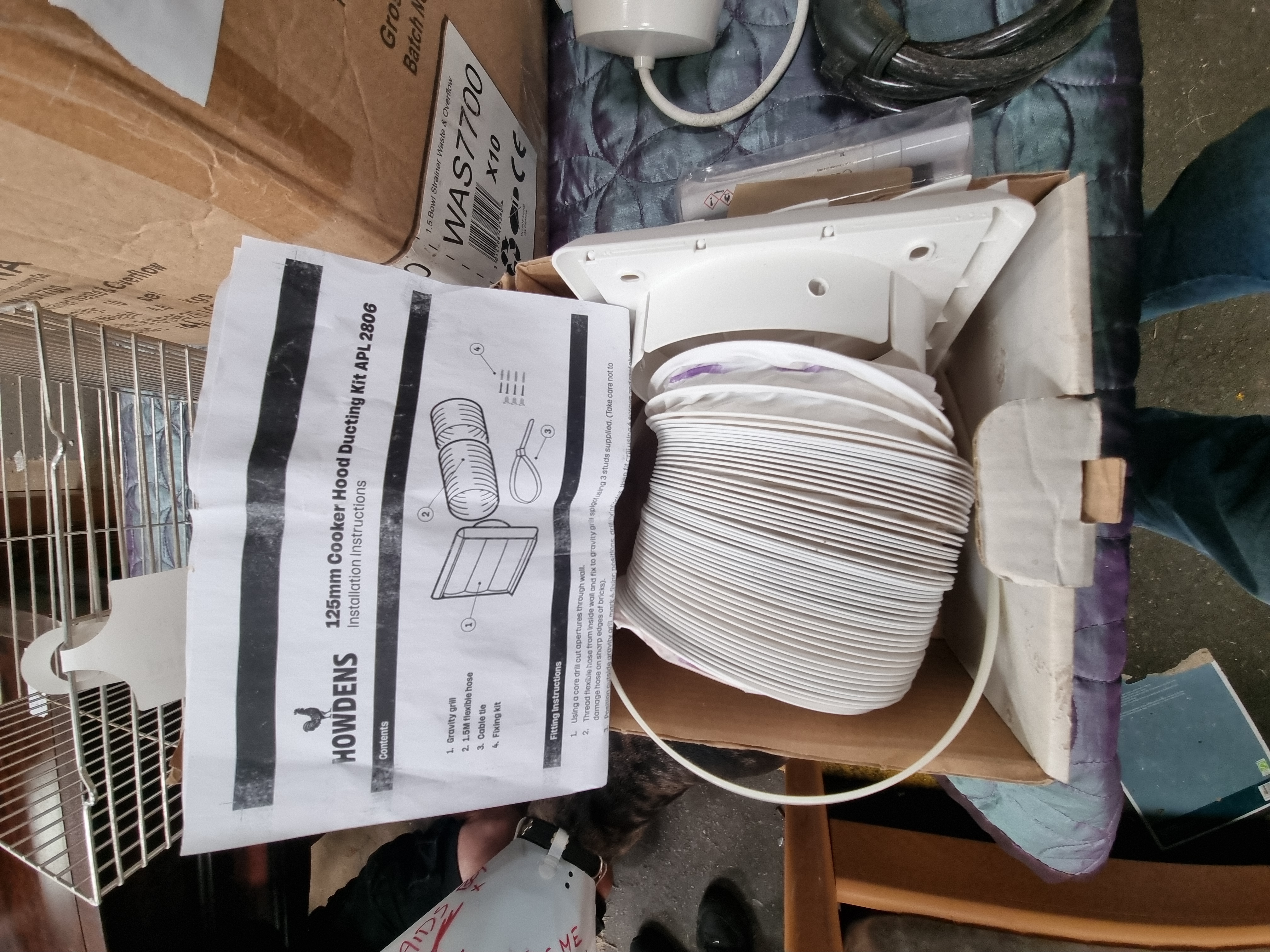 This lot comprises an assortment of domestic hardware, kitchen ventilation, electrical lighting, and plumbing components, likely consisting of surplus stock or retail returns. The collection includes a Howdens 125mm Cooker Hood Ducting Kit (APL 2806) with a white plastic gravity grill and flexible ducting. Electrical lighting supplies include a box of Wessex Electrical LED GU10 bulbs (4.5W, 345 Lumens, Warm White), Home brand B22/BC Bayonet LED bulbs (1060 Lumens), and various loose light fittings and components. Plumbing items include a kit for a WAS7700 1.5 Bowl Strainer Waste and Overflow, containing various white plastic components. Also present is a coiled black combination cable lock, a blister-packed furniture care kit for grey grained surfaces (Product code R1028), and several boxes containing loose screws, fixings, and small plastic parts. The items bear marks for Howdens, Wessex Electrical, and Home.