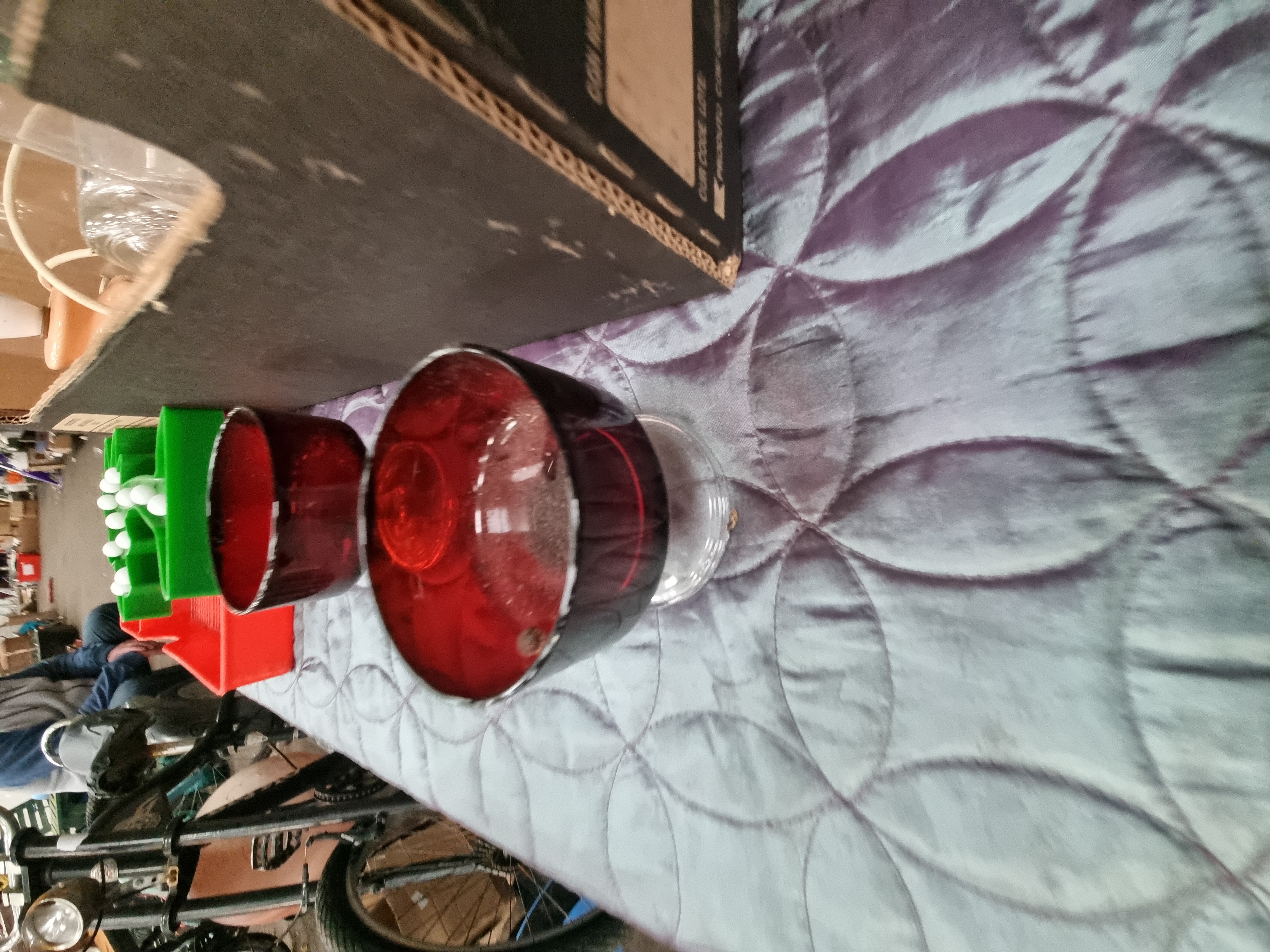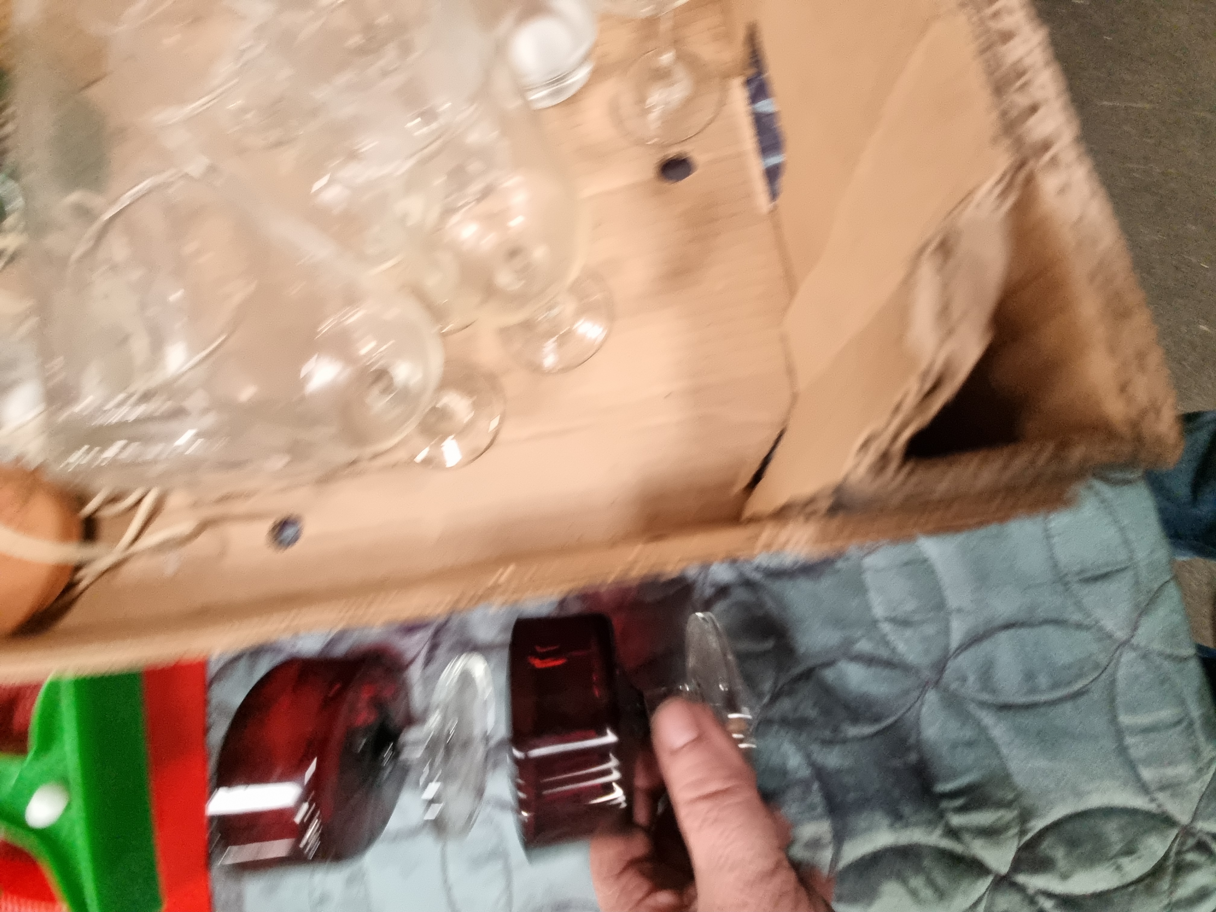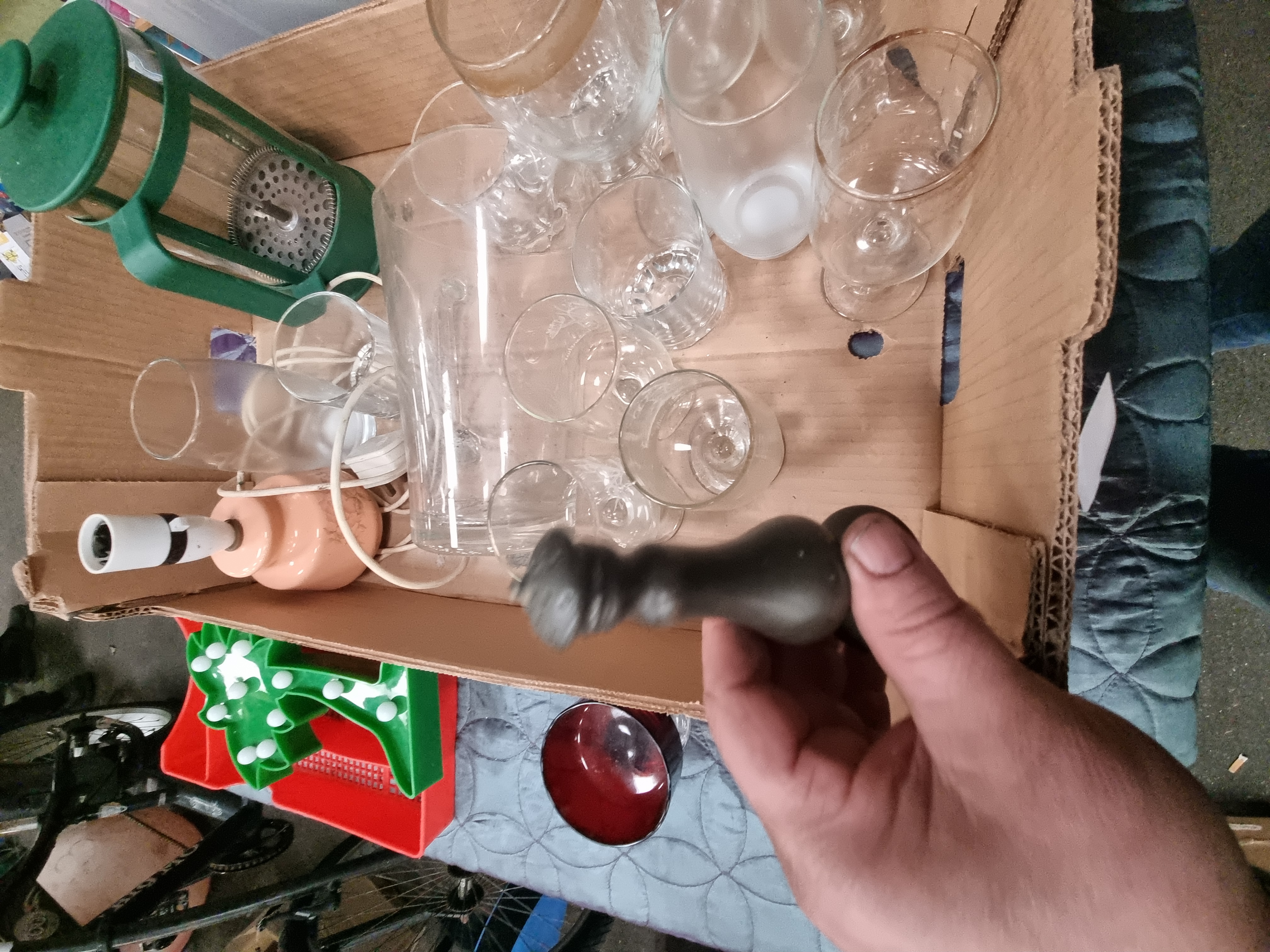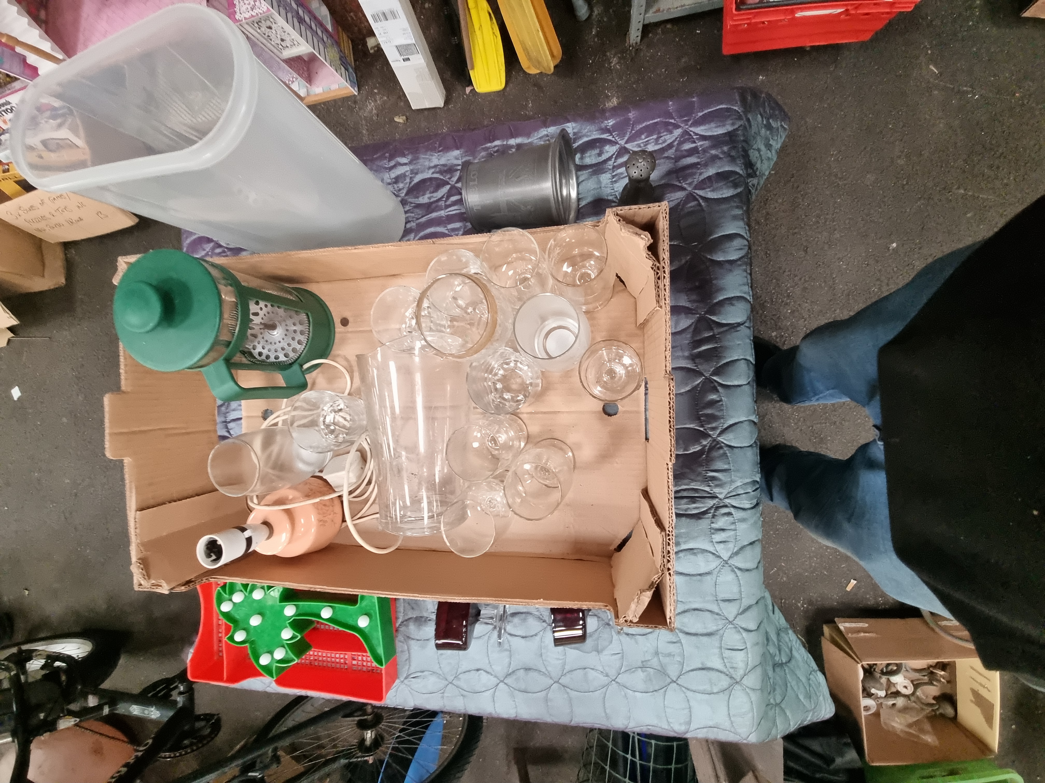A collection of glassware and various domestic items. The lot includes clear glass stemware in various sizes, tumblers, and a large cylindrical glass vessel. Featured are a pair of ruby-red glass goblets with clear faceted bases. Additional household items comprise a green-bodied cafetière, a small peach-toned lamp base with an integrated electric cord, and a green plastic Christmas tree-shaped light-up decoration. The assortment is completed by a large translucent plastic storage container, a grey metal canister, and a dark-toned decorative figure resembling a chess piece. No maker’s marks were observed during inspection.
