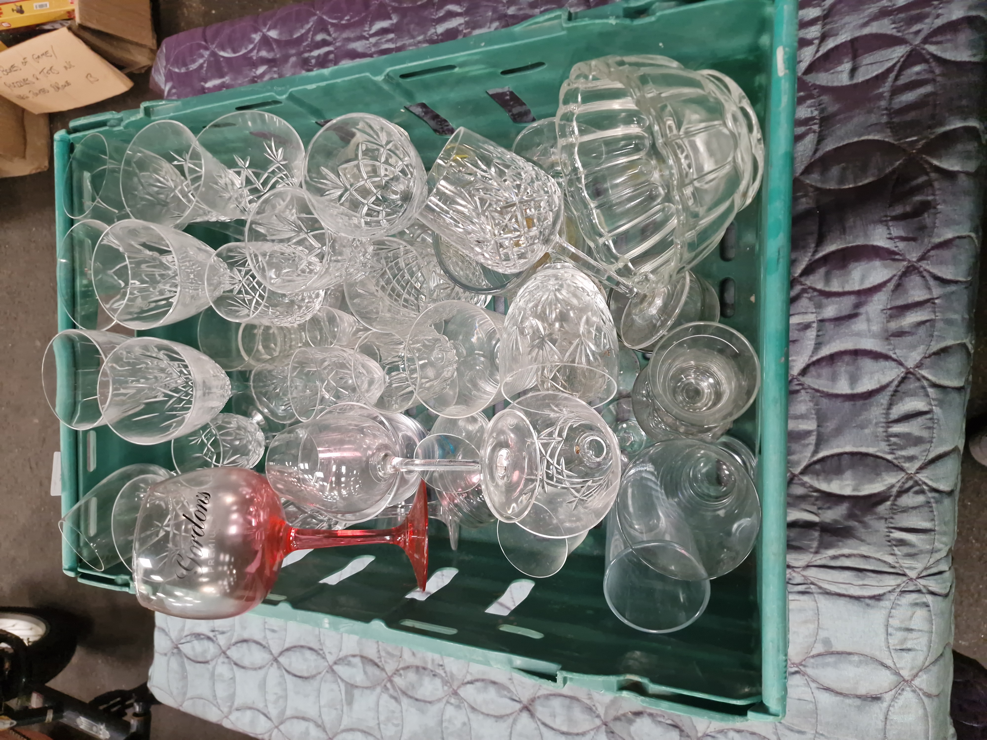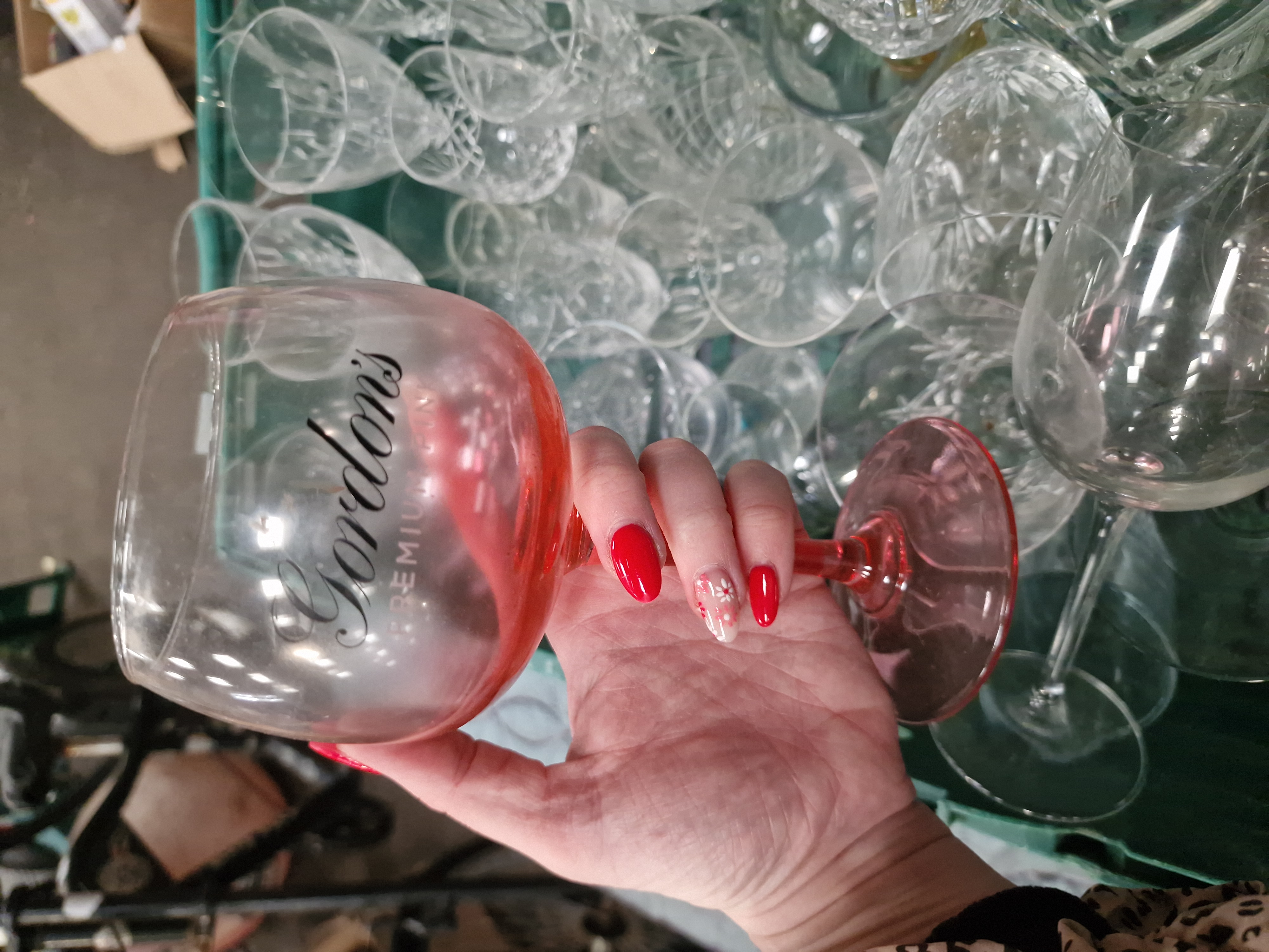 A collection of assorted glassware comprising approximately twenty to thirty pieces of cut lead crystal and mixed decorative glass. The lot includes a variety of wine and water stemware featuring deep diamond, cross-hatch, and fan cutting patterns. One specific item is a modern balloon gin glass with a pink-tinted stem and base, bearing the printed script Gordons in black cursive with Premium Gin in smaller block capitals below. The assortment also contains a large glass bowl with heavy vertical ribbing and several plain glass tumblers. The styles and patterns observed are consistent with 20th-century British manufacturers such as Stuart and Webb Corbett, though no definitive acid-etched marks are clearly visible for specific attribution.