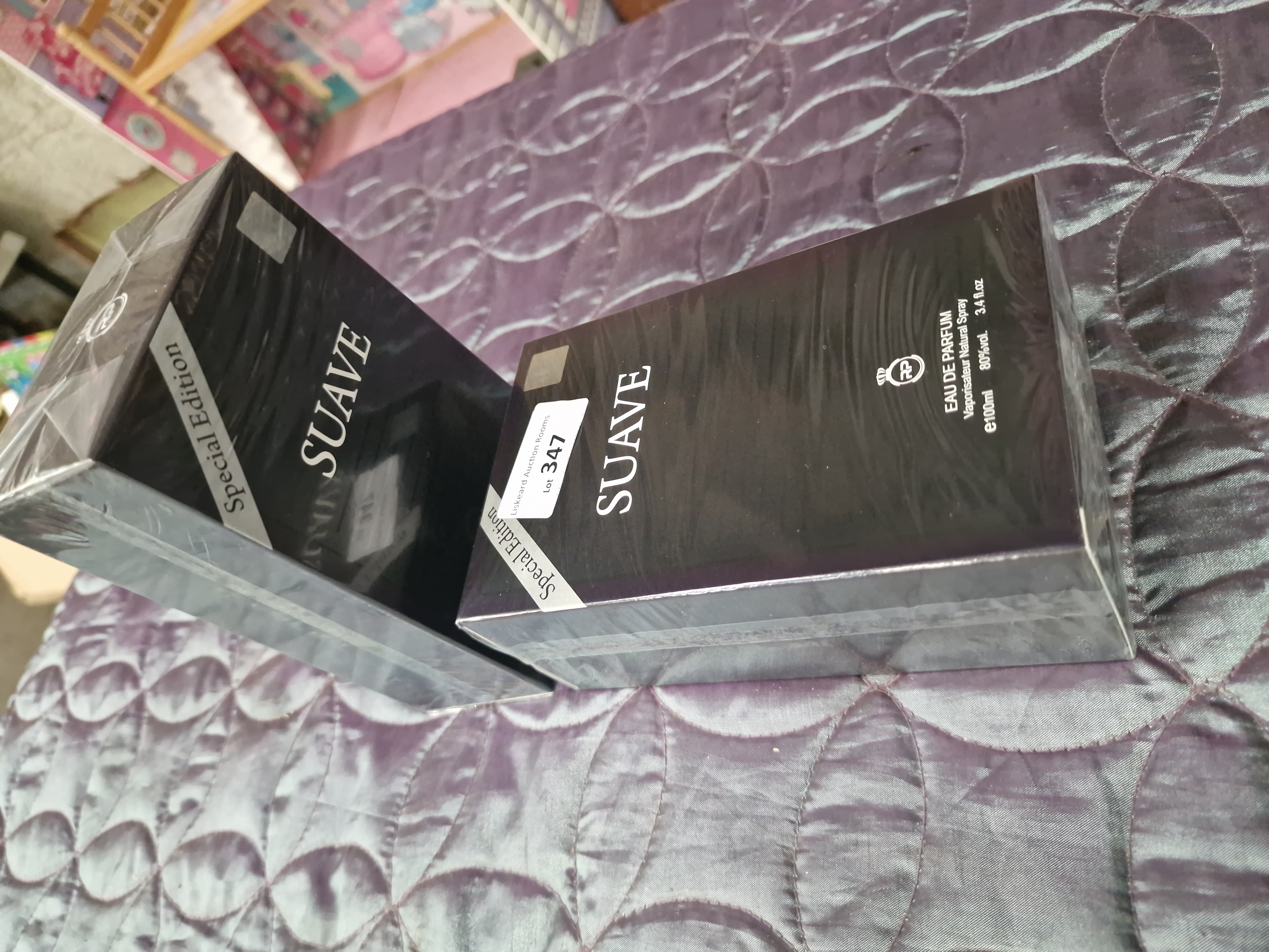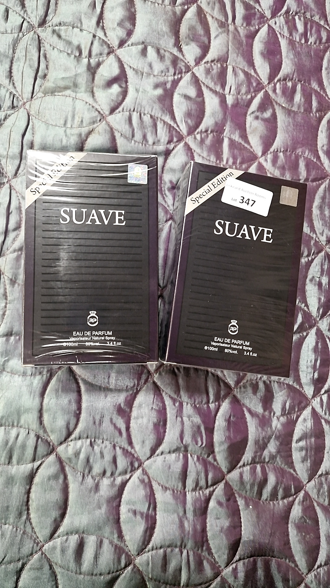A pair of Suave Special Edition eau de parfum fragrances by Fragrance World. Each 100ml (3.4 fl.oz.) vaporisateur natural spray is housed in a black rectangular card box with horizontal ribbing. The front of the packaging is printed with SUAVE in white capital letters above an RP logo within a crowned circle. The lower text specifies EAU DE PARFUM and 80% vol. Both items are factory-sealed in their original clear cellophane wrapping. One box carries a Liskeard Auction Rooms lot label for lot 347.