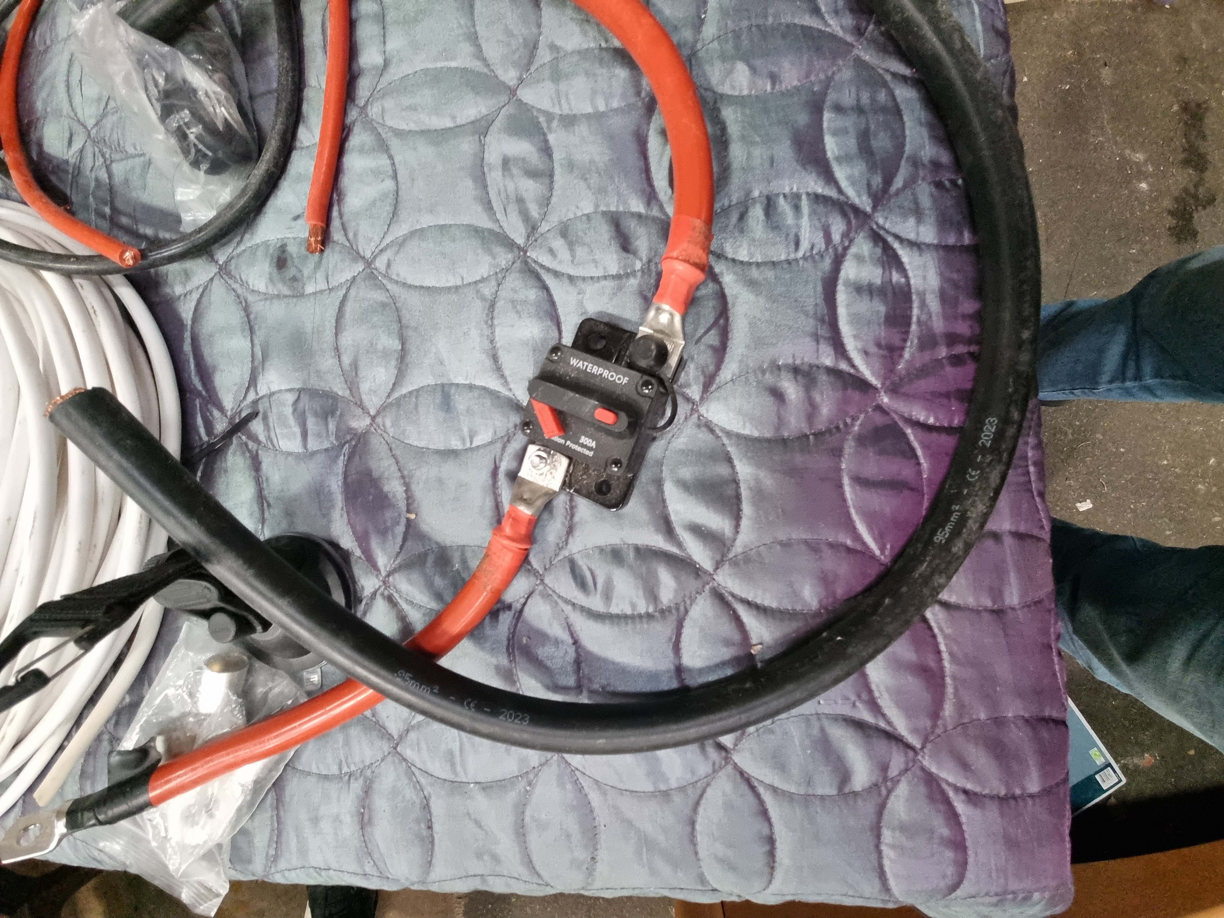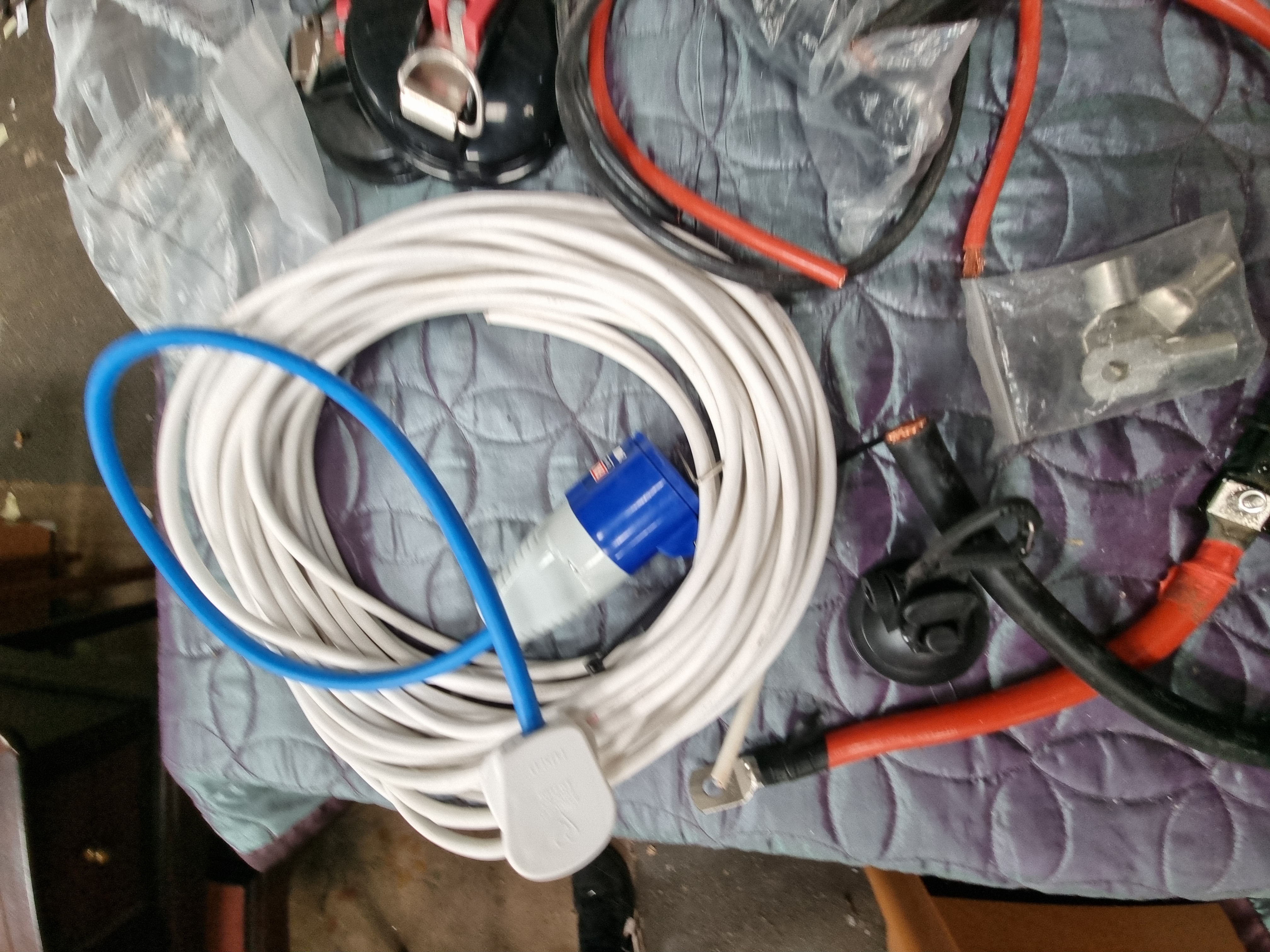 A collection of electrical installation components and wiring equipment, suitable for marine, motorhome, or heavy-duty automotive applications such as lithium battery systems or winch power kits. The lot includes a coiled white mains hook-up lead fitted with a standard UK BS 1363 3-pin plug and a blue 16A 2P+E CEE industrial socket. Also included are various lengths of heavy-duty red and black power cables. One section of black cable is marked 95mm2 – CE – 2023.
