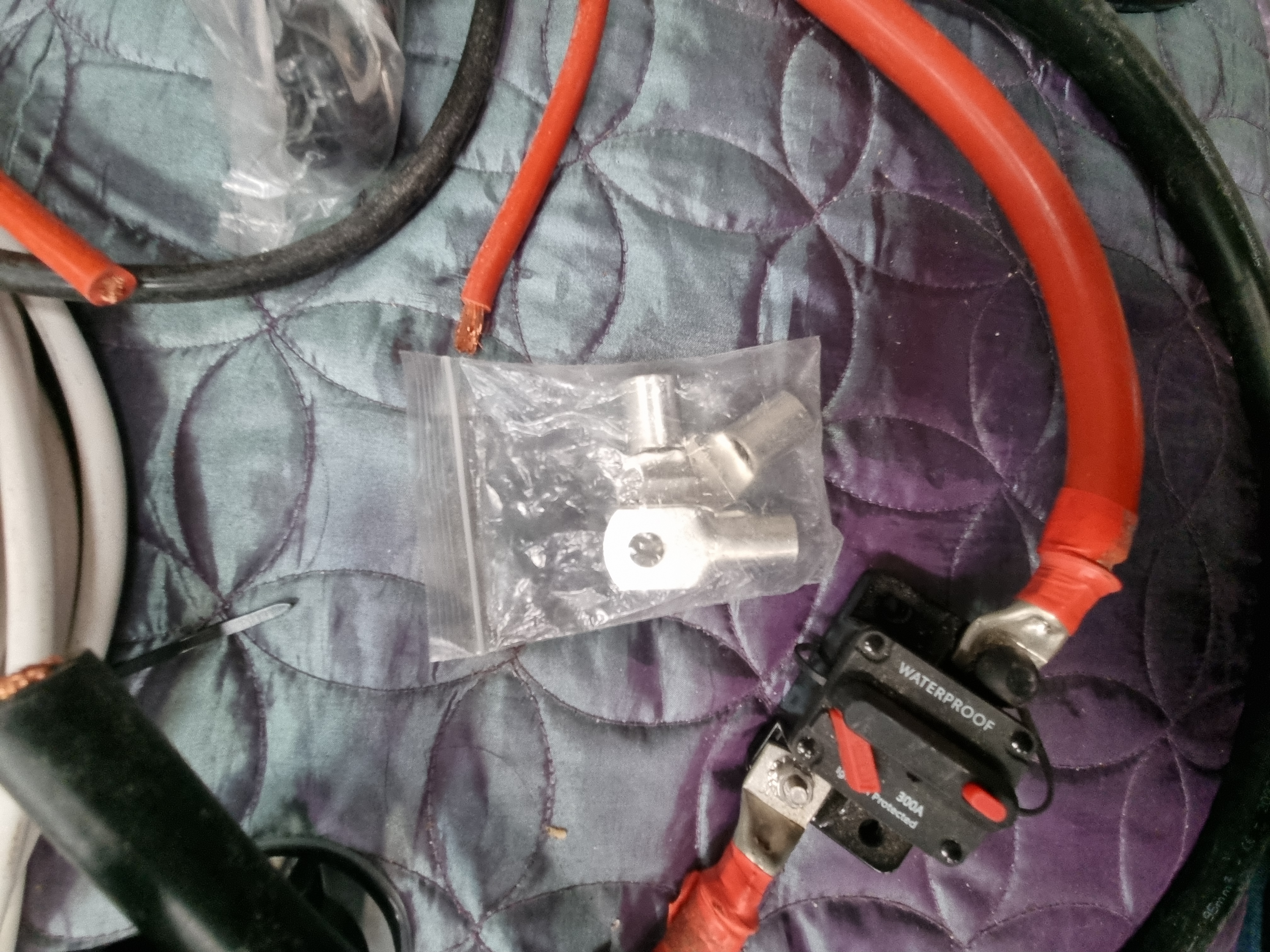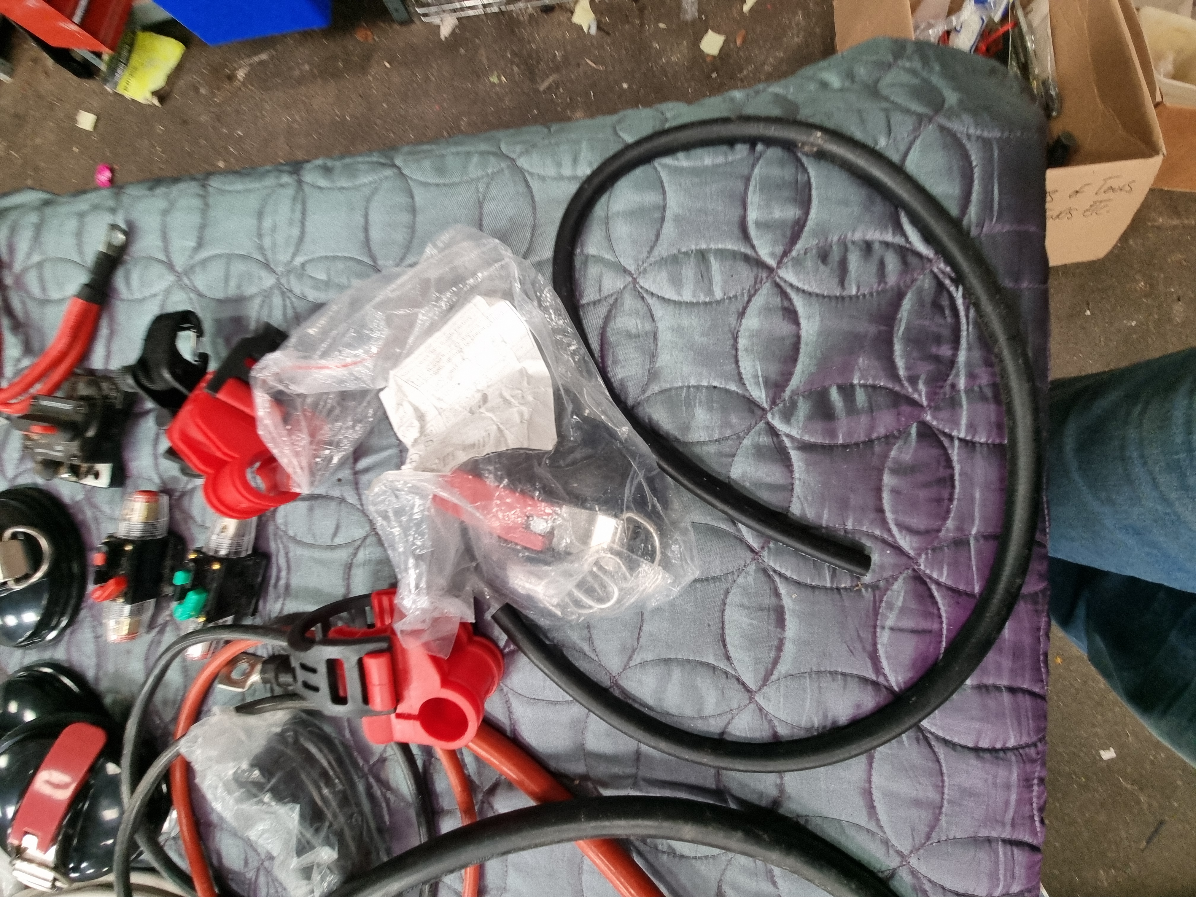 The items appear to be in unused or very lightly used condition, with several components remaining in original plastic packaging. Cables have been cut to various lengths and some ends have been terminated with lugs. All electrical components are sold as seen and must be tested and installed by a qualified professional.