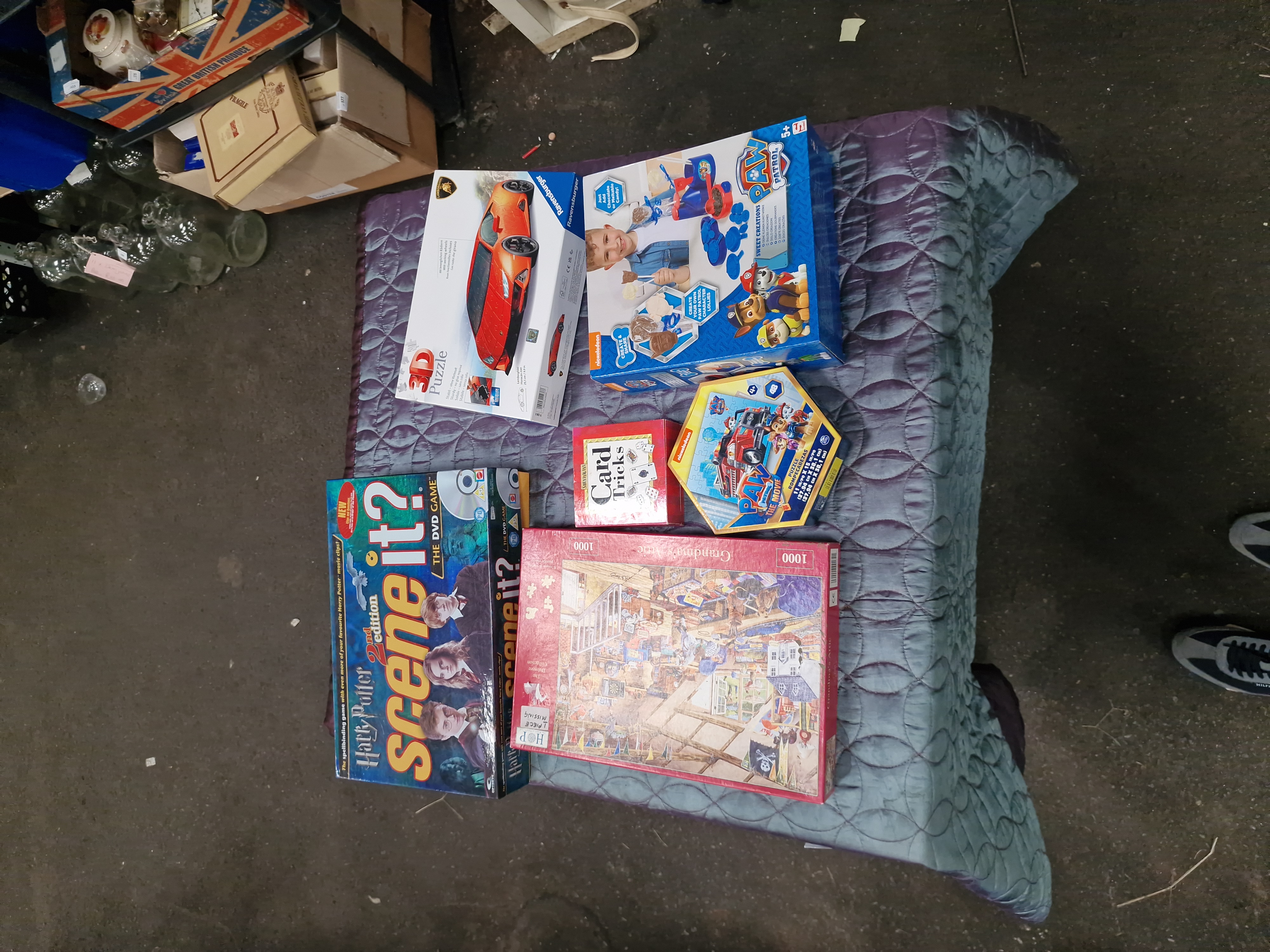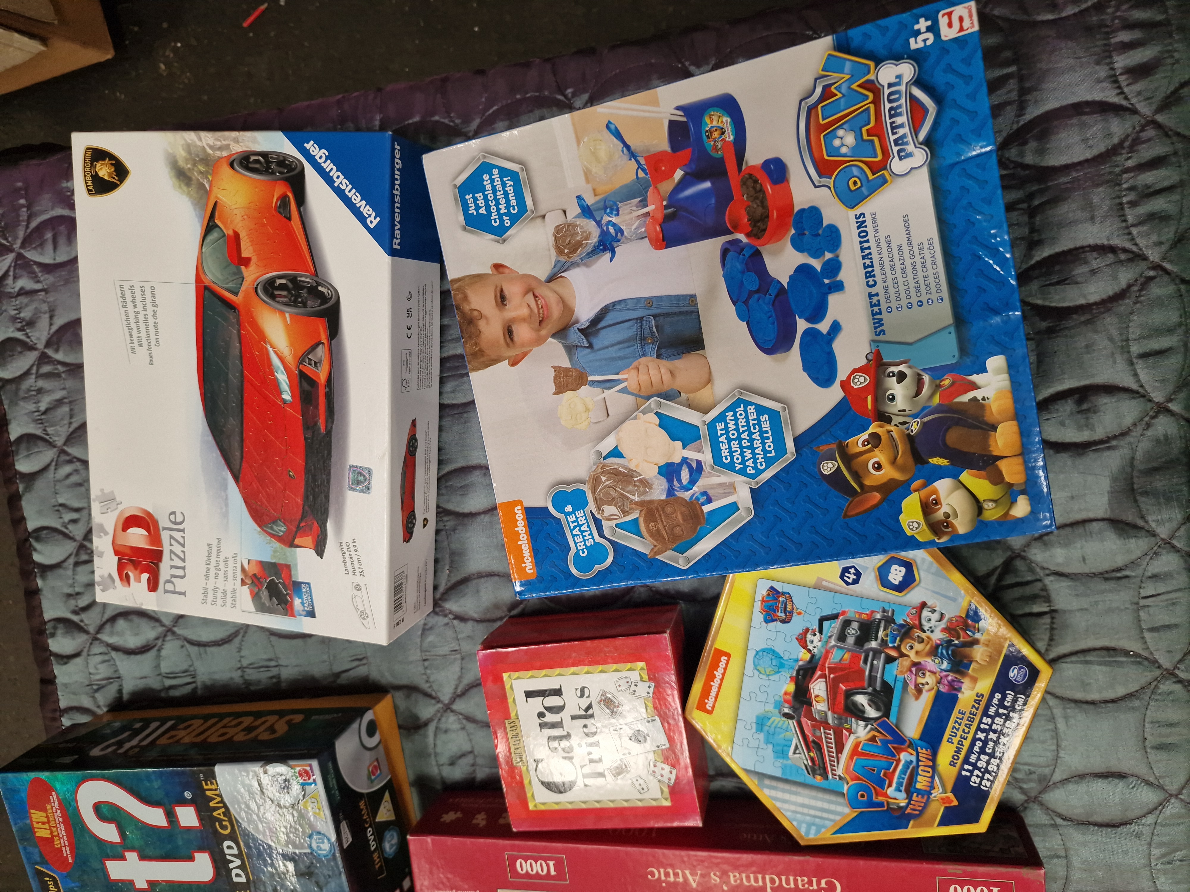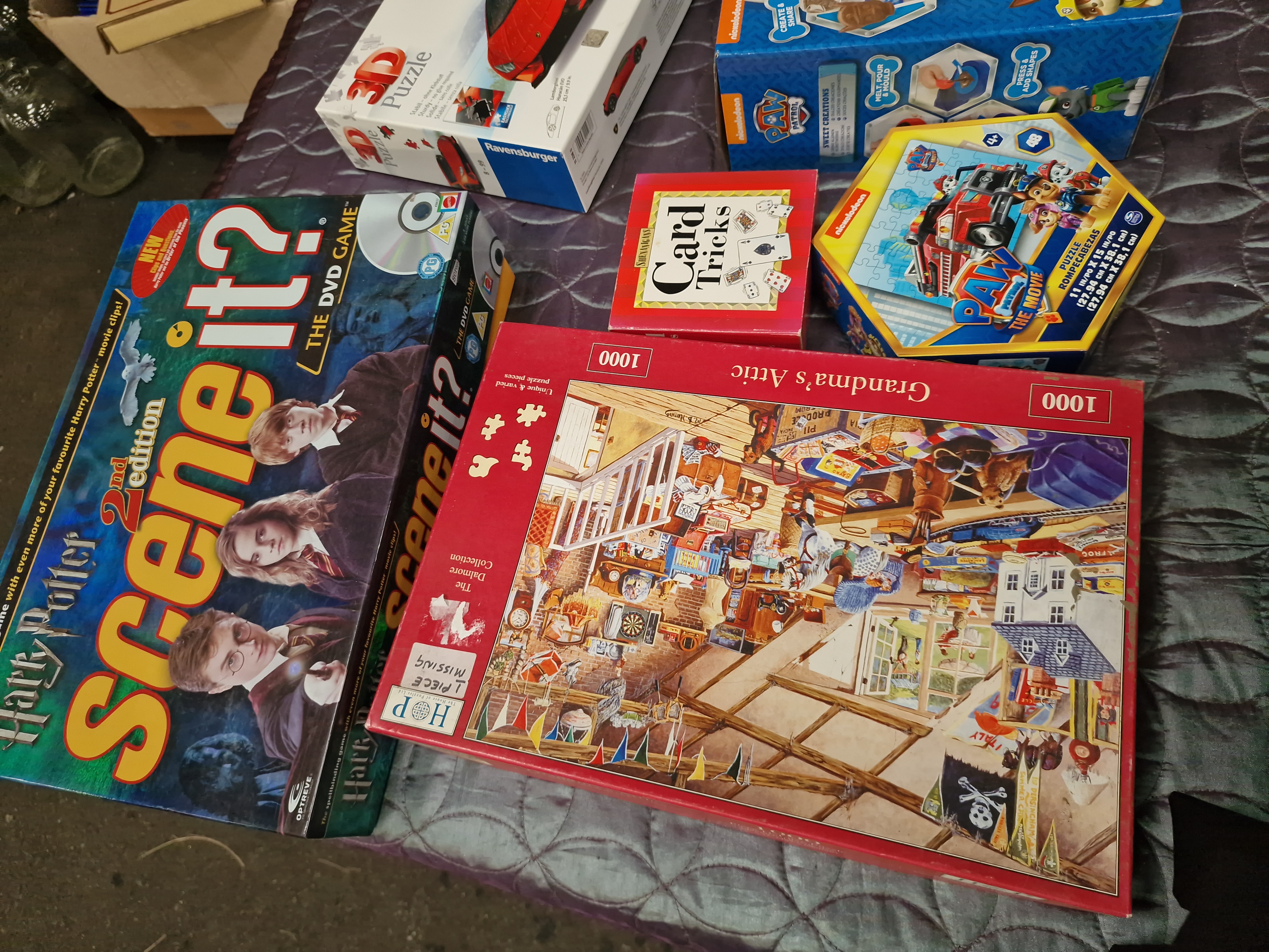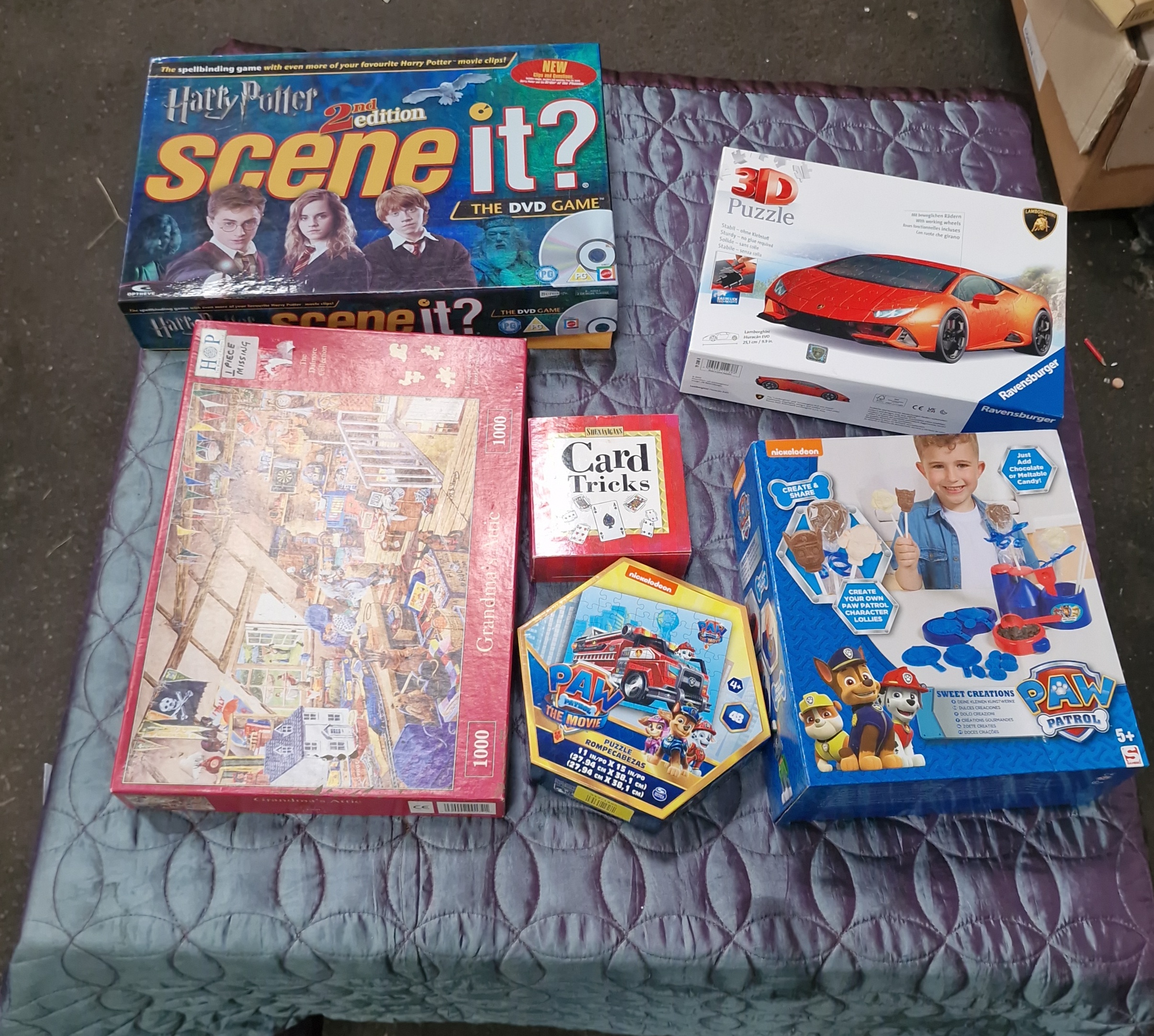 A collection of six boxed games and activity sets. The lot includes a Mattel Harry Potter Scene It? 2nd Edition DVD Game, which comprises a game board, DVD, and game pieces. Also included is a Ravensburger 3D puzzle of a Lamborghini Huracán EVO, featuring plastic construction and a licensed orange finish. The collection contains two jigsaw puzzles: a 1000-piece cardboard puzzle titled Grandma’s Attic by The House of Puzzles (HOP) from The Dalmore Collection, and a 48-piece Paw Patrol: The Movie cardboard puzzle in a hexagonal box. Activity sets consist of a Spin Master Paw Patrol Sweet Creations Lolly Maker and a Shenanigans Card Tricks magic kit.