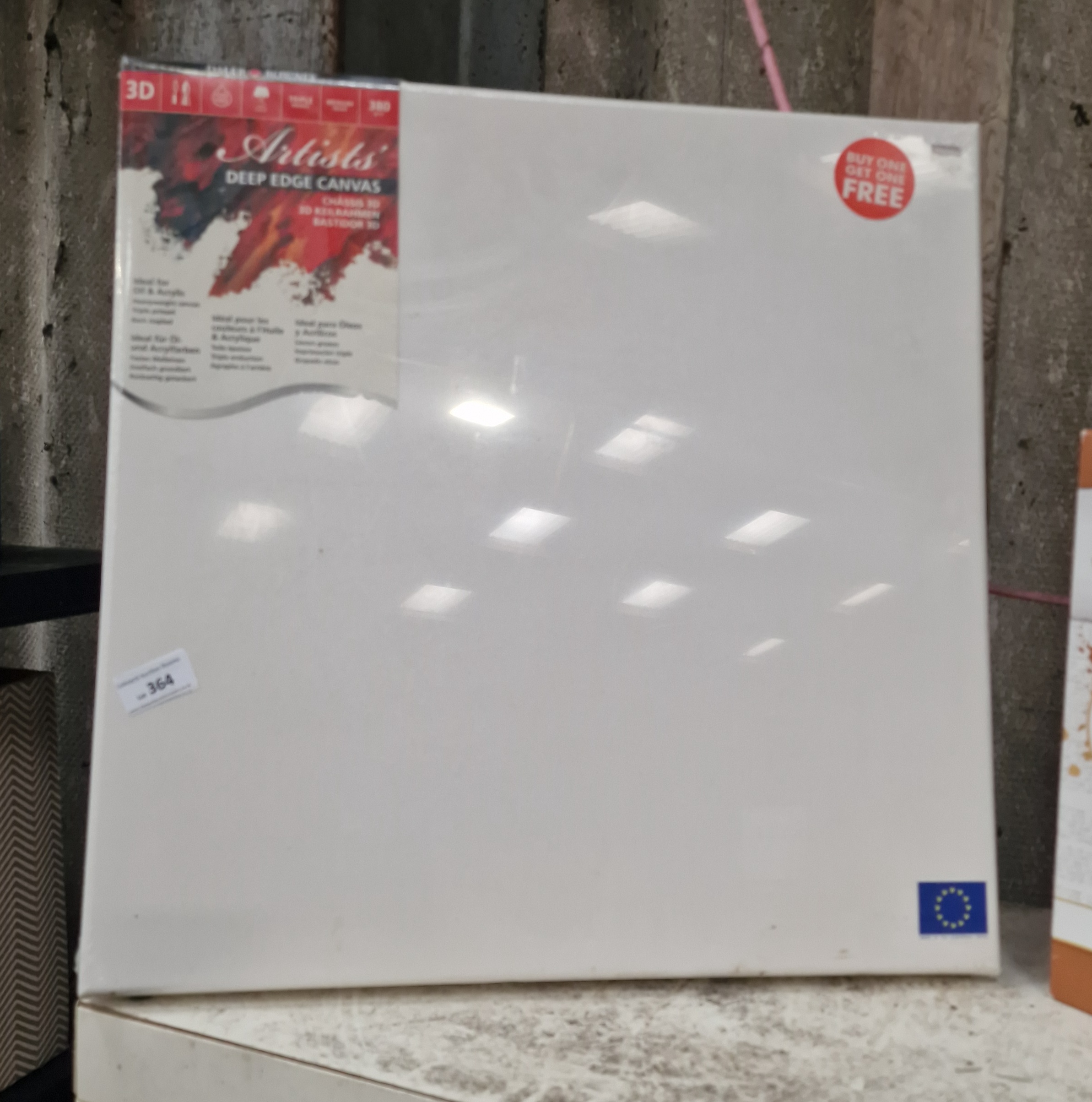 A pair of Daler Rowney Artists’ Deep Edge canvases, presented as a factory-sealed promotional unit. These professional-grade canvases are constructed from 100% cotton with a weight of 380g/m2. Each canvas is triple-primed with an acid-free coating and features a medium grain surface suitable for oil and acrylic colours. The canvases are back-stapled to the wooden stretcher bars. The packaging includes product specifications in English, French, German, and Spanish. A small auction house stock sticker numbered 364 is present on the exterior film.