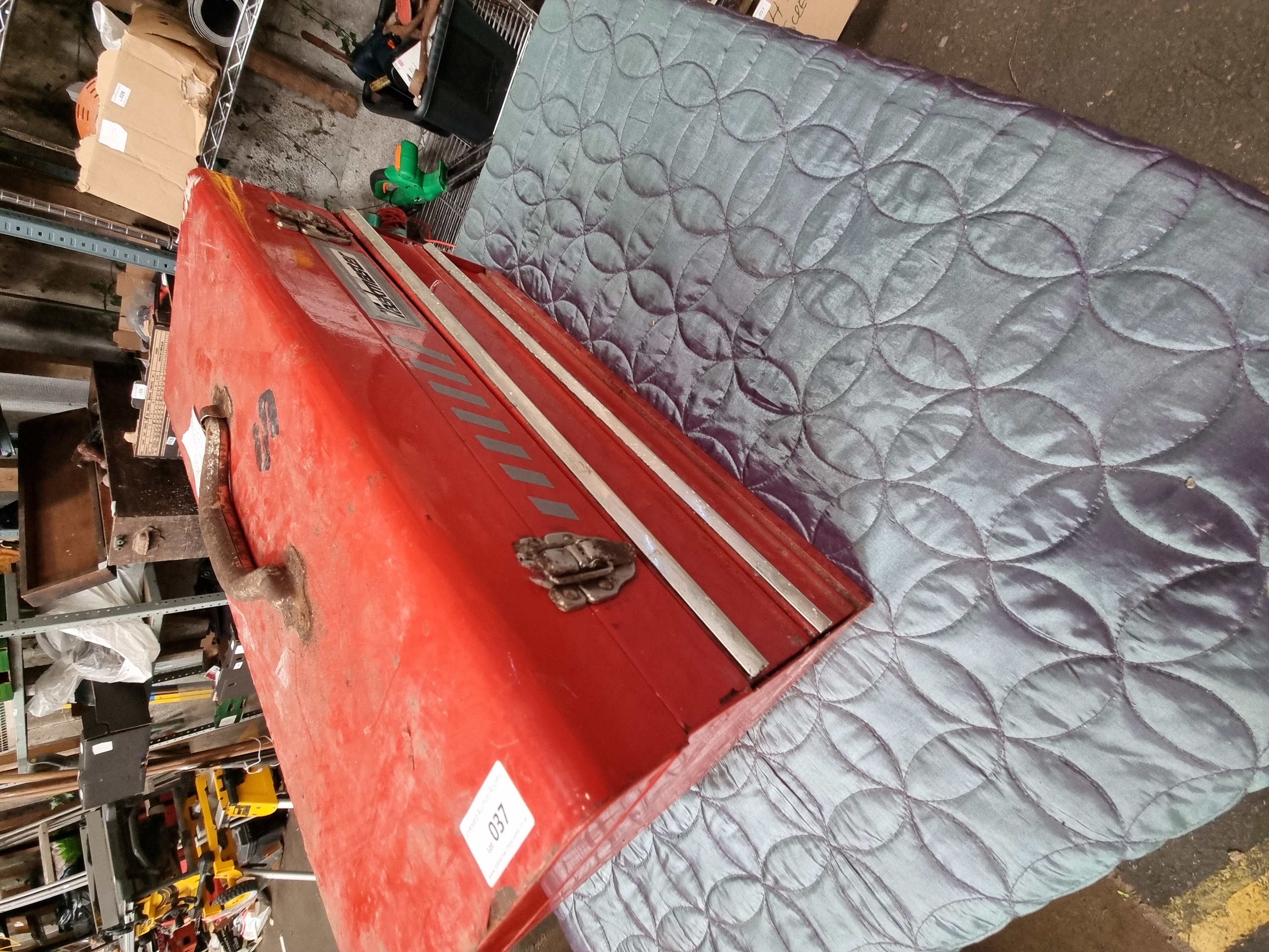The toolbox is in used condition, showing significant surface wear, scratches, and areas of paint loss. Heavy corrosion is visible on the carry handle and the two front latches. The interior and contents show signs of extensive use, with grease and superficial rust present on several components. The drawers and hinges appear to be in working order. The lot is sold as a miscellaneous collection of parts; the completeness and working status of individual components are unverified.