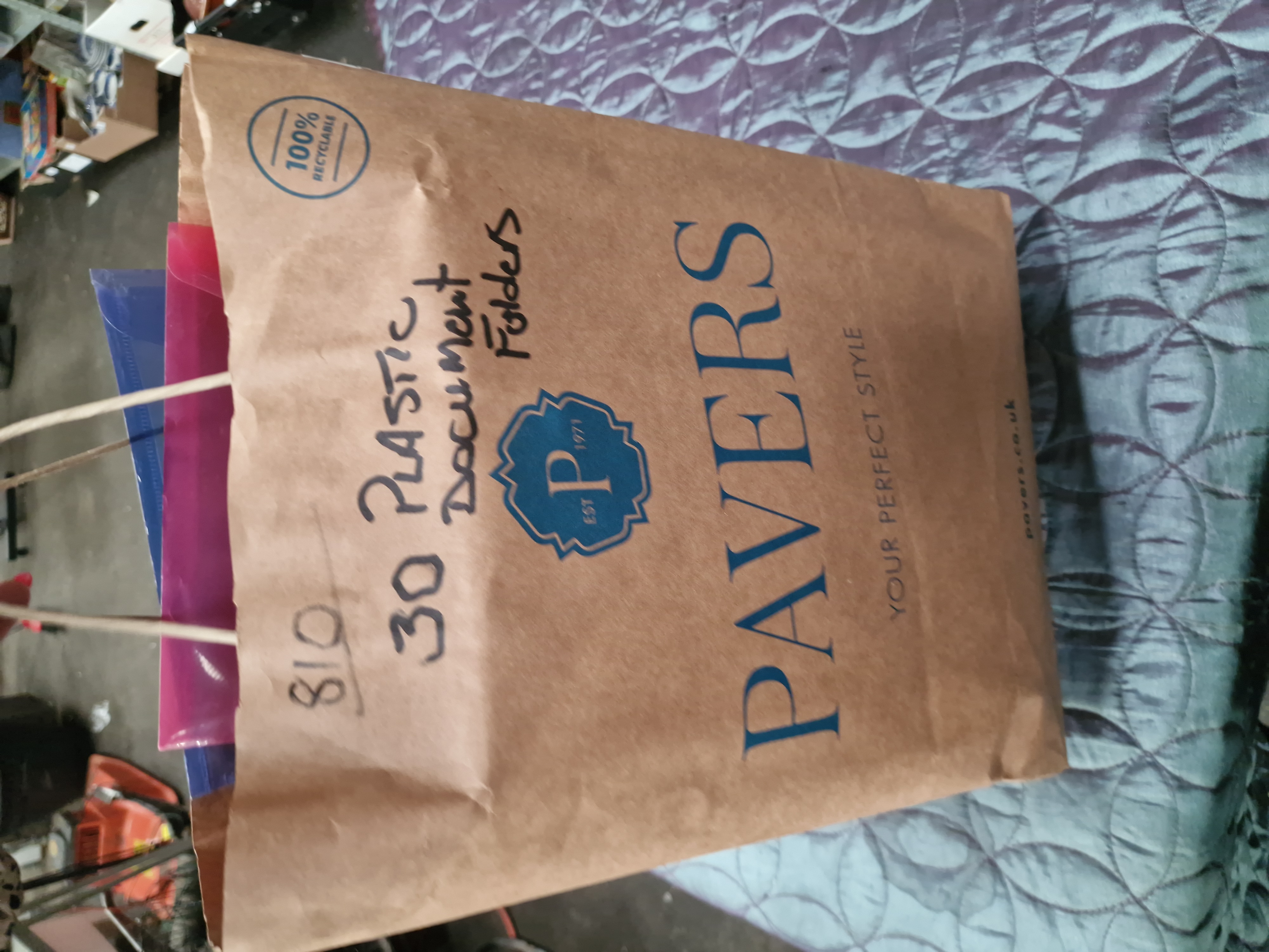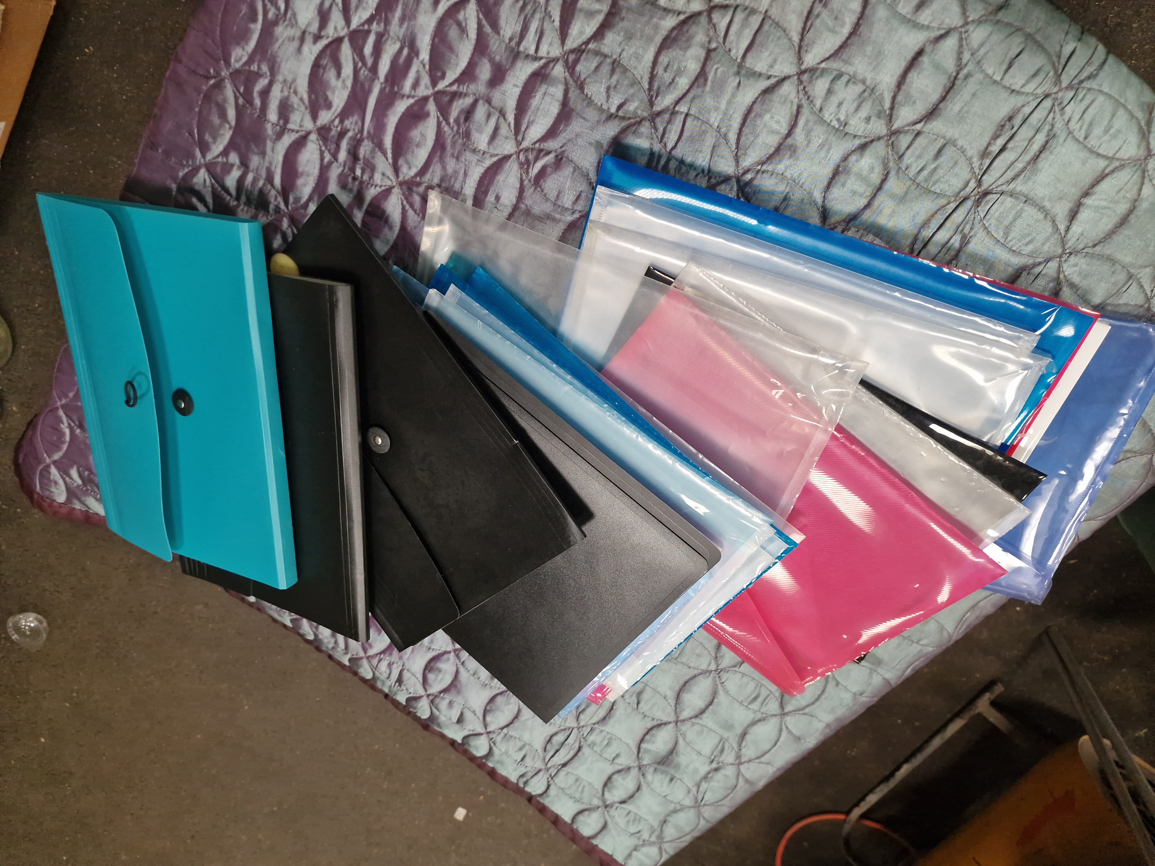A collection of 30 assorted plastic document folders and wallets in various styles and sizes. The lot includes expanding file folders featuring button-and-loop closures, zip-lock style pouches, and slide-seal wallets. The items are produced in a variety of colours including teal, black, pink, blue, and translucent clear. These unbranded stationery goods are presented as a loose lot within a brown paper carrier bag bearing handwritten markings. The collection appears to consist of unused overstock or liquidation items.