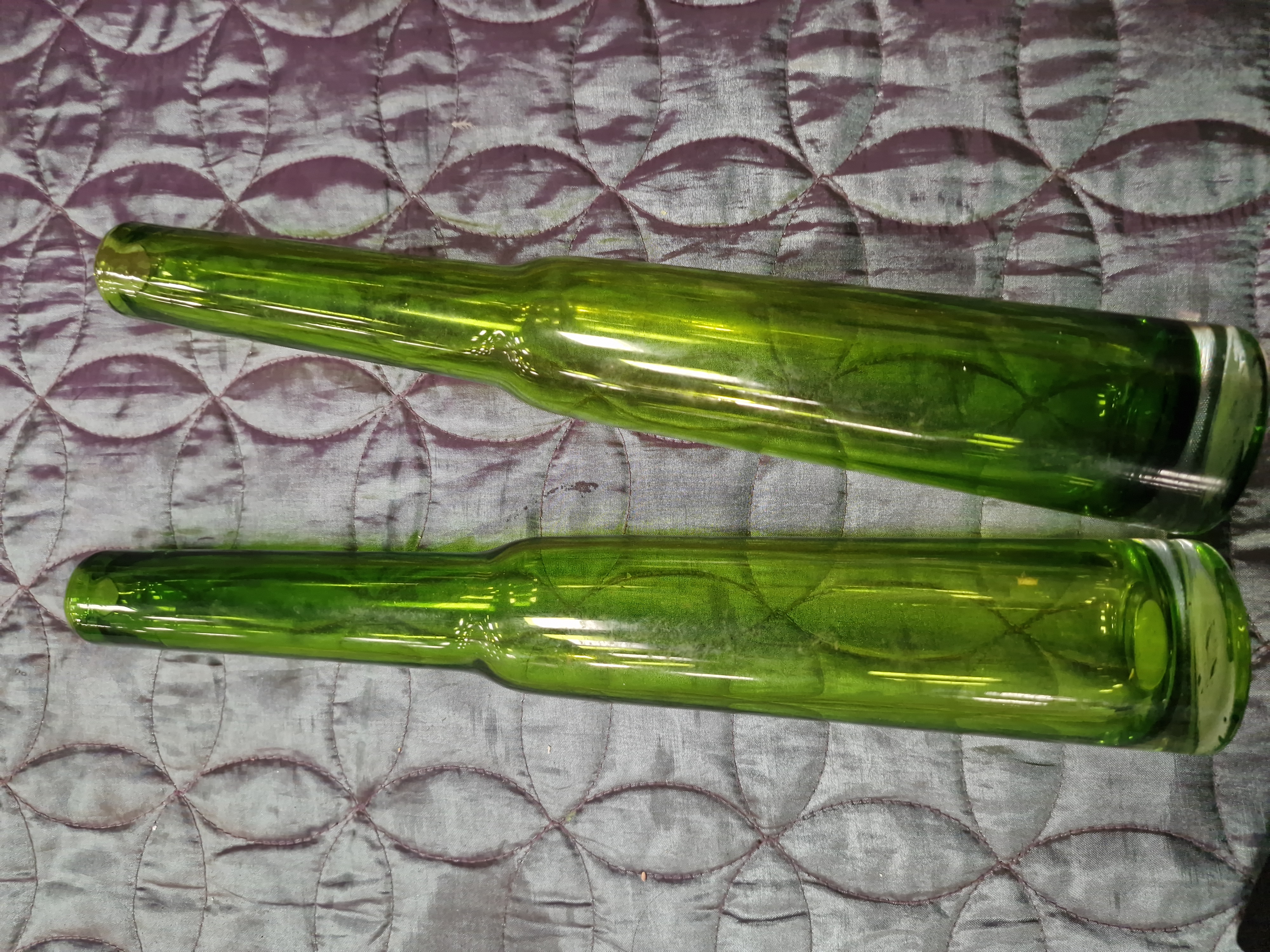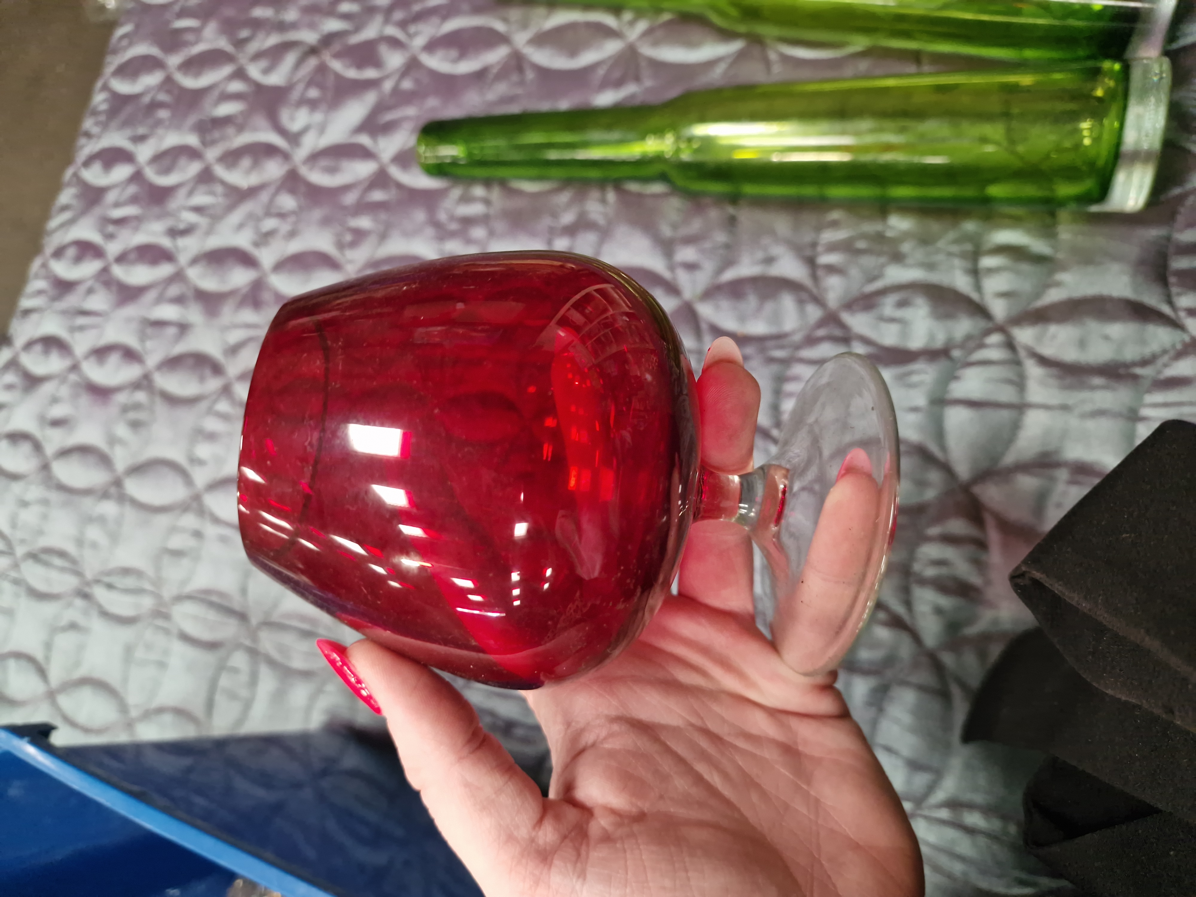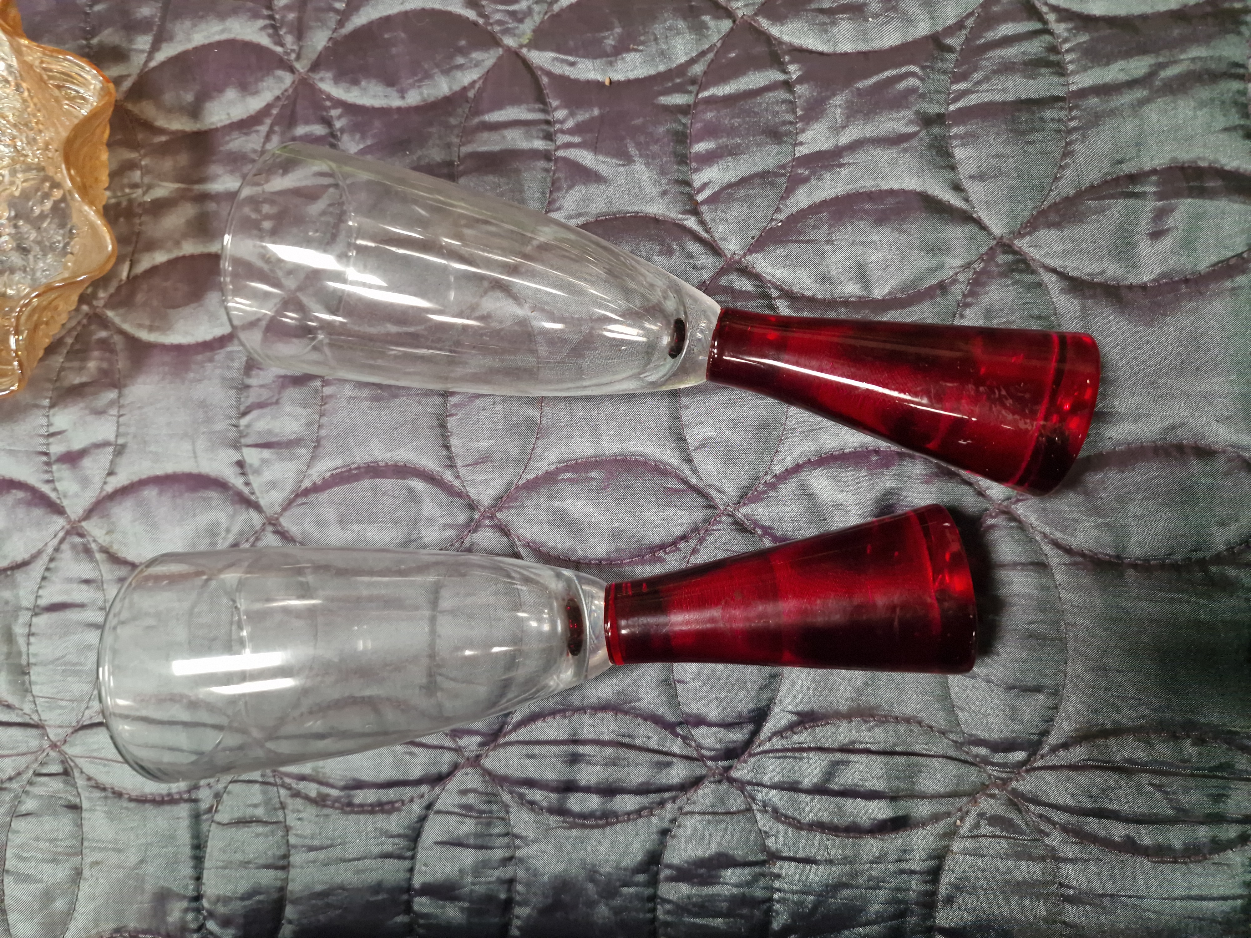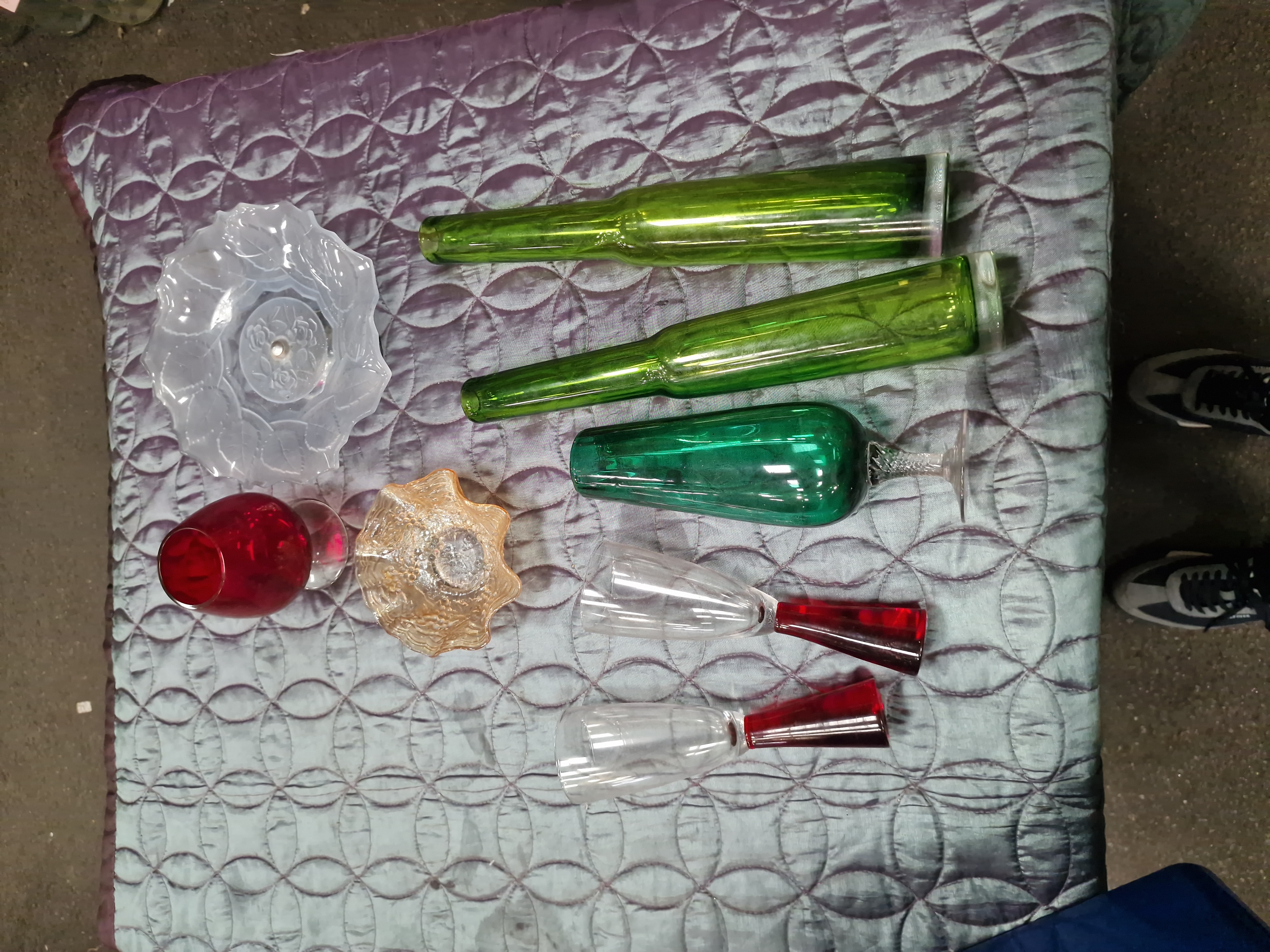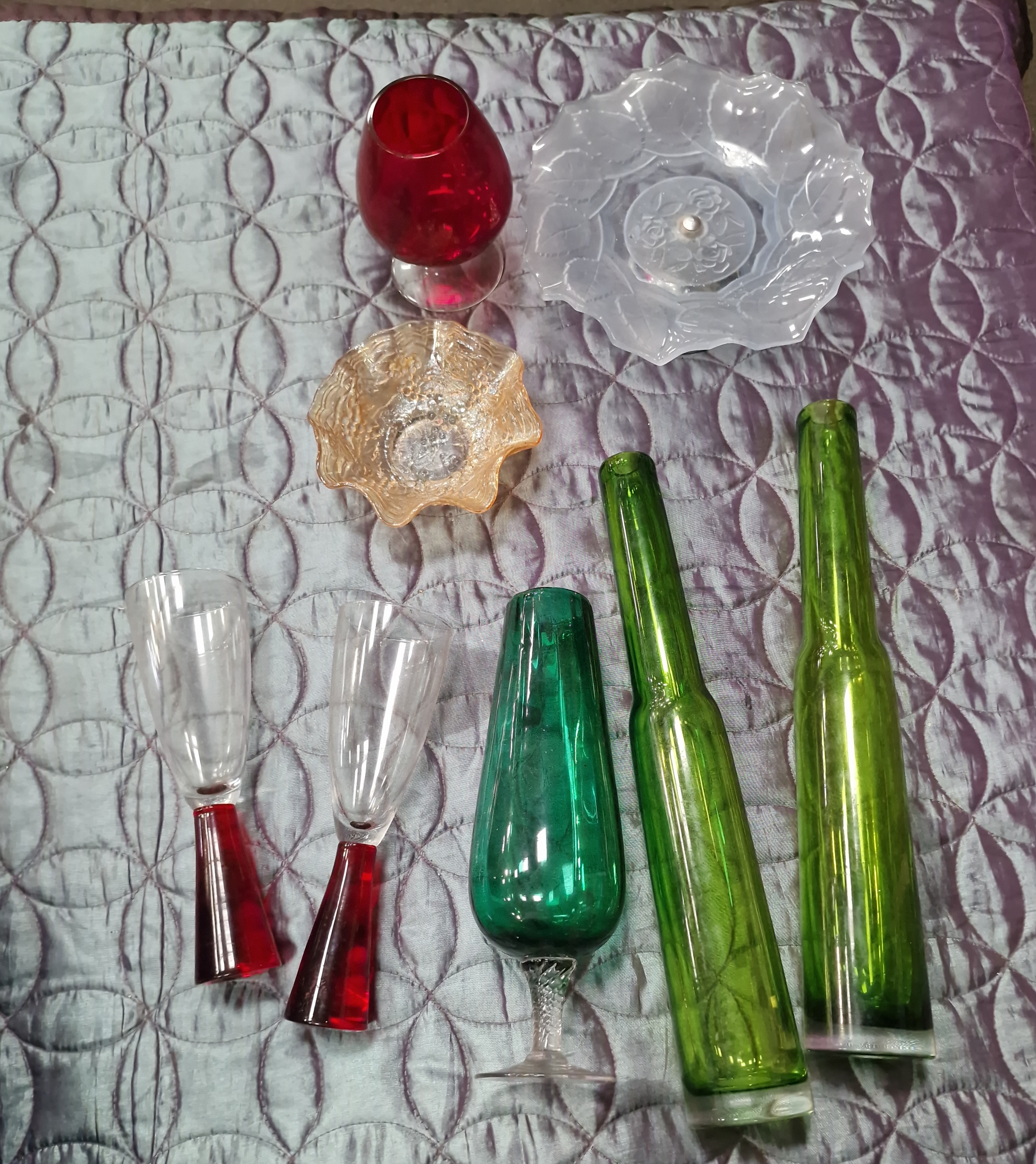 A collection of eight pieces of decorative glassware comprising various styles and colours, including mid-20th-century and contemporary examples. The group includes a pair of tall olive-green glass vases of tapering cylindrical form with heavy bases, in the style of mid-century uranium glass. Also included is an emerald-green glass flute featuring a barley-twist clear glass stem and a circular foot, and a ruby-red glass brandy snifter with a clear glass stem and foot. The stemware further comprises a pair of contemporary champagne flutes with clear glass bowls set onto solid ruby-red conical bases. Decorative bowls include a small marigold iridescent carnival glass bowl with a ruffled rim and textured exterior pattern, and a shallow frosted glass dish moulded with a central rose motif and radiating petal-shaped design. No maker’s marks or signatures are visible on any of the pieces.