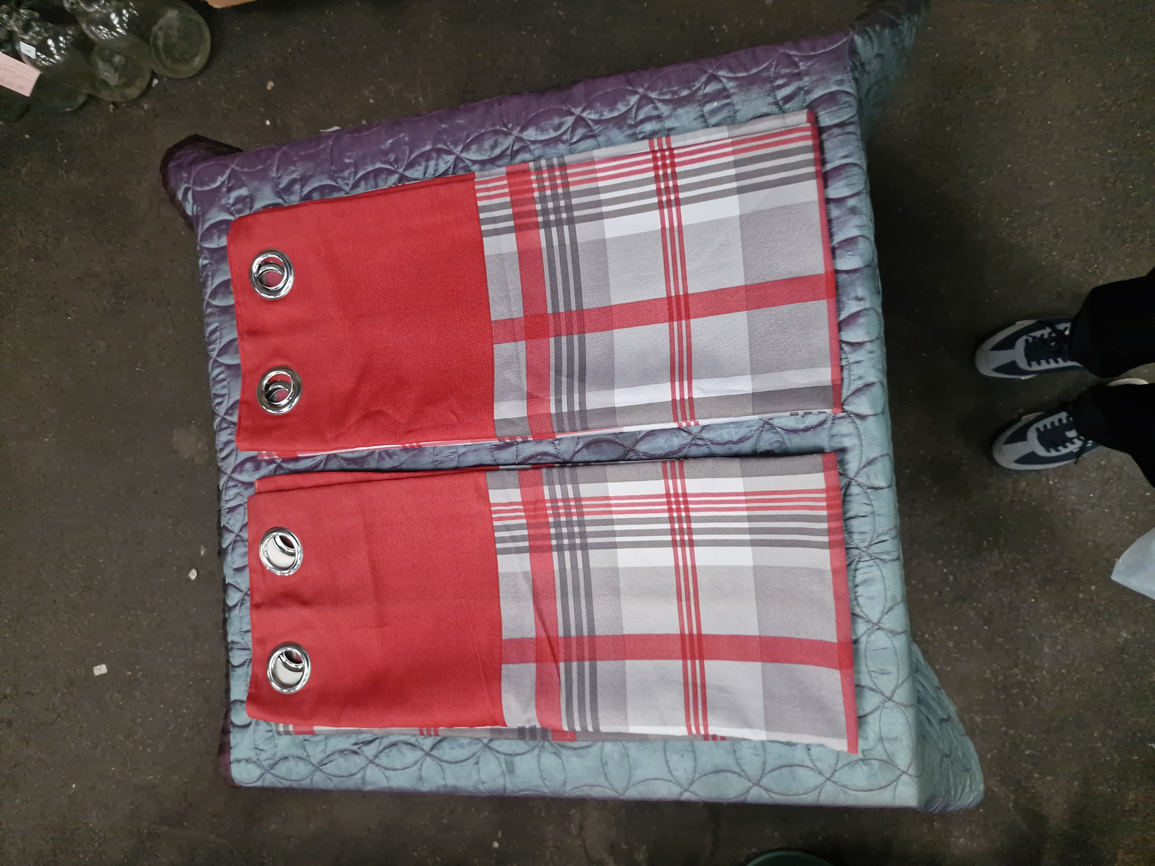 Lot 372: A Pair of Red and Grey Plaid Lined Eyelet Curtains