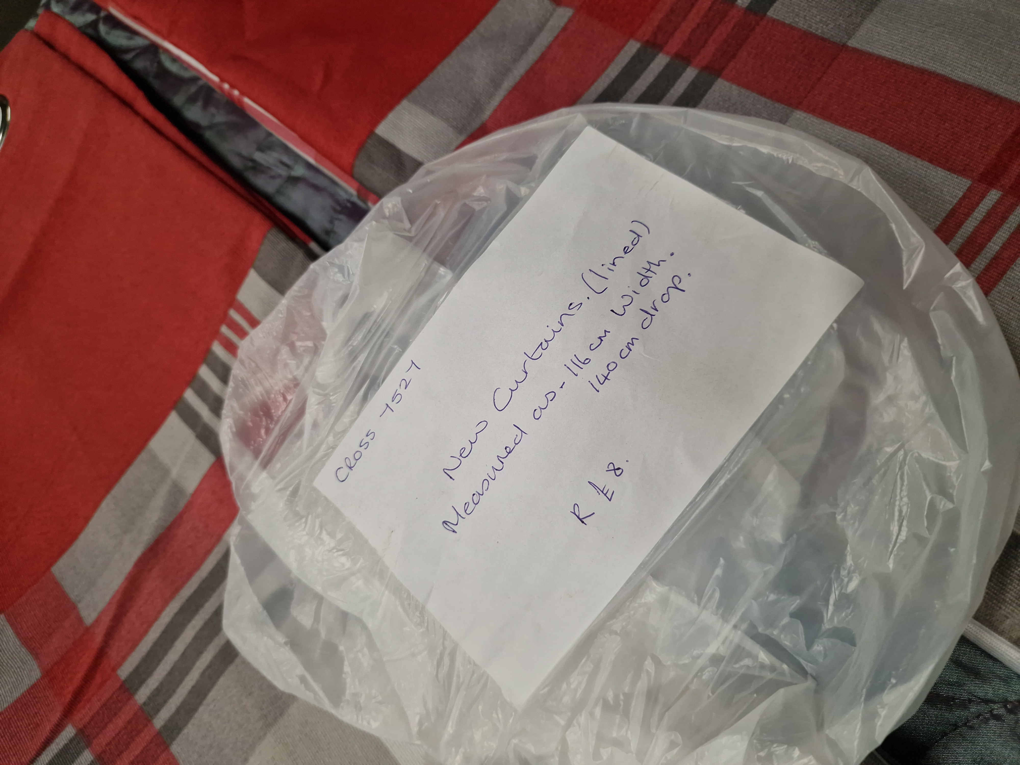 The curtains are in excellent, unused condition and remain in their original folds. They are described as new on the accompanying documentation. There are no visible signs of wear, staining, or damage to the fabric or the metal eyelets.