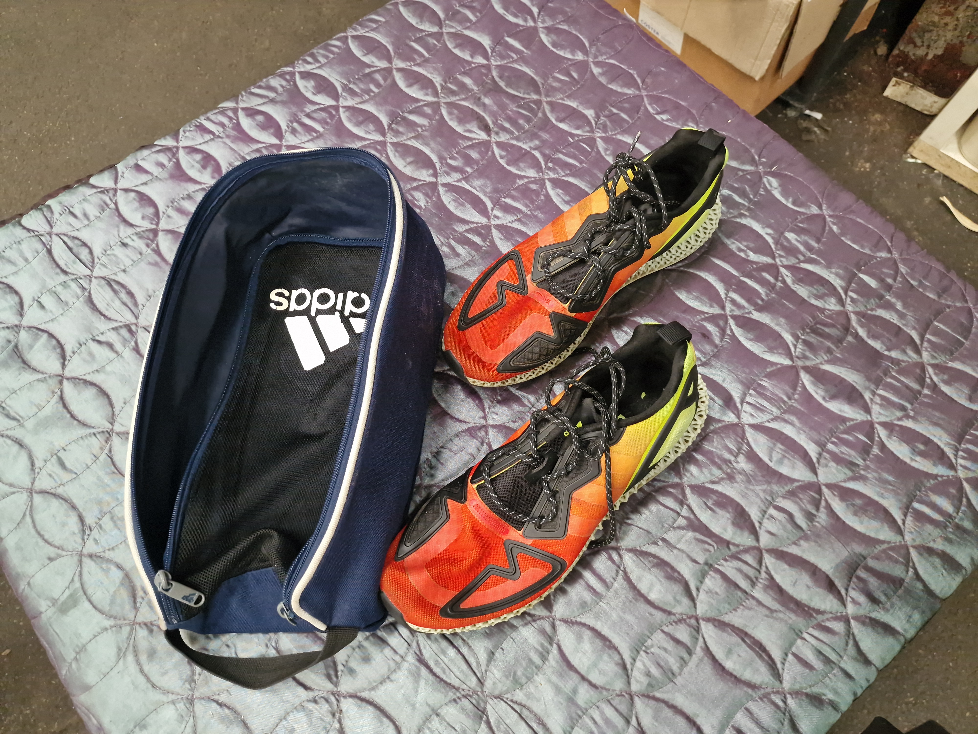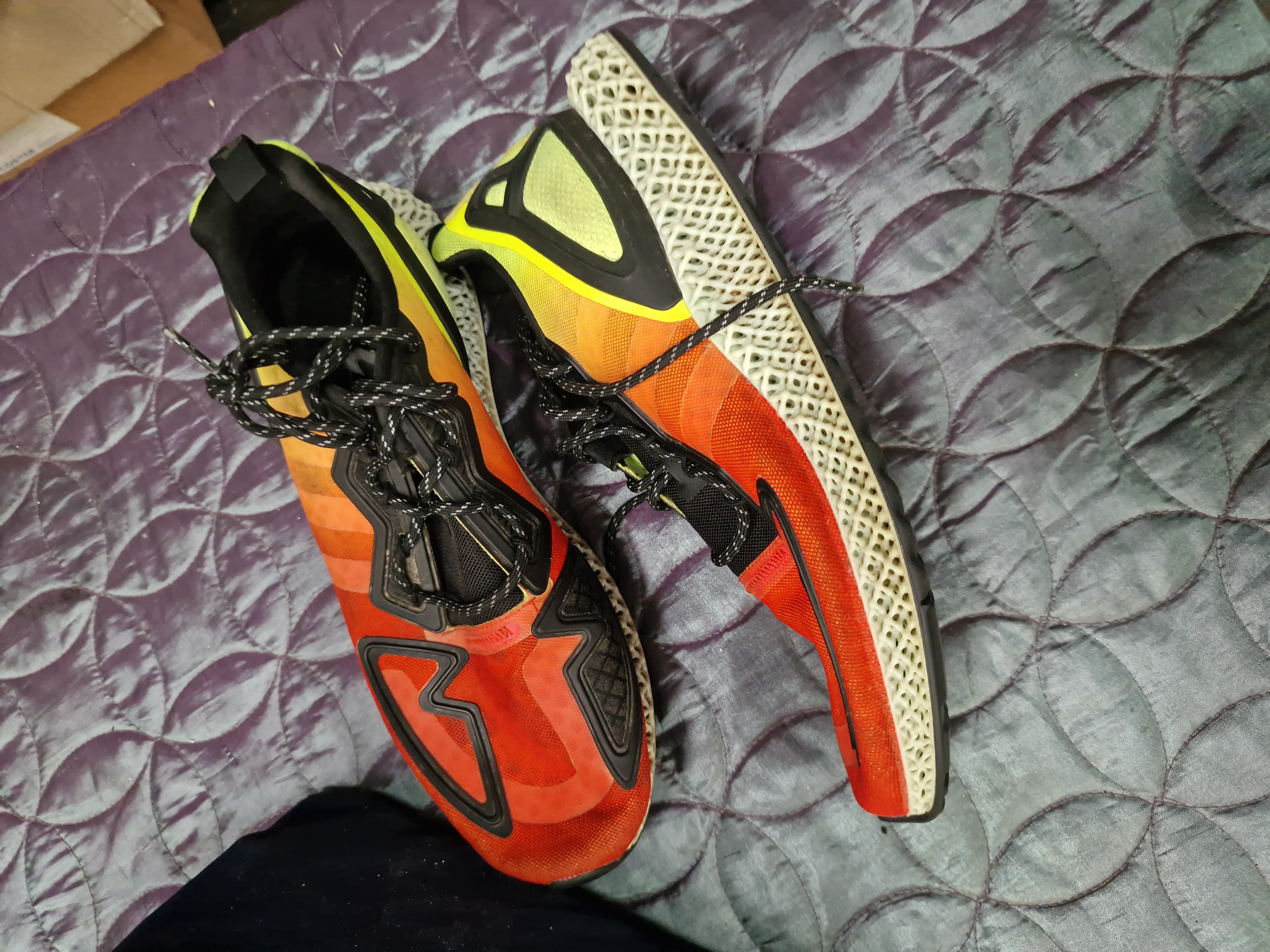 The shoes are in good used condition. The uppers appear clean without significant tears or marks. The outsoles show signs of light use with surface dirt and minor wear to the tread, particularly at the heel and ball of the foot. The off-white 3D-printed lattice midsole shows some light ground-in dirt consistent with moderate use.