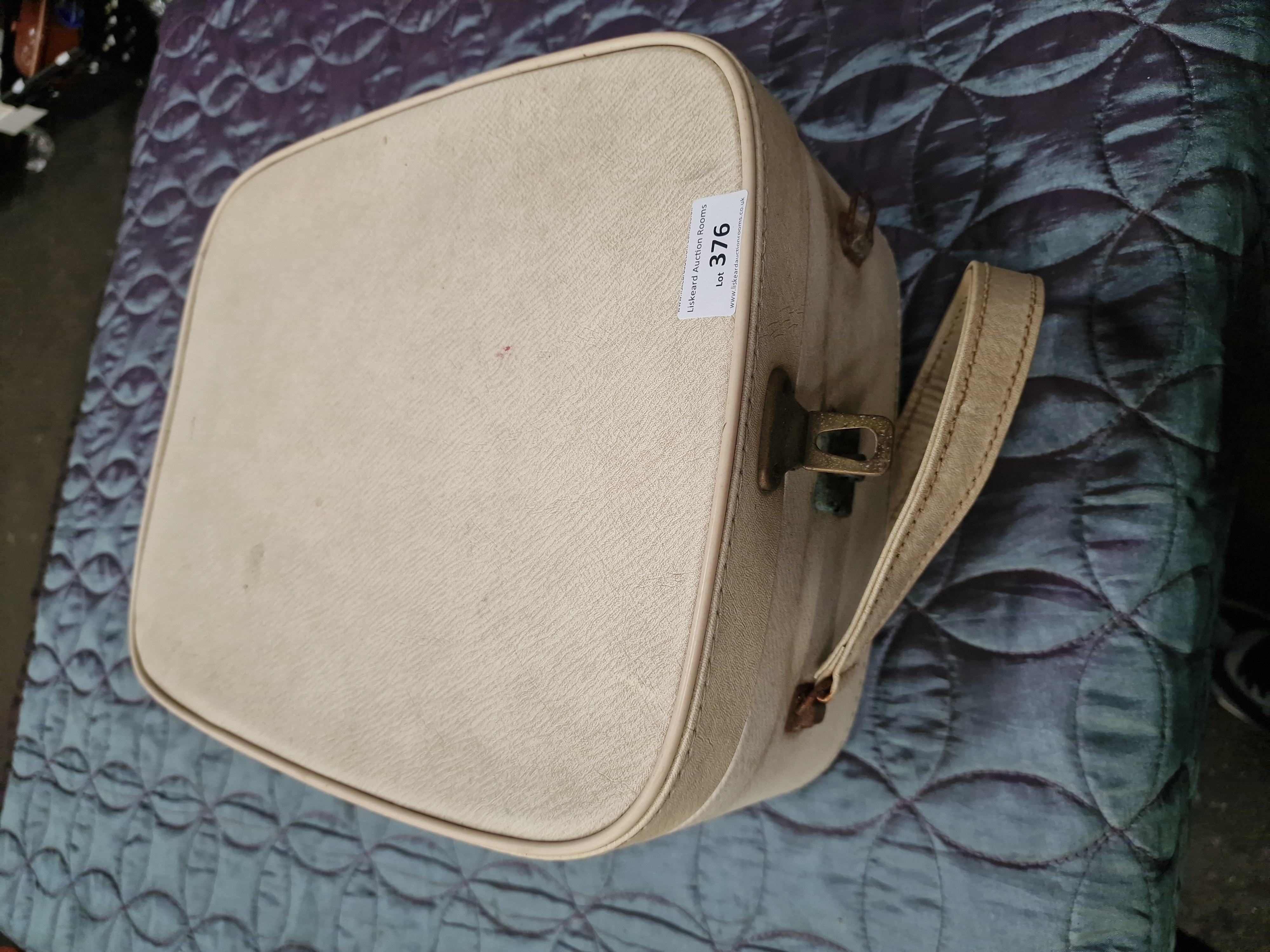 The exterior case shows surface marks, scuffs, and age-related discolouration. Metal hinges and the front clasp exhibit signs of oxidation and tarnish. The interior pink fabric lining shows light staining and wear. The mirror is heavily affected by desilvering and white residue across much of its surface. The electrical components have not been tested for functionality and the item is sold as a decorative or historical collectible. Professional inspection by a qualified electrician is required before any attempted use.