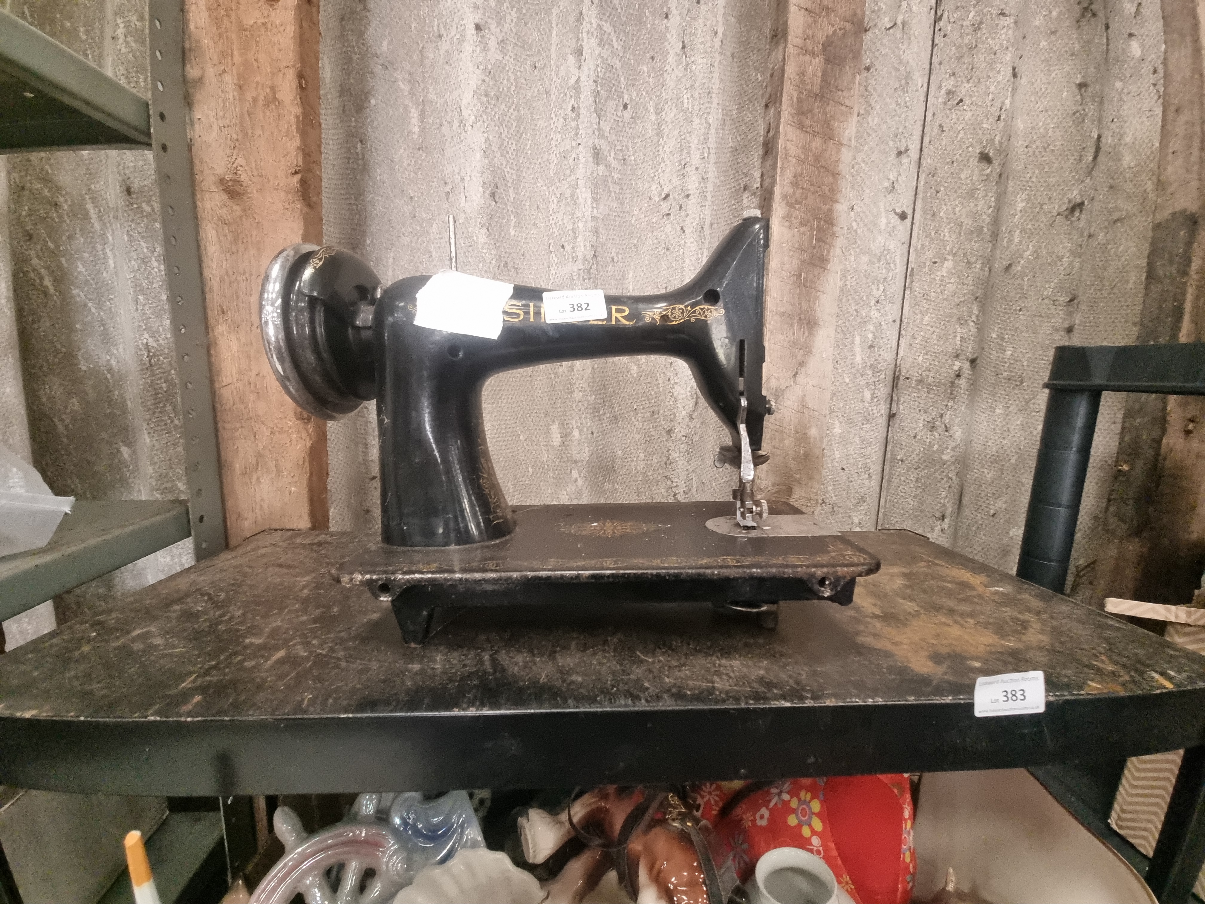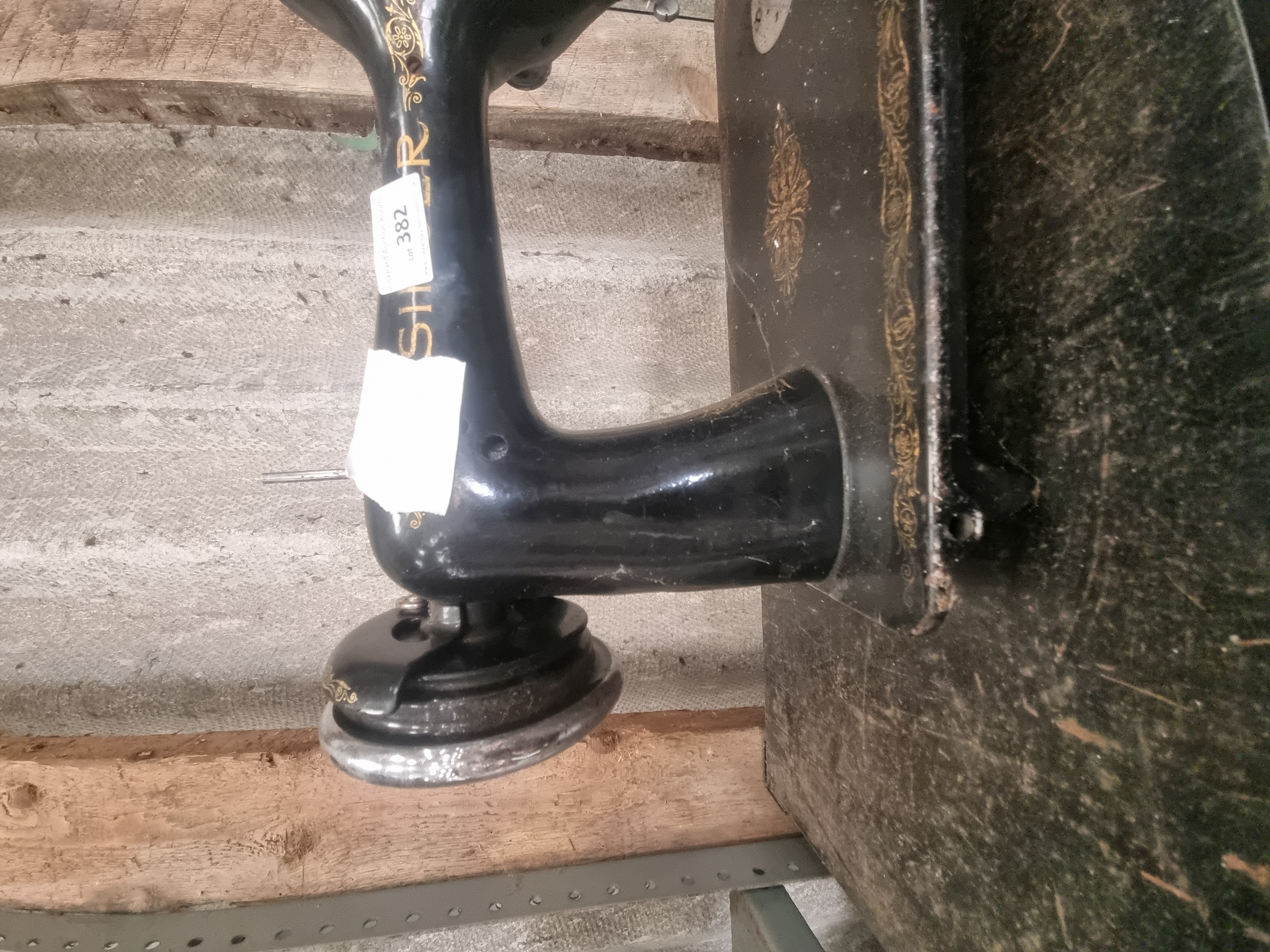 A Singer sewing machine head manufactured from cast iron with a black enamelled finish. The body is decorated with gold-tone foliate decals along the arm and base. The manufacturer name SINGER is visible in gold-tone lettering across the top of the arm, though it is partially obscured by a white adhesive label. The unit is presented as a standalone machine head and is missing its original wooden base, carrying case, or treadle assembly. It retains a side-mounted hand wheel and needle bar. An auction lot sticker numbered 382 is affixed to the arm.