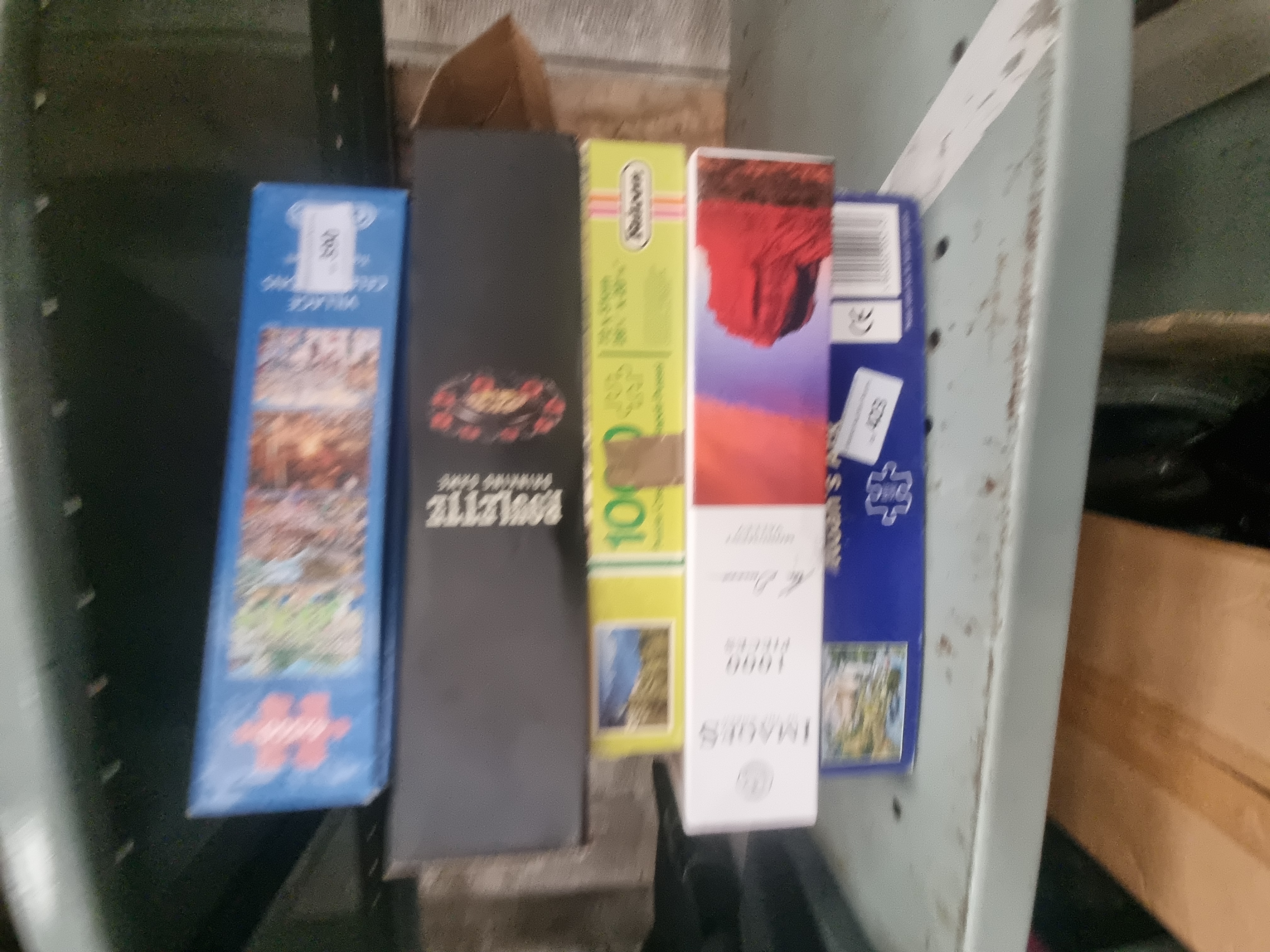 The boxes show various degrees of shelf wear, including crushing and the presence of old adhesive tape residue. While the items are contained within their original packaging, the completeness of the jigsaw puzzles and the components of the drinking game have not been verified. Working order of the game is unconfirmed.