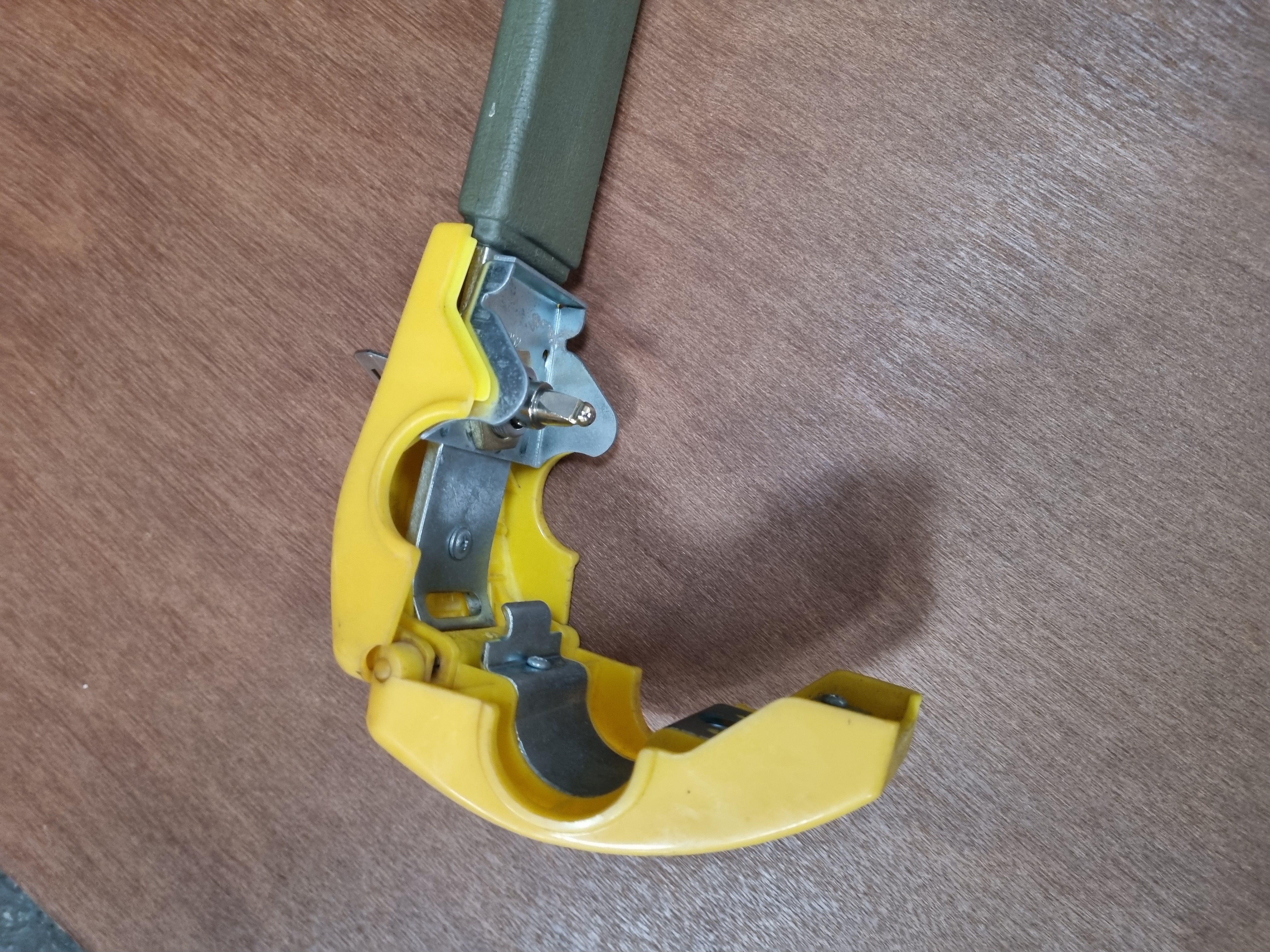 A Stoplock Pulsar bar-style vehicle steering wheel security lock. The item is constructed with a green textured plastic-coated handle and a yellow plastic locking head, both featuring embossed Stoplock branding. The handle terminates in a red translucent plastic lens housing a flashing LED warning light. The unit employs a hinged metal locking jaw mechanism designed for universal fitment to most standard vehicle steering wheels. This lot comprises one unit and includes one key.